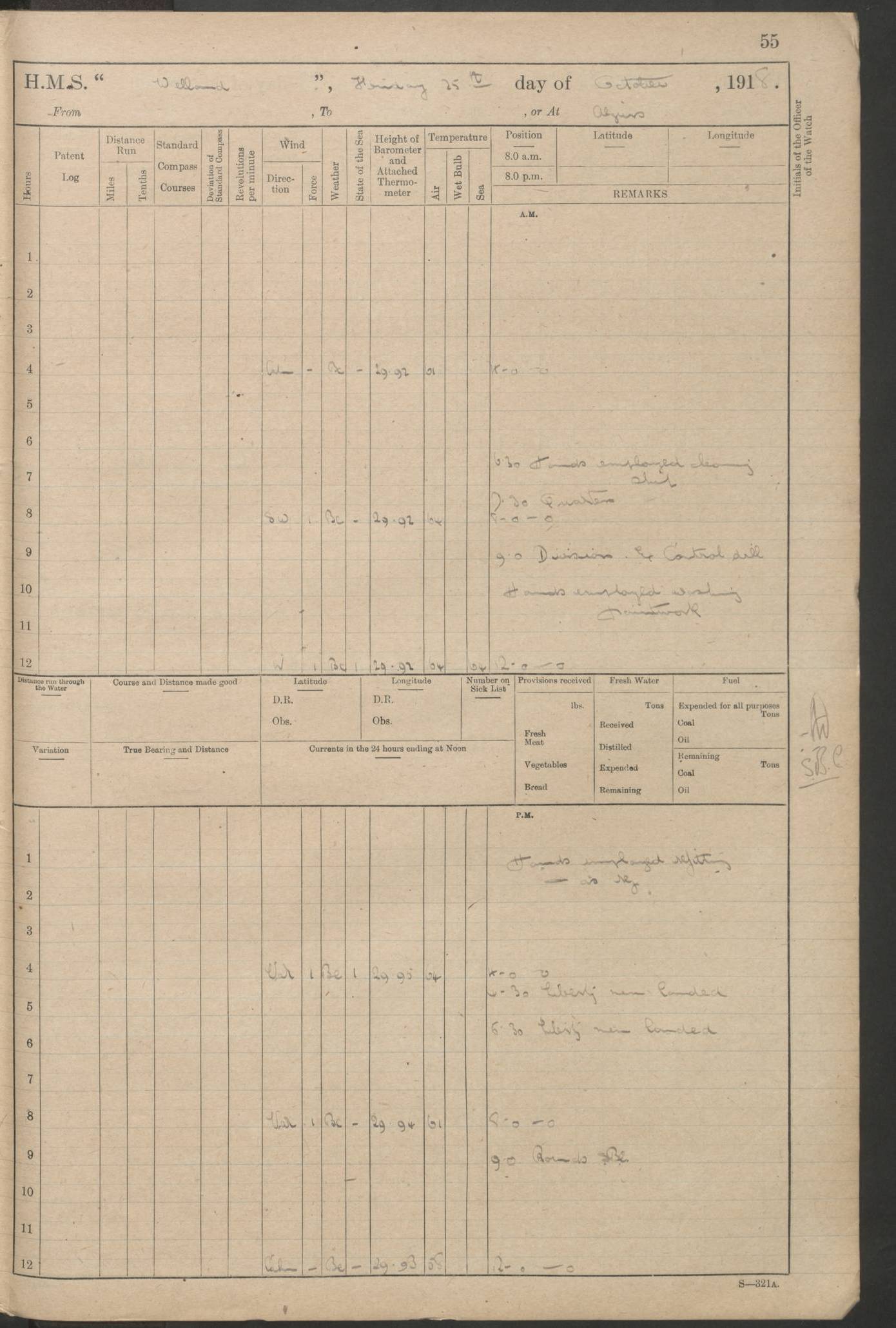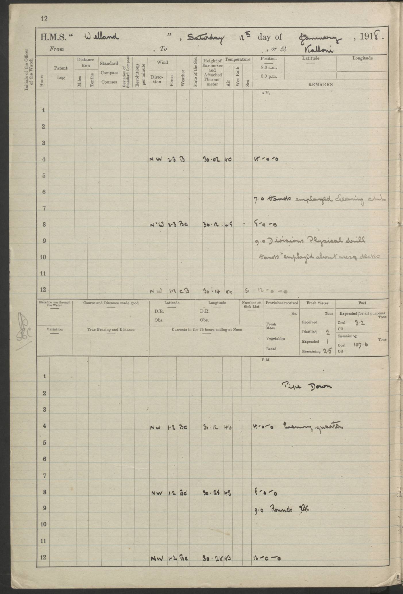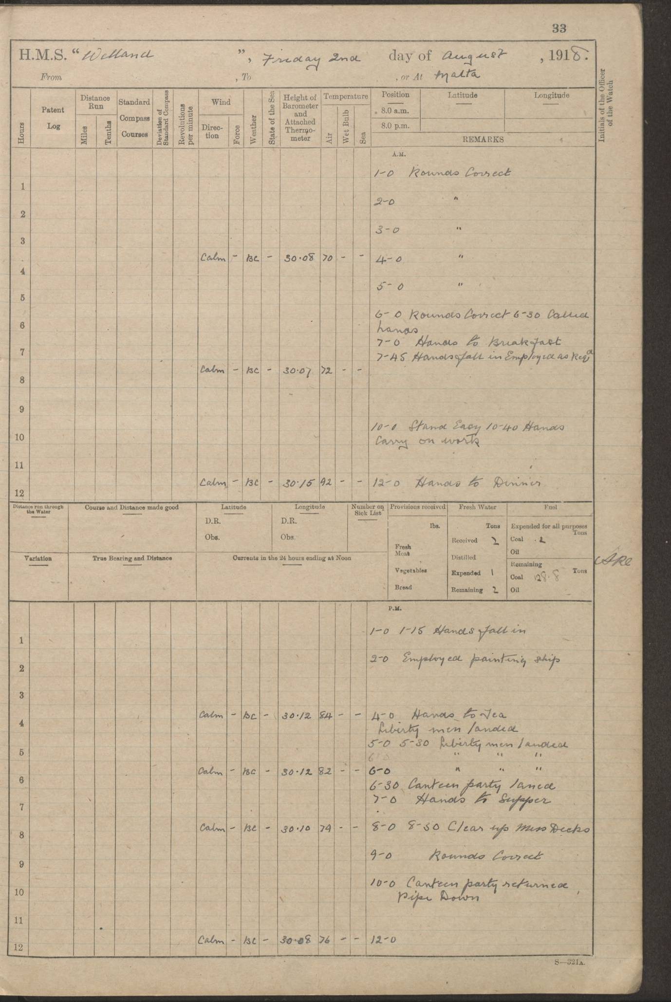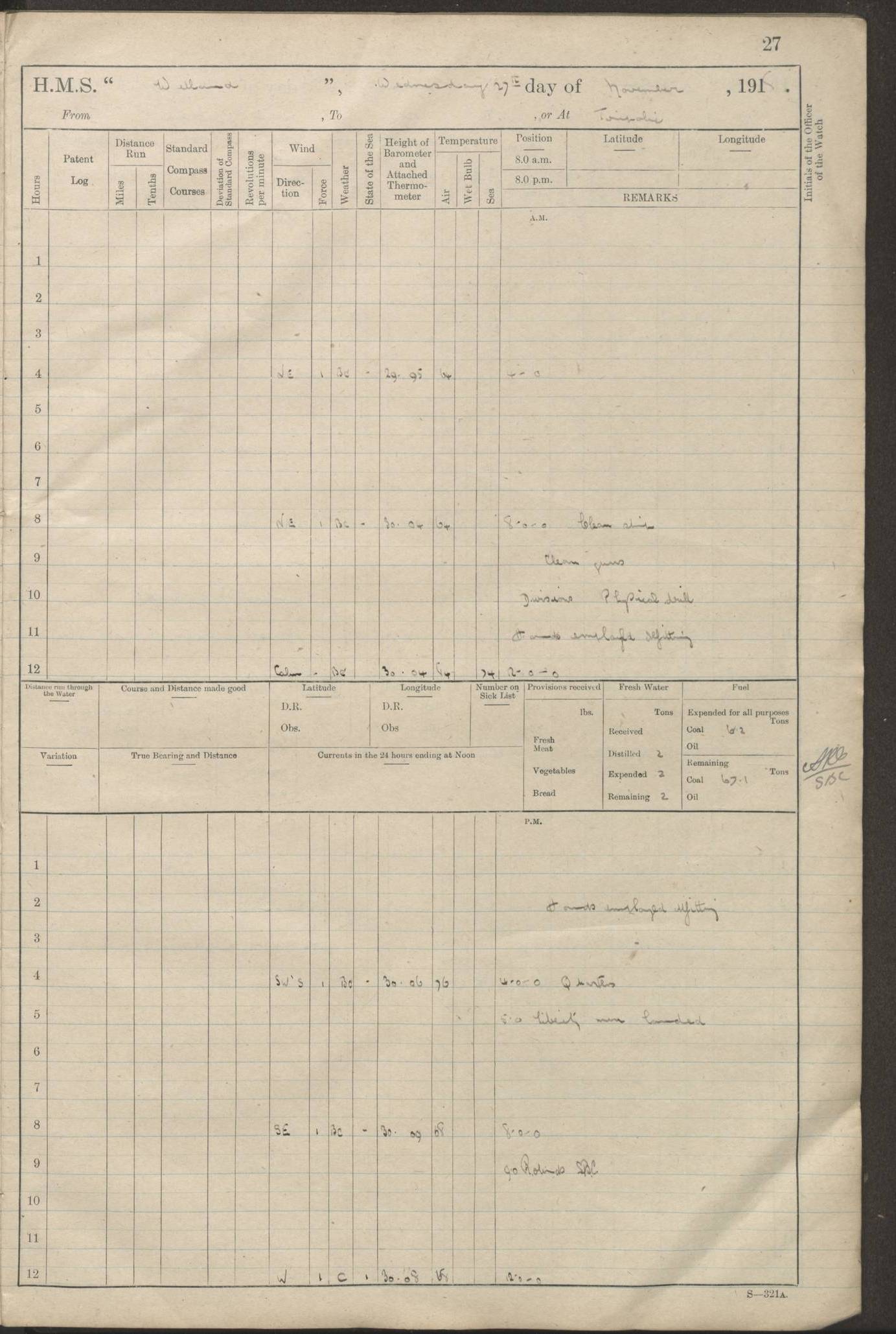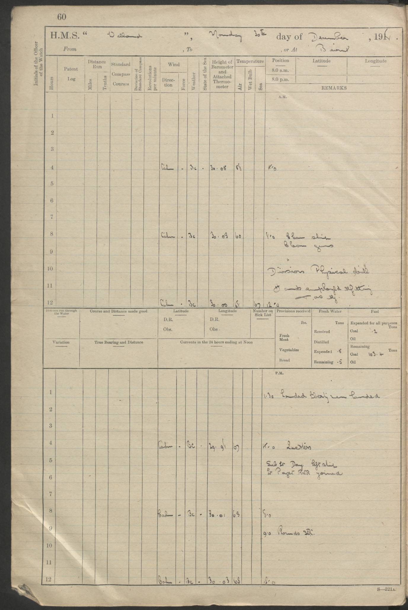 4caf8cadcadfd34197037692: (http://oldweather.s3.amazonaws.com/ADM 53-68366/ADM 53-68366-017_0.jpg) 28 December 1914 Port Said Lat 31.3, Long 32.3 3.15am: Sighted Suez bearing North. 3.55am: Reduced to 7 knots as requisite for Suez. 5.45am: Came to with Starboard anchor off Suez. 6.00am: Hands preparing ship for passage up Canal. 10.30am: Hands employed cleaning guns & small arms. Weighed and proceeded as requisite for passing the Suez Canal. 1.30pm: Hands piped down. 7.05pm: Arrived Port Said. Secured by Starboard anchor & stern to Jetty. 9.00pm: Rounds. 4caf8cadcadfd34197037693: (http://oldweather.s3.amazonaws.com/ADM 53-68366/ADM 53-68366-017_1.jpg) 29 December 1914 Port Said Lat 31.3, Long 32.3 6.00am: Hands employed scrubbing decks & cleaning guns. 8.45am: Hands painting ship. 11.25am: Coal lighters came alongside. Commenced coaling. 1.00pm: Leave to Watch 4.30pm till 6.30pm. 2.00pm: Hands painting ship. 2.10pm: Finished coaling. Received 120 tons. 9.00pm: Rounds. 9.55pm: Russian Cruiser ASKOLD sailed. 4caf8cadcadfd34197037694: (http://oldweather.s3.amazonaws.com/ADM 53-68366/ADM 53-68366-018_0.jpg) 30 December 1914 Port Said to Malta Lat 31.7, Long 31.7 2.30am: Lit up No. 2 & 3 Boilers. 5.15am: Hands employed securing ship for Sea. 6.00am: Pilot came on board. Weighed & proceeded as requisite. 7.15am: Dropped Pilot. Course N 40º W. 9 knots. 9.55am: Damietta Light House bearing S 63º W. 10.00am: Altered course N 74º W. 11.00am: Hands employed cleaning ship & securing gear. 1.00pm: Hands piped down. 5.00pm: Night Defence Stations. Provided ammunition. 4caf8cadcadfd34197037695: (http://oldweather.s3.amazonaws.com/ADM 53-68366/ADM 53-68366-018_1.jpg) 31 December 1914 Port Said to Malta Lat 33.0, Long 27.3 6.15am: Fell out Special Lookouts. Returned ammunition. 7.30am: Formed Divisions Line Ahead to Starboard. Course N 67º W. 9.00am: Hands employed lashing & rigging Splinters Guard & unshipping & clearing away stanchions. 10.10am: Put clocks back 11 minutes. 1.30pm: Hands piped down. 5.5pm: Formed single Line Ahead. Provided ammunition. LOGS FOR JANUARY 1915 4caf8cadcadfd34197037696: (http://oldweather.s3.amazonaws.com/ADM 53-68366/ADM 53-68366-019_0.jpg) 1 January 1915 Port Said to Malta Lat 34.1, Long 22.8 8.30am: Stopped 8.45am: Proceeded. Single line ahead 9.30am: Hands employed making bridge screens 10.18am: Put clocks back 18 minutes 1.30pm: Hands piped down 5.30pm: Formed single line ahead. Provided ammunition. Fresh water: Distilled 1 ton; expended 1 ton; remaining 1.5 tons Fuel: expended for all purposes – coal 22.2 tons; remaining 77.1 tons [A sample complete day’s log] 4caf8cadcadfd34197037697: (http://oldweather.s3.amazonaws.com/ADM 53-68366/ADM 53-68366-019_1.jpg) 2 January 1915 Port Said to Malta Lat 35.2, Long 18.4 7.15am: Hands employed fitting life lines round upper deck 4caf8cadcadfd34197037698: (http://oldweather.s3.amazonaws.com/ADM 53-68366/ADM 53-68366-020_0.jpg) 3 January 1915 Malta Lat 35.9, Long 14.52 6.40am: Fell out special lookouts 10.45am: Secured head and stern at destroyers’ trot Lazaretto Creek 1.00pm: Chelmer shifted billet 4caf8cadcadfd34197037699: (http://oldweather.s3.amazonaws.com/ADM 53-68366/ADM 53-68366-020_1.jpg) 4 January 1915 Malta Lat 35.9, Long 14.52 8.00am: Gave general leave to port watch from 8am to 8am 6th. Coal lighter came alongside. 4caf8cadcadfd3419703769a: (http://oldweather.s3.amazonaws.com/ADM 53-68366/ADM 53-68366-021_0.jpg) 5 January 1915 [6 January in log] Malta Lat 35.9, Long 14.52 4caf8cadcadfd3419703769b: (http://oldweather.s3.amazonaws.com/ADM 53-68366/ADM 53-68366-021_1.jpg) 6 January 1915 Malta Lat 35.9, Long 14.52 12.30pm: Leave to watch from 8am to 8am Friday 4caf8cadcadfd3419703769c: (http://oldweather.s3.amazonaws.com/ADM 53-68366/ADM 53-68366-022_0.jpg) 7 January 1915 Malta Lat 35.9, Long 14.52 4caf8cadcadfd3419703769d: (http://oldweather.s3.amazonaws.com/ADM 53-68366/ADM 53-68366-022_1.jpg) 8 January 1915 Malta Lat 35.9, Long 14.52 6.45am: Hands employed preparing ship for sea 8.30am: Slipped buoy and left Lazaretto Creek. Proceeded as requisite for Grand Harbour. 9.00am: Secured alongside Chelmer at Burmola Wharf, French Creek 4caf8cadcadfd3419703769e: (http://oldweather.s3.amazonaws.com/ADM 53-68366/ADM 53-68366-023_0.jpg) 9 January 1915 Malta Lat 35.9, Long 14.52 8.25am: Hands employed in dockyard and refitting canvas gear 1.15pm: Hands employed returning stores to dockyard 4caf8cadcadfd3419703769f: (http://oldweather.s3.amazonaws.com/ADM 53-68366/ADM 53-68366-023_1.jpg) 10 January 1915 Malta Lat 35.9, Long 14.52 9.30am: Landed church parties 11.30am: Church parties returned 12.25pm: Colne left harbour 4caf8cadcadfd341970376a0: (http://oldweather.s3.amazonaws.com/ADM 53-68366/ADM 53-68366-024_0.jpg) 11 January 1915 Malta Lat 35.9, Long 14.52 8.30am: Sent 2 ratings to hospital 1.30pm: Hands employed refitting fenders Number on sick list: 2 4caf8cadcadfd341970376a1: (http://oldweather.s3.amazonaws.com/ADM 53-68366/ADM 53-68366-024_1.jpg) 12 January 1915 Malta Lat 35.9, Long 14.52 11.00am: Sent 1 rating (sick) to Egmont Number on sick list: 1 4caf8cadcadfd341970376a2: (http://oldweather.s3.amazonaws.com/ADM 53-68366/ADM 53-68366-025_0.jpg) 13 January 1915 Malta Lat 35.9, Long 14.52 10.00am: French battleship Danton docked 4caf8cadcadfd341970376a3: (http://oldweather.s3.amazonaws.com/ADM 53-68366/ADM 53-68366-025_1.jpg) 14 January 1915 Malta Lat 35.9, Long 14.52 6.30am: Hands employed preparing ship for sea 7.30am: Tug came alongside 7.45am: Ship shifted to buoy 8.35am: Commenced swinging for adjustment of compasses 9.30am: Finished swinging 11.30am: One rating rejoined from Egmont 12.10pm: Slipped and proceeded as requisite for leaving Malta, Chelmer and Kennet in company 12.25pm: Set course S87E speed 10 knots 12.35pm: Increased to 12 knots. Hands piped down. 4.00pm: Increased to 13 knots 4.50pm: Night Defence Stations provided ammunition 6.00pm: Placed look-outs 12 midnight: Altered course S88E 4caf8cadcad