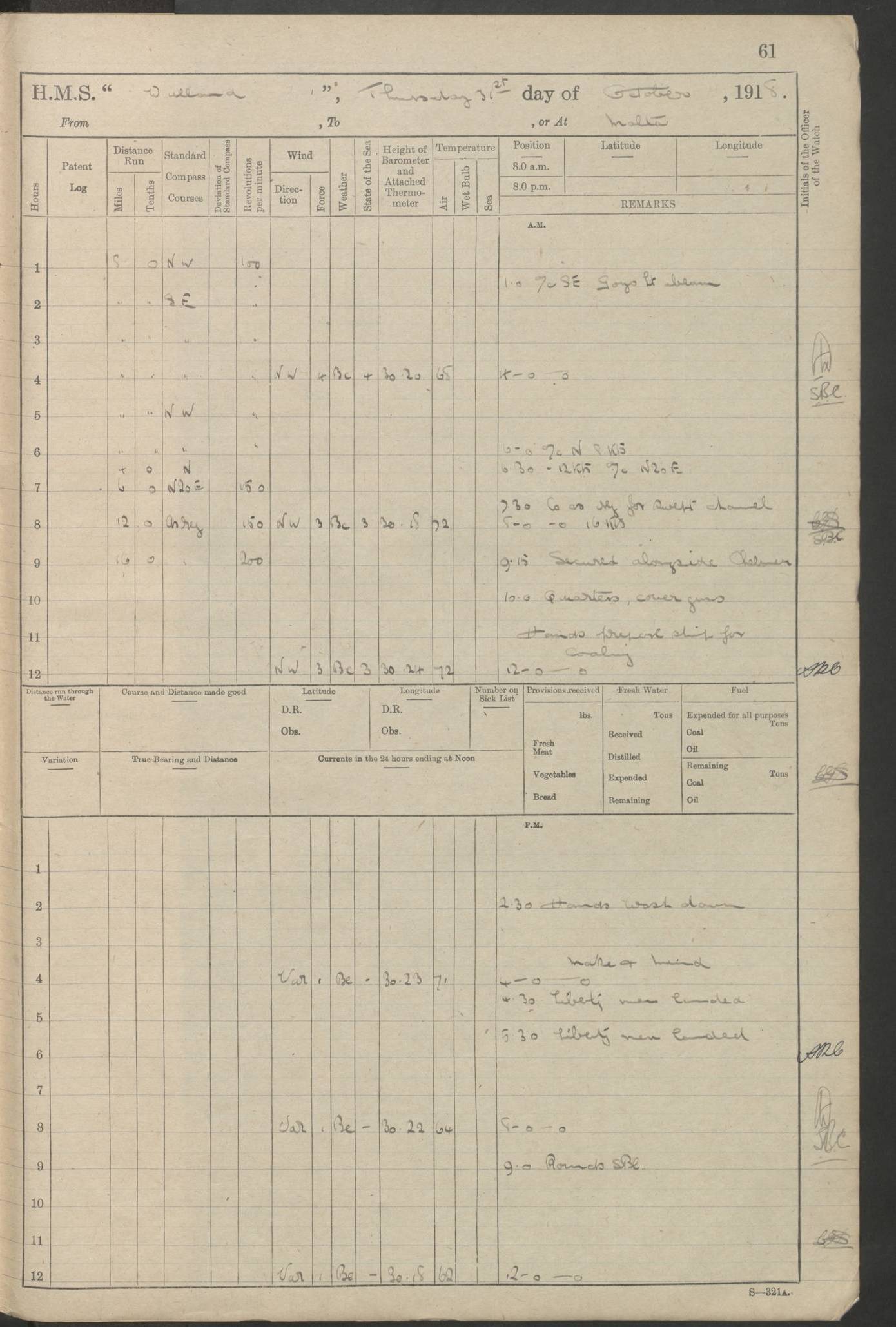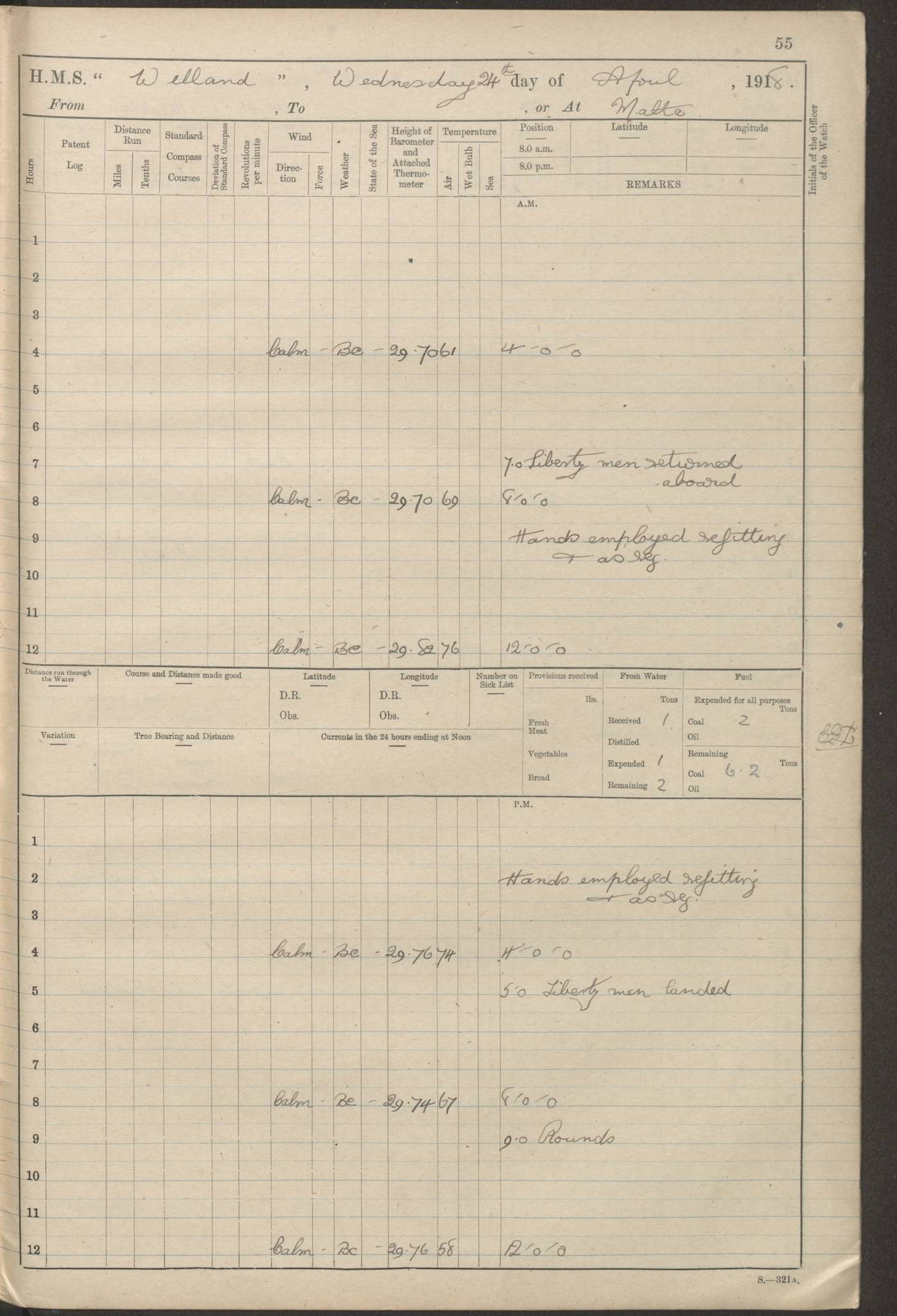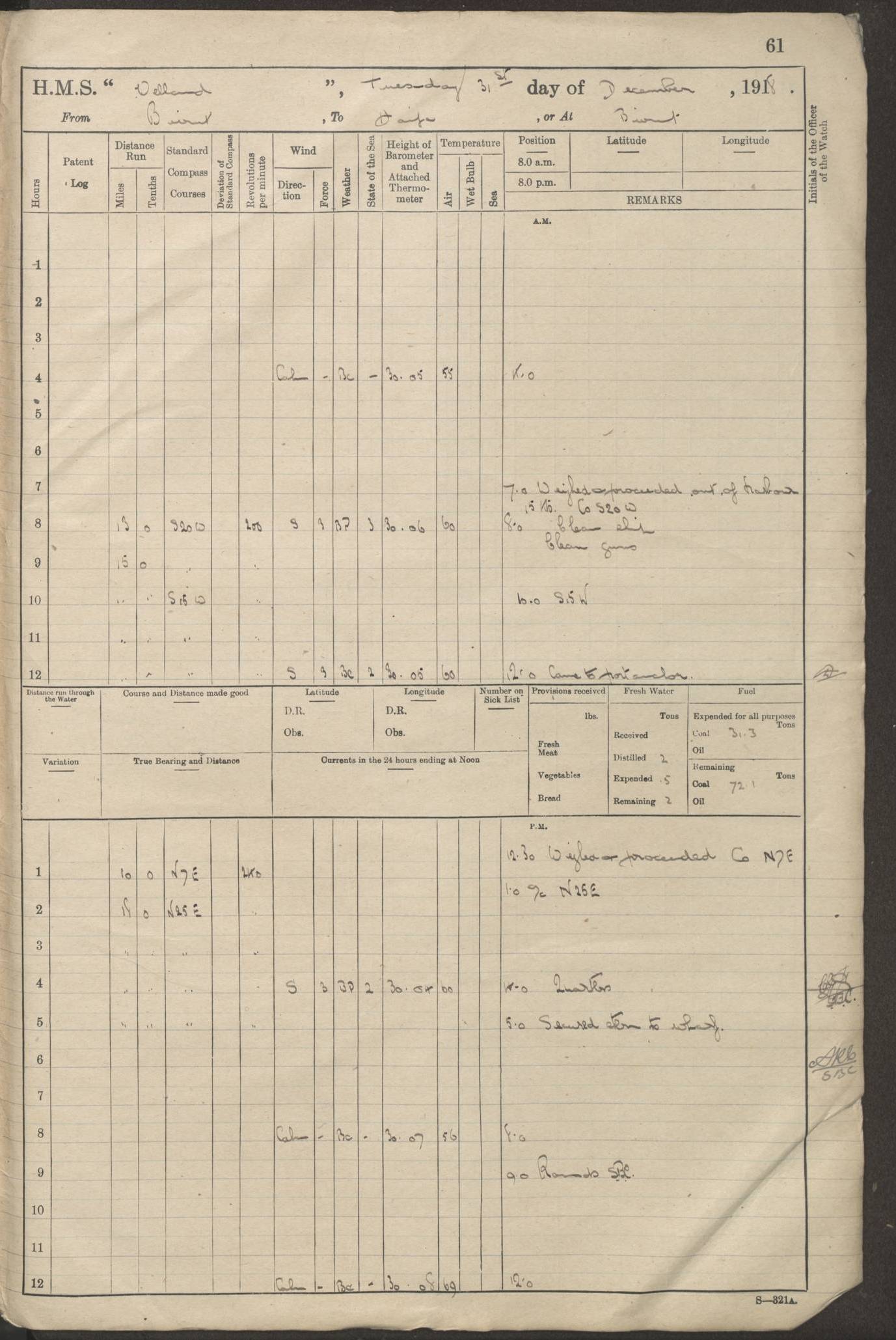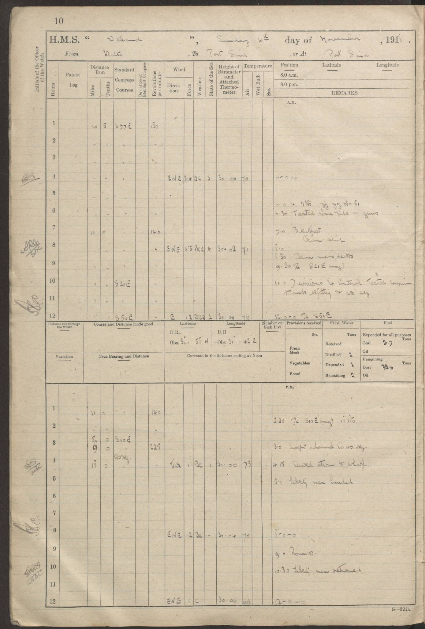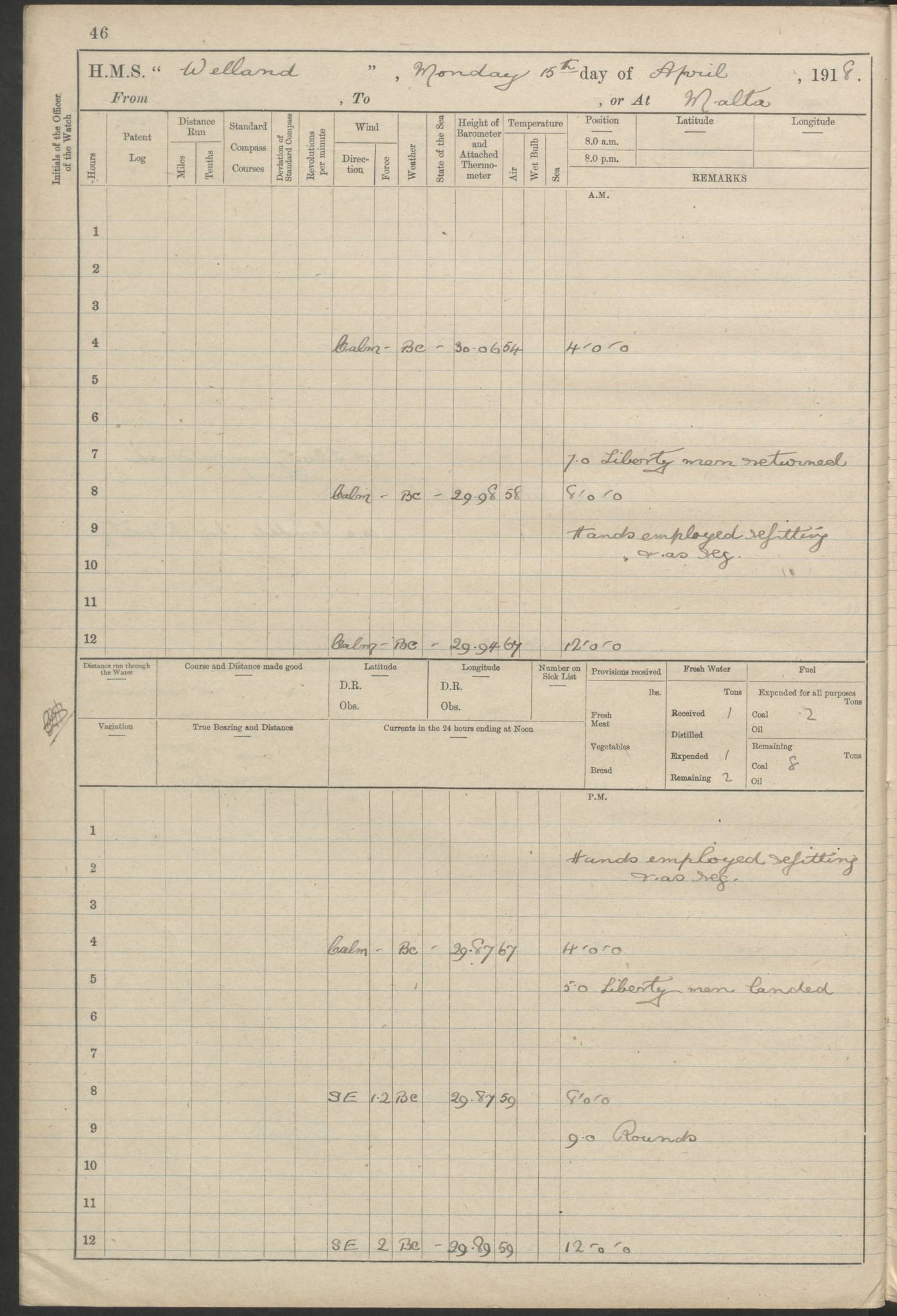 4caf8cadcadfd34197037692: (http://oldweather.s3.amazonaws.com/ADM 53-68366/ADM 53-68366-017_0.jpg) 28 December 1914 Port Said Lat 31.3, Long 32.3 3.15am: Sighted Suez bearing North. 3.55am: Reduced to 7 knots as requisite for Suez. 5.45am: Came to with Starboard anchor off Suez. 6.00am: Hands preparing ship for passage up Canal. 10.30am: Hands employed cleaning guns & small arms. Weighed and proceeded as requisite for passing the Suez Canal. 1.30pm: Hands piped down. 7.05pm: Arrived Port Said. Secured by Starboard anchor & stern to Jetty. 9.00pm: Rounds. 4caf8cadcadfd34197037693: (http://oldweather.s3.amazonaws.com/ADM 53-68366/ADM 53-68366-017_1.jpg) 29 December 1914 Port Said Lat 31.3, Long 32.3 6.00am: Hands employed scrubbing decks & cleaning guns. 8.45am: Hands painting ship. 11.25am: Coal lighters came alongside. Commenced coaling. 1.00pm: Leave to Watch 4.30pm till 6.30pm. 2.00pm: Hands painting ship. 2.10pm: Finished coaling. Received 120 tons. 9.00pm: Rounds. 9.55pm: Russian Cruiser ASKOLD sailed. 4caf8cadcadfd34197037694: (http://oldweather.s3.amazonaws.com/ADM 53-68366/ADM 53-68366-018_0.jpg) 30 December 1914 Port Said to Malta Lat 31.7, Long 31.7 2.30am: Lit up No. 2 & 3 Boilers. 5.15am: Hands employed securing ship for Sea. 6.00am: Pilot came on board. Weighed & proceeded as requisite. 7.15am: Dropped Pilot. Course N 40º W. 9 knots. 9.55am: Damietta Light House bearing S 63º W. 10.00am: Altered course N 74º W. 11.00am: Hands employed cleaning ship & securing gear. 1.00pm: Hands piped down. 5.00pm: Night Defence Stations. Provided ammunition. 4caf8cadcadfd34197037695: (http://oldweather.s3.amazonaws.com/ADM 53-68366/ADM 53-68366-018_1.jpg) 31 December 1914 Port Said to Malta Lat 33.0, Long 27.3 6.15am: Fell out Special Lookouts. Returned ammunition. 7.30am: Formed Divisions Line Ahead to Starboard. Course N 67º W. 9.00am: Hands employed lashing & rigging Splinters Guard & unshipping & clearing away stanchions. 10.10am: Put clocks back 11 minutes. 1.30pm: Hands piped down. 5.5pm: Formed single Line Ahead. Provided ammunition. LOGS FOR JANUARY 1915 4caf8cadcadfd34197037696: (http://oldweather.s3.amazonaws.com/ADM 53-68366/ADM 53-68366-019_0.jpg) 1 January 1915 Port Said to Malta Lat 34.1, Long 22.8 8.30am: Stopped 8.45am: Proceeded. Single line ahead 9.30am: Hands employed making bridge screens 10.18am: Put clocks back 18 minutes 1.30pm: Hands piped down 5.30pm: Formed single line ahead. Provided ammunition. Fresh water: Distilled 1 ton; expended 1 ton; remaining 1.5 tons Fuel: expended for all purposes – coal 22.2 tons; remaining 77.1 tons [A sample complete day’s log] 4caf8cadcadfd34197037697: (http://oldweather.s3.amazonaws.com/ADM 53-68366/ADM 53-68366-019_1.jpg) 2 January 1915 Port Said to Malta Lat 35.2, Long 18.4 7.15am: Hands employed fitting life lines round upper deck 4caf8cadcadfd34197037698: (http://oldweather.s3.amazonaws.com/ADM 53-68366/ADM 53-68366-020_0.jpg) 3 January 1915 Malta Lat 35.9, Long 14.52 6.40am: Fell out special lookouts 10.45am: Secured head and stern at destroyers’ trot Lazaretto Creek 1.00pm: Chelmer shifted billet 4caf8cadcadfd34197037699: (http://oldweather.s3.amazonaws.com/ADM 53-68366/ADM 53-68366-020_1.jpg) 4 January 1915 Malta Lat 35.9, Long 14.52 8.00am: Gave general leave to port watch from 8am to 8am 6th. Coal lighter came alongside. 4caf8cadcadfd3419703769a: (http://oldweather.s3.amazonaws.com/ADM 53-68366/ADM 53-68366-021_0.jpg) 5 January 1915 [6 January in log] Malta Lat 35.9, Long 14.52 4caf8cadcadfd3419703769b: (http://oldweather.s3.amazonaws.com/ADM 53-68366/ADM 53-68366-021_1.jpg) 6 January 1915 Malta Lat 35.9, Long 14.52 12.30pm: Leave to watch from 8am to 8am Friday 4caf8cadcadfd3419703769c: (http://oldweather.s3.amazonaws.com/ADM 53-68366/ADM 53-68366-022_0.jpg) 7 January 1915 Malta Lat 35.9, Long 14.52 4caf8cadcadfd3419703769d: (http://oldweather.s3.amazonaws.com/ADM 53-68366/ADM 53-68366-022_1.jpg) 8 January 1915 Malta Lat 35.9, Long 14.52 6.45am: Hands employed preparing ship for sea 8.30am: Slipped buoy and left Lazaretto Creek. Proceeded as requisite for Grand Harbour. 9.00am: Secured alongside Chelmer at Burmola Wharf, French Creek 4caf8cadcadfd3419703769e: (http://oldweather.s3.amazonaws.com/ADM 53-68366/ADM 53-68366-023_0.jpg) 9 January 1915 Malta Lat 35.9, Long 14.52 8.25am: Hands employed in dockyard and refitting canvas gear 1.15pm: Hands employed returning stores to dockyard 4caf8cadcadfd3419703769f: (http://oldweather.s3.amazonaws.com/ADM 53-68366/ADM 53-68366-023_1.jpg) 10 January 1915 Malta Lat 35.9, Long 14.52 9.30am: Landed church parties 11.30am: Church parties returned 12.25pm: Colne left harbour 4caf8cadcadfd341970376a0: (http://oldweather.s3.amazonaws.com/ADM 53-68366/ADM 53-68366-024_0.jpg) 11 January 1915 Malta Lat 35.9, Long 14.52 8.30am: Sent 2 ratings to hospital 1.30pm: Hands employed refitting fenders Number on sick list: 2 4caf8cadcadfd341970376a1: (http://oldweather.s3.amazonaws.com/ADM 53-68366/ADM 53-68366-024_1.jpg) 12 January 1915 Malta Lat 35.9, Long 14.52 11.00am: Sent 1 rating (sick) to Egmont Number on sick list: 1 4caf8cadcadfd341970376a2: (http://oldweather.s3.amazonaws.com/ADM 53-68366/ADM 53-68366-025_0.jpg) 13 January 1915 Malta Lat 35.9, Long 14.52 10.00am: French battleship Danton docked 4caf8cadcadfd341970376a3: (http://oldweather.s3.amazonaws.com/ADM 53-68366/ADM 53-68366-025_1.jpg) 14 January 1915 Malta Lat 35.9, Long 14.52 6.30am: Hands employed preparing ship for sea 7.30am: Tug came alongside 7.45am: Ship shifted to buoy 8.35am: Commenced swinging for adjustment of compasses 9.30am: Finished swinging 11.30am: One rating rejoined from Egmont 12.10pm: Slipped and proceeded as requisite for leaving Malta, Chelmer and Kennet in company 12.25pm: Set course S87E speed 10 knots 12.35pm: Increased to 12 knots. Hands piped down. 4.00pm: Increased to 13 knots 4.50pm: Night Defence Stations provided ammunition 6.00pm: Placed look-outs 12 midnight: Altered course S88E 4caf8cadcad