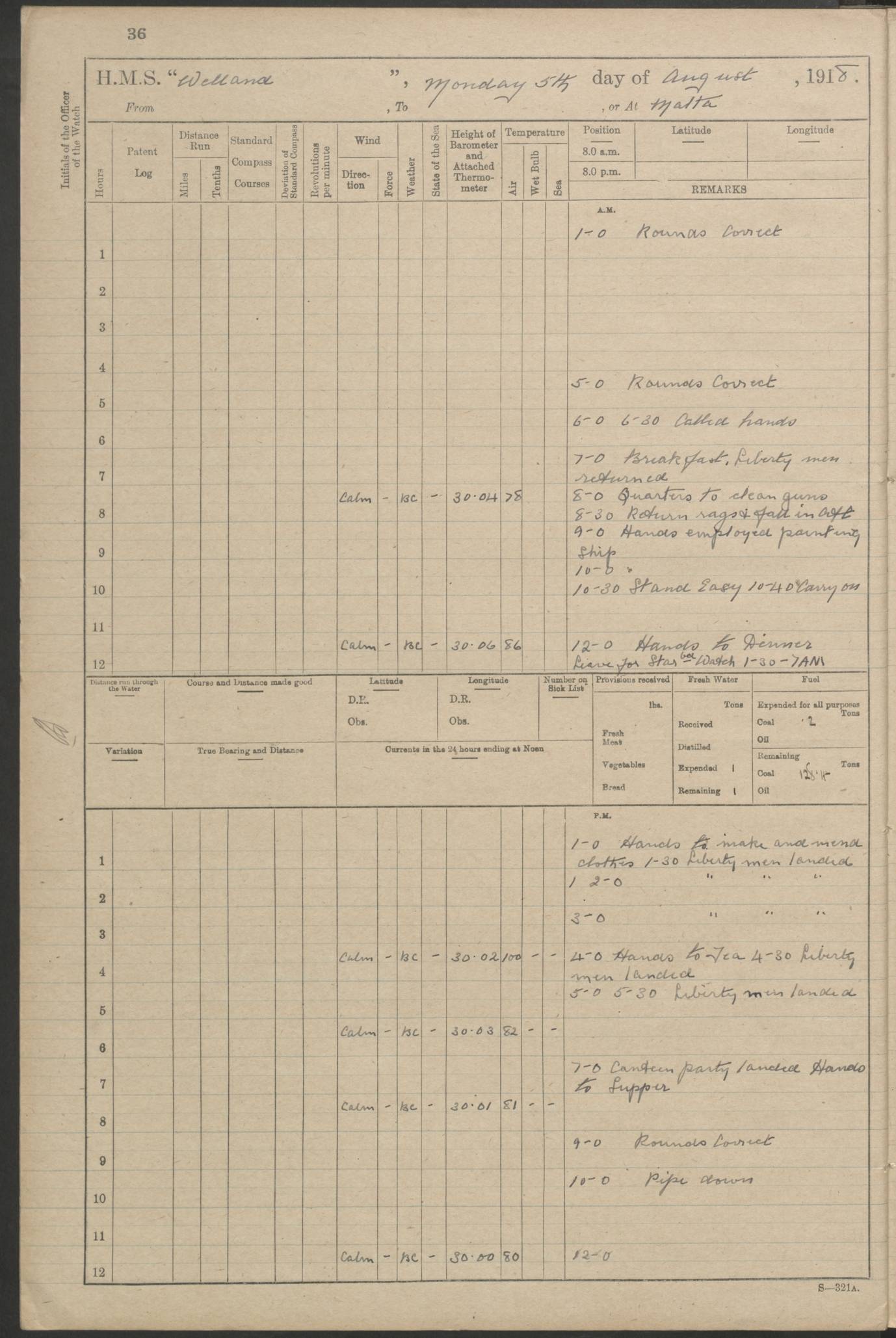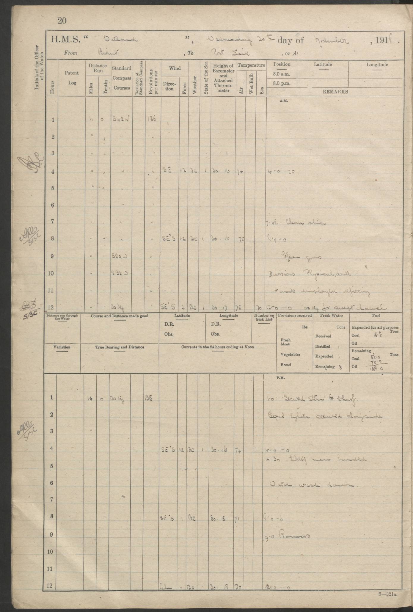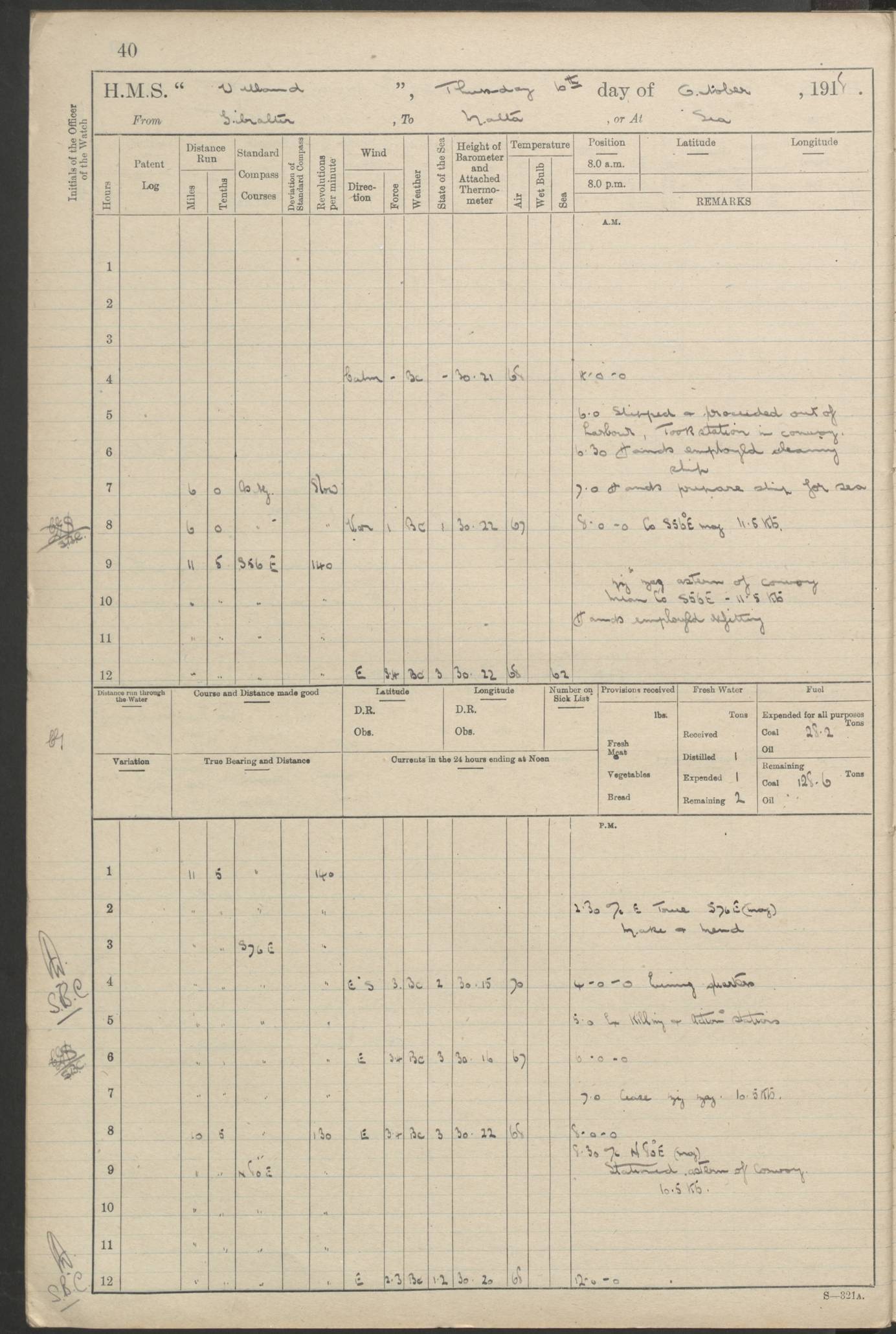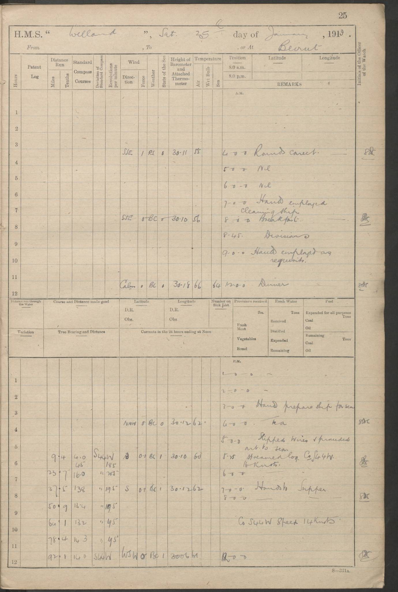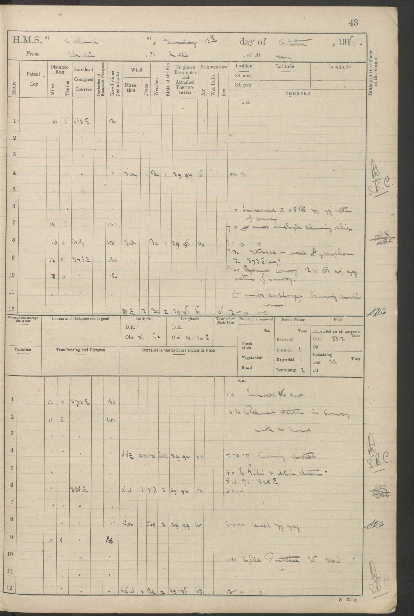 4caf8cadcadfd34197037692: (http://oldweather.s3.amazonaws.com/ADM 53-68366/ADM 53-68366-017_0.jpg) 28 December 1914 Port Said Lat 31.3, Long 32.3 3.15am: Sighted Suez bearing North. 3.55am: Reduced to 7 knots as requisite for Suez. 5.45am: Came to with Starboard anchor off Suez. 6.00am: Hands preparing ship for passage up Canal. 10.30am: Hands employed cleaning guns & small arms. Weighed and proceeded as requisite for passing the Suez Canal. 1.30pm: Hands piped down. 7.05pm: Arrived Port Said. Secured by Starboard anchor & stern to Jetty. 9.00pm: Rounds. 4caf8cadcadfd34197037693: (http://oldweather.s3.amazonaws.com/ADM 53-68366/ADM 53-68366-017_1.jpg) 29 December 1914 Port Said Lat 31.3, Long 32.3 6.00am: Hands employed scrubbing decks & cleaning guns. 8.45am: Hands painting ship. 11.25am: Coal lighters came alongside. Commenced coaling. 1.00pm: Leave to Watch 4.30pm till 6.30pm. 2.00pm: Hands painting ship. 2.10pm: Finished coaling. Received 120 tons. 9.00pm: Rounds. 9.55pm: Russian Cruiser ASKOLD sailed. 4caf8cadcadfd34197037694: (http://oldweather.s3.amazonaws.com/ADM 53-68366/ADM 53-68366-018_0.jpg) 30 December 1914 Port Said to Malta Lat 31.7, Long 31.7 2.30am: Lit up No. 2 & 3 Boilers. 5.15am: Hands employed securing ship for Sea. 6.00am: Pilot came on board. Weighed & proceeded as requisite. 7.15am: Dropped Pilot. Course N 40º W. 9 knots. 9.55am: Damietta Light House bearing S 63º W. 10.00am: Altered course N 74º W. 11.00am: Hands employed cleaning ship & securing gear. 1.00pm: Hands piped down. 5.00pm: Night Defence Stations. Provided ammunition. 4caf8cadcadfd34197037695: (http://oldweather.s3.amazonaws.com/ADM 53-68366/ADM 53-68366-018_1.jpg) 31 December 1914 Port Said to Malta Lat 33.0, Long 27.3 6.15am: Fell out Special Lookouts. Returned ammunition. 7.30am: Formed Divisions Line Ahead to Starboard. Course N 67º W. 9.00am: Hands employed lashing & rigging Splinters Guard & unshipping & clearing away stanchions. 10.10am: Put clocks back 11 minutes. 1.30pm: Hands piped down. 5.5pm: Formed single Line Ahead. Provided ammunition. LOGS FOR JANUARY 1915 4caf8cadcadfd34197037696: (http://oldweather.s3.amazonaws.com/ADM 53-68366/ADM 53-68366-019_0.jpg) 1 January 1915 Port Said to Malta Lat 34.1, Long 22.8 8.30am: Stopped 8.45am: Proceeded. Single line ahead 9.30am: Hands employed making bridge screens 10.18am: Put clocks back 18 minutes 1.30pm: Hands piped down 5.30pm: Formed single line ahead. Provided ammunition. Fresh water: Distilled 1 ton; expended 1 ton; remaining 1.5 tons Fuel: expended for all purposes – coal 22.2 tons; remaining 77.1 tons [A sample complete day’s log] 4caf8cadcadfd34197037697: (http://oldweather.s3.amazonaws.com/ADM 53-68366/ADM 53-68366-019_1.jpg) 2 January 1915 Port Said to Malta Lat 35.2, Long 18.4 7.15am: Hands employed fitting life lines round upper deck 4caf8cadcadfd34197037698: (http://oldweather.s3.amazonaws.com/ADM 53-68366/ADM 53-68366-020_0.jpg) 3 January 1915 Malta Lat 35.9, Long 14.52 6.40am: Fell out special lookouts 10.45am: Secured head and stern at destroyers’ trot Lazaretto Creek 1.00pm: Chelmer shifted billet 4caf8cadcadfd34197037699: (http://oldweather.s3.amazonaws.com/ADM 53-68366/ADM 53-68366-020_1.jpg) 4 January 1915 Malta Lat 35.9, Long 14.52 8.00am: Gave general leave to port watch from 8am to 8am 6th. Coal lighter came alongside. 4caf8cadcadfd3419703769a: (http://oldweather.s3.amazonaws.com/ADM 53-68366/ADM 53-68366-021_0.jpg) 5 January 1915 [6 January in log] Malta Lat 35.9, Long 14.52 4caf8cadcadfd3419703769b: (http://oldweather.s3.amazonaws.com/ADM 53-68366/ADM 53-68366-021_1.jpg) 6 January 1915 Malta Lat 35.9, Long 14.52 12.30pm: Leave to watch from 8am to 8am Friday 4caf8cadcadfd3419703769c: (http://oldweather.s3.amazonaws.com/ADM 53-68366/ADM 53-68366-022_0.jpg) 7 January 1915 Malta Lat 35.9, Long 14.52 4caf8cadcadfd3419703769d: (http://oldweather.s3.amazonaws.com/ADM 53-68366/ADM 53-68366-022_1.jpg) 8 January 1915 Malta Lat 35.9, Long 14.52 6.45am: Hands employed preparing ship for sea 8.30am: Slipped buoy and left Lazaretto Creek. Proceeded as requisite for Grand Harbour. 9.00am: Secured alongside Chelmer at Burmola Wharf, French Creek 4caf8cadcadfd3419703769e: (http://oldweather.s3.amazonaws.com/ADM 53-68366/ADM 53-68366-023_0.jpg) 9 January 1915 Malta Lat 35.9, Long 14.52 8.25am: Hands employed in dockyard and refitting canvas gear 1.15pm: Hands employed returning stores to dockyard 4caf8cadcadfd3419703769f: (http://oldweather.s3.amazonaws.com/ADM 53-68366/ADM 53-68366-023_1.jpg) 10 January 1915 Malta Lat 35.9, Long 14.52 9.30am: Landed church parties 11.30am: Church parties returned 12.25pm: Colne left harbour 4caf8cadcadfd341970376a0: (http://oldweather.s3.amazonaws.com/ADM 53-68366/ADM 53-68366-024_0.jpg) 11 January 1915 Malta Lat 35.9, Long 14.52 8.30am: Sent 2 ratings to hospital 1.30pm: Hands employed refitting fenders Number on sick list: 2 4caf8cadcadfd341970376a1: (http://oldweather.s3.amazonaws.com/ADM 53-68366/ADM 53-68366-024_1.jpg) 12 January 1915 Malta Lat 35.9, Long 14.52 11.00am: Sent 1 rating (sick) to Egmont Number on sick list: 1 4caf8cadcadfd341970376a2: (http://oldweather.s3.amazonaws.com/ADM 53-68366/ADM 53-68366-025_0.jpg) 13 January 1915 Malta Lat 35.9, Long 14.52 10.00am: French battleship Danton docked 4caf8cadcadfd341970376a3: (http://oldweather.s3.amazonaws.com/ADM 53-68366/ADM 53-68366-025_1.jpg) 14 January 1915 Malta Lat 35.9, Long 14.52 6.30am: Hands employed preparing ship for sea 7.30am: Tug came alongside 7.45am: Ship shifted to buoy 8.35am: Commenced swinging for adjustment of compasses 9.30am: Finished swinging 11.30am: One rating rejoined from Egmont 12.10pm: Slipped and proceeded as requisite for leaving Malta, Chelmer and Kennet in company 12.25pm: Set course S87E speed 10 knots 12.35pm: Increased to 12 knots. Hands piped down. 4.00pm: Increased to 13 knots 4.50pm: Night Defence Stations provided ammunition 6.00pm: Placed look-outs 12 midnight: Altered course S88E 4caf8cadcad