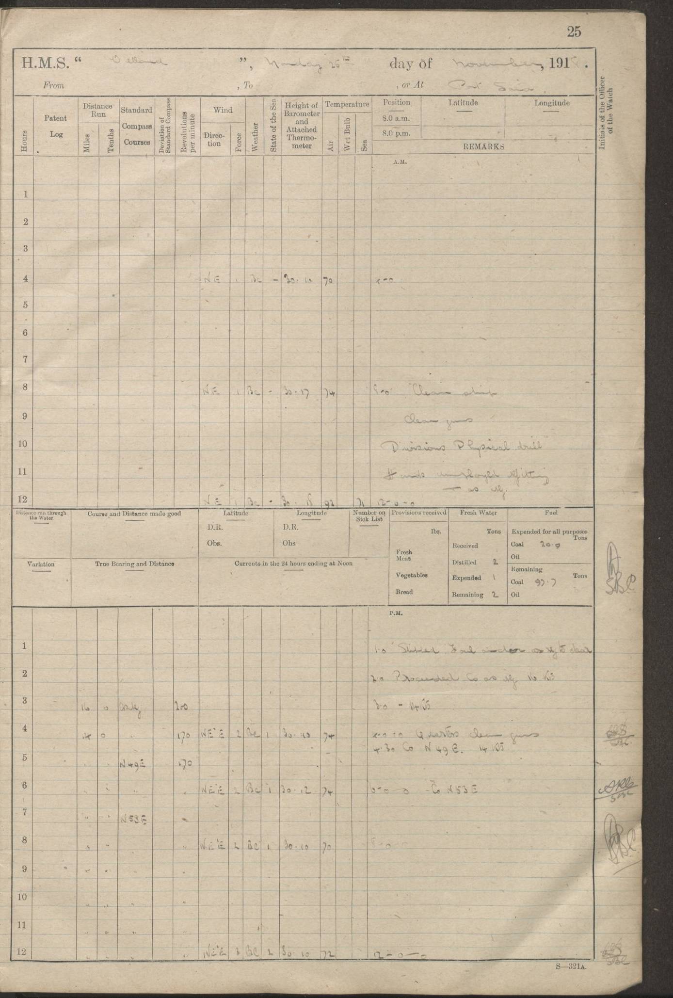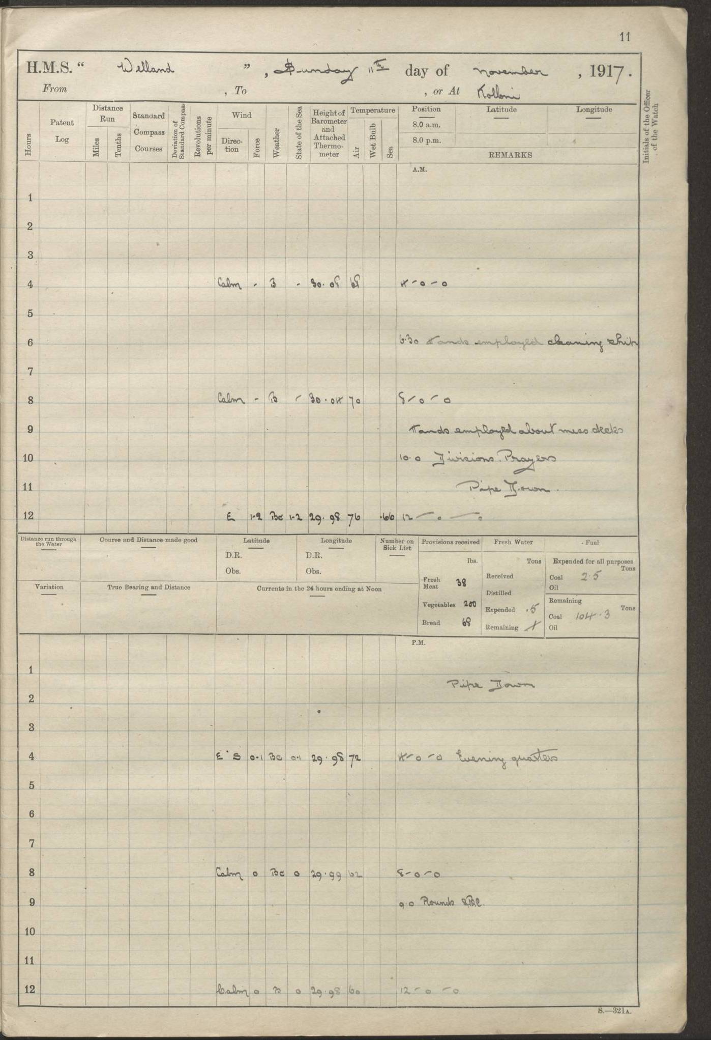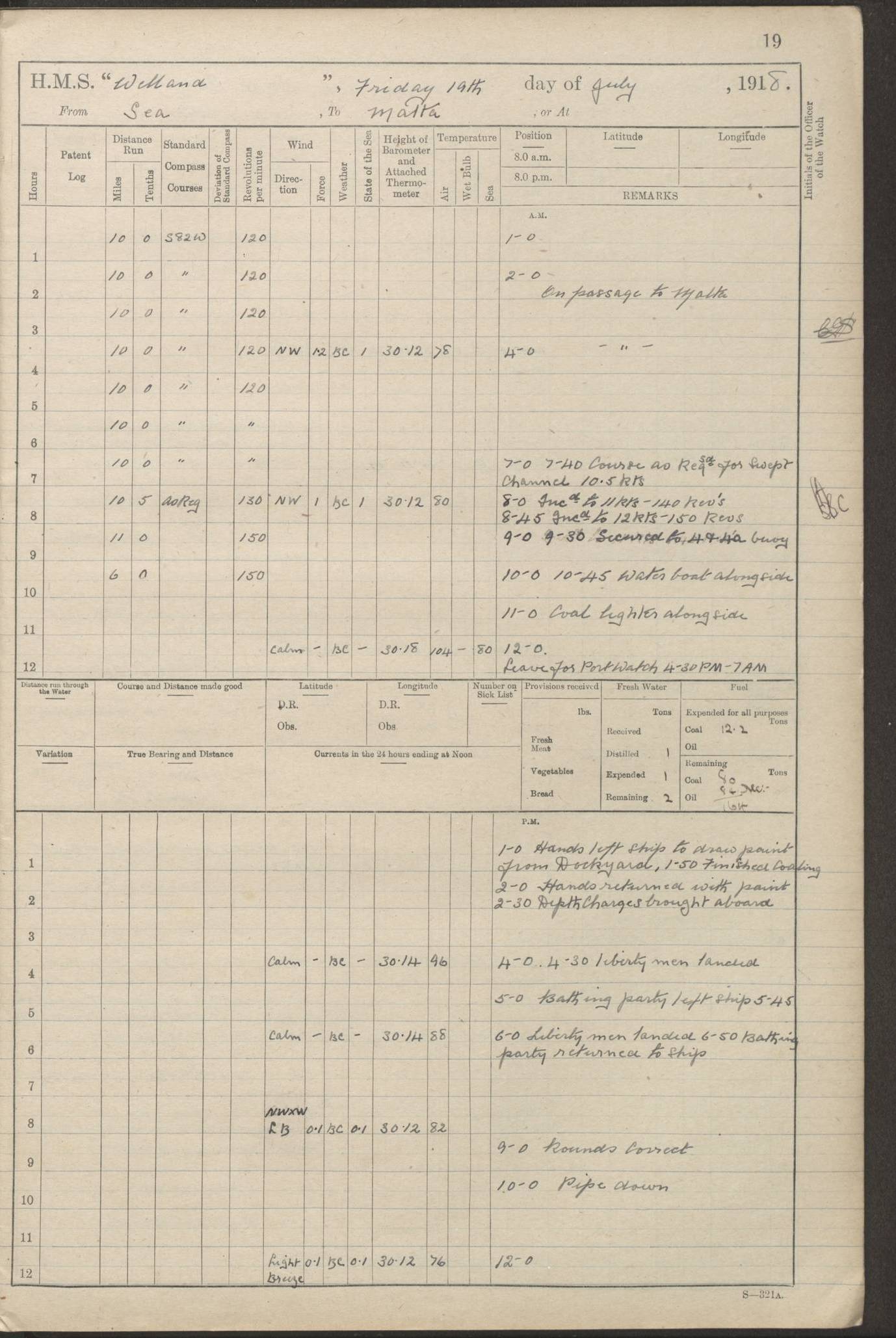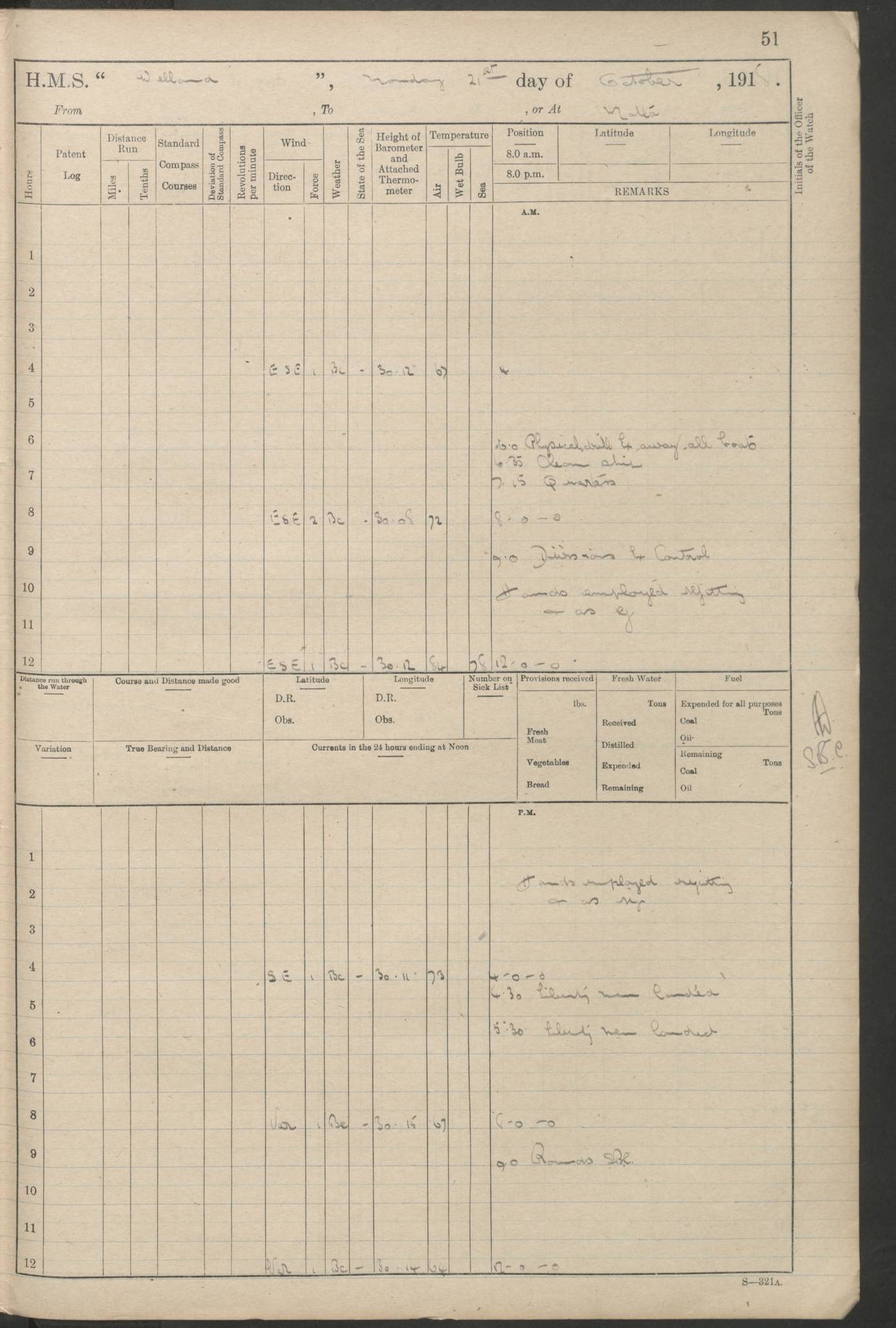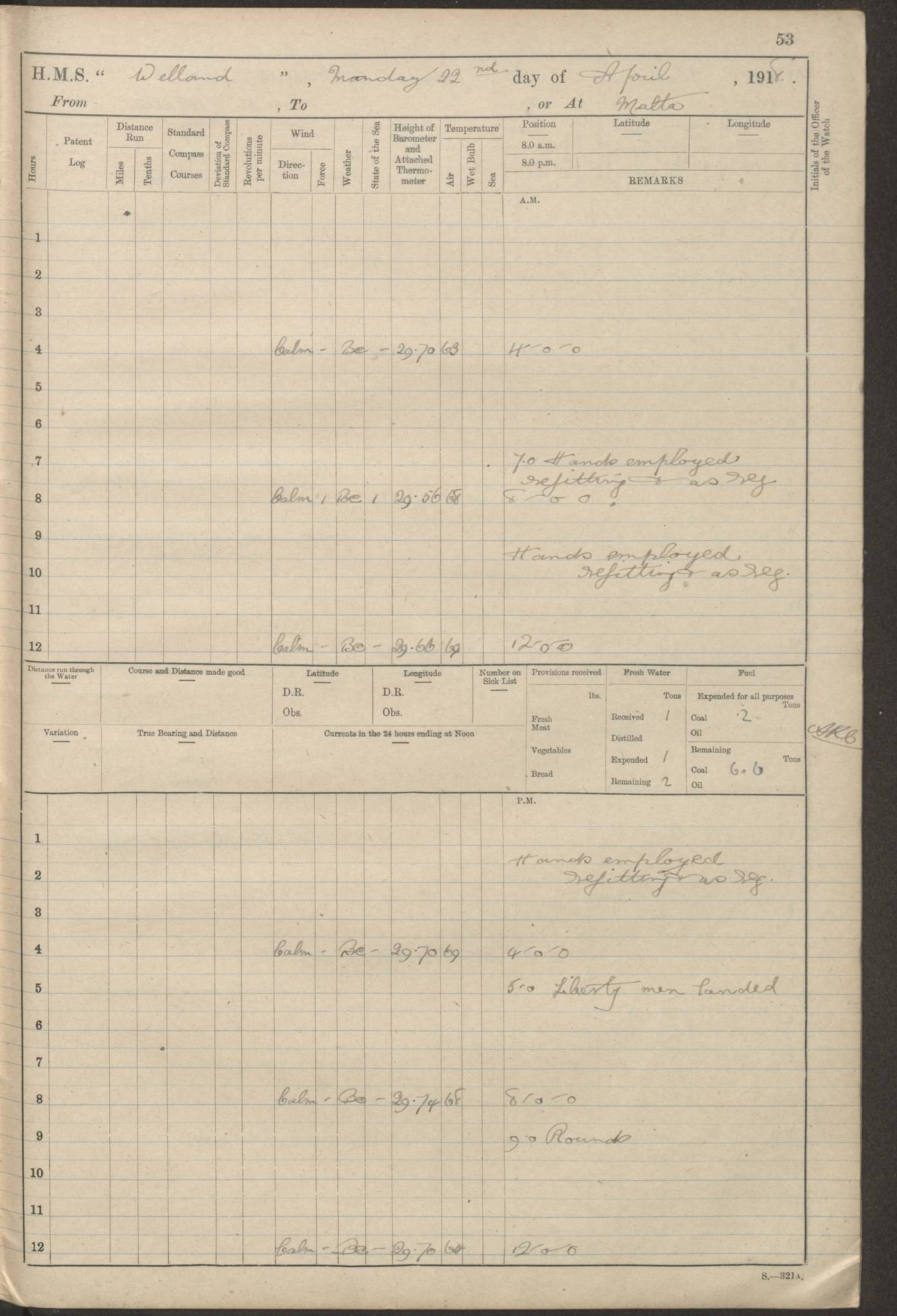 4caf8cadcadfd34197037692: (http://oldweather.s3.amazonaws.com/ADM 53-68366/ADM 53-68366-017_0.jpg) 28 December 1914 Port Said Lat 31.3, Long 32.3 3.15am: Sighted Suez bearing North. 3.55am: Reduced to 7 knots as requisite for Suez. 5.45am: Came to with Starboard anchor off Suez. 6.00am: Hands preparing ship for passage up Canal. 10.30am: Hands employed cleaning guns & small arms. Weighed and proceeded as requisite for passing the Suez Canal. 1.30pm: Hands piped down. 7.05pm: Arrived Port Said. Secured by Starboard anchor & stern to Jetty. 9.00pm: Rounds. 4caf8cadcadfd34197037693: (http://oldweather.s3.amazonaws.com/ADM 53-68366/ADM 53-68366-017_1.jpg) 29 December 1914 Port Said Lat 31.3, Long 32.3 6.00am: Hands employed scrubbing decks & cleaning guns. 8.45am: Hands painting ship. 11.25am: Coal lighters came alongside. Commenced coaling. 1.00pm: Leave to Watch 4.30pm till 6.30pm. 2.00pm: Hands painting ship. 2.10pm: Finished coaling. Received 120 tons. 9.00pm: Rounds. 9.55pm: Russian Cruiser ASKOLD sailed. 4caf8cadcadfd34197037694: (http://oldweather.s3.amazonaws.com/ADM 53-68366/ADM 53-68366-018_0.jpg) 30 December 1914 Port Said to Malta Lat 31.7, Long 31.7 2.30am: Lit up No. 2 & 3 Boilers. 5.15am: Hands employed securing ship for Sea. 6.00am: Pilot came on board. Weighed & proceeded as requisite. 7.15am: Dropped Pilot. Course N 40º W. 9 knots. 9.55am: Damietta Light House bearing S 63º W. 10.00am: Altered course N 74º W. 11.00am: Hands employed cleaning ship & securing gear. 1.00pm: Hands piped down. 5.00pm: Night Defence Stations. Provided ammunition. 4caf8cadcadfd34197037695: (http://oldweather.s3.amazonaws.com/ADM 53-68366/ADM 53-68366-018_1.jpg) 31 December 1914 Port Said to Malta Lat 33.0, Long 27.3 6.15am: Fell out Special Lookouts. Returned ammunition. 7.30am: Formed Divisions Line Ahead to Starboard. Course N 67º W. 9.00am: Hands employed lashing & rigging Splinters Guard & unshipping & clearing away stanchions. 10.10am: Put clocks back 11 minutes. 1.30pm: Hands piped down. 5.5pm: Formed single Line Ahead. Provided ammunition. LOGS FOR JANUARY 1915 4caf8cadcadfd34197037696: (http://oldweather.s3.amazonaws.com/ADM 53-68366/ADM 53-68366-019_0.jpg) 1 January 1915 Port Said to Malta Lat 34.1, Long 22.8 8.30am: Stopped 8.45am: Proceeded. Single line ahead 9.30am: Hands employed making bridge screens 10.18am: Put clocks back 18 minutes 1.30pm: Hands piped down 5.30pm: Formed single line ahead. Provided ammunition. Fresh water: Distilled 1 ton; expended 1 ton; remaining 1.5 tons Fuel: expended for all purposes – coal 22.2 tons; remaining 77.1 tons [A sample complete day’s log] 4caf8cadcadfd34197037697: (http://oldweather.s3.amazonaws.com/ADM 53-68366/ADM 53-68366-019_1.jpg) 2 January 1915 Port Said to Malta Lat 35.2, Long 18.4 7.15am: Hands employed fitting life lines round upper deck 4caf8cadcadfd34197037698: (http://oldweather.s3.amazonaws.com/ADM 53-68366/ADM 53-68366-020_0.jpg) 3 January 1915 Malta Lat 35.9, Long 14.52 6.40am: Fell out special lookouts 10.45am: Secured head and stern at destroyers’ trot Lazaretto Creek 1.00pm: Chelmer shifted billet 4caf8cadcadfd34197037699: (http://oldweather.s3.amazonaws.com/ADM 53-68366/ADM 53-68366-020_1.jpg) 4 January 1915 Malta Lat 35.9, Long 14.52 8.00am: Gave general leave to port watch from 8am to 8am 6th. Coal lighter came alongside. 4caf8cadcadfd3419703769a: (http://oldweather.s3.amazonaws.com/ADM 53-68366/ADM 53-68366-021_0.jpg) 5 January 1915 [6 January in log] Malta Lat 35.9, Long 14.52 4caf8cadcadfd3419703769b: (http://oldweather.s3.amazonaws.com/ADM 53-68366/ADM 53-68366-021_1.jpg) 6 January 1915 Malta Lat 35.9, Long 14.52 12.30pm: Leave to watch from 8am to 8am Friday 4caf8cadcadfd3419703769c: (http://oldweather.s3.amazonaws.com/ADM 53-68366/ADM 53-68366-022_0.jpg) 7 January 1915 Malta Lat 35.9, Long 14.52 4caf8cadcadfd3419703769d: (http://oldweather.s3.amazonaws.com/ADM 53-68366/ADM 53-68366-022_1.jpg) 8 January 1915 Malta Lat 35.9, Long 14.52 6.45am: Hands employed preparing ship for sea 8.30am: Slipped buoy and left Lazaretto Creek. Proceeded as requisite for Grand Harbour. 9.00am: Secured alongside Chelmer at Burmola Wharf, French Creek 4caf8cadcadfd3419703769e: (http://oldweather.s3.amazonaws.com/ADM 53-68366/ADM 53-68366-023_0.jpg) 9 January 1915 Malta Lat 35.9, Long 14.52 8.25am: Hands employed in dockyard and refitting canvas gear 1.15pm: Hands employed returning stores to dockyard 4caf8cadcadfd3419703769f: (http://oldweather.s3.amazonaws.com/ADM 53-68366/ADM 53-68366-023_1.jpg) 10 January 1915 Malta Lat 35.9, Long 14.52 9.30am: Landed church parties 11.30am: Church parties returned 12.25pm: Colne left harbour 4caf8cadcadfd341970376a0: (http://oldweather.s3.amazonaws.com/ADM 53-68366/ADM 53-68366-024_0.jpg) 11 January 1915 Malta Lat 35.9, Long 14.52 8.30am: Sent 2 ratings to hospital 1.30pm: Hands employed refitting fenders Number on sick list: 2 4caf8cadcadfd341970376a1: (http://oldweather.s3.amazonaws.com/ADM 53-68366/ADM 53-68366-024_1.jpg) 12 January 1915 Malta Lat 35.9, Long 14.52 11.00am: Sent 1 rating (sick) to Egmont Number on sick list: 1 4caf8cadcadfd341970376a2: (http://oldweather.s3.amazonaws.com/ADM 53-68366/ADM 53-68366-025_0.jpg) 13 January 1915 Malta Lat 35.9, Long 14.52 10.00am: French battleship Danton docked 4caf8cadcadfd341970376a3: (http://oldweather.s3.amazonaws.com/ADM 53-68366/ADM 53-68366-025_1.jpg) 14 January 1915 Malta Lat 35.9, Long 14.52 6.30am: Hands employed preparing ship for sea 7.30am: Tug came alongside 7.45am: Ship shifted to buoy 8.35am: Commenced swinging for adjustment of compasses 9.30am: Finished swinging 11.30am: One rating rejoined from Egmont 12.10pm: Slipped and proceeded as requisite for leaving Malta, Chelmer and Kennet in company 12.25pm: Set course S87E speed 10 knots 12.35pm: Increased to 12 knots. Hands piped down. 4.00pm: Increased to 13 knots 4.50pm: Night Defence Stations provided ammunition 6.00pm: Placed look-outs 12 midnight: Altered course S88E 4caf8cadcad