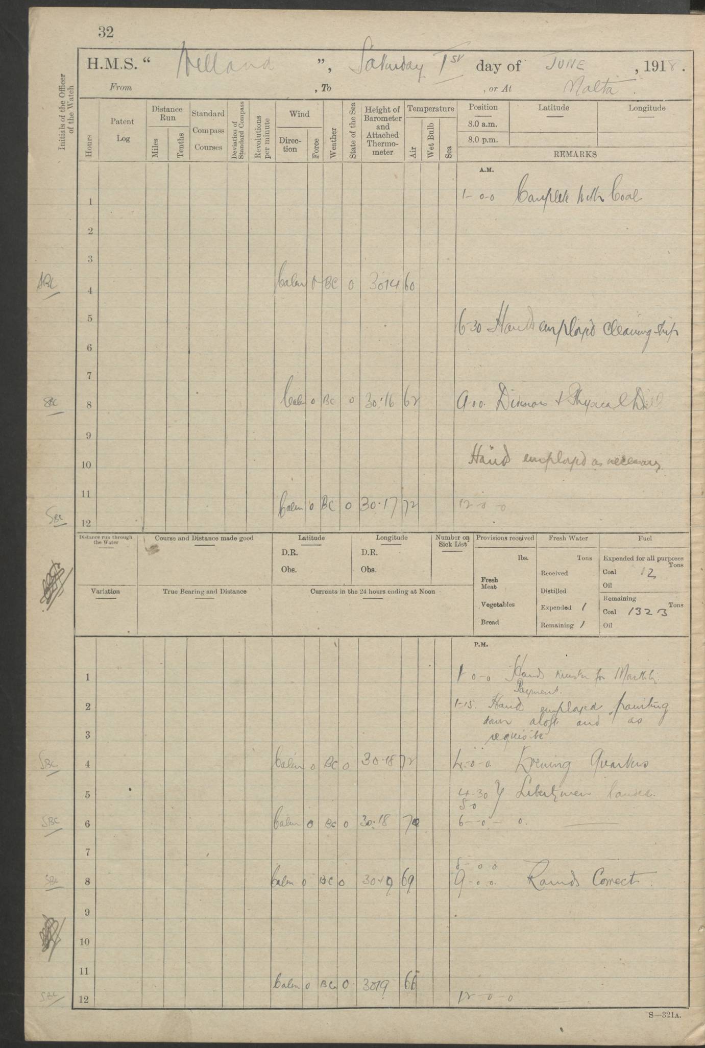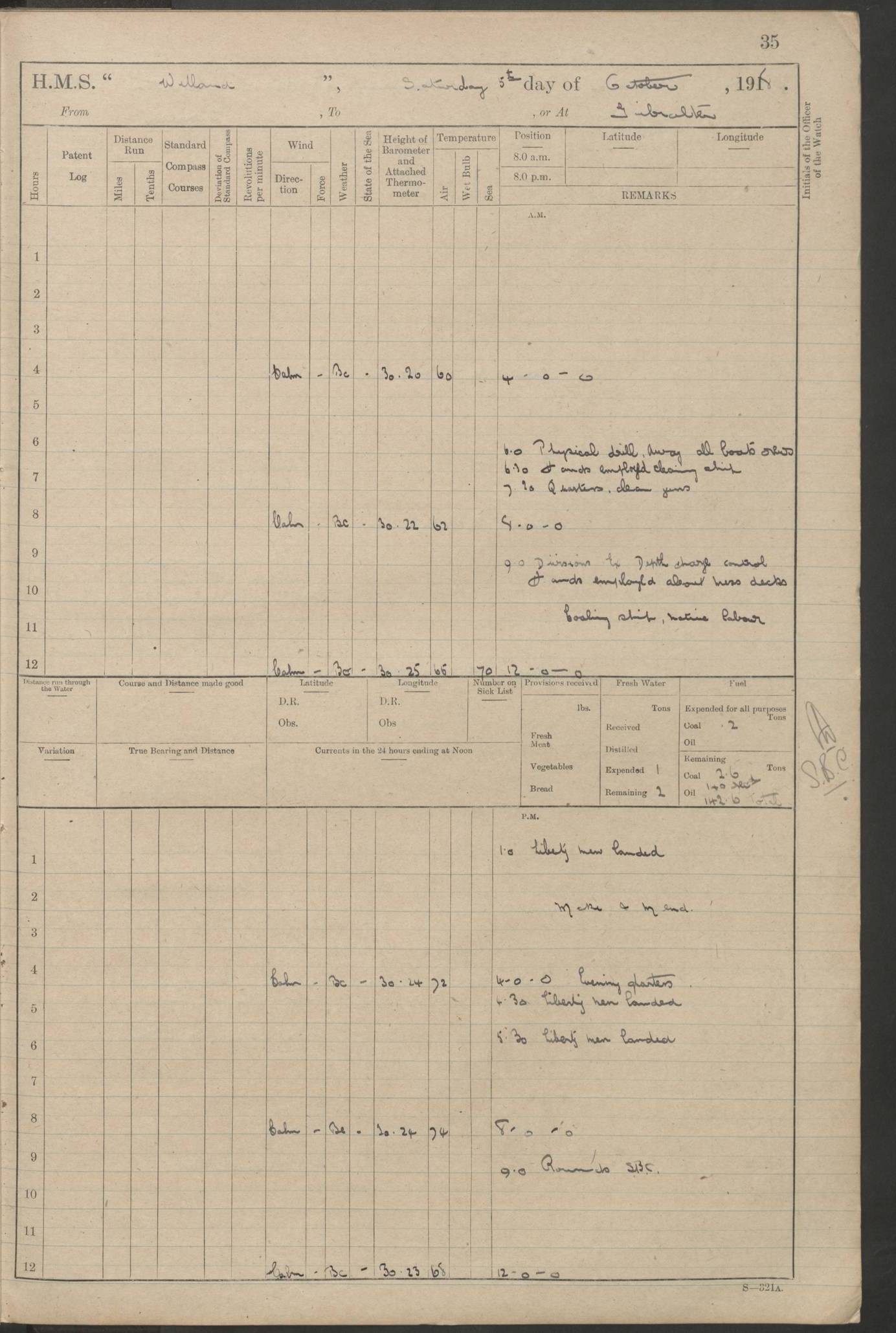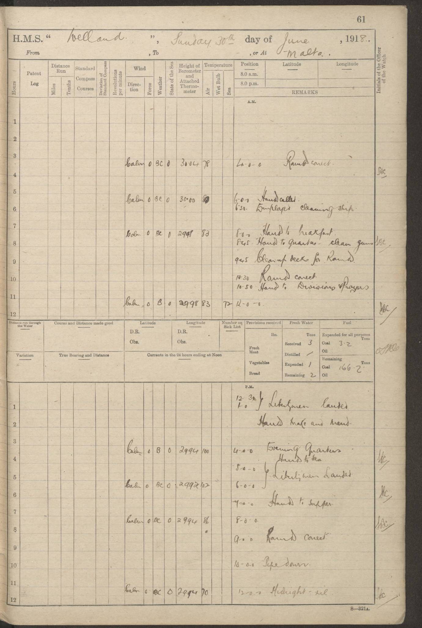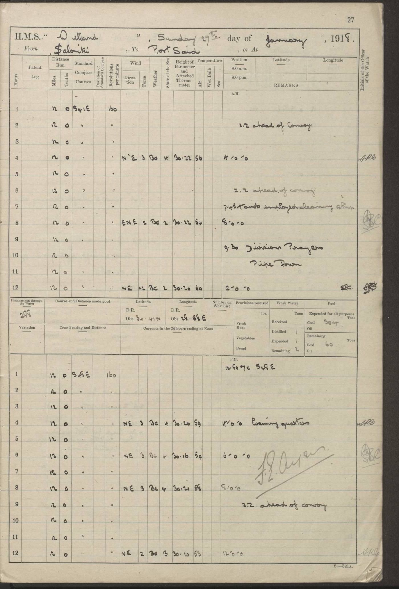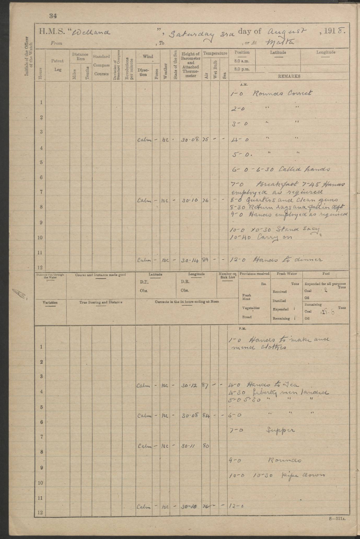 4caf8cadcadfd34197037692: (http://oldweather.s3.amazonaws.com/ADM 53-68366/ADM 53-68366-017_0.jpg) 28 December 1914 Port Said Lat 31.3, Long 32.3 3.15am: Sighted Suez bearing North. 3.55am: Reduced to 7 knots as requisite for Suez. 5.45am: Came to with Starboard anchor off Suez. 6.00am: Hands preparing ship for passage up Canal. 10.30am: Hands employed cleaning guns & small arms. Weighed and proceeded as requisite for passing the Suez Canal. 1.30pm: Hands piped down. 7.05pm: Arrived Port Said. Secured by Starboard anchor & stern to Jetty. 9.00pm: Rounds. 4caf8cadcadfd34197037693: (http://oldweather.s3.amazonaws.com/ADM 53-68366/ADM 53-68366-017_1.jpg) 29 December 1914 Port Said Lat 31.3, Long 32.3 6.00am: Hands employed scrubbing decks & cleaning guns. 8.45am: Hands painting ship. 11.25am: Coal lighters came alongside. Commenced coaling. 1.00pm: Leave to Watch 4.30pm till 6.30pm. 2.00pm: Hands painting ship. 2.10pm: Finished coaling. Received 120 tons. 9.00pm: Rounds. 9.55pm: Russian Cruiser ASKOLD sailed. 4caf8cadcadfd34197037694: (http://oldweather.s3.amazonaws.com/ADM 53-68366/ADM 53-68366-018_0.jpg) 30 December 1914 Port Said to Malta Lat 31.7, Long 31.7 2.30am: Lit up No. 2 & 3 Boilers. 5.15am: Hands employed securing ship for Sea. 6.00am: Pilot came on board. Weighed & proceeded as requisite. 7.15am: Dropped Pilot. Course N 40º W. 9 knots. 9.55am: Damietta Light House bearing S 63º W. 10.00am: Altered course N 74º W. 11.00am: Hands employed cleaning ship & securing gear. 1.00pm: Hands piped down. 5.00pm: Night Defence Stations. Provided ammunition. 4caf8cadcadfd34197037695: (http://oldweather.s3.amazonaws.com/ADM 53-68366/ADM 53-68366-018_1.jpg) 31 December 1914 Port Said to Malta Lat 33.0, Long 27.3 6.15am: Fell out Special Lookouts. Returned ammunition. 7.30am: Formed Divisions Line Ahead to Starboard. Course N 67º W. 9.00am: Hands employed lashing & rigging Splinters Guard & unshipping & clearing away stanchions. 10.10am: Put clocks back 11 minutes. 1.30pm: Hands piped down. 5.5pm: Formed single Line Ahead. Provided ammunition. LOGS FOR JANUARY 1915 4caf8cadcadfd34197037696: (http://oldweather.s3.amazonaws.com/ADM 53-68366/ADM 53-68366-019_0.jpg) 1 January 1915 Port Said to Malta Lat 34.1, Long 22.8 8.30am: Stopped 8.45am: Proceeded. Single line ahead 9.30am: Hands employed making bridge screens 10.18am: Put clocks back 18 minutes 1.30pm: Hands piped down 5.30pm: Formed single line ahead. Provided ammunition. Fresh water: Distilled 1 ton; expended 1 ton; remaining 1.5 tons Fuel: expended for all purposes – coal 22.2 tons; remaining 77.1 tons [A sample complete day’s log] 4caf8cadcadfd34197037697: (http://oldweather.s3.amazonaws.com/ADM 53-68366/ADM 53-68366-019_1.jpg) 2 January 1915 Port Said to Malta Lat 35.2, Long 18.4 7.15am: Hands employed fitting life lines round upper deck 4caf8cadcadfd34197037698: (http://oldweather.s3.amazonaws.com/ADM 53-68366/ADM 53-68366-020_0.jpg) 3 January 1915 Malta Lat 35.9, Long 14.52 6.40am: Fell out special lookouts 10.45am: Secured head and stern at destroyers’ trot Lazaretto Creek 1.00pm: Chelmer shifted billet 4caf8cadcadfd34197037699: (http://oldweather.s3.amazonaws.com/ADM 53-68366/ADM 53-68366-020_1.jpg) 4 January 1915 Malta Lat 35.9, Long 14.52 8.00am: Gave general leave to port watch from 8am to 8am 6th. Coal lighter came alongside. 4caf8cadcadfd3419703769a: (http://oldweather.s3.amazonaws.com/ADM 53-68366/ADM 53-68366-021_0.jpg) 5 January 1915 [6 January in log] Malta Lat 35.9, Long 14.52 4caf8cadcadfd3419703769b: (http://oldweather.s3.amazonaws.com/ADM 53-68366/ADM 53-68366-021_1.jpg) 6 January 1915 Malta Lat 35.9, Long 14.52 12.30pm: Leave to watch from 8am to 8am Friday 4caf8cadcadfd3419703769c: (http://oldweather.s3.amazonaws.com/ADM 53-68366/ADM 53-68366-022_0.jpg) 7 January 1915 Malta Lat 35.9, Long 14.52 4caf8cadcadfd3419703769d: (http://oldweather.s3.amazonaws.com/ADM 53-68366/ADM 53-68366-022_1.jpg) 8 January 1915 Malta Lat 35.9, Long 14.52 6.45am: Hands employed preparing ship for sea 8.30am: Slipped buoy and left Lazaretto Creek. Proceeded as requisite for Grand Harbour. 9.00am: Secured alongside Chelmer at Burmola Wharf, French Creek 4caf8cadcadfd3419703769e: (http://oldweather.s3.amazonaws.com/ADM 53-68366/ADM 53-68366-023_0.jpg) 9 January 1915 Malta Lat 35.9, Long 14.52 8.25am: Hands employed in dockyard and refitting canvas gear 1.15pm: Hands employed returning stores to dockyard 4caf8cadcadfd3419703769f: (http://oldweather.s3.amazonaws.com/ADM 53-68366/ADM 53-68366-023_1.jpg) 10 January 1915 Malta Lat 35.9, Long 14.52 9.30am: Landed church parties 11.30am: Church parties returned 12.25pm: Colne left harbour 4caf8cadcadfd341970376a0: (http://oldweather.s3.amazonaws.com/ADM 53-68366/ADM 53-68366-024_0.jpg) 11 January 1915 Malta Lat 35.9, Long 14.52 8.30am: Sent 2 ratings to hospital 1.30pm: Hands employed refitting fenders Number on sick list: 2 4caf8cadcadfd341970376a1: (http://oldweather.s3.amazonaws.com/ADM 53-68366/ADM 53-68366-024_1.jpg) 12 January 1915 Malta Lat 35.9, Long 14.52 11.00am: Sent 1 rating (sick) to Egmont Number on sick list: 1 4caf8cadcadfd341970376a2: (http://oldweather.s3.amazonaws.com/ADM 53-68366/ADM 53-68366-025_0.jpg) 13 January 1915 Malta Lat 35.9, Long 14.52 10.00am: French battleship Danton docked 4caf8cadcadfd341970376a3: (http://oldweather.s3.amazonaws.com/ADM 53-68366/ADM 53-68366-025_1.jpg) 14 January 1915 Malta Lat 35.9, Long 14.52 6.30am: Hands employed preparing ship for sea 7.30am: Tug came alongside 7.45am: Ship shifted to buoy 8.35am: Commenced swinging for adjustment of compasses 9.30am: Finished swinging 11.30am: One rating rejoined from Egmont 12.10pm: Slipped and proceeded as requisite for leaving Malta, Chelmer and Kennet in company 12.25pm: Set course S87E speed 10 knots 12.35pm: Increased to 12 knots. Hands piped down. 4.00pm: Increased to 13 knots 4.50pm: Night Defence Stations provided ammunition 6.00pm: Placed look-outs 12 midnight: Altered course S88E 4caf8cadcad
