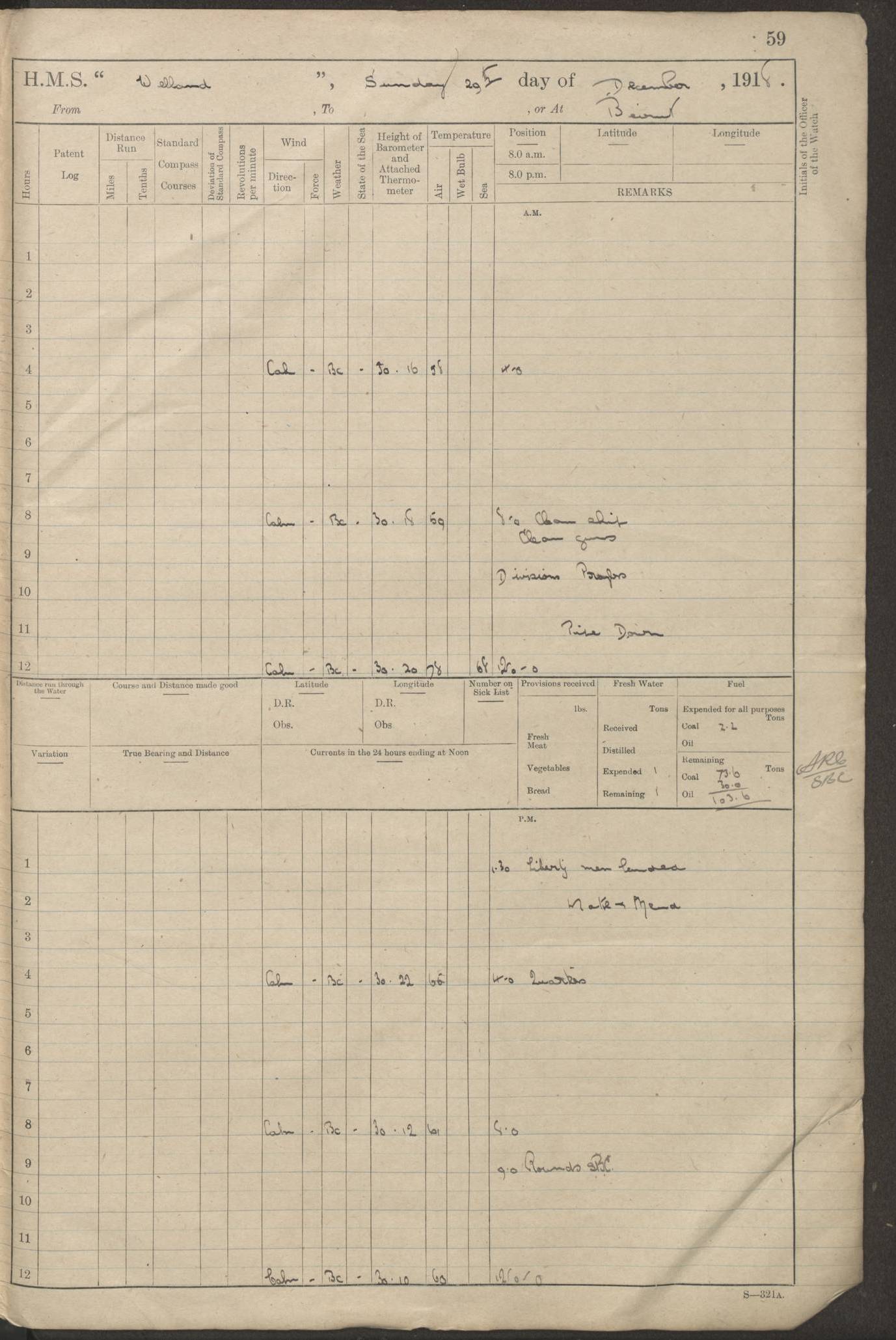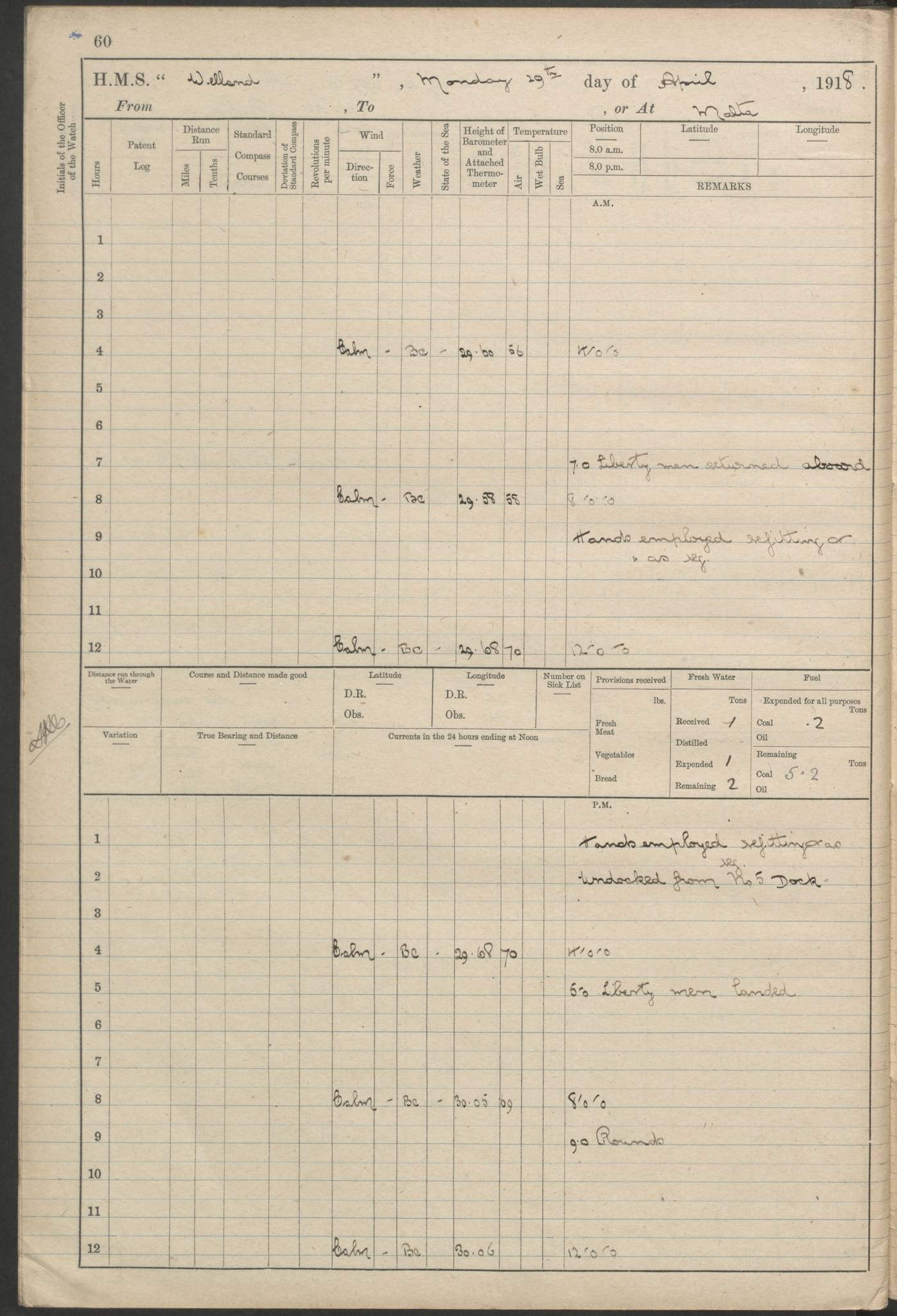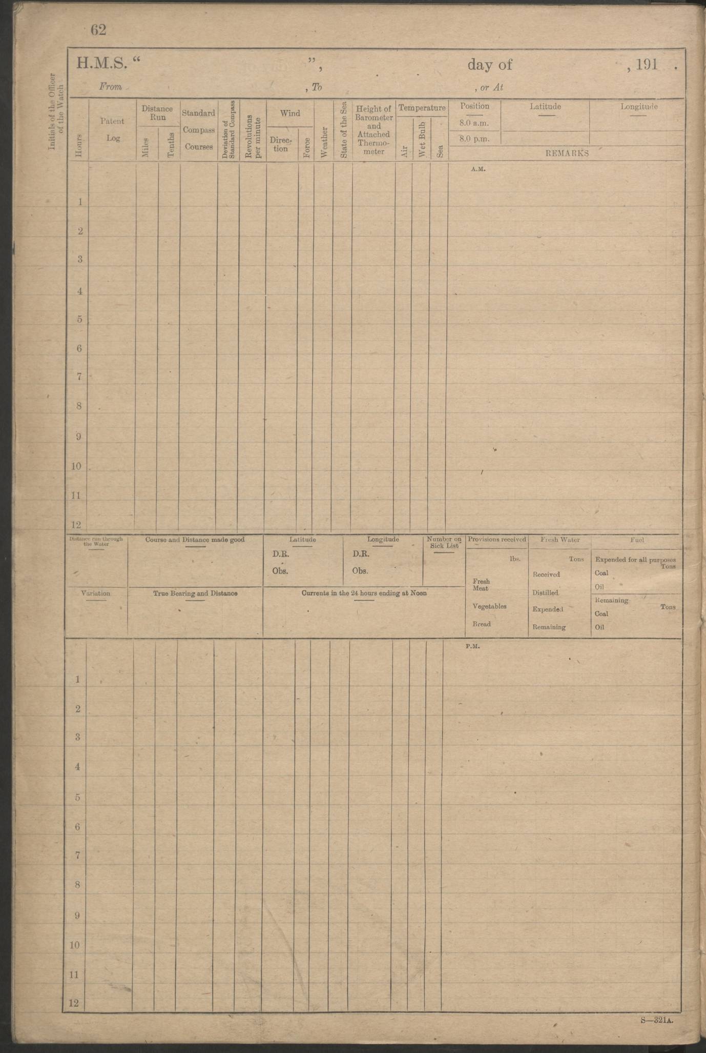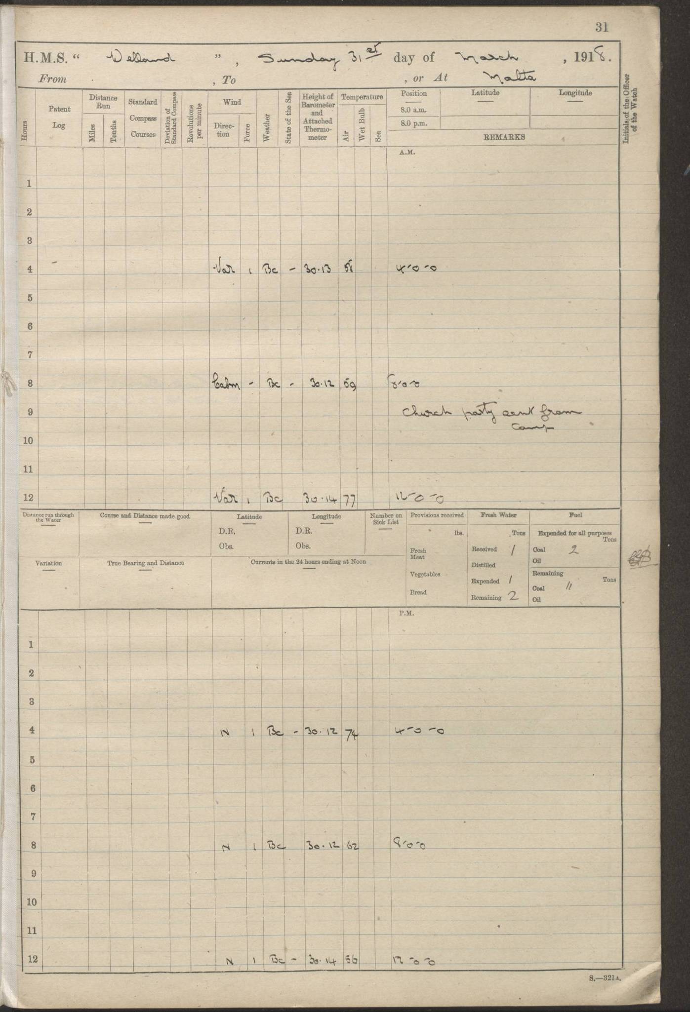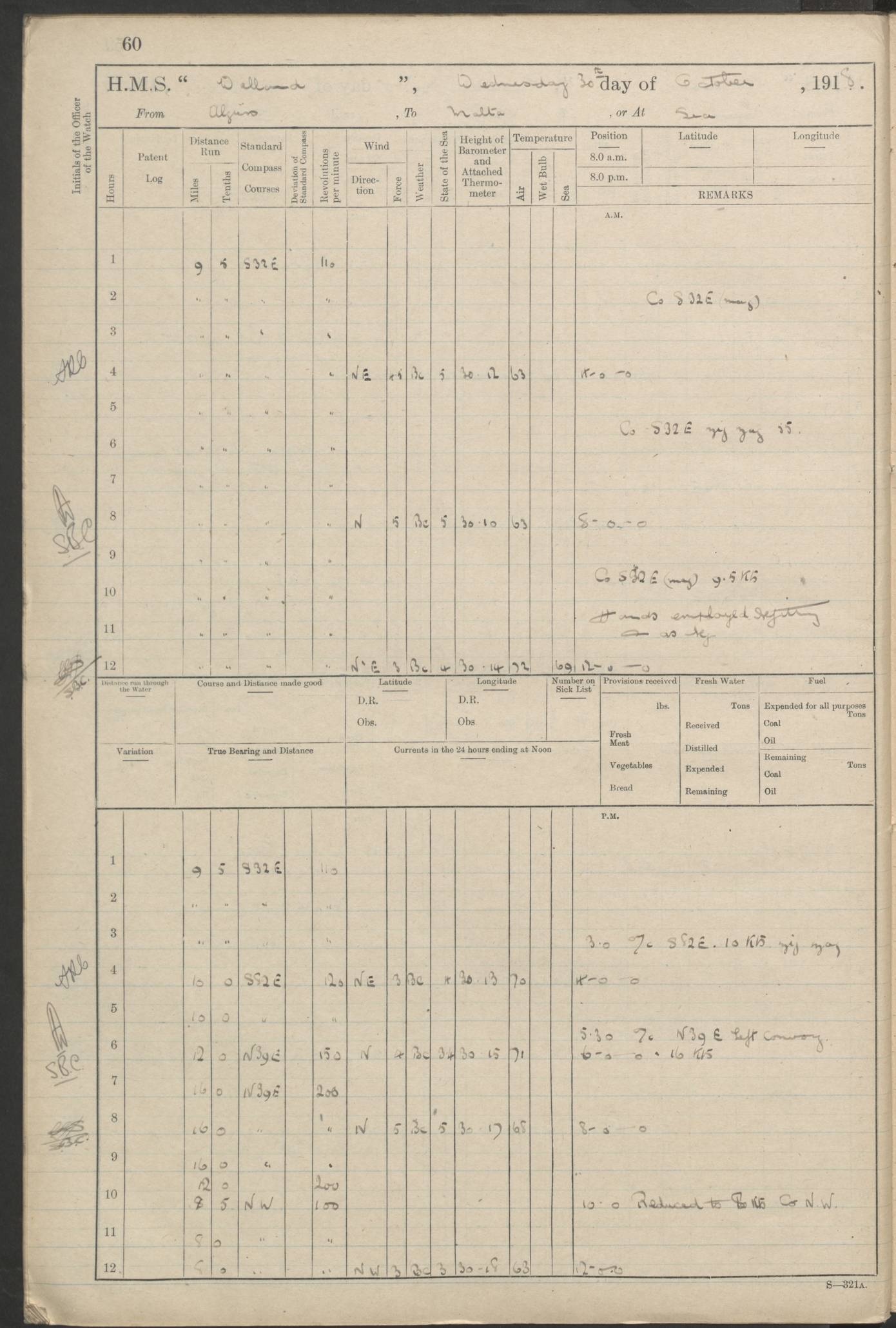 4caf8cadcadfd34197037692: (http://oldweather.s3.amazonaws.com/ADM 53-68366/ADM 53-68366-017_0.jpg) 28 December 1914 Port Said Lat 31.3, Long 32.3 3.15am: Sighted Suez bearing North. 3.55am: Reduced to 7 knots as requisite for Suez. 5.45am: Came to with Starboard anchor off Suez. 6.00am: Hands preparing ship for passage up Canal. 10.30am: Hands employed cleaning guns & small arms. Weighed and proceeded as requisite for passing the Suez Canal. 1.30pm: Hands piped down. 7.05pm: Arrived Port Said. Secured by Starboard anchor & stern to Jetty. 9.00pm: Rounds. 4caf8cadcadfd34197037693: (http://oldweather.s3.amazonaws.com/ADM 53-68366/ADM 53-68366-017_1.jpg) 29 December 1914 Port Said Lat 31.3, Long 32.3 6.00am: Hands employed scrubbing decks & cleaning guns. 8.45am: Hands painting ship. 11.25am: Coal lighters came alongside. Commenced coaling. 1.00pm: Leave to Watch 4.30pm till 6.30pm. 2.00pm: Hands painting ship. 2.10pm: Finished coaling. Received 120 tons. 9.00pm: Rounds. 9.55pm: Russian Cruiser ASKOLD sailed. 4caf8cadcadfd34197037694: (http://oldweather.s3.amazonaws.com/ADM 53-68366/ADM 53-68366-018_0.jpg) 30 December 1914 Port Said to Malta Lat 31.7, Long 31.7 2.30am: Lit up No. 2 & 3 Boilers. 5.15am: Hands employed securing ship for Sea. 6.00am: Pilot came on board. Weighed & proceeded as requisite. 7.15am: Dropped Pilot. Course N 40º W. 9 knots. 9.55am: Damietta Light House bearing S 63º W. 10.00am: Altered course N 74º W. 11.00am: Hands employed cleaning ship & securing gear. 1.00pm: Hands piped down. 5.00pm: Night Defence Stations. Provided ammunition. 4caf8cadcadfd34197037695: (http://oldweather.s3.amazonaws.com/ADM 53-68366/ADM 53-68366-018_1.jpg) 31 December 1914 Port Said to Malta Lat 33.0, Long 27.3 6.15am: Fell out Special Lookouts. Returned ammunition. 7.30am: Formed Divisions Line Ahead to Starboard. Course N 67º W. 9.00am: Hands employed lashing & rigging Splinters Guard & unshipping & clearing away stanchions. 10.10am: Put clocks back 11 minutes. 1.30pm: Hands piped down. 5.5pm: Formed single Line Ahead. Provided ammunition. LOGS FOR JANUARY 1915 4caf8cadcadfd34197037696: (http://oldweather.s3.amazonaws.com/ADM 53-68366/ADM 53-68366-019_0.jpg) 1 January 1915 Port Said to Malta Lat 34.1, Long 22.8 8.30am: Stopped 8.45am: Proceeded. Single line ahead 9.30am: Hands employed making bridge screens 10.18am: Put clocks back 18 minutes 1.30pm: Hands piped down 5.30pm: Formed single line ahead. Provided ammunition. Fresh water: Distilled 1 ton; expended 1 ton; remaining 1.5 tons Fuel: expended for all purposes – coal 22.2 tons; remaining 77.1 tons [A sample complete day’s log] 4caf8cadcadfd34197037697: (http://oldweather.s3.amazonaws.com/ADM 53-68366/ADM 53-68366-019_1.jpg) 2 January 1915 Port Said to Malta Lat 35.2, Long 18.4 7.15am: Hands employed fitting life lines round upper deck 4caf8cadcadfd34197037698: (http://oldweather.s3.amazonaws.com/ADM 53-68366/ADM 53-68366-020_0.jpg) 3 January 1915 Malta Lat 35.9, Long 14.52 6.40am: Fell out special lookouts 10.45am: Secured head and stern at destroyers’ trot Lazaretto Creek 1.00pm: Chelmer shifted billet 4caf8cadcadfd34197037699: (http://oldweather.s3.amazonaws.com/ADM 53-68366/ADM 53-68366-020_1.jpg) 4 January 1915 Malta Lat 35.9, Long 14.52 8.00am: Gave general leave to port watch from 8am to 8am 6th. Coal lighter came alongside. 4caf8cadcadfd3419703769a: (http://oldweather.s3.amazonaws.com/ADM 53-68366/ADM 53-68366-021_0.jpg) 5 January 1915 [6 January in log] Malta Lat 35.9, Long 14.52 4caf8cadcadfd3419703769b: (http://oldweather.s3.amazonaws.com/ADM 53-68366/ADM 53-68366-021_1.jpg) 6 January 1915 Malta Lat 35.9, Long 14.52 12.30pm: Leave to watch from 8am to 8am Friday 4caf8cadcadfd3419703769c: (http://oldweather.s3.amazonaws.com/ADM 53-68366/ADM 53-68366-022_0.jpg) 7 January 1915 Malta Lat 35.9, Long 14.52 4caf8cadcadfd3419703769d: (http://oldweather.s3.amazonaws.com/ADM 53-68366/ADM 53-68366-022_1.jpg) 8 January 1915 Malta Lat 35.9, Long 14.52 6.45am: Hands employed preparing ship for sea 8.30am: Slipped buoy and left Lazaretto Creek. Proceeded as requisite for Grand Harbour. 9.00am: Secured alongside Chelmer at Burmola Wharf, French Creek 4caf8cadcadfd3419703769e: (http://oldweather.s3.amazonaws.com/ADM 53-68366/ADM 53-68366-023_0.jpg) 9 January 1915 Malta Lat 35.9, Long 14.52 8.25am: Hands employed in dockyard and refitting canvas gear 1.15pm: Hands employed returning stores to dockyard 4caf8cadcadfd3419703769f: (http://oldweather.s3.amazonaws.com/ADM 53-68366/ADM 53-68366-023_1.jpg) 10 January 1915 Malta Lat 35.9, Long 14.52 9.30am: Landed church parties 11.30am: Church parties returned 12.25pm: Colne left harbour 4caf8cadcadfd341970376a0: (http://oldweather.s3.amazonaws.com/ADM 53-68366/ADM 53-68366-024_0.jpg) 11 January 1915 Malta Lat 35.9, Long 14.52 8.30am: Sent 2 ratings to hospital 1.30pm: Hands employed refitting fenders Number on sick list: 2 4caf8cadcadfd341970376a1: (http://oldweather.s3.amazonaws.com/ADM 53-68366/ADM 53-68366-024_1.jpg) 12 January 1915 Malta Lat 35.9, Long 14.52 11.00am: Sent 1 rating (sick) to Egmont Number on sick list: 1 4caf8cadcadfd341970376a2: (http://oldweather.s3.amazonaws.com/ADM 53-68366/ADM 53-68366-025_0.jpg) 13 January 1915 Malta Lat 35.9, Long 14.52 10.00am: French battleship Danton docked 4caf8cadcadfd341970376a3: (http://oldweather.s3.amazonaws.com/ADM 53-68366/ADM 53-68366-025_1.jpg) 14 January 1915 Malta Lat 35.9, Long 14.52 6.30am: Hands employed preparing ship for sea 7.30am: Tug came alongside 7.45am: Ship shifted to buoy 8.35am: Commenced swinging for adjustment of compasses 9.30am: Finished swinging 11.30am: One rating rejoined from Egmont 12.10pm: Slipped and proceeded as requisite for leaving Malta, Chelmer and Kennet in company 12.25pm: Set course S87E speed 10 knots 12.35pm: Increased to 12 knots. Hands piped down. 4.00pm: Increased to 13 knots 4.50pm: Night Defence Stations provided ammunition 6.00pm: Placed look-outs 12 midnight: Altered course S88E 4caf8cadcad
