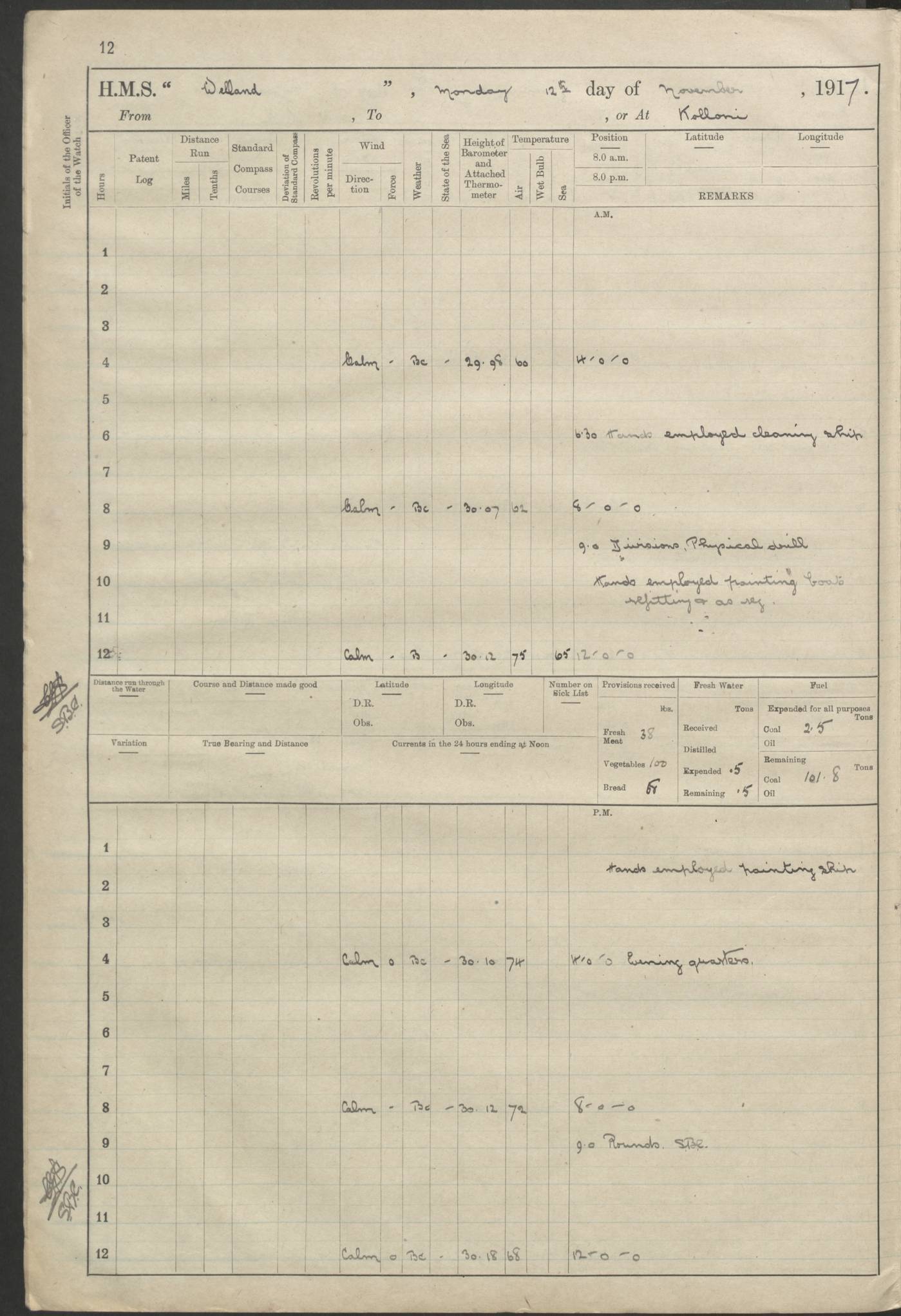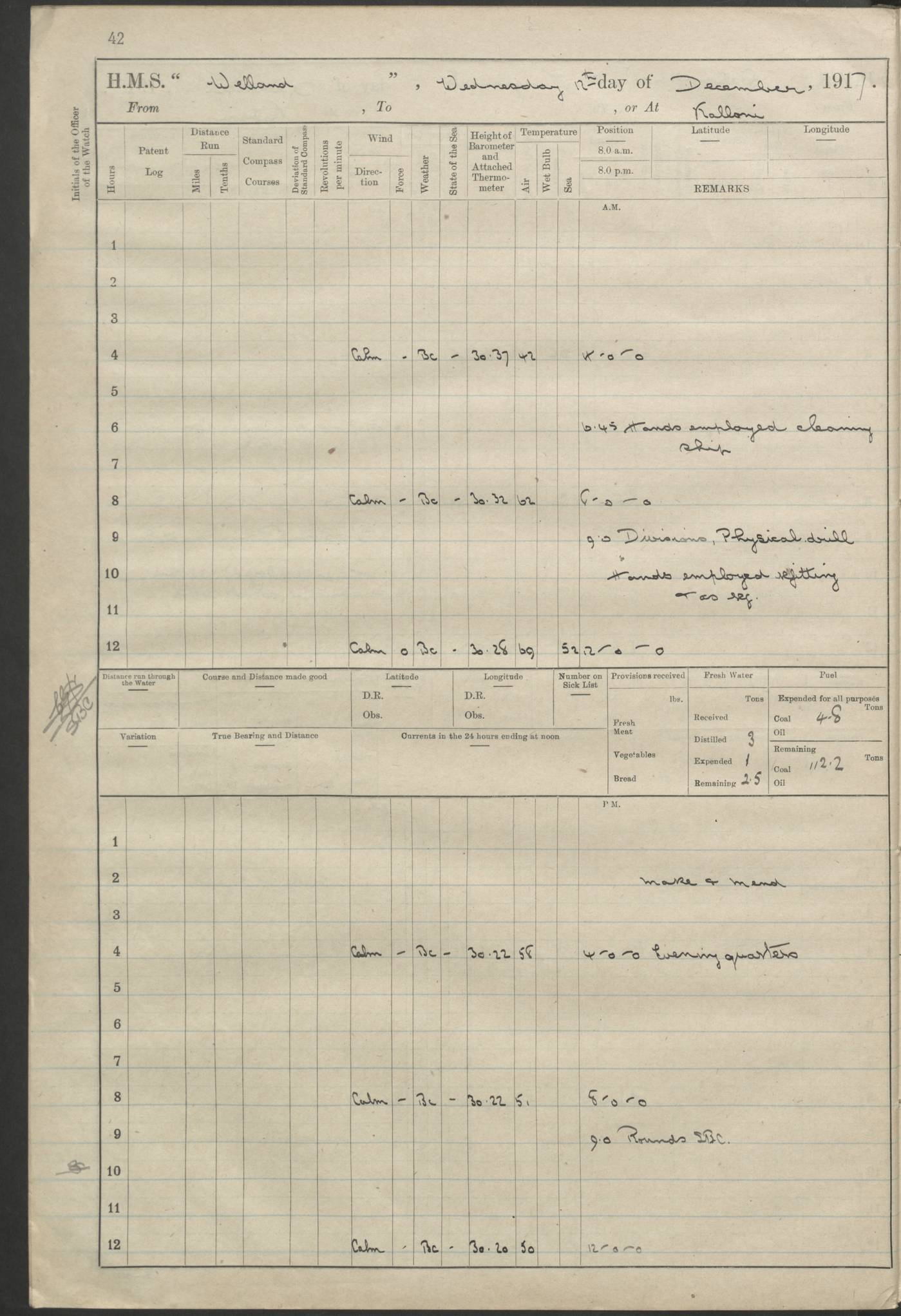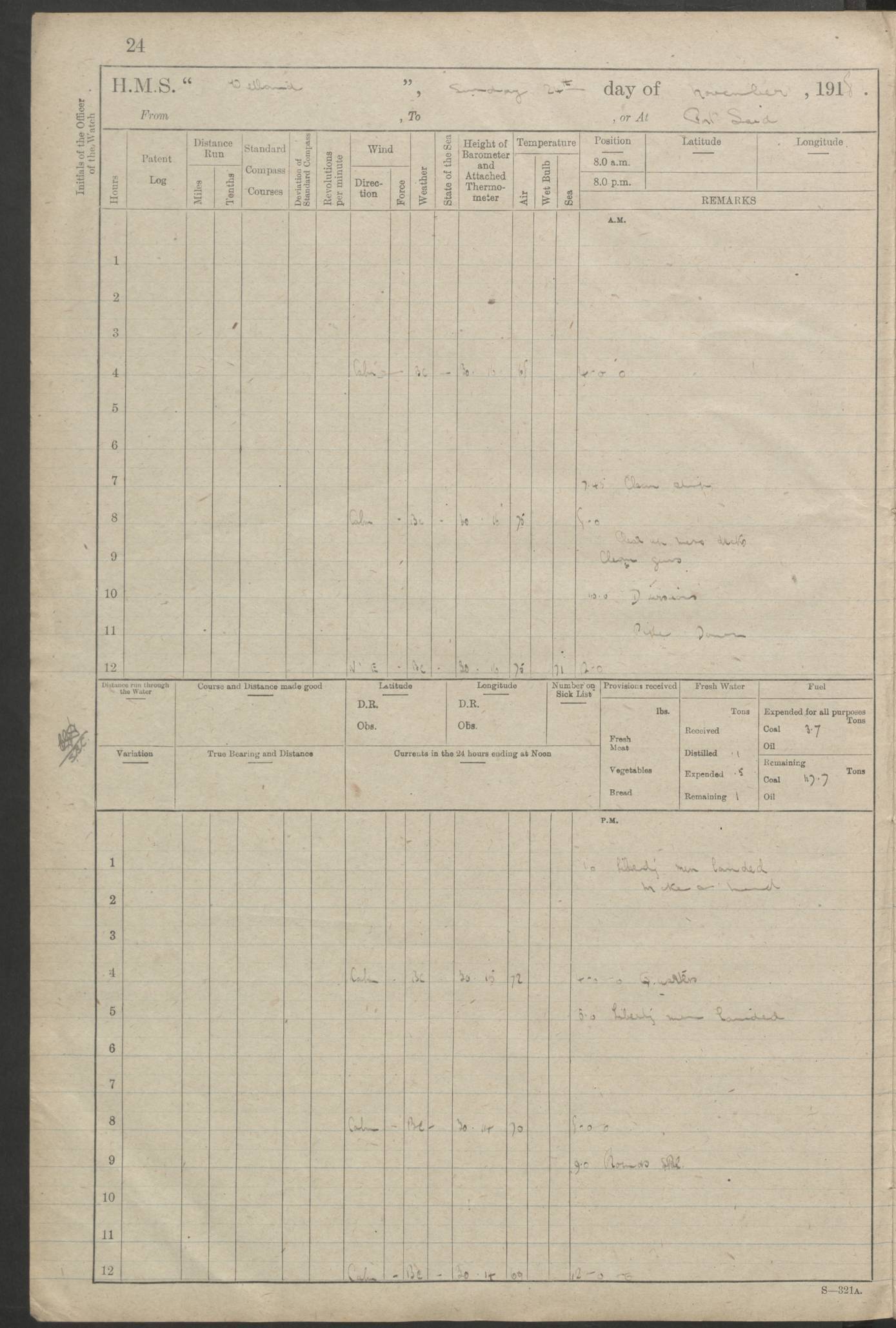 Altered course N 60º W. 3.35pm: Reduced to 10 knots. 4.05pm: As requisite for approaching Singapore. 4.45pm: Arrived at anchor inside Breakwater. 7.00pm: Gave Leave to Watch till 10.00pm. 9.00pm: Rounds. 4caf8cadcadfd34197037664: (http://oldweather.s3.amazonaws.com/ADM 53-68365/ADM 53-68365-029_0.jpg) 21 November 1914 Singapore Lat 1.26, Long 103.85 6.00am: Hands employed cleaning ship & boats. 8.45am: Hands employed cleaning ship. 1.00pm: Leave to Watch 1.30pm till 6.00am. 2.00pm: Hands Make & Mend clothes. 9.00pm: Rounds. 4caf8cadcadfd34197037665: (http://oldweather.s3.amazonaws.com/ADM 53-68365/ADM 53-68365-029_1.jpg) 22 November 1914 Singapore Lat 1.26, Long 103.85 5.45am: Hands employed cleaning ship. 9.00am: Weighed & proceeded to Keppel Harbour. 9.40am: Entered No. 1 dock. 11.00am: Hands employed docking ship. 1.00pm: Leave to Watch 1.30pm till 6.00am. 2.00pm: Hands Make & Mend clothes. 5.30pm: Exercise Fire Stations. 9.00pm: Rounds. 10.00pm: Hands piped down. 4caf8cadcadfd34197037666: (http://oldweather.s3.amazonaws.com/ADM 53-68365/ADM 53-68365-030_0.jpg) 23 November 1914 Singapore Lat 1.26, Long 103.85 6.00am: Hands employed cleaning ship. 8.00am: 1 Rating discharged to COLNE (sick). 8.25am: Hands refitting guard rails. 10.00am: CHELMER arrived & docked. 1.00pm: Leave to Watch 5.30pm till 6.30am. 1.30pm: Hands employed as in forenoon 5.15pm: Paid Monthly money. 9.00pm: Rounds. 4caf8cadcadfd34197037667: (http://oldweather.s3.amazonaws.com/ADM 53-68365/ADM 53-68365-030_1.jpg) 24 November 1914 Singapore Lat 1.26, Long 103.85 7.00am: Hands employed dismounting & cleaning guns. 8.30am: Hands employed refitting guard rails. 1.00pm: Special Leave to Watch 5.30pm till 7.00am. 2.00pm: Hands employed as in forenoon 9.00pm: Rounds 4caf8cadcadfd34197037668: (http://oldweather.s3.amazonaws.com/ADM 53-68365/ADM 53-68365-031_0.jpg) 25 November 1914 Singapore Lat 1.26, Long 103.85 7.00am: Hands employed cleaning guns. 8.30am: Hands employed refitting whaler's falls & stripping down guns. 1.30pm: Hands employed reassembling & cleaning guns. 2.00pm: Leave to Watch 5.30pm till 7.00am. 9.00pm: Rounds. 4caf8cadcadfd34197037669: (http://oldweather.s3.amazonaws.com/ADM 53-68365/ADM 53-68365-031_1.jpg) 26 November 1914 Singapore Lat 1.26, Long 103.85 7.00am: Hands employed cleaning guns. 8.30am: Hands employed refitting guard rails. 1.30pm: Hands employed painting Forecastle awning & remounting Starboard 12 pounder. 3.00pm: Special Leave to Watch 5.30pm till 7.00am. 9.00pm: Rounds. 4caf8cadcadfd3419703766a: (http://oldweather.s3.amazonaws.com/ADM 53-68365/ADM 53-68365-032_0.jpg) 27 November 1914 Singapore Lat 1.26, Long 103.85 7.00am: Hands employed cleaning guns. 8.15am: Hands employed painting ship. 1.00pm: Flooded dock. 1.30pm: Hands employed drawing stores & as requisite. 4.20pm: Undocked ship. 5.00pm: Went alongside coaling wharf. 5.10pm: Commenced coaling. 7.00pm: Finished coaling. Received 70 tons. 9.00pm: Rounds. 4caf8cadcadfd3419703766b: (http://oldweather.s3.amazonaws.com/ADM 53-68365/ADM 53-68365-032_1.jpg) 28 November 1914 Singapore Lat 1.26, Long 103.85 7.30am: Hands employed shifting ship. 8.00am: Ship secured alongside CHELMER in Basin. 1.00pm: Leave to Watch 1.30pm till 7.00am. 1.45pm: Hands employed striking down provisions. 9.00pm: Rounds. 4caf8cadcadfd3419703766c: (http://oldweather.s3.amazonaws.com/ADM 53-68365/ADM 53-68365-033_0.jpg) 29 November 1914 Singapore Lat 1.26, Long 103.85 6.50am: KENNET arrived. 7.30am: Hands cleaning guns. 10.00am: Divisions. 10.30am: Read Prayers. 1.00pm: Leave to Watch 1.30pm till 11.00pm. 2.00pm: Hands piped down. 9.00pm: Rounds. 4caf8cadcadfd3419703766d: (http://oldweather.s3.amazonaws.com/ADM 53-68365/ADM 53-68365-033_1.jpg) 30 November 1914 Singapore to Penang Lat 1.5, Long 103.0 7.15am: Slipped & proceeded. 8.00am: Course & speed as requisite for leaving Singapore. 8 knots. 8.30am: Formed Divisions – Line Ahead. 9.00am: Hands shipping & cleaning gun sights, & telescopes. 1.30pm: Hands fitting new awnings. 2.00pm: Hands piped down. 3.15pm: Pulo Undan Light N 15º W. 3.50pm: Pulo Undan Light abeam. 5.00pm: Altered course N 54º W. 11.30pm: Altered course N 25º W. 4caf8cadcadfd3419703766e: (http://oldweather.s3.amazonaws.com/ADM 53-68365/ADM 53-68365-034_0.jpg) 4caf8cadcadfd3419703766f: (http://oldweather.s3.amazonaws.com/ADM 53-68365/ADM 53-68365-034_1.jpg) Log Pages – Blank 4caf8cadcadfd34197037670: (http://oldweather.s3.amazonaws.com/ADM 53-68365/ADM 53-68365-035_0.jpg) 4caf8cadcadfd34197037671: (http://oldweather.s3.amazonaws.com/ADM 53-68365/ADM 53-68365-035_1.jpg) Cover LOGS FOR DECEMBER 1914 4caf8cadcadfd34197037672: (http://oldweather.s3.amazonaws.com/ADM 53-68366/ADM 53-68366-001_0.jpg) 4caf8cadcadfd34197037673: (http://oldweather.s3.amazonaws.com/ADM 53-68366/ADM 53-68366-001_1.jpg) Cover 4caf8cadcadfd34197037674: (http://oldweather.s3.amazonaws.com/ADM 53-68366/ADM 53-68366-002_0.jpg) Log Page – Certification – true copy – 1 December 1914 to 31January 1915 4caf8cadcadfd34197037675: (http://oldweather.s3.amazonaws.com/ADM 53-68366/ADM 53-68366-002_1.jpg) Log Page – Distance run – Fuel consumption 4caf8cadcadfd34197037676: (http://oldweather.s3.amazonaws.com/ADM 53-68366/ADM 53-68366-003_0.jpg) Log Page – Instruments – Blank 4caf8cadcadfd34197037677: (http://oldweather.s3.amazonaws.com/ADM 53-68366/ADM 53-68366-003_1.jpg) 1 December 1914 Singapore to Penang and at Penang Lat 5.315845, Long 100.355342 5.30am: Special Lookouts secured. Returned ammunition. 8.00am: Altered course North. 8.45am: Hands employed fitting new awnings & bath screens. 10.10am: Altered course N 10º E. 10.25am: Altered course NE. 11.00am: Course & speed as requisite for harbour. 12.10pm: Came to with starboard anchor veered 4 shackles. 1.40pm: Commenced coaling. 5.00pm: Finished coaling. Received 58 tons. 7.05pm: Weighed & proceeded. 7.45pm: Increased to 11 knots. 8.30pm: Palo Penang Light 2 miles abeam to Port. Set course N 80º W. 4caf8cadcadfd34