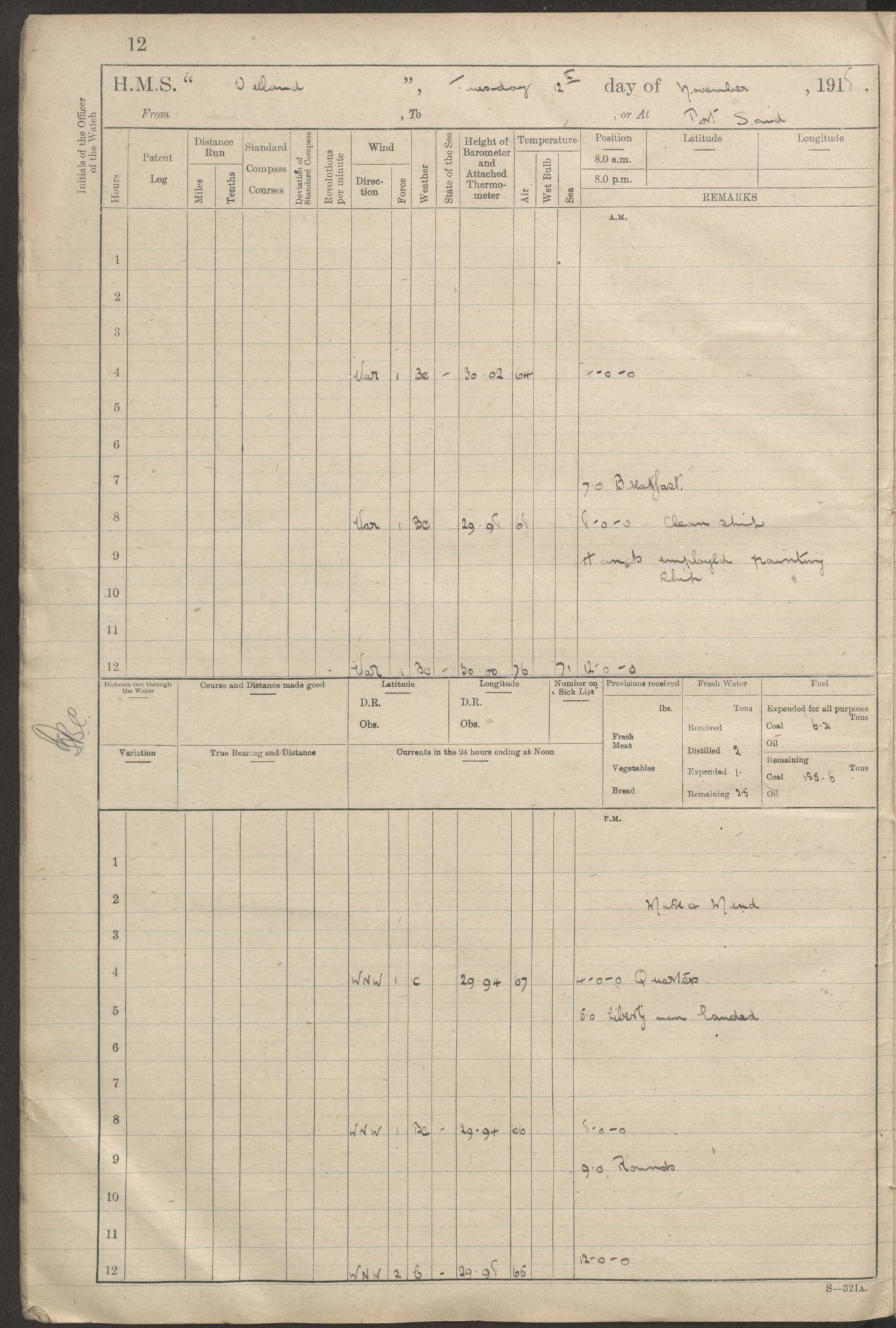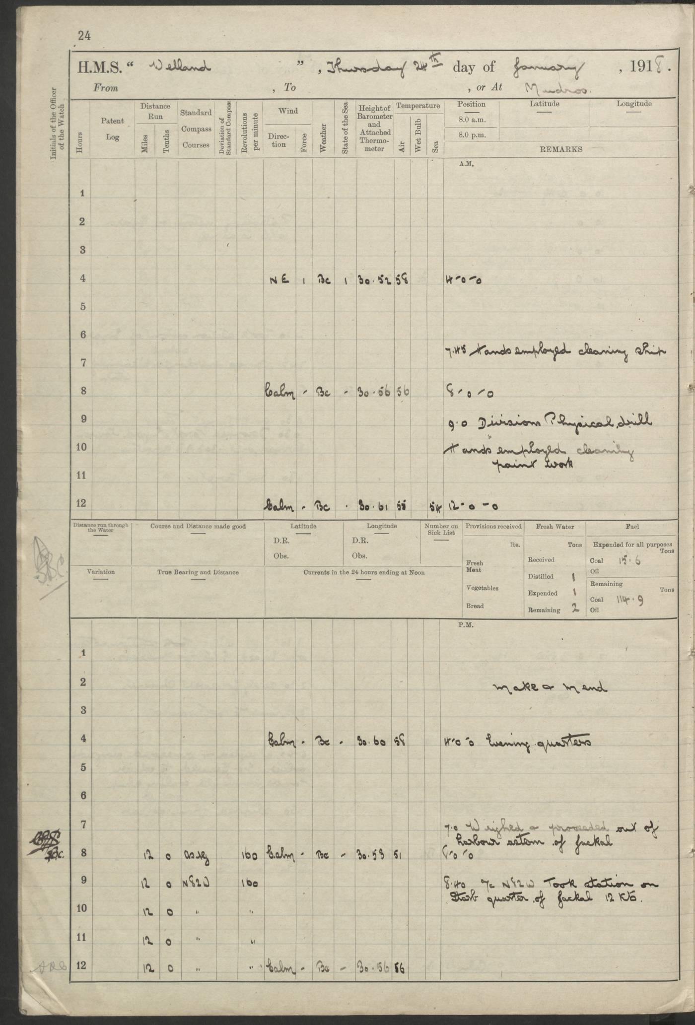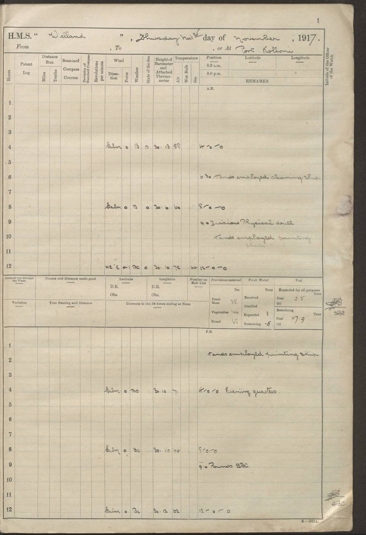 Altered course N 60º W. 3.35pm: Reduced to 10 knots. 4.05pm: As requisite for approaching Singapore. 4.45pm: Arrived at anchor inside Breakwater. 7.00pm: Gave Leave to Watch till 10.00pm. 9.00pm: Rounds. 4caf8cadcadfd34197037664: (http://oldweather.s3.amazonaws.com/ADM 53-68365/ADM 53-68365-029_0.jpg) 21 November 1914 Singapore Lat 1.26, Long 103.85 6.00am: Hands employed cleaning ship & boats. 8.45am: Hands employed cleaning ship. 1.00pm: Leave to Watch 1.30pm till 6.00am. 2.00pm: Hands Make & Mend clothes. 9.00pm: Rounds. 4caf8cadcadfd34197037665: (http://oldweather.s3.amazonaws.com/ADM 53-68365/ADM 53-68365-029_1.jpg) 22 November 1914 Singapore Lat 1.26, Long 103.85 5.45am: Hands employed cleaning ship. 9.00am: Weighed & proceeded to Keppel Harbour. 9.40am: Entered No. 1 dock. 11.00am: Hands employed docking ship. 1.00pm: Leave to Watch 1.30pm till 6.00am. 2.00pm: Hands Make & Mend clothes. 5.30pm: Exercise Fire Stations. 9.00pm: Rounds. 10.00pm: Hands piped down. 4caf8cadcadfd34197037666: (http://oldweather.s3.amazonaws.com/ADM 53-68365/ADM 53-68365-030_0.jpg) 23 November 1914 Singapore Lat 1.26, Long 103.85 6.00am: Hands employed cleaning ship. 8.00am: 1 Rating discharged to COLNE (sick). 8.25am: Hands refitting guard rails. 10.00am: CHELMER arrived & docked. 1.00pm: Leave to Watch 5.30pm till 6.30am. 1.30pm: Hands employed as in forenoon 5.15pm: Paid Monthly money. 9.00pm: Rounds. 4caf8cadcadfd34197037667: (http://oldweather.s3.amazonaws.com/ADM 53-68365/ADM 53-68365-030_1.jpg) 24 November 1914 Singapore Lat 1.26, Long 103.85 7.00am: Hands employed dismounting & cleaning guns. 8.30am: Hands employed refitting guard rails. 1.00pm: Special Leave to Watch 5.30pm till 7.00am. 2.00pm: Hands employed as in forenoon 9.00pm: Rounds 4caf8cadcadfd34197037668: (http://oldweather.s3.amazonaws.com/ADM 53-68365/ADM 53-68365-031_0.jpg) 25 November 1914 Singapore Lat 1.26, Long 103.85 7.00am: Hands employed cleaning guns. 8.30am: Hands employed refitting whaler's falls & stripping down guns. 1.30pm: Hands employed reassembling & cleaning guns. 2.00pm: Leave to Watch 5.30pm till 7.00am. 9.00pm: Rounds. 4caf8cadcadfd34197037669: (http://oldweather.s3.amazonaws.com/ADM 53-68365/ADM 53-68365-031_1.jpg) 26 November 1914 Singapore Lat 1.26, Long 103.85 7.00am: Hands employed cleaning guns. 8.30am: Hands employed refitting guard rails. 1.30pm: Hands employed painting Forecastle awning & remounting Starboard 12 pounder. 3.00pm: Special Leave to Watch 5.30pm till 7.00am. 9.00pm: Rounds. 4caf8cadcadfd3419703766a: (http://oldweather.s3.amazonaws.com/ADM 53-68365/ADM 53-68365-032_0.jpg) 27 November 1914 Singapore Lat 1.26, Long 103.85 7.00am: Hands employed cleaning guns. 8.15am: Hands employed painting ship. 1.00pm: Flooded dock. 1.30pm: Hands employed drawing stores & as requisite. 4.20pm: Undocked ship. 5.00pm: Went alongside coaling wharf. 5.10pm: Commenced coaling. 7.00pm: Finished coaling. Received 70 tons. 9.00pm: Rounds. 4caf8cadcadfd3419703766b: (http://oldweather.s3.amazonaws.com/ADM 53-68365/ADM 53-68365-032_1.jpg) 28 November 1914 Singapore Lat 1.26, Long 103.85 7.30am: Hands employed shifting ship. 8.00am: Ship secured alongside CHELMER in Basin. 1.00pm: Leave to Watch 1.30pm till 7.00am. 1.45pm: Hands employed striking down provisions. 9.00pm: Rounds. 4caf8cadcadfd3419703766c: (http://oldweather.s3.amazonaws.com/ADM 53-68365/ADM 53-68365-033_0.jpg) 29 November 1914 Singapore Lat 1.26, Long 103.85 6.50am: KENNET arrived. 7.30am: Hands cleaning guns. 10.00am: Divisions. 10.30am: Read Prayers. 1.00pm: Leave to Watch 1.30pm till 11.00pm. 2.00pm: Hands piped down. 9.00pm: Rounds. 4caf8cadcadfd3419703766d: (http://oldweather.s3.amazonaws.com/ADM 53-68365/ADM 53-68365-033_1.jpg) 30 November 1914 Singapore to Penang Lat 1.5, Long 103.0 7.15am: Slipped & proceeded. 8.00am: Course & speed as requisite for leaving Singapore. 8 knots. 8.30am: Formed Divisions – Line Ahead. 9.00am: Hands shipping & cleaning gun sights, & telescopes. 1.30pm: Hands fitting new awnings. 2.00pm: Hands piped down. 3.15pm: Pulo Undan Light N 15º W. 3.50pm: Pulo Undan Light abeam. 5.00pm: Altered course N 54º W. 11.30pm: Altered course N 25º W. 4caf8cadcadfd3419703766e: (http://oldweather.s3.amazonaws.com/ADM 53-68365/ADM 53-68365-034_0.jpg) 4caf8cadcadfd3419703766f: (http://oldweather.s3.amazonaws.com/ADM 53-68365/ADM 53-68365-034_1.jpg) Log Pages – Blank 4caf8cadcadfd34197037670: (http://oldweather.s3.amazonaws.com/ADM 53-68365/ADM 53-68365-035_0.jpg) 4caf8cadcadfd34197037671: (http://oldweather.s3.amazonaws.com/ADM 53-68365/ADM 53-68365-035_1.jpg) Cover LOGS FOR DECEMBER 1914 4caf8cadcadfd34197037672: (http://oldweather.s3.amazonaws.com/ADM 53-68366/ADM 53-68366-001_0.jpg) 4caf8cadcadfd34197037673: (http://oldweather.s3.amazonaws.com/ADM 53-68366/ADM 53-68366-001_1.jpg) Cover 4caf8cadcadfd34197037674: (http://oldweather.s3.amazonaws.com/ADM 53-68366/ADM 53-68366-002_0.jpg) Log Page – Certification – true copy – 1 December 1914 to 31January 1915 4caf8cadcadfd34197037675: (http://oldweather.s3.amazonaws.com/ADM 53-68366/ADM 53-68366-002_1.jpg) Log Page – Distance run – Fuel consumption 4caf8cadcadfd34197037676: (http://oldweather.s3.amazonaws.com/ADM 53-68366/ADM 53-68366-003_0.jpg) Log Page – Instruments – Blank 4caf8cadcadfd34197037677: (http://oldweather.s3.amazonaws.com/ADM 53-68366/ADM 53-68366-003_1.jpg) 1 December 1914 Singapore to Penang and at Penang Lat 5.315845, Long 100.355342 5.30am: Special Lookouts secured. Returned ammunition. 8.00am: Altered course North. 8.45am: Hands employed fitting new awnings & bath screens. 10.10am: Altered course N 10º E. 10.25am: Altered course NE. 11.00am: Course & speed as requisite for harbour. 12.10pm: Came to with starboard anchor veered 4 shackles. 1.40pm: Commenced coaling. 5.00pm: Finished coaling. Received 58 tons. 7.05pm: Weighed & proceeded. 7.45pm: Increased to 11 knots. 8.30pm: Palo Penang Light 2 miles abeam to Port. Set course N 80º W. 4caf8cadcadfd34