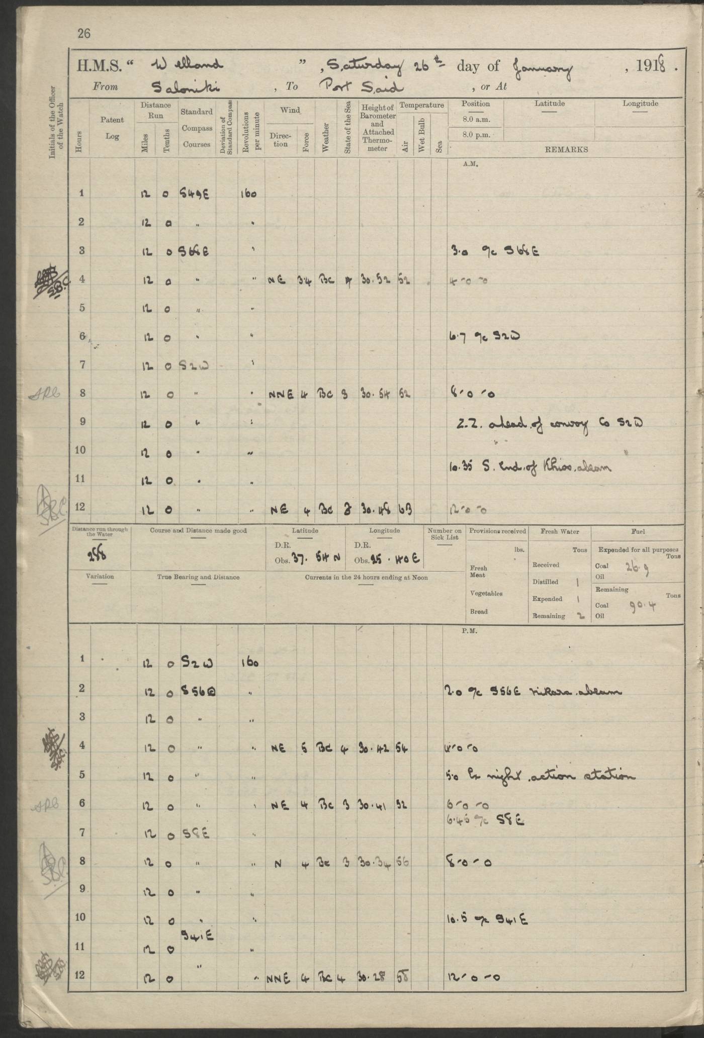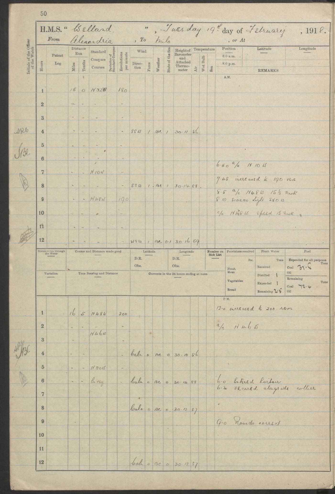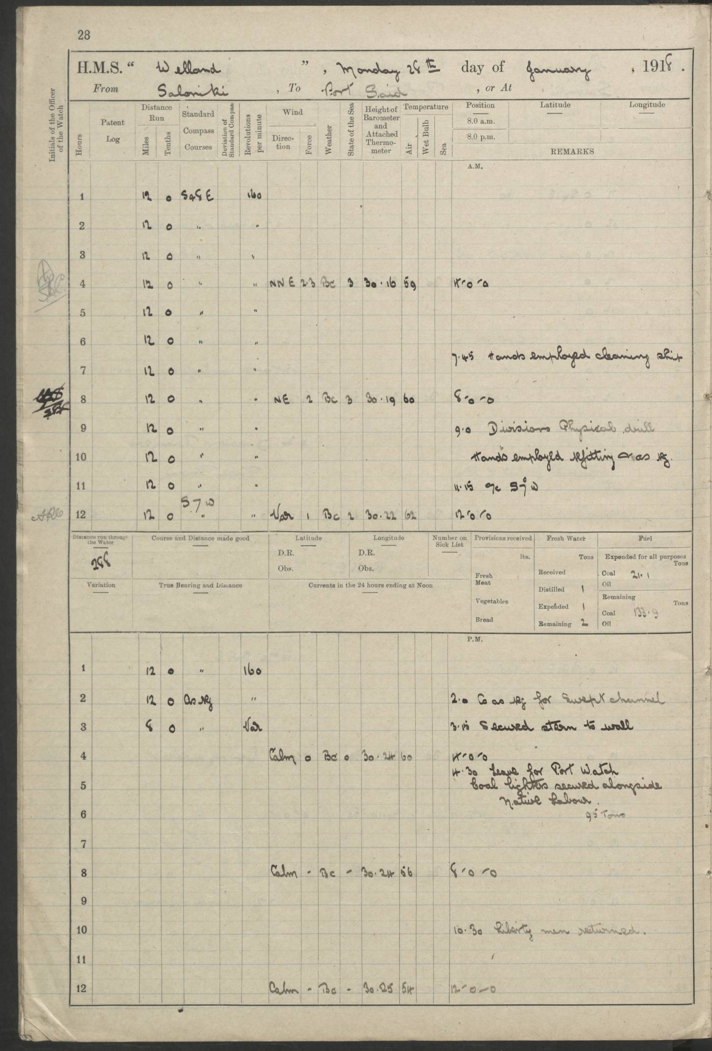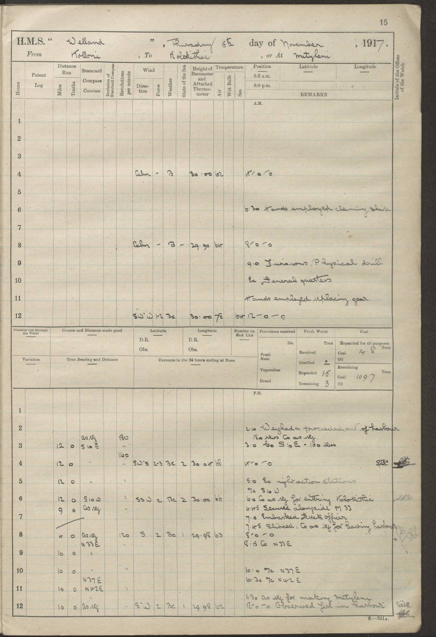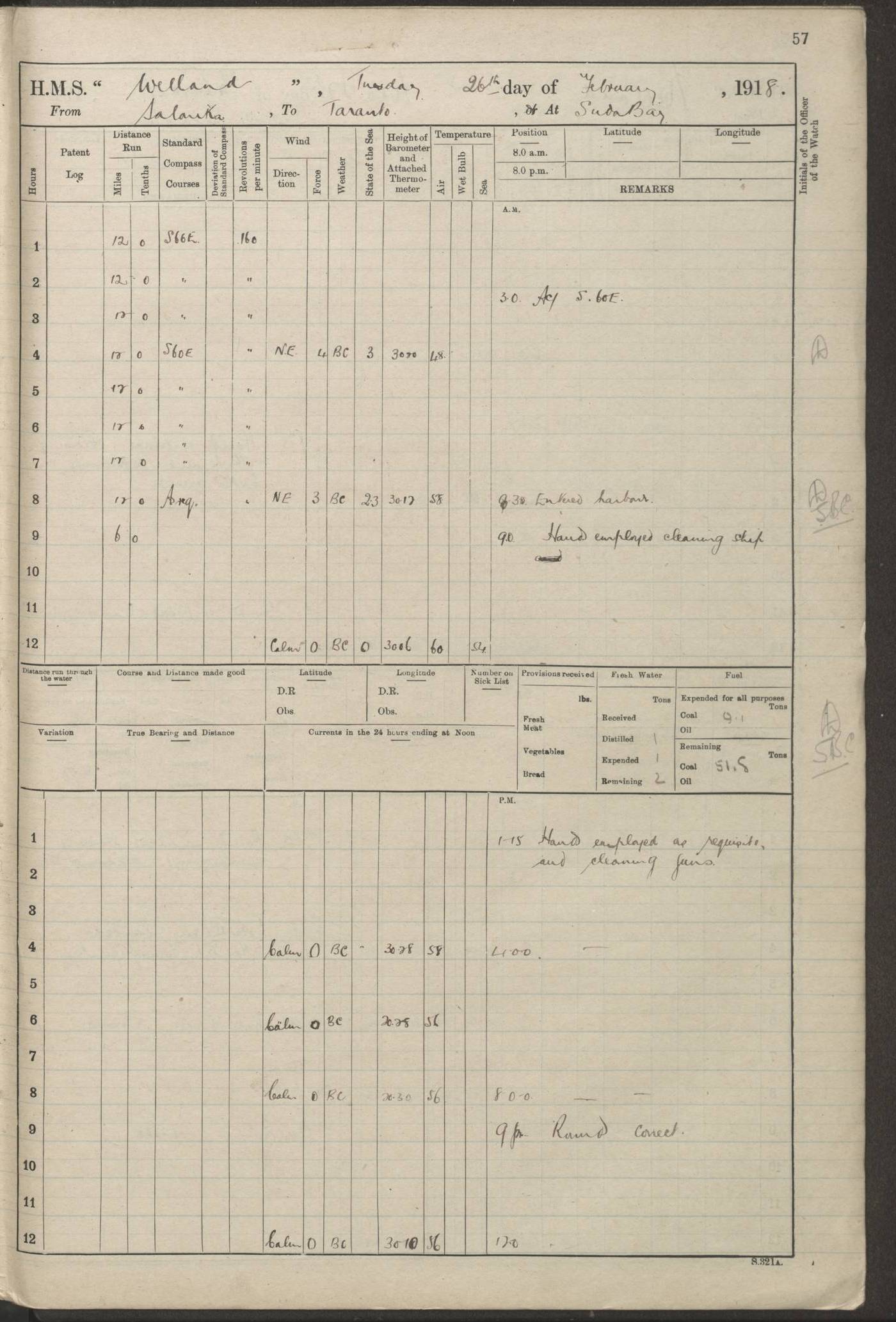 LOGS FOR JANUARY 1918 [Port Kalloni, Rhodes, Port Kalloni, Mudros, Salonika and Port Said] 4caf8ca1cadfd341970372d8: (http://oldweather.s3.amazonaws.com/ADM 53-68386/ADM 53-68386-001_0.jpg) 4caf8ca1cadfd341970372d9: (http://oldweather.s3.amazonaws.com/ADM 53-68386/ADM 53-68386-001_1.jpg) Blue front cover of Logbook for January/February 1918. 4caf8ca1cadfd341970372da: (http://oldweather.s3.amazonaws.com/ADM 53-68386/ADM 53-68386-002_0.jpg) “This is to certify that this is a true copy of the original log of HMS Welland from 1st January 1918 to 28th February 1918, signed FE Ayers, Commanding Officer.” 4caf8ca1cadfd341970372db: (http://oldweather.s3.amazonaws.com/ADM 53-68386/ADM 53-68386-002_1.jpg) Blank except for signature of Eng. Cdr (D) ER Kestell 28th March 1918. 4caf8ca1cadfd341970372dc: (http://oldweather.s3.amazonaws.com/ADM 53-68386/ADM 53-68386-003_0.jpg) Blank. 4caf8ca1cadfd341970372dd: (http://oldweather.s3.amazonaws.com/ADM 53-68386/ADM 53-68386-003_1.jpg) 1 January 1918 Port Kalloni Lat 39.12, Long 26.13 7.45am: Clean ship. 9.00am: Divisions. Physical drill. 9.30am: Hands employed about boats. 1.30pm: Make and mend. 4.00pm: Evening quarters, 9.00pm: Rounds. Weather: Northerly winds, f 3 at times, early rain, clear later, temperatures in the 40ºs F. 4caf8ca1cadfd341970372de: (http://oldweather.s3.amazonaws.com/ADM 53-68386/ADM 53-68386-004_0.jpg) 2 January 1918 Port Kalloni to Rhodes Lat 37.0, Long 26.47 [approx] 1.00am: Weighed and proceeded. 3.50pm: Psara Lt sighted. 5.05am: Same abeam, a/c S. 9.15am: C Papas abeam, a/c S42E. Noon: Levitha abeam. 6.30pm: Anchored off Elmo’s tower, Rhodes [Rodos]. 4caf8ca1cadfd341970372df: (http://oldweather.s3.amazonaws.com/ADM 53-68386/ADM 53-68386-004_1.jpg) 3 January 1918 Rhodes Lat 36.45, Long 28.23 8.00am: Weighed and proceeded into Rodos harbour, moored to buoy, port anchor down. 4caf8ca1cadfd341970372e0: (http://oldweather.s3.amazonaws.com/ADM 53-68386/ADM 53-68386-005_0.jpg) 4 January 1918 Rhodes and at sea Lat 36.45, Long 28.23 6.00pm: Weighed and proceeded to sea, course N84W. 10.45pm: Kandeliusa abeam, a/c N35E. 4caf8ca1cadfd341970372e1: (http://oldweather.s3.amazonaws.com/ADM 53-68386/ADM 53-68386-005_1.jpg) 5 January 1918 At sea to Port Kalloni Lat 38.9, Long 26.05 [approx] 5.40am: C Papas abeam, a/c N. 10.00am: N end of Khios abeam, a/c N25E. 1.30pm: Secured alongside collier in Port Kalloni. Received 105 tons. 7.10pm: Cast off to anchor. 4caf8ca1cadfd341970372e2: (http://oldweather.s3.amazonaws.com/ADM 53-68386/ADM 53-68386-006_0.jpg) 6 January 1918 Port Kalloni Lat 39.12, Long 26.13 Sunday routine. 4caf8ca1cadfd341970372e3: (http://oldweather.s3.amazonaws.com/ADM 53-68386/ADM 53-68386-006_1.jpg) 7 January 1918 Port Kalloni Lat 39.12, Long 26.13 Clean ship, make and mend. 4caf8ca1cadfd341970372e4: (http://oldweather.s3.amazonaws.com/ADM 53-68386/ADM 53-68386-007_0.jpg) 8 January 1918 Port Kalloni Lat 39.12, Long 26.13 Hands employed as requisite. 4caf8ca1cadfd341970372e5: (http://oldweather.s3.amazonaws.com/ADM 53-68386/ADM 53-68386-007_1.jpg) 9 January 1918 Port Kalloni Lat 39.12, Long 26.13 Hands employed in mess decks. Make and mend. 4caf8ca1cadfd341970372e6: (http://oldweather.s3.amazonaws.com/ADM 53-68386/ADM 53-68386-008_0.jpg) 10 January 1918 Port Kalloni Lat 39.12, Long 26.13 Cleaning, refitting. 4caf8ca1cadfd341970372e7: (http://oldweather.s3.amazonaws.com/ADM 53-68386/ADM 53-68386-008_1.jpg) 11 January 1918 Port Kalloni Lat 39.0, Long 26.1 [approx] 11.00am: Weighed and proceeded, took harbour launch in tow. 1.00pm: Slipped launch and returned to harbour. 2.00pm: Anchored. 4caf8ca1cadfd341970372e8: (http://oldweather.s3.amazonaws.com/ADM 53-68386/ADM 53-68386-009_0.jpg) 12 January 1918 Port Kalloni Lat 39.12, Long 26.13 Saturday in harbour. Clean ship. Pipe down at noon. 4caf8ca1cadfd341970372e9: (http://oldweather.s3.amazonaws.com/ADM 53-68386/ADM 53-68386-009_1.jpg) 13 January 1918 Port Kalloni Lat 39.12, Long 26.13 Sunday routine. 4caf8ca1cadfd341970372ea: (http://oldweather.s3.amazonaws.com/ADM 53-68386/ADM 53-68386-010_0.jpg) 14 January 1918 Port Kalloni Lat 39.12, Long 26.13 9.00am: Working party away to relay buoys in channel. 4caf8ca1cadfd341970372eb: (http://oldweather.s3.amazonaws.com/ADM 53-68386/ADM 53-68386-010_1.jpg) 15 January 1918 Port Kalloni Lat 39.12, Long 26.13 Clean ship. Make and mend. 4caf8ca1cadfd341970372ec: (http://oldweather.s3.amazonaws.com/ADM 53-68386/ADM 53-68386-011_0.jpg) 16 January 1918 Port Kalloni Lat 39.12, Long 26.13 3.30pm: Weighed and towed to another billet. 3.45pm: HMS Forward took over SOE [possibly Senior Officer Eastern Med.]. 4caf8ca1cadfd341970372ed: (http://oldweather.s3.amazonaws.com/ADM 53-68386/ADM 53-68386-011_1.jpg) 17 January 1918 Port Kalloni Lat 39.12, Long 26.13 7.30pm: Weighed and proceeded up harbour, secured to collier, received 42 tons and cast off to anchor. Clean ship. 4caf8ca1cadfd341970372ee: (http://oldweather.s3.amazonaws.com/ADM 53-68386/ADM 53-68386-012_0.jpg) 18 January 1918 Port Kalloni Lat 39.12, Long 26.13 Hands employed as requisite. 4caf8ca1cadfd341970372ef: (http://oldweather.s3.amazonaws.com/ADM 53-68386/ADM 53-68386-012_1.jpg) 19 January 1918 Port Kalloni Lat 39.12, Long 26.13 Cleaning, refitting etc. 4caf8ca2cadfd341970372f0: (http://oldweather.s3.amazonaws.com/ADM 53-68386/ADM 53-68386-013_0.jpg) 20 January 1918 Mytilene patrol Lat 38.9, Long 26.6 [approx] 6.45am: Weighed and proceeded. 8.00am: Course SE. 10.15am: Stopped Greek steamer and ordered her into Mytilene harbour. Proceeded SE by E to patrol Mytilene channel. 3.45pm: A/c S40W. 6.30pm: Anchored, Kolokithia [Chios]. 11.00pm: Weighed and proceeded, course N26W. 4caf8ca2cadfd341970372f1: (http://oldweather.s3.amazonaws.com/ADM 53-68386/ADM 53-68386-013_1.jpg) 21 January 1918 At sea to Mudros and on patrol Lat 39.88, Long 25.25 2.37am: Sigri Lt abeam, 5 miles. 8.15am: Secured to collier, Port Mudros. 10.00am: Received 40 tons, cast off to anchor. 2.45pm: Weighed and proceeded. 3