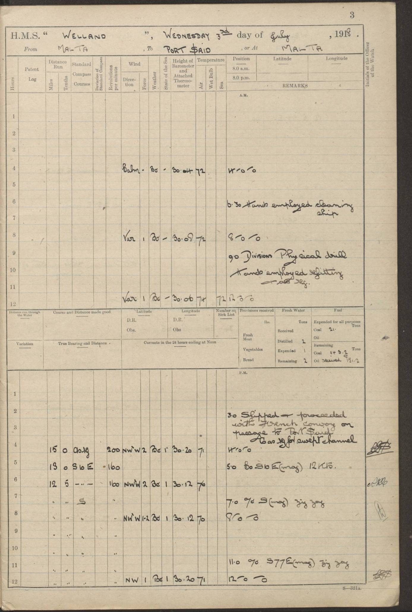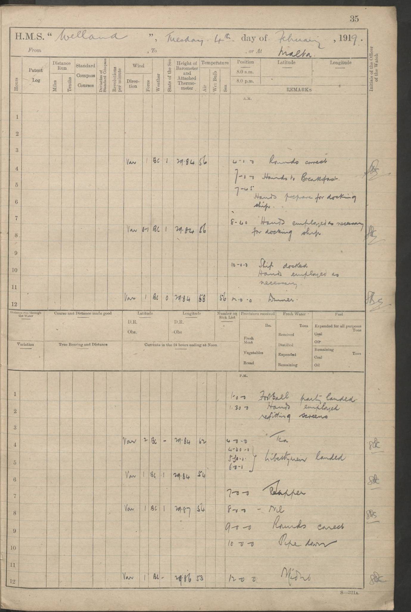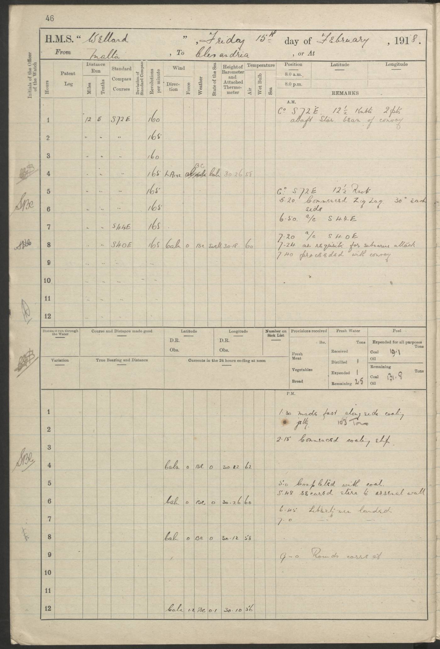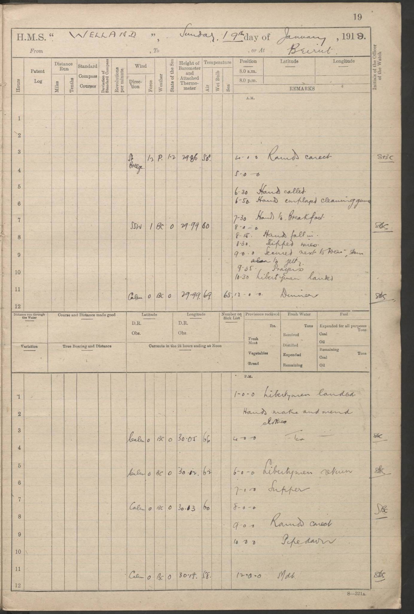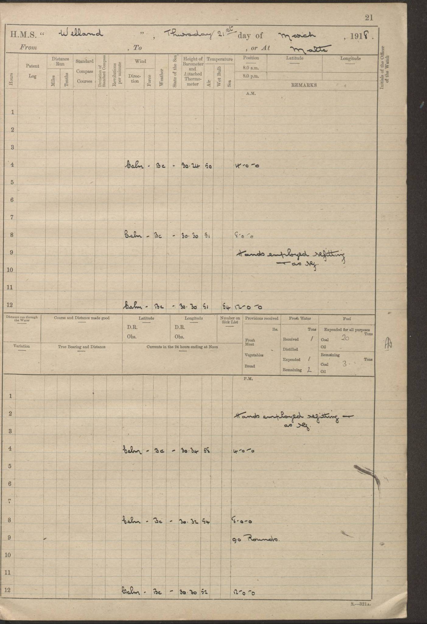 LOGS FOR JANUARY 1918 [Port Kalloni, Rhodes, Port Kalloni, Mudros, Salonika and Port Said] 4caf8ca1cadfd341970372d8: (http://oldweather.s3.amazonaws.com/ADM 53-68386/ADM 53-68386-001_0.jpg) 4caf8ca1cadfd341970372d9: (http://oldweather.s3.amazonaws.com/ADM 53-68386/ADM 53-68386-001_1.jpg) Blue front cover of Logbook for January/February 1918. 4caf8ca1cadfd341970372da: (http://oldweather.s3.amazonaws.com/ADM 53-68386/ADM 53-68386-002_0.jpg) “This is to certify that this is a true copy of the original log of HMS Welland from 1st January 1918 to 28th February 1918, signed FE Ayers, Commanding Officer.” 4caf8ca1cadfd341970372db: (http://oldweather.s3.amazonaws.com/ADM 53-68386/ADM 53-68386-002_1.jpg) Blank except for signature of Eng. Cdr (D) ER Kestell 28th March 1918. 4caf8ca1cadfd341970372dc: (http://oldweather.s3.amazonaws.com/ADM 53-68386/ADM 53-68386-003_0.jpg) Blank. 4caf8ca1cadfd341970372dd: (http://oldweather.s3.amazonaws.com/ADM 53-68386/ADM 53-68386-003_1.jpg) 1 January 1918 Port Kalloni Lat 39.12, Long 26.13 7.45am: Clean ship. 9.00am: Divisions. Physical drill. 9.30am: Hands employed about boats. 1.30pm: Make and mend. 4.00pm: Evening quarters, 9.00pm: Rounds. Weather: Northerly winds, f 3 at times, early rain, clear later, temperatures in the 40ºs F. 4caf8ca1cadfd341970372de: (http://oldweather.s3.amazonaws.com/ADM 53-68386/ADM 53-68386-004_0.jpg) 2 January 1918 Port Kalloni to Rhodes Lat 37.0, Long 26.47 [approx] 1.00am: Weighed and proceeded. 3.50pm: Psara Lt sighted. 5.05am: Same abeam, a/c S. 9.15am: C Papas abeam, a/c S42E. Noon: Levitha abeam. 6.30pm: Anchored off Elmo’s tower, Rhodes [Rodos]. 4caf8ca1cadfd341970372df: (http://oldweather.s3.amazonaws.com/ADM 53-68386/ADM 53-68386-004_1.jpg) 3 January 1918 Rhodes Lat 36.45, Long 28.23 8.00am: Weighed and proceeded into Rodos harbour, moored to buoy, port anchor down. 4caf8ca1cadfd341970372e0: (http://oldweather.s3.amazonaws.com/ADM 53-68386/ADM 53-68386-005_0.jpg) 4 January 1918 Rhodes and at sea Lat 36.45, Long 28.23 6.00pm: Weighed and proceeded to sea, course N84W. 10.45pm: Kandeliusa abeam, a/c N35E. 4caf8ca1cadfd341970372e1: (http://oldweather.s3.amazonaws.com/ADM 53-68386/ADM 53-68386-005_1.jpg) 5 January 1918 At sea to Port Kalloni Lat 38.9, Long 26.05 [approx] 5.40am: C Papas abeam, a/c N. 10.00am: N end of Khios abeam, a/c N25E. 1.30pm: Secured alongside collier in Port Kalloni. Received 105 tons. 7.10pm: Cast off to anchor. 4caf8ca1cadfd341970372e2: (http://oldweather.s3.amazonaws.com/ADM 53-68386/ADM 53-68386-006_0.jpg) 6 January 1918 Port Kalloni Lat 39.12, Long 26.13 Sunday routine. 4caf8ca1cadfd341970372e3: (http://oldweather.s3.amazonaws.com/ADM 53-68386/ADM 53-68386-006_1.jpg) 7 January 1918 Port Kalloni Lat 39.12, Long 26.13 Clean ship, make and mend. 4caf8ca1cadfd341970372e4: (http://oldweather.s3.amazonaws.com/ADM 53-68386/ADM 53-68386-007_0.jpg) 8 January 1918 Port Kalloni Lat 39.12, Long 26.13 Hands employed as requisite. 4caf8ca1cadfd341970372e5: (http://oldweather.s3.amazonaws.com/ADM 53-68386/ADM 53-68386-007_1.jpg) 9 January 1918 Port Kalloni Lat 39.12, Long 26.13 Hands employed in mess decks. Make and mend. 4caf8ca1cadfd341970372e6: (http://oldweather.s3.amazonaws.com/ADM 53-68386/ADM 53-68386-008_0.jpg) 10 January 1918 Port Kalloni Lat 39.12, Long 26.13 Cleaning, refitting. 4caf8ca1cadfd341970372e7: (http://oldweather.s3.amazonaws.com/ADM 53-68386/ADM 53-68386-008_1.jpg) 11 January 1918 Port Kalloni Lat 39.0, Long 26.1 [approx] 11.00am: Weighed and proceeded, took harbour launch in tow. 1.00pm: Slipped launch and returned to harbour. 2.00pm: Anchored. 4caf8ca1cadfd341970372e8: (http://oldweather.s3.amazonaws.com/ADM 53-68386/ADM 53-68386-009_0.jpg) 12 January 1918 Port Kalloni Lat 39.12, Long 26.13 Saturday in harbour. Clean ship. Pipe down at noon. 4caf8ca1cadfd341970372e9: (http://oldweather.s3.amazonaws.com/ADM 53-68386/ADM 53-68386-009_1.jpg) 13 January 1918 Port Kalloni Lat 39.12, Long 26.13 Sunday routine. 4caf8ca1cadfd341970372ea: (http://oldweather.s3.amazonaws.com/ADM 53-68386/ADM 53-68386-010_0.jpg) 14 January 1918 Port Kalloni Lat 39.12, Long 26.13 9.00am: Working party away to relay buoys in channel. 4caf8ca1cadfd341970372eb: (http://oldweather.s3.amazonaws.com/ADM 53-68386/ADM 53-68386-010_1.jpg) 15 January 1918 Port Kalloni Lat 39.12, Long 26.13 Clean ship. Make and mend. 4caf8ca1cadfd341970372ec: (http://oldweather.s3.amazonaws.com/ADM 53-68386/ADM 53-68386-011_0.jpg) 16 January 1918 Port Kalloni Lat 39.12, Long 26.13 3.30pm: Weighed and towed to another billet. 3.45pm: HMS Forward took over SOE [possibly Senior Officer Eastern Med.]. 4caf8ca1cadfd341970372ed: (http://oldweather.s3.amazonaws.com/ADM 53-68386/ADM 53-68386-011_1.jpg) 17 January 1918 Port Kalloni Lat 39.12, Long 26.13 7.30pm: Weighed and proceeded up harbour, secured to collier, received 42 tons and cast off to anchor. Clean ship. 4caf8ca1cadfd341970372ee: (http://oldweather.s3.amazonaws.com/ADM 53-68386/ADM 53-68386-012_0.jpg) 18 January 1918 Port Kalloni Lat 39.12, Long 26.13 Hands employed as requisite. 4caf8ca1cadfd341970372ef: (http://oldweather.s3.amazonaws.com/ADM 53-68386/ADM 53-68386-012_1.jpg) 19 January 1918 Port Kalloni Lat 39.12, Long 26.13 Cleaning, refitting etc. 4caf8ca2cadfd341970372f0: (http://oldweather.s3.amazonaws.com/ADM 53-68386/ADM 53-68386-013_0.jpg) 20 January 1918 Mytilene patrol Lat 38.9, Long 26.6 [approx] 6.45am: Weighed and proceeded. 8.00am: Course SE. 10.15am: Stopped Greek steamer and ordered her into Mytilene harbour. Proceeded SE by E to patrol Mytilene channel. 3.45pm: A/c S40W. 6.30pm: Anchored, Kolokithia [Chios]. 11.00pm: Weighed and proceeded, course N26W. 4caf8ca2cadfd341970372f1: (http://oldweather.s3.amazonaws.com/ADM 53-68386/ADM 53-68386-013_1.jpg) 21 January 1918 At sea to Mudros and on patrol Lat 39.88, Long 25.25 2.37am: Sigri Lt abeam, 5 miles. 8.15am: Secured to collier, Port Mudros. 10.00am: Received 40 tons, cast off to anchor. 2.45pm: Weighed and proceeded. 3
