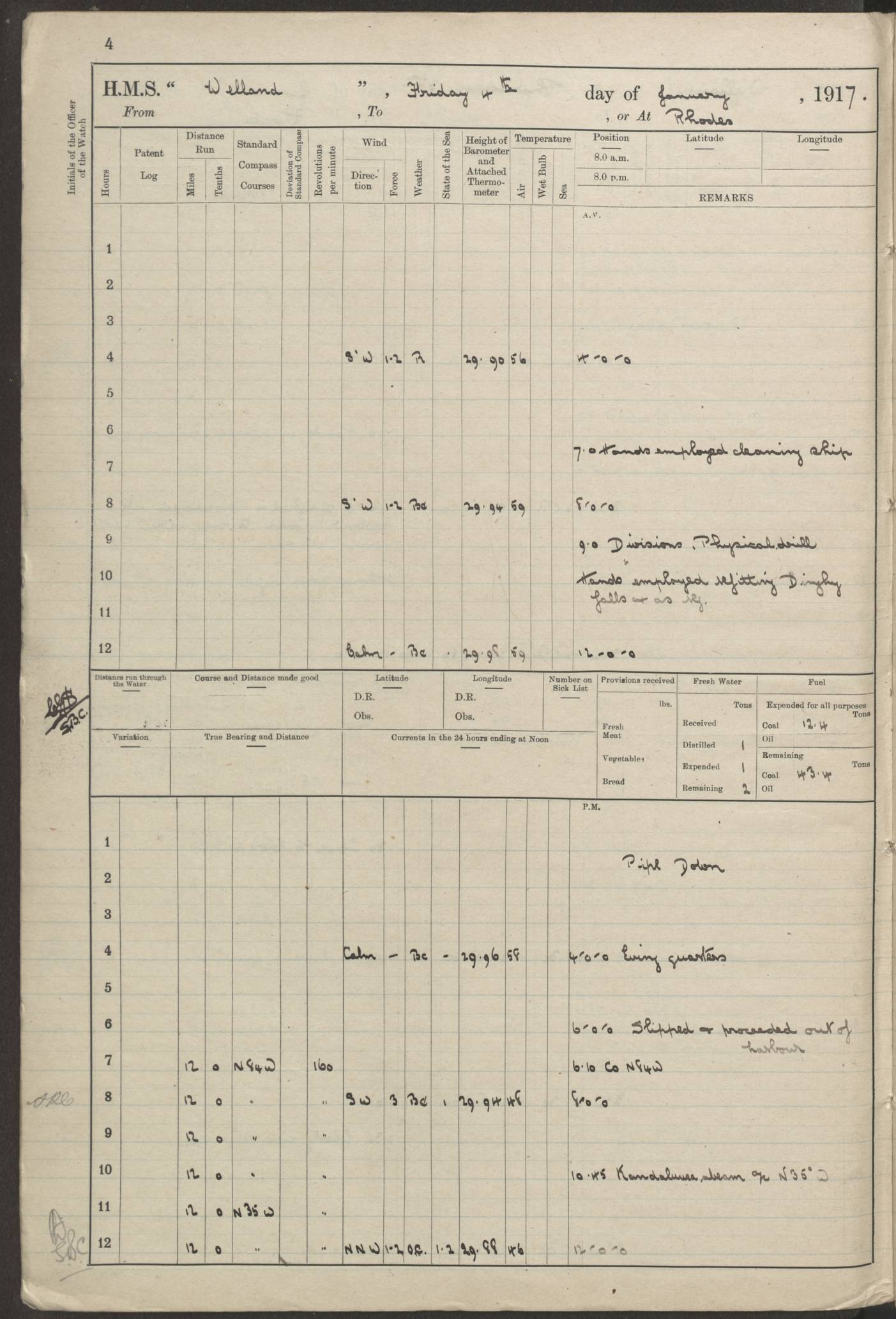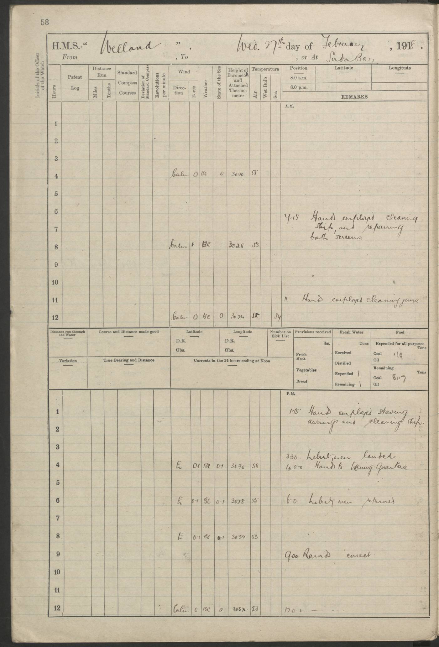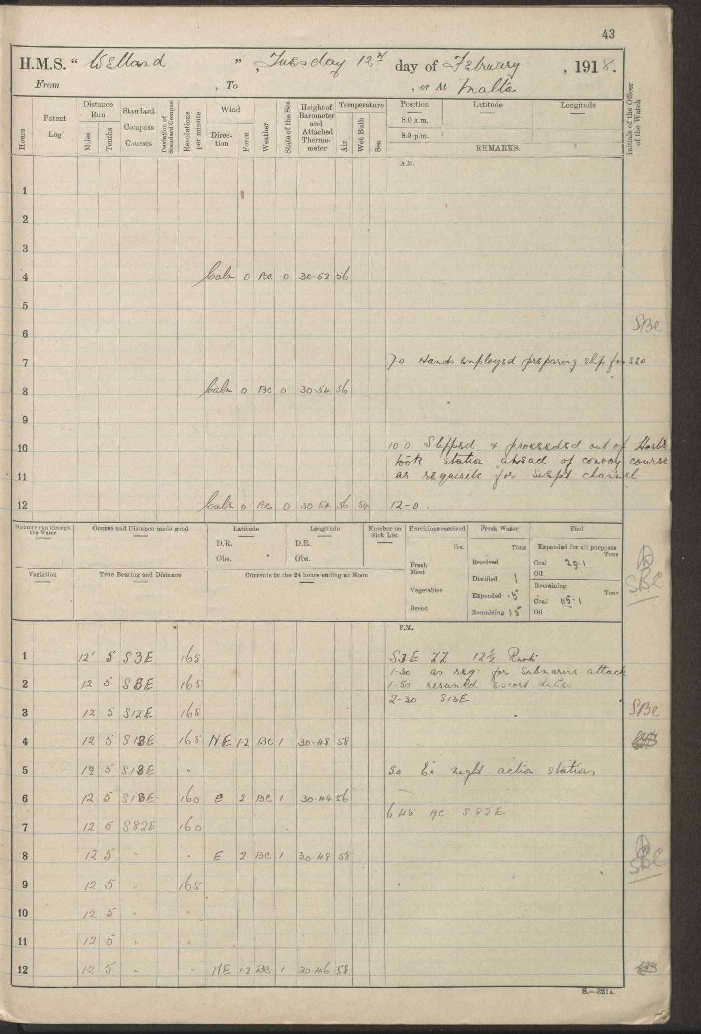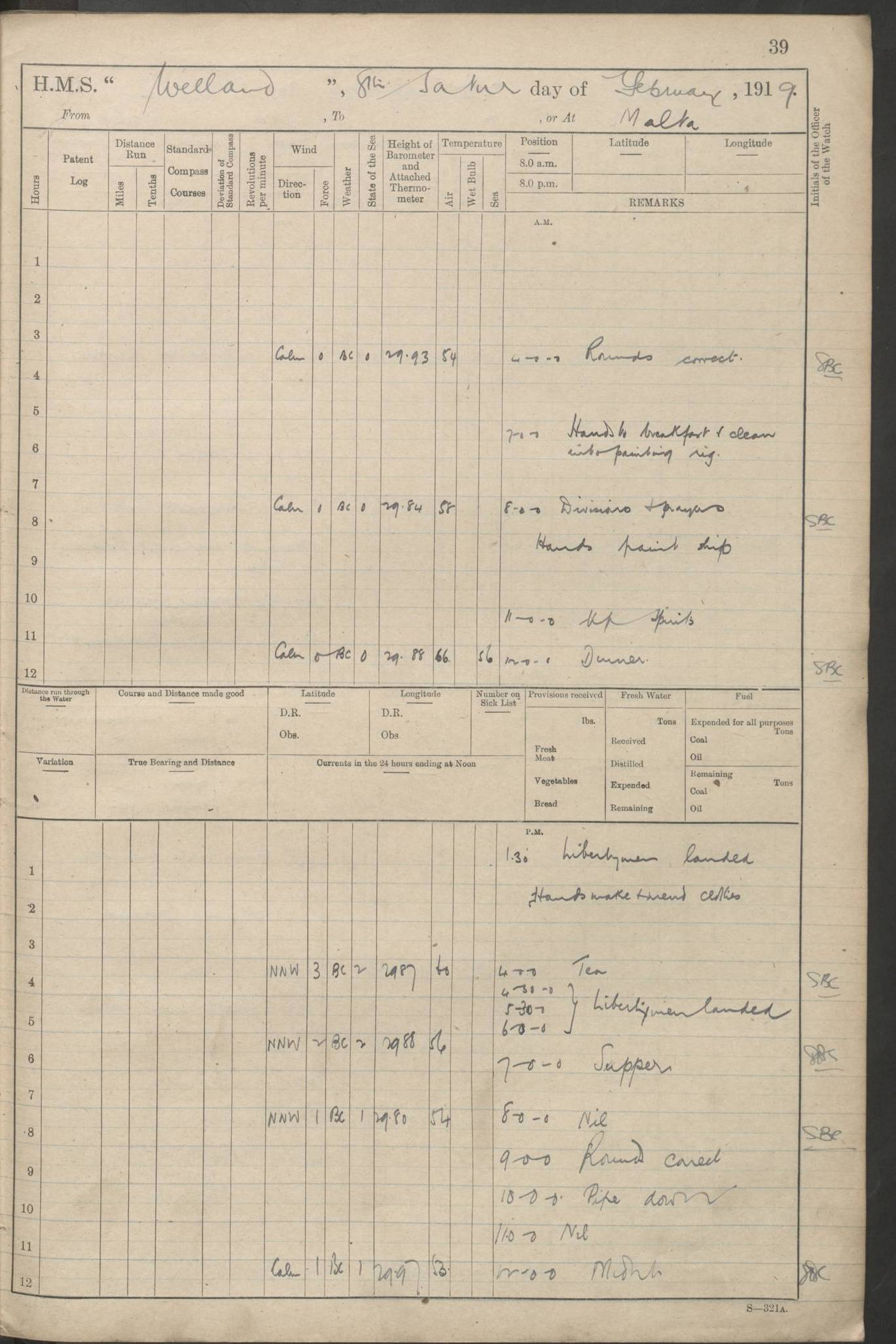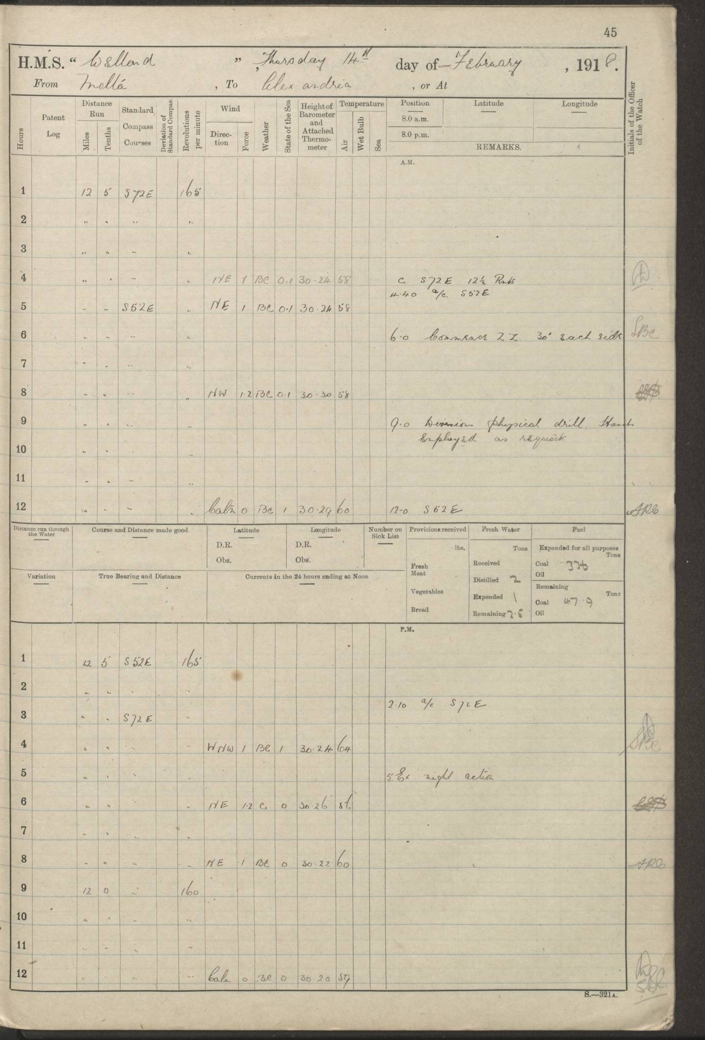 LOGS FOR JANUARY 1918 [Port Kalloni, Rhodes, Port Kalloni, Mudros, Salonika and Port Said] 4caf8ca1cadfd341970372d8: (http://oldweather.s3.amazonaws.com/ADM 53-68386/ADM 53-68386-001_0.jpg) 4caf8ca1cadfd341970372d9: (http://oldweather.s3.amazonaws.com/ADM 53-68386/ADM 53-68386-001_1.jpg) Blue front cover of Logbook for January/February 1918. 4caf8ca1cadfd341970372da: (http://oldweather.s3.amazonaws.com/ADM 53-68386/ADM 53-68386-002_0.jpg) “This is to certify that this is a true copy of the original log of HMS Welland from 1st January 1918 to 28th February 1918, signed FE Ayers, Commanding Officer.” 4caf8ca1cadfd341970372db: (http://oldweather.s3.amazonaws.com/ADM 53-68386/ADM 53-68386-002_1.jpg) Blank except for signature of Eng. Cdr (D) ER Kestell 28th March 1918. 4caf8ca1cadfd341970372dc: (http://oldweather.s3.amazonaws.com/ADM 53-68386/ADM 53-68386-003_0.jpg) Blank. 4caf8ca1cadfd341970372dd: (http://oldweather.s3.amazonaws.com/ADM 53-68386/ADM 53-68386-003_1.jpg) 1 January 1918 Port Kalloni Lat 39.12, Long 26.13 7.45am: Clean ship. 9.00am: Divisions. Physical drill. 9.30am: Hands employed about boats. 1.30pm: Make and mend. 4.00pm: Evening quarters, 9.00pm: Rounds. Weather: Northerly winds, f 3 at times, early rain, clear later, temperatures in the 40ºs F. 4caf8ca1cadfd341970372de: (http://oldweather.s3.amazonaws.com/ADM 53-68386/ADM 53-68386-004_0.jpg) 2 January 1918 Port Kalloni to Rhodes Lat 37.0, Long 26.47 [approx] 1.00am: Weighed and proceeded. 3.50pm: Psara Lt sighted. 5.05am: Same abeam, a/c S. 9.15am: C Papas abeam, a/c S42E. Noon: Levitha abeam. 6.30pm: Anchored off Elmo’s tower, Rhodes [Rodos]. 4caf8ca1cadfd341970372df: (http://oldweather.s3.amazonaws.com/ADM 53-68386/ADM 53-68386-004_1.jpg) 3 January 1918 Rhodes Lat 36.45, Long 28.23 8.00am: Weighed and proceeded into Rodos harbour, moored to buoy, port anchor down. 4caf8ca1cadfd341970372e0: (http://oldweather.s3.amazonaws.com/ADM 53-68386/ADM 53-68386-005_0.jpg) 4 January 1918 Rhodes and at sea Lat 36.45, Long 28.23 6.00pm: Weighed and proceeded to sea, course N84W. 10.45pm: Kandeliusa abeam, a/c N35E. 4caf8ca1cadfd341970372e1: (http://oldweather.s3.amazonaws.com/ADM 53-68386/ADM 53-68386-005_1.jpg) 5 January 1918 At sea to Port Kalloni Lat 38.9, Long 26.05 [approx] 5.40am: C Papas abeam, a/c N. 10.00am: N end of Khios abeam, a/c N25E. 1.30pm: Secured alongside collier in Port Kalloni. Received 105 tons. 7.10pm: Cast off to anchor. 4caf8ca1cadfd341970372e2: (http://oldweather.s3.amazonaws.com/ADM 53-68386/ADM 53-68386-006_0.jpg) 6 January 1918 Port Kalloni Lat 39.12, Long 26.13 Sunday routine. 4caf8ca1cadfd341970372e3: (http://oldweather.s3.amazonaws.com/ADM 53-68386/ADM 53-68386-006_1.jpg) 7 January 1918 Port Kalloni Lat 39.12, Long 26.13 Clean ship, make and mend. 4caf8ca1cadfd341970372e4: (http://oldweather.s3.amazonaws.com/ADM 53-68386/ADM 53-68386-007_0.jpg) 8 January 1918 Port Kalloni Lat 39.12, Long 26.13 Hands employed as requisite. 4caf8ca1cadfd341970372e5: (http://oldweather.s3.amazonaws.com/ADM 53-68386/ADM 53-68386-007_1.jpg) 9 January 1918 Port Kalloni Lat 39.12, Long 26.13 Hands employed in mess decks. Make and mend. 4caf8ca1cadfd341970372e6: (http://oldweather.s3.amazonaws.com/ADM 53-68386/ADM 53-68386-008_0.jpg) 10 January 1918 Port Kalloni Lat 39.12, Long 26.13 Cleaning, refitting. 4caf8ca1cadfd341970372e7: (http://oldweather.s3.amazonaws.com/ADM 53-68386/ADM 53-68386-008_1.jpg) 11 January 1918 Port Kalloni Lat 39.0, Long 26.1 [approx] 11.00am: Weighed and proceeded, took harbour launch in tow. 1.00pm: Slipped launch and returned to harbour. 2.00pm: Anchored. 4caf8ca1cadfd341970372e8: (http://oldweather.s3.amazonaws.com/ADM 53-68386/ADM 53-68386-009_0.jpg) 12 January 1918 Port Kalloni Lat 39.12, Long 26.13 Saturday in harbour. Clean ship. Pipe down at noon. 4caf8ca1cadfd341970372e9: (http://oldweather.s3.amazonaws.com/ADM 53-68386/ADM 53-68386-009_1.jpg) 13 January 1918 Port Kalloni Lat 39.12, Long 26.13 Sunday routine. 4caf8ca1cadfd341970372ea: (http://oldweather.s3.amazonaws.com/ADM 53-68386/ADM 53-68386-010_0.jpg) 14 January 1918 Port Kalloni Lat 39.12, Long 26.13 9.00am: Working party away to relay buoys in channel. 4caf8ca1cadfd341970372eb: (http://oldweather.s3.amazonaws.com/ADM 53-68386/ADM 53-68386-010_1.jpg) 15 January 1918 Port Kalloni Lat 39.12, Long 26.13 Clean ship. Make and mend. 4caf8ca1cadfd341970372ec: (http://oldweather.s3.amazonaws.com/ADM 53-68386/ADM 53-68386-011_0.jpg) 16 January 1918 Port Kalloni Lat 39.12, Long 26.13 3.30pm: Weighed and towed to another billet. 3.45pm: HMS Forward took over SOE [possibly Senior Officer Eastern Med.]. 4caf8ca1cadfd341970372ed: (http://oldweather.s3.amazonaws.com/ADM 53-68386/ADM 53-68386-011_1.jpg) 17 January 1918 Port Kalloni Lat 39.12, Long 26.13 7.30pm: Weighed and proceeded up harbour, secured to collier, received 42 tons and cast off to anchor. Clean ship. 4caf8ca1cadfd341970372ee: (http://oldweather.s3.amazonaws.com/ADM 53-68386/ADM 53-68386-012_0.jpg) 18 January 1918 Port Kalloni Lat 39.12, Long 26.13 Hands employed as requisite. 4caf8ca1cadfd341970372ef: (http://oldweather.s3.amazonaws.com/ADM 53-68386/ADM 53-68386-012_1.jpg) 19 January 1918 Port Kalloni Lat 39.12, Long 26.13 Cleaning, refitting etc. 4caf8ca2cadfd341970372f0: (http://oldweather.s3.amazonaws.com/ADM 53-68386/ADM 53-68386-013_0.jpg) 20 January 1918 Mytilene patrol Lat 38.9, Long 26.6 [approx] 6.45am: Weighed and proceeded. 8.00am: Course SE. 10.15am: Stopped Greek steamer and ordered her into Mytilene harbour. Proceeded SE by E to patrol Mytilene channel. 3.45pm: A/c S40W. 6.30pm: Anchored, Kolokithia [Chios]. 11.00pm: Weighed and proceeded, course N26W. 4caf8ca2cadfd341970372f1: (http://oldweather.s3.amazonaws.com/ADM 53-68386/ADM 53-68386-013_1.jpg) 21 January 1918 At sea to Mudros and on patrol Lat 39.88, Long 25.25 2.37am: Sigri Lt abeam, 5 miles. 8.15am: Secured to collier, Port Mudros. 10.00am: Received 40 tons, cast off to anchor. 2.45pm: Weighed and proceeded. 3