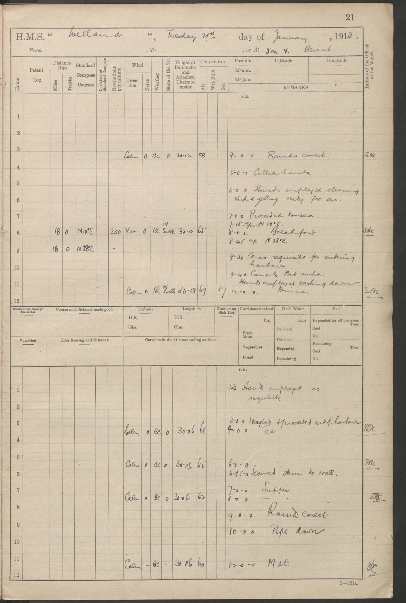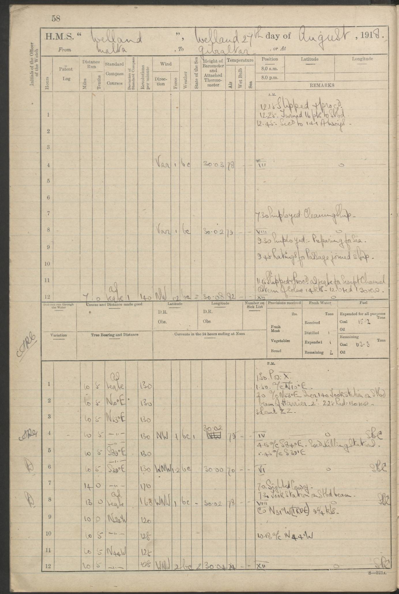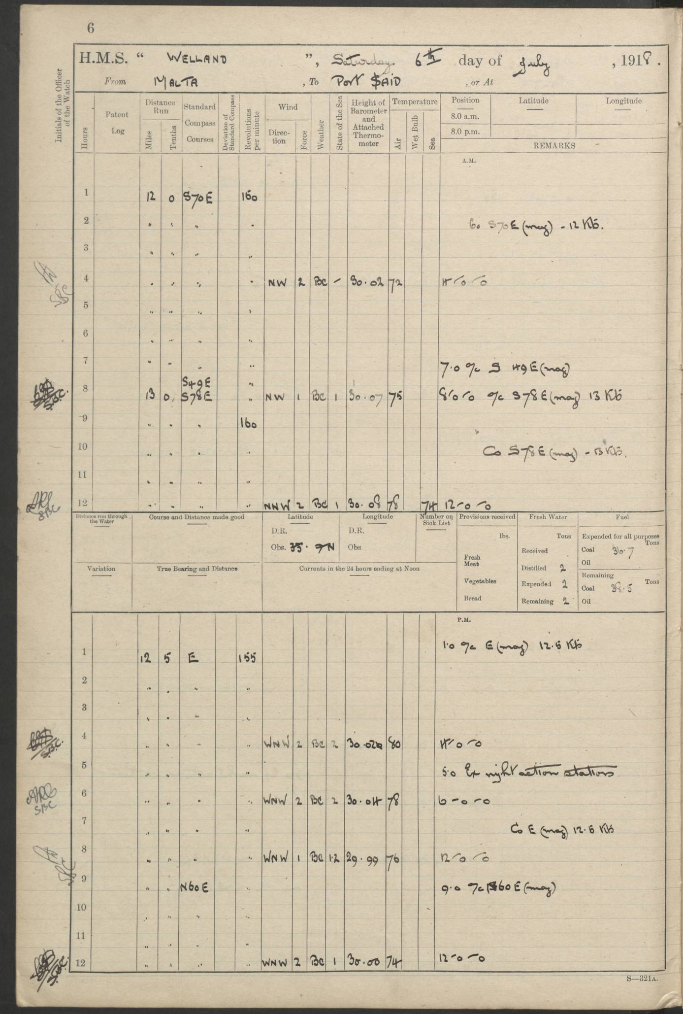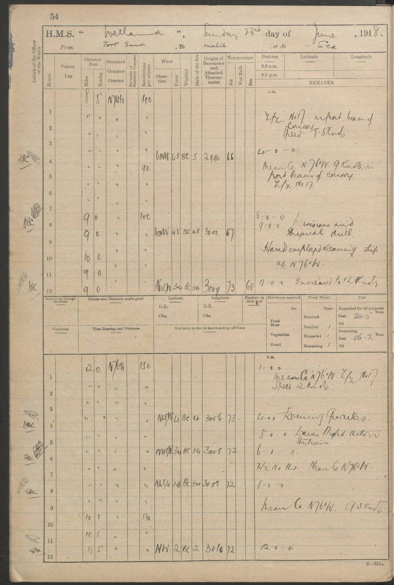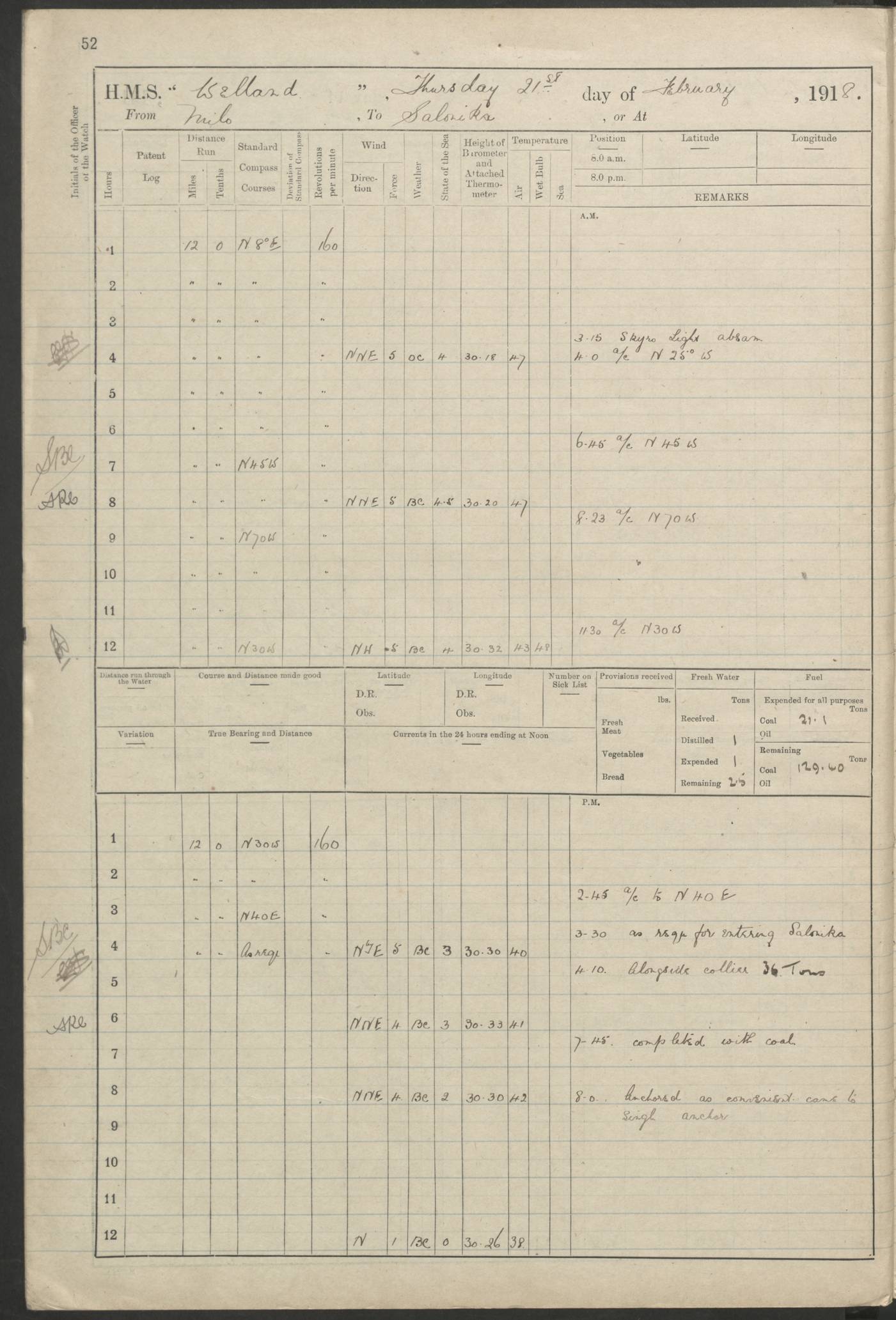 LOGS FOR JANUARY 1918 [Port Kalloni, Rhodes, Port Kalloni, Mudros, Salonika and Port Said] 4caf8ca1cadfd341970372d8: (http://oldweather.s3.amazonaws.com/ADM 53-68386/ADM 53-68386-001_0.jpg) 4caf8ca1cadfd341970372d9: (http://oldweather.s3.amazonaws.com/ADM 53-68386/ADM 53-68386-001_1.jpg) Blue front cover of Logbook for January/February 1918. 4caf8ca1cadfd341970372da: (http://oldweather.s3.amazonaws.com/ADM 53-68386/ADM 53-68386-002_0.jpg) “This is to certify that this is a true copy of the original log of HMS Welland from 1st January 1918 to 28th February 1918, signed FE Ayers, Commanding Officer.” 4caf8ca1cadfd341970372db: (http://oldweather.s3.amazonaws.com/ADM 53-68386/ADM 53-68386-002_1.jpg) Blank except for signature of Eng. Cdr (D) ER Kestell 28th March 1918. 4caf8ca1cadfd341970372dc: (http://oldweather.s3.amazonaws.com/ADM 53-68386/ADM 53-68386-003_0.jpg) Blank. 4caf8ca1cadfd341970372dd: (http://oldweather.s3.amazonaws.com/ADM 53-68386/ADM 53-68386-003_1.jpg) 1 January 1918 Port Kalloni Lat 39.12, Long 26.13 7.45am: Clean ship. 9.00am: Divisions. Physical drill. 9.30am: Hands employed about boats. 1.30pm: Make and mend. 4.00pm: Evening quarters, 9.00pm: Rounds. Weather: Northerly winds, f 3 at times, early rain, clear later, temperatures in the 40ºs F. 4caf8ca1cadfd341970372de: (http://oldweather.s3.amazonaws.com/ADM 53-68386/ADM 53-68386-004_0.jpg) 2 January 1918 Port Kalloni to Rhodes Lat 37.0, Long 26.47 [approx] 1.00am: Weighed and proceeded. 3.50pm: Psara Lt sighted. 5.05am: Same abeam, a/c S. 9.15am: C Papas abeam, a/c S42E. Noon: Levitha abeam. 6.30pm: Anchored off Elmo’s tower, Rhodes [Rodos]. 4caf8ca1cadfd341970372df: (http://oldweather.s3.amazonaws.com/ADM 53-68386/ADM 53-68386-004_1.jpg) 3 January 1918 Rhodes Lat 36.45, Long 28.23 8.00am: Weighed and proceeded into Rodos harbour, moored to buoy, port anchor down. 4caf8ca1cadfd341970372e0: (http://oldweather.s3.amazonaws.com/ADM 53-68386/ADM 53-68386-005_0.jpg) 4 January 1918 Rhodes and at sea Lat 36.45, Long 28.23 6.00pm: Weighed and proceeded to sea, course N84W. 10.45pm: Kandeliusa abeam, a/c N35E. 4caf8ca1cadfd341970372e1: (http://oldweather.s3.amazonaws.com/ADM 53-68386/ADM 53-68386-005_1.jpg) 5 January 1918 At sea to Port Kalloni Lat 38.9, Long 26.05 [approx] 5.40am: C Papas abeam, a/c N. 10.00am: N end of Khios abeam, a/c N25E. 1.30pm: Secured alongside collier in Port Kalloni. Received 105 tons. 7.10pm: Cast off to anchor. 4caf8ca1cadfd341970372e2: (http://oldweather.s3.amazonaws.com/ADM 53-68386/ADM 53-68386-006_0.jpg) 6 January 1918 Port Kalloni Lat 39.12, Long 26.13 Sunday routine. 4caf8ca1cadfd341970372e3: (http://oldweather.s3.amazonaws.com/ADM 53-68386/ADM 53-68386-006_1.jpg) 7 January 1918 Port Kalloni Lat 39.12, Long 26.13 Clean ship, make and mend. 4caf8ca1cadfd341970372e4: (http://oldweather.s3.amazonaws.com/ADM 53-68386/ADM 53-68386-007_0.jpg) 8 January 1918 Port Kalloni Lat 39.12, Long 26.13 Hands employed as requisite. 4caf8ca1cadfd341970372e5: (http://oldweather.s3.amazonaws.com/ADM 53-68386/ADM 53-68386-007_1.jpg) 9 January 1918 Port Kalloni Lat 39.12, Long 26.13 Hands employed in mess decks. Make and mend. 4caf8ca1cadfd341970372e6: (http://oldweather.s3.amazonaws.com/ADM 53-68386/ADM 53-68386-008_0.jpg) 10 January 1918 Port Kalloni Lat 39.12, Long 26.13 Cleaning, refitting. 4caf8ca1cadfd341970372e7: (http://oldweather.s3.amazonaws.com/ADM 53-68386/ADM 53-68386-008_1.jpg) 11 January 1918 Port Kalloni Lat 39.0, Long 26.1 [approx] 11.00am: Weighed and proceeded, took harbour launch in tow. 1.00pm: Slipped launch and returned to harbour. 2.00pm: Anchored. 4caf8ca1cadfd341970372e8: (http://oldweather.s3.amazonaws.com/ADM 53-68386/ADM 53-68386-009_0.jpg) 12 January 1918 Port Kalloni Lat 39.12, Long 26.13 Saturday in harbour. Clean ship. Pipe down at noon. 4caf8ca1cadfd341970372e9: (http://oldweather.s3.amazonaws.com/ADM 53-68386/ADM 53-68386-009_1.jpg) 13 January 1918 Port Kalloni Lat 39.12, Long 26.13 Sunday routine. 4caf8ca1cadfd341970372ea: (http://oldweather.s3.amazonaws.com/ADM 53-68386/ADM 53-68386-010_0.jpg) 14 January 1918 Port Kalloni Lat 39.12, Long 26.13 9.00am: Working party away to relay buoys in channel. 4caf8ca1cadfd341970372eb: (http://oldweather.s3.amazonaws.com/ADM 53-68386/ADM 53-68386-010_1.jpg) 15 January 1918 Port Kalloni Lat 39.12, Long 26.13 Clean ship. Make and mend. 4caf8ca1cadfd341970372ec: (http://oldweather.s3.amazonaws.com/ADM 53-68386/ADM 53-68386-011_0.jpg) 16 January 1918 Port Kalloni Lat 39.12, Long 26.13 3.30pm: Weighed and towed to another billet. 3.45pm: HMS Forward took over SOE [possibly Senior Officer Eastern Med.]. 4caf8ca1cadfd341970372ed: (http://oldweather.s3.amazonaws.com/ADM 53-68386/ADM 53-68386-011_1.jpg) 17 January 1918 Port Kalloni Lat 39.12, Long 26.13 7.30pm: Weighed and proceeded up harbour, secured to collier, received 42 tons and cast off to anchor. Clean ship. 4caf8ca1cadfd341970372ee: (http://oldweather.s3.amazonaws.com/ADM 53-68386/ADM 53-68386-012_0.jpg) 18 January 1918 Port Kalloni Lat 39.12, Long 26.13 Hands employed as requisite. 4caf8ca1cadfd341970372ef: (http://oldweather.s3.amazonaws.com/ADM 53-68386/ADM 53-68386-012_1.jpg) 19 January 1918 Port Kalloni Lat 39.12, Long 26.13 Cleaning, refitting etc. 4caf8ca2cadfd341970372f0: (http://oldweather.s3.amazonaws.com/ADM 53-68386/ADM 53-68386-013_0.jpg) 20 January 1918 Mytilene patrol Lat 38.9, Long 26.6 [approx] 6.45am: Weighed and proceeded. 8.00am: Course SE. 10.15am: Stopped Greek steamer and ordered her into Mytilene harbour. Proceeded SE by E to patrol Mytilene channel. 3.45pm: A/c S40W. 6.30pm: Anchored, Kolokithia [Chios]. 11.00pm: Weighed and proceeded, course N26W. 4caf8ca2cadfd341970372f1: (http://oldweather.s3.amazonaws.com/ADM 53-68386/ADM 53-68386-013_1.jpg) 21 January 1918 At sea to Mudros and on patrol Lat 39.88, Long 25.25 2.37am: Sigri Lt abeam, 5 miles. 8.15am: Secured to collier, Port Mudros. 10.00am: Received 40 tons, cast off to anchor. 2.45pm: Weighed and proceeded. 3