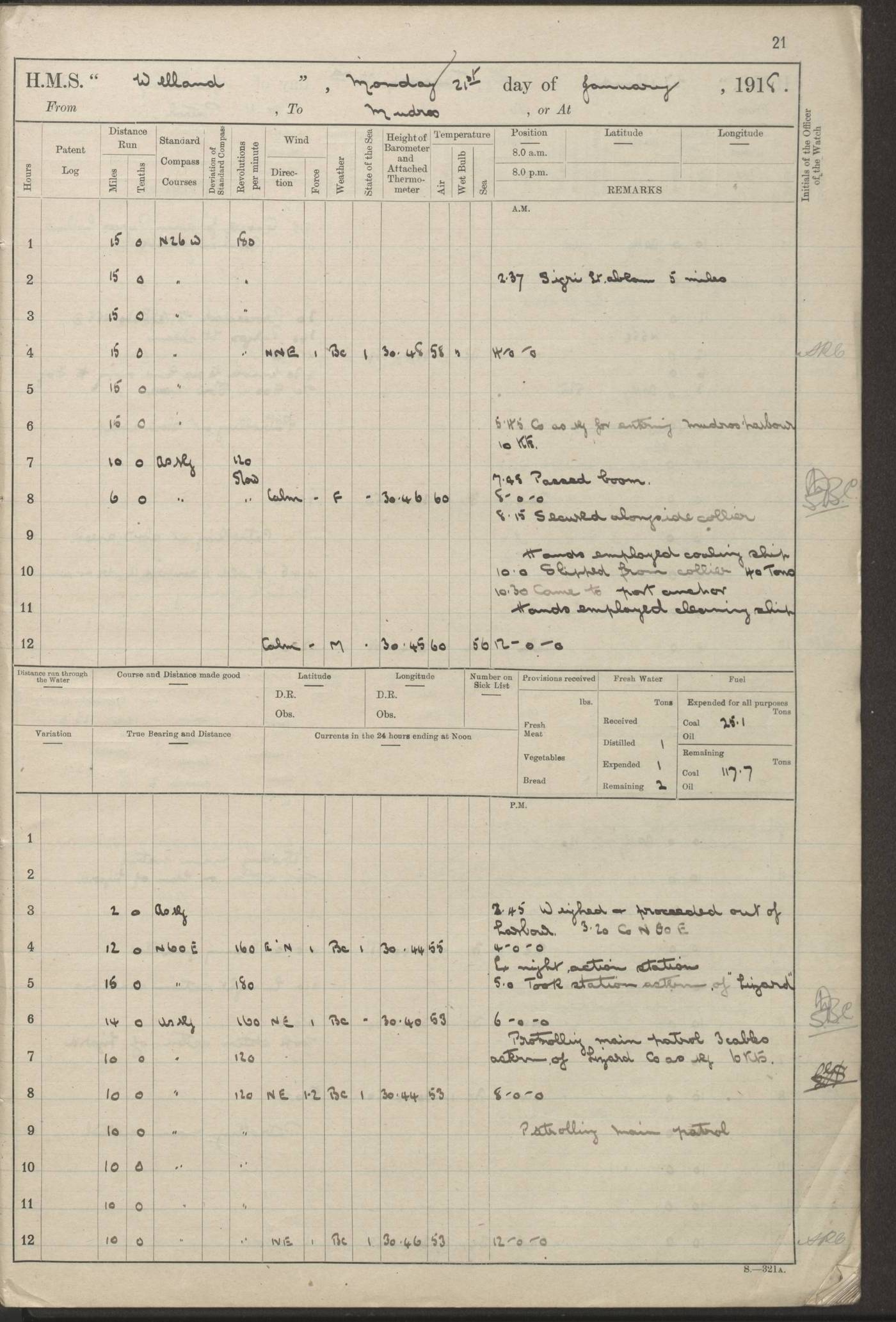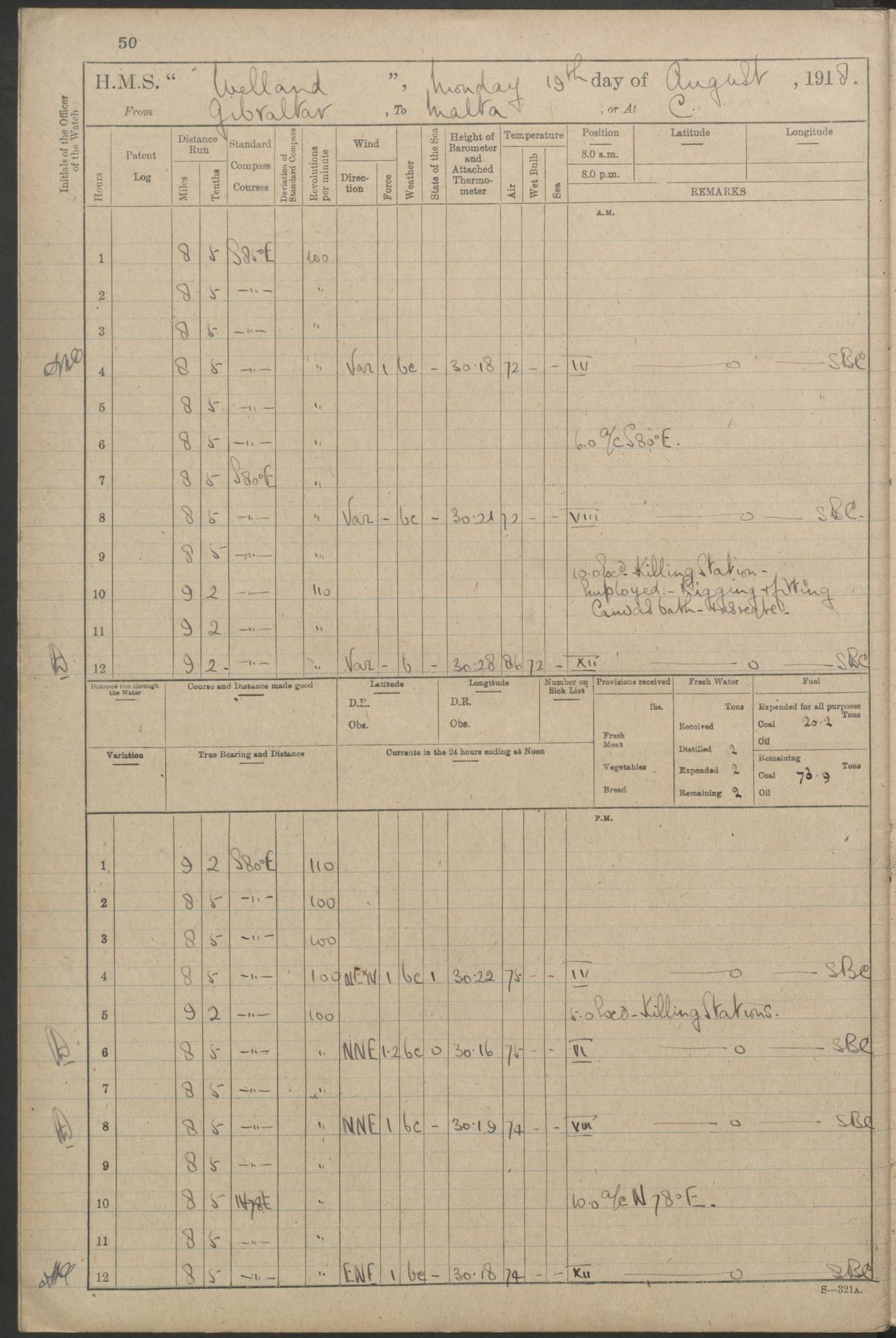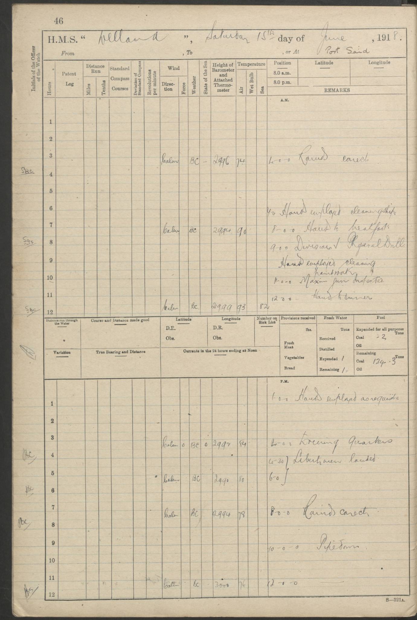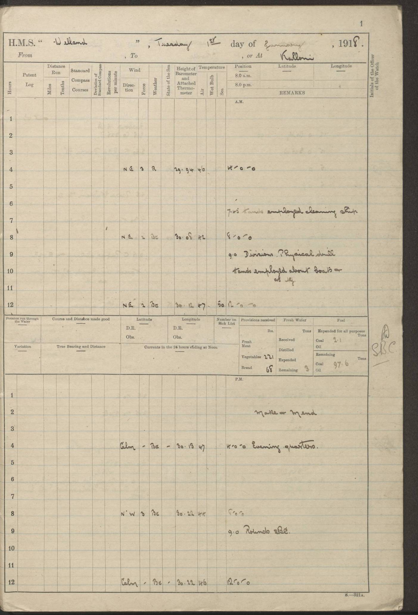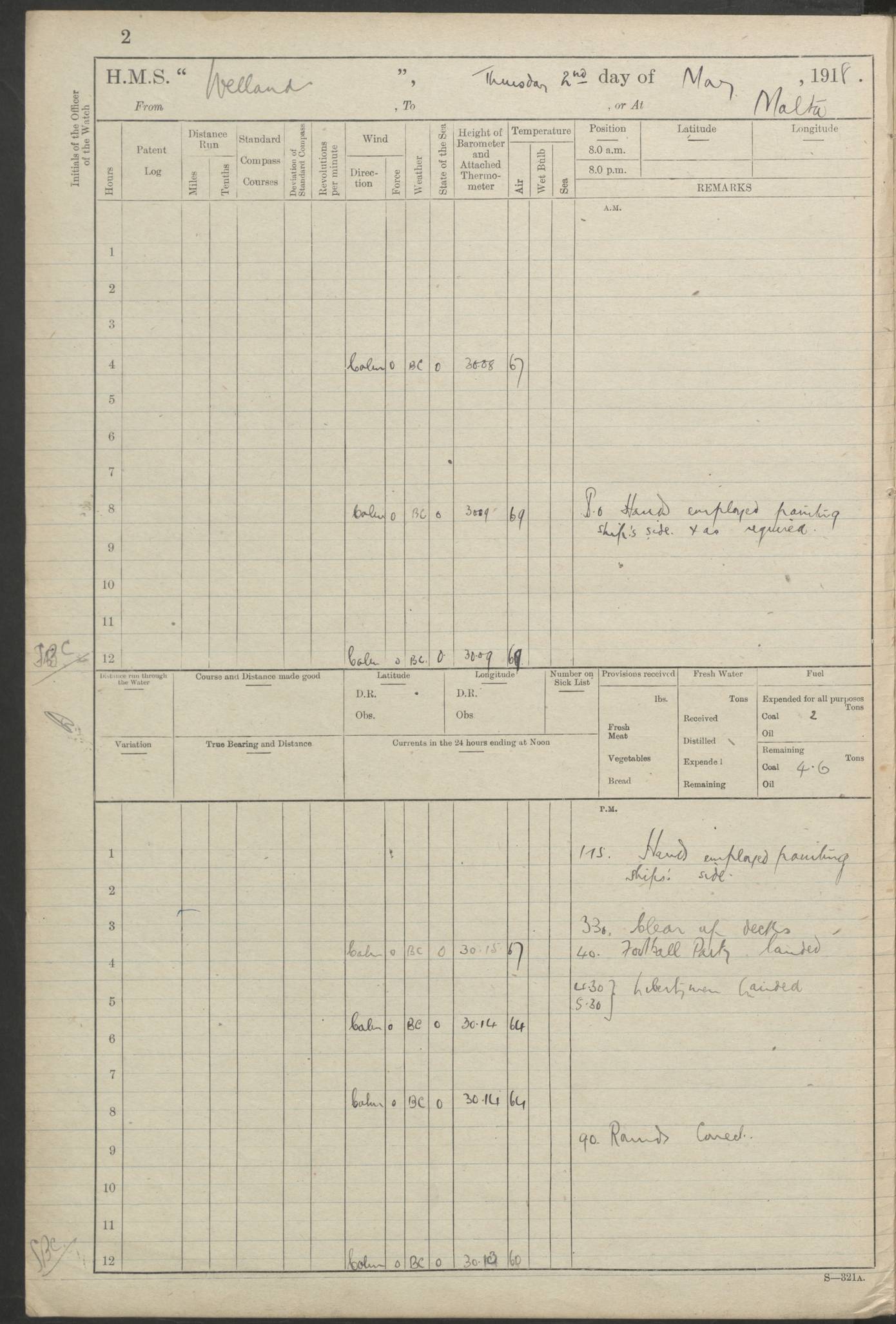 LOGS FOR JANUARY 1918 [Port Kalloni, Rhodes, Port Kalloni, Mudros, Salonika and Port Said] 4caf8ca1cadfd341970372d8: (http://oldweather.s3.amazonaws.com/ADM 53-68386/ADM 53-68386-001_0.jpg) 4caf8ca1cadfd341970372d9: (http://oldweather.s3.amazonaws.com/ADM 53-68386/ADM 53-68386-001_1.jpg) Blue front cover of Logbook for January/February 1918. 4caf8ca1cadfd341970372da: (http://oldweather.s3.amazonaws.com/ADM 53-68386/ADM 53-68386-002_0.jpg) “This is to certify that this is a true copy of the original log of HMS Welland from 1st January 1918 to 28th February 1918, signed FE Ayers, Commanding Officer.” 4caf8ca1cadfd341970372db: (http://oldweather.s3.amazonaws.com/ADM 53-68386/ADM 53-68386-002_1.jpg) Blank except for signature of Eng. Cdr (D) ER Kestell 28th March 1918. 4caf8ca1cadfd341970372dc: (http://oldweather.s3.amazonaws.com/ADM 53-68386/ADM 53-68386-003_0.jpg) Blank. 4caf8ca1cadfd341970372dd: (http://oldweather.s3.amazonaws.com/ADM 53-68386/ADM 53-68386-003_1.jpg) 1 January 1918 Port Kalloni Lat 39.12, Long 26.13 7.45am: Clean ship. 9.00am: Divisions. Physical drill. 9.30am: Hands employed about boats. 1.30pm: Make and mend. 4.00pm: Evening quarters, 9.00pm: Rounds. Weather: Northerly winds, f 3 at times, early rain, clear later, temperatures in the 40ºs F. 4caf8ca1cadfd341970372de: (http://oldweather.s3.amazonaws.com/ADM 53-68386/ADM 53-68386-004_0.jpg) 2 January 1918 Port Kalloni to Rhodes Lat 37.0, Long 26.47 [approx] 1.00am: Weighed and proceeded. 3.50pm: Psara Lt sighted. 5.05am: Same abeam, a/c S. 9.15am: C Papas abeam, a/c S42E. Noon: Levitha abeam. 6.30pm: Anchored off Elmo’s tower, Rhodes [Rodos]. 4caf8ca1cadfd341970372df: (http://oldweather.s3.amazonaws.com/ADM 53-68386/ADM 53-68386-004_1.jpg) 3 January 1918 Rhodes Lat 36.45, Long 28.23 8.00am: Weighed and proceeded into Rodos harbour, moored to buoy, port anchor down. 4caf8ca1cadfd341970372e0: (http://oldweather.s3.amazonaws.com/ADM 53-68386/ADM 53-68386-005_0.jpg) 4 January 1918 Rhodes and at sea Lat 36.45, Long 28.23 6.00pm: Weighed and proceeded to sea, course N84W. 10.45pm: Kandeliusa abeam, a/c N35E. 4caf8ca1cadfd341970372e1: (http://oldweather.s3.amazonaws.com/ADM 53-68386/ADM 53-68386-005_1.jpg) 5 January 1918 At sea to Port Kalloni Lat 38.9, Long 26.05 [approx] 5.40am: C Papas abeam, a/c N. 10.00am: N end of Khios abeam, a/c N25E. 1.30pm: Secured alongside collier in Port Kalloni. Received 105 tons. 7.10pm: Cast off to anchor. 4caf8ca1cadfd341970372e2: (http://oldweather.s3.amazonaws.com/ADM 53-68386/ADM 53-68386-006_0.jpg) 6 January 1918 Port Kalloni Lat 39.12, Long 26.13 Sunday routine. 4caf8ca1cadfd341970372e3: (http://oldweather.s3.amazonaws.com/ADM 53-68386/ADM 53-68386-006_1.jpg) 7 January 1918 Port Kalloni Lat 39.12, Long 26.13 Clean ship, make and mend. 4caf8ca1cadfd341970372e4: (http://oldweather.s3.amazonaws.com/ADM 53-68386/ADM 53-68386-007_0.jpg) 8 January 1918 Port Kalloni Lat 39.12, Long 26.13 Hands employed as requisite. 4caf8ca1cadfd341970372e5: (http://oldweather.s3.amazonaws.com/ADM 53-68386/ADM 53-68386-007_1.jpg) 9 January 1918 Port Kalloni Lat 39.12, Long 26.13 Hands employed in mess decks. Make and mend. 4caf8ca1cadfd341970372e6: (http://oldweather.s3.amazonaws.com/ADM 53-68386/ADM 53-68386-008_0.jpg) 10 January 1918 Port Kalloni Lat 39.12, Long 26.13 Cleaning, refitting. 4caf8ca1cadfd341970372e7: (http://oldweather.s3.amazonaws.com/ADM 53-68386/ADM 53-68386-008_1.jpg) 11 January 1918 Port Kalloni Lat 39.0, Long 26.1 [approx] 11.00am: Weighed and proceeded, took harbour launch in tow. 1.00pm: Slipped launch and returned to harbour. 2.00pm: Anchored. 4caf8ca1cadfd341970372e8: (http://oldweather.s3.amazonaws.com/ADM 53-68386/ADM 53-68386-009_0.jpg) 12 January 1918 Port Kalloni Lat 39.12, Long 26.13 Saturday in harbour. Clean ship. Pipe down at noon. 4caf8ca1cadfd341970372e9: (http://oldweather.s3.amazonaws.com/ADM 53-68386/ADM 53-68386-009_1.jpg) 13 January 1918 Port Kalloni Lat 39.12, Long 26.13 Sunday routine. 4caf8ca1cadfd341970372ea: (http://oldweather.s3.amazonaws.com/ADM 53-68386/ADM 53-68386-010_0.jpg) 14 January 1918 Port Kalloni Lat 39.12, Long 26.13 9.00am: Working party away to relay buoys in channel. 4caf8ca1cadfd341970372eb: (http://oldweather.s3.amazonaws.com/ADM 53-68386/ADM 53-68386-010_1.jpg) 15 January 1918 Port Kalloni Lat 39.12, Long 26.13 Clean ship. Make and mend. 4caf8ca1cadfd341970372ec: (http://oldweather.s3.amazonaws.com/ADM 53-68386/ADM 53-68386-011_0.jpg) 16 January 1918 Port Kalloni Lat 39.12, Long 26.13 3.30pm: Weighed and towed to another billet. 3.45pm: HMS Forward took over SOE [possibly Senior Officer Eastern Med.]. 4caf8ca1cadfd341970372ed: (http://oldweather.s3.amazonaws.com/ADM 53-68386/ADM 53-68386-011_1.jpg) 17 January 1918 Port Kalloni Lat 39.12, Long 26.13 7.30pm: Weighed and proceeded up harbour, secured to collier, received 42 tons and cast off to anchor. Clean ship. 4caf8ca1cadfd341970372ee: (http://oldweather.s3.amazonaws.com/ADM 53-68386/ADM 53-68386-012_0.jpg) 18 January 1918 Port Kalloni Lat 39.12, Long 26.13 Hands employed as requisite. 4caf8ca1cadfd341970372ef: (http://oldweather.s3.amazonaws.com/ADM 53-68386/ADM 53-68386-012_1.jpg) 19 January 1918 Port Kalloni Lat 39.12, Long 26.13 Cleaning, refitting etc. 4caf8ca2cadfd341970372f0: (http://oldweather.s3.amazonaws.com/ADM 53-68386/ADM 53-68386-013_0.jpg) 20 January 1918 Mytilene patrol Lat 38.9, Long 26.6 [approx] 6.45am: Weighed and proceeded. 8.00am: Course SE. 10.15am: Stopped Greek steamer and ordered her into Mytilene harbour. Proceeded SE by E to patrol Mytilene channel. 3.45pm: A/c S40W. 6.30pm: Anchored, Kolokithia [Chios]. 11.00pm: Weighed and proceeded, course N26W. 4caf8ca2cadfd341970372f1: (http://oldweather.s3.amazonaws.com/ADM 53-68386/ADM 53-68386-013_1.jpg) 21 January 1918 At sea to Mudros and on patrol Lat 39.88, Long 25.25 2.37am: Sigri Lt abeam, 5 miles. 8.15am: Secured to collier, Port Mudros. 10.00am: Received 40 tons, cast off to anchor. 2.45pm: Weighed and proceeded. 3