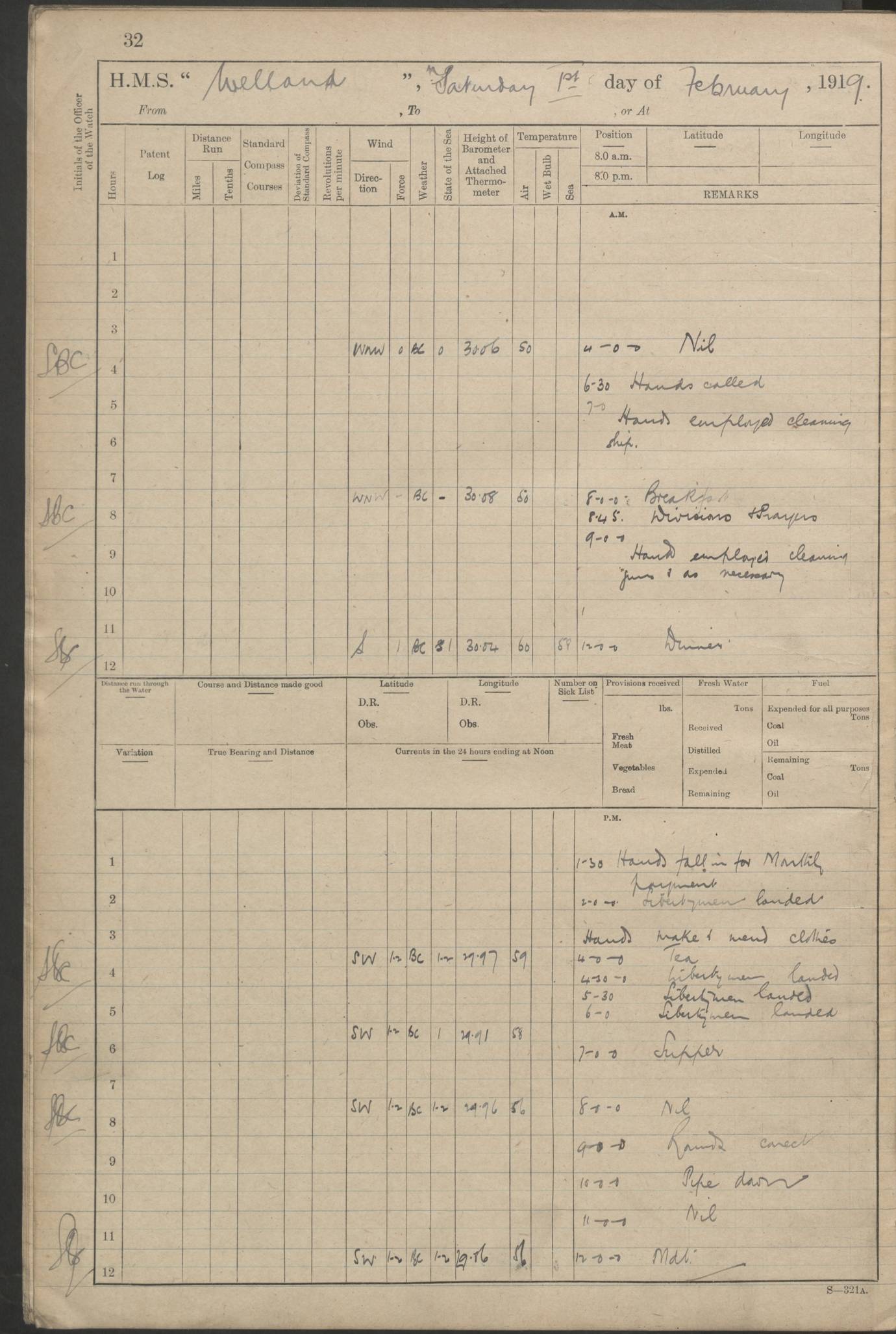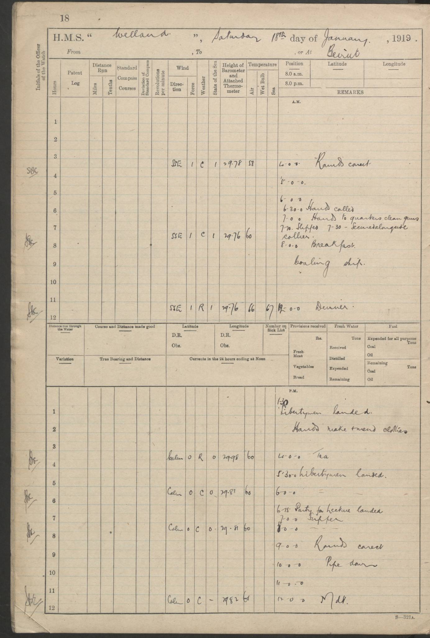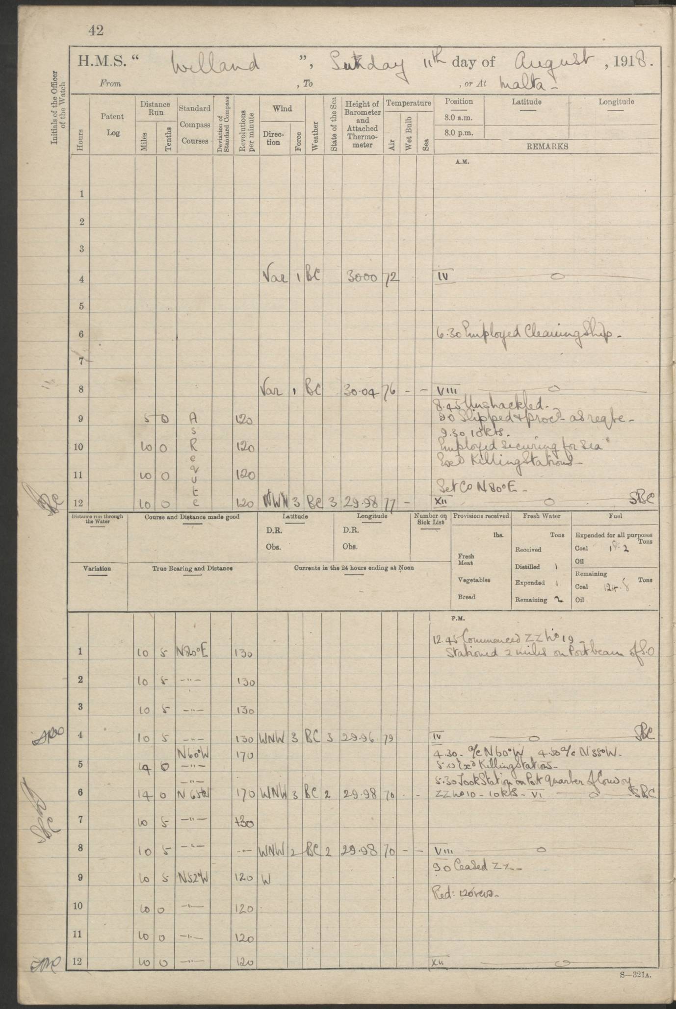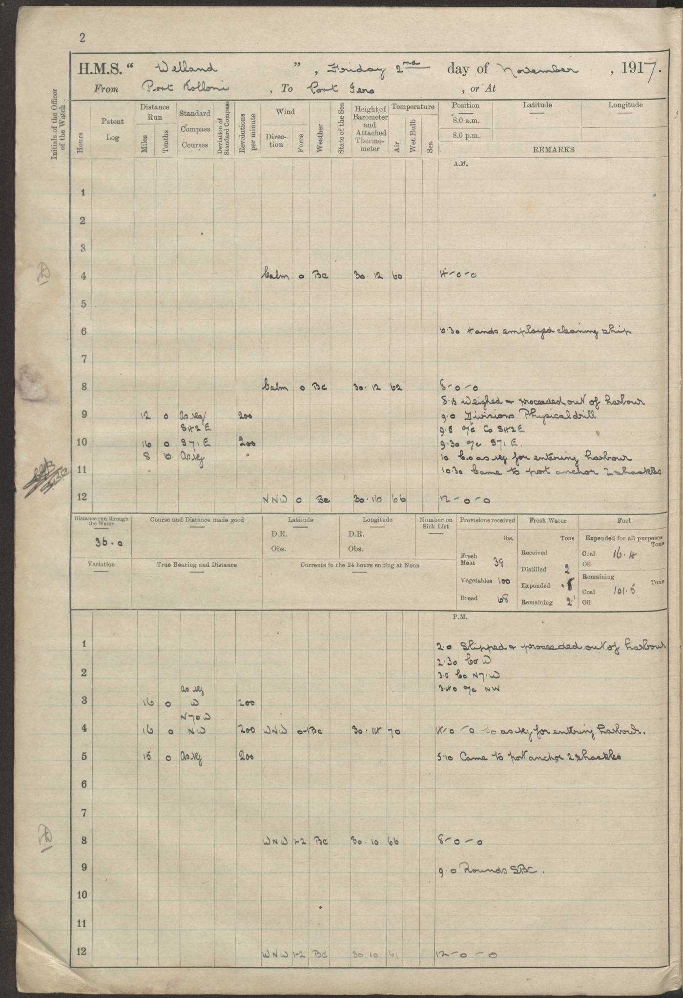 LOGS FOR JANUARY 1918 [Port Kalloni, Rhodes, Port Kalloni, Mudros, Salonika and Port Said] 4caf8ca1cadfd341970372d8: (http://oldweather.s3.amazonaws.com/ADM 53-68386/ADM 53-68386-001_0.jpg) 4caf8ca1cadfd341970372d9: (http://oldweather.s3.amazonaws.com/ADM 53-68386/ADM 53-68386-001_1.jpg) Blue front cover of Logbook for January/February 1918. 4caf8ca1cadfd341970372da: (http://oldweather.s3.amazonaws.com/ADM 53-68386/ADM 53-68386-002_0.jpg) “This is to certify that this is a true copy of the original log of HMS Welland from 1st January 1918 to 28th February 1918, signed FE Ayers, Commanding Officer.” 4caf8ca1cadfd341970372db: (http://oldweather.s3.amazonaws.com/ADM 53-68386/ADM 53-68386-002_1.jpg) Blank except for signature of Eng. Cdr (D) ER Kestell 28th March 1918. 4caf8ca1cadfd341970372dc: (http://oldweather.s3.amazonaws.com/ADM 53-68386/ADM 53-68386-003_0.jpg) Blank. 4caf8ca1cadfd341970372dd: (http://oldweather.s3.amazonaws.com/ADM 53-68386/ADM 53-68386-003_1.jpg) 1 January 1918 Port Kalloni Lat 39.12, Long 26.13 7.45am: Clean ship. 9.00am: Divisions. Physical drill. 9.30am: Hands employed about boats. 1.30pm: Make and mend. 4.00pm: Evening quarters, 9.00pm: Rounds. Weather: Northerly winds, f 3 at times, early rain, clear later, temperatures in the 40ºs F. 4caf8ca1cadfd341970372de: (http://oldweather.s3.amazonaws.com/ADM 53-68386/ADM 53-68386-004_0.jpg) 2 January 1918 Port Kalloni to Rhodes Lat 37.0, Long 26.47 [approx] 1.00am: Weighed and proceeded. 3.50pm: Psara Lt sighted. 5.05am: Same abeam, a/c S. 9.15am: C Papas abeam, a/c S42E. Noon: Levitha abeam. 6.30pm: Anchored off Elmo’s tower, Rhodes [Rodos]. 4caf8ca1cadfd341970372df: (http://oldweather.s3.amazonaws.com/ADM 53-68386/ADM 53-68386-004_1.jpg) 3 January 1918 Rhodes Lat 36.45, Long 28.23 8.00am: Weighed and proceeded into Rodos harbour, moored to buoy, port anchor down. 4caf8ca1cadfd341970372e0: (http://oldweather.s3.amazonaws.com/ADM 53-68386/ADM 53-68386-005_0.jpg) 4 January 1918 Rhodes and at sea Lat 36.45, Long 28.23 6.00pm: Weighed and proceeded to sea, course N84W. 10.45pm: Kandeliusa abeam, a/c N35E. 4caf8ca1cadfd341970372e1: (http://oldweather.s3.amazonaws.com/ADM 53-68386/ADM 53-68386-005_1.jpg) 5 January 1918 At sea to Port Kalloni Lat 38.9, Long 26.05 [approx] 5.40am: C Papas abeam, a/c N. 10.00am: N end of Khios abeam, a/c N25E. 1.30pm: Secured alongside collier in Port Kalloni. Received 105 tons. 7.10pm: Cast off to anchor. 4caf8ca1cadfd341970372e2: (http://oldweather.s3.amazonaws.com/ADM 53-68386/ADM 53-68386-006_0.jpg) 6 January 1918 Port Kalloni Lat 39.12, Long 26.13 Sunday routine. 4caf8ca1cadfd341970372e3: (http://oldweather.s3.amazonaws.com/ADM 53-68386/ADM 53-68386-006_1.jpg) 7 January 1918 Port Kalloni Lat 39.12, Long 26.13 Clean ship, make and mend. 4caf8ca1cadfd341970372e4: (http://oldweather.s3.amazonaws.com/ADM 53-68386/ADM 53-68386-007_0.jpg) 8 January 1918 Port Kalloni Lat 39.12, Long 26.13 Hands employed as requisite. 4caf8ca1cadfd341970372e5: (http://oldweather.s3.amazonaws.com/ADM 53-68386/ADM 53-68386-007_1.jpg) 9 January 1918 Port Kalloni Lat 39.12, Long 26.13 Hands employed in mess decks. Make and mend. 4caf8ca1cadfd341970372e6: (http://oldweather.s3.amazonaws.com/ADM 53-68386/ADM 53-68386-008_0.jpg) 10 January 1918 Port Kalloni Lat 39.12, Long 26.13 Cleaning, refitting. 4caf8ca1cadfd341970372e7: (http://oldweather.s3.amazonaws.com/ADM 53-68386/ADM 53-68386-008_1.jpg) 11 January 1918 Port Kalloni Lat 39.0, Long 26.1 [approx] 11.00am: Weighed and proceeded, took harbour launch in tow. 1.00pm: Slipped launch and returned to harbour. 2.00pm: Anchored. 4caf8ca1cadfd341970372e8: (http://oldweather.s3.amazonaws.com/ADM 53-68386/ADM 53-68386-009_0.jpg) 12 January 1918 Port Kalloni Lat 39.12, Long 26.13 Saturday in harbour. Clean ship. Pipe down at noon. 4caf8ca1cadfd341970372e9: (http://oldweather.s3.amazonaws.com/ADM 53-68386/ADM 53-68386-009_1.jpg) 13 January 1918 Port Kalloni Lat 39.12, Long 26.13 Sunday routine. 4caf8ca1cadfd341970372ea: (http://oldweather.s3.amazonaws.com/ADM 53-68386/ADM 53-68386-010_0.jpg) 14 January 1918 Port Kalloni Lat 39.12, Long 26.13 9.00am: Working party away to relay buoys in channel. 4caf8ca1cadfd341970372eb: (http://oldweather.s3.amazonaws.com/ADM 53-68386/ADM 53-68386-010_1.jpg) 15 January 1918 Port Kalloni Lat 39.12, Long 26.13 Clean ship. Make and mend. 4caf8ca1cadfd341970372ec: (http://oldweather.s3.amazonaws.com/ADM 53-68386/ADM 53-68386-011_0.jpg) 16 January 1918 Port Kalloni Lat 39.12, Long 26.13 3.30pm: Weighed and towed to another billet. 3.45pm: HMS Forward took over SOE [possibly Senior Officer Eastern Med.]. 4caf8ca1cadfd341970372ed: (http://oldweather.s3.amazonaws.com/ADM 53-68386/ADM 53-68386-011_1.jpg) 17 January 1918 Port Kalloni Lat 39.12, Long 26.13 7.30pm: Weighed and proceeded up harbour, secured to collier, received 42 tons and cast off to anchor. Clean ship. 4caf8ca1cadfd341970372ee: (http://oldweather.s3.amazonaws.com/ADM 53-68386/ADM 53-68386-012_0.jpg) 18 January 1918 Port Kalloni Lat 39.12, Long 26.13 Hands employed as requisite. 4caf8ca1cadfd341970372ef: (http://oldweather.s3.amazonaws.com/ADM 53-68386/ADM 53-68386-012_1.jpg) 19 January 1918 Port Kalloni Lat 39.12, Long 26.13 Cleaning, refitting etc. 4caf8ca2cadfd341970372f0: (http://oldweather.s3.amazonaws.com/ADM 53-68386/ADM 53-68386-013_0.jpg) 20 January 1918 Mytilene patrol Lat 38.9, Long 26.6 [approx] 6.45am: Weighed and proceeded. 8.00am: Course SE. 10.15am: Stopped Greek steamer and ordered her into Mytilene harbour. Proceeded SE by E to patrol Mytilene channel. 3.45pm: A/c S40W. 6.30pm: Anchored, Kolokithia [Chios]. 11.00pm: Weighed and proceeded, course N26W. 4caf8ca2cadfd341970372f1: (http://oldweather.s3.amazonaws.com/ADM 53-68386/ADM 53-68386-013_1.jpg) 21 January 1918 At sea to Mudros and on patrol Lat 39.88, Long 25.25 2.37am: Sigri Lt abeam, 5 miles. 8.15am: Secured to collier, Port Mudros. 10.00am: Received 40 tons, cast off to anchor. 2.45pm: Weighed and proceeded. 3