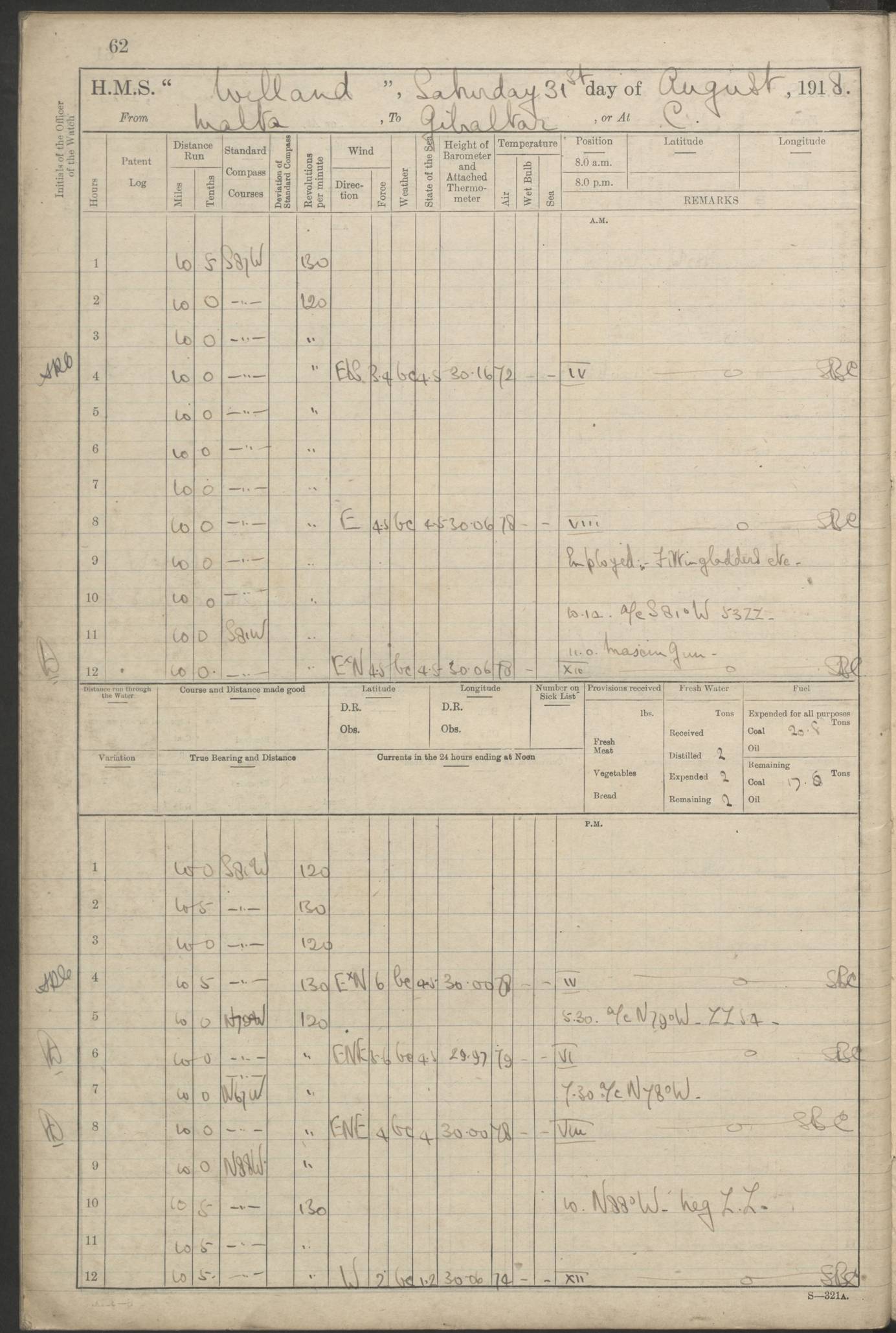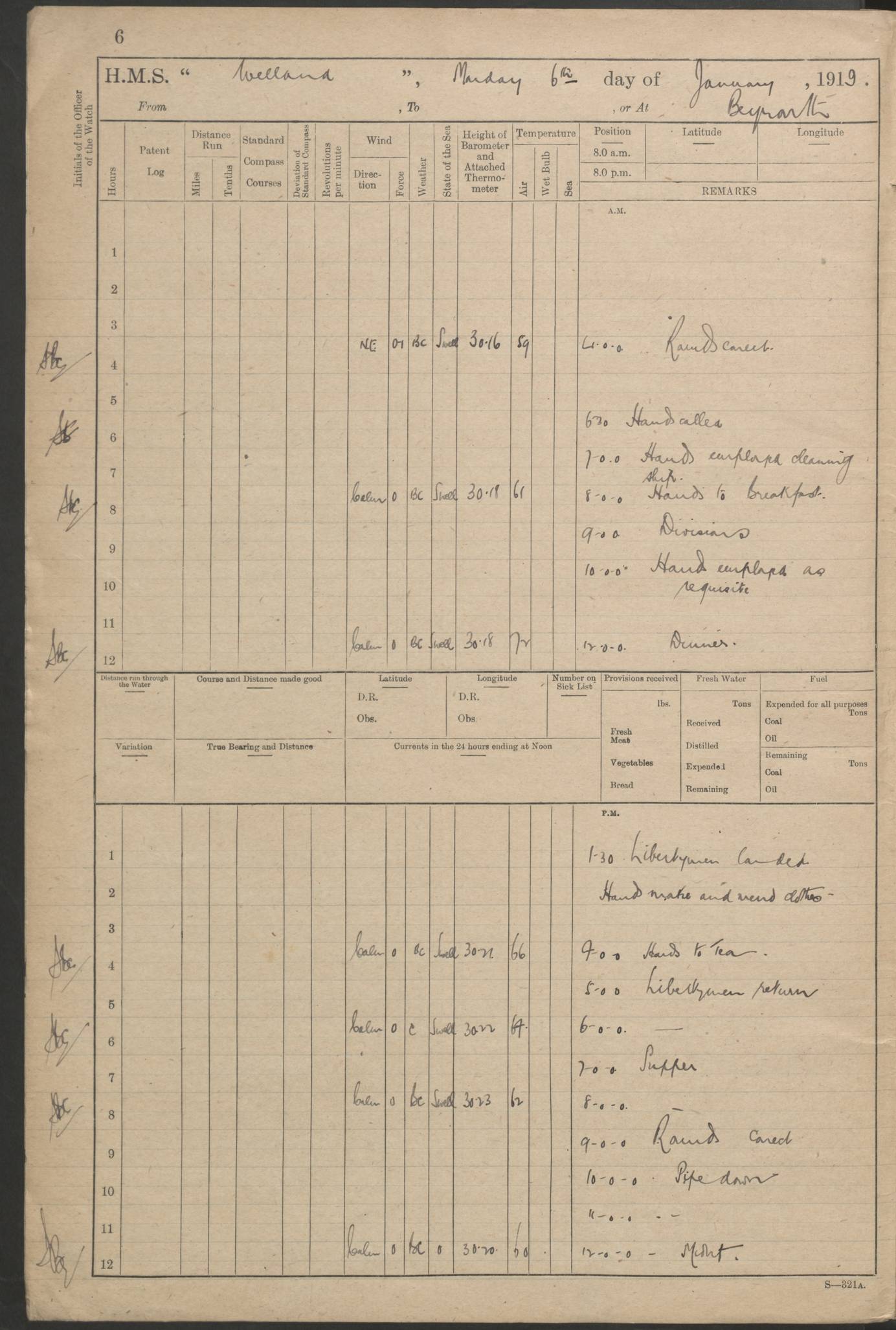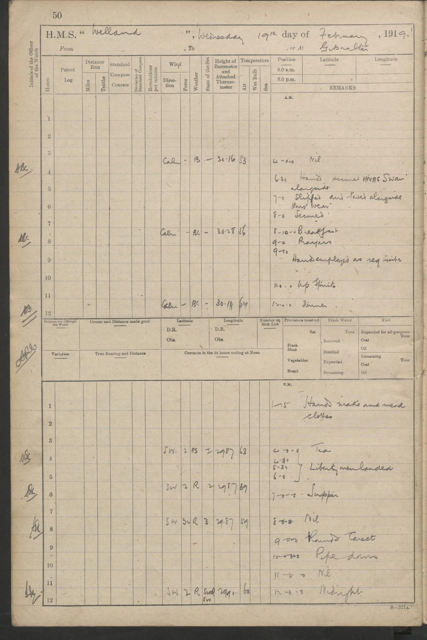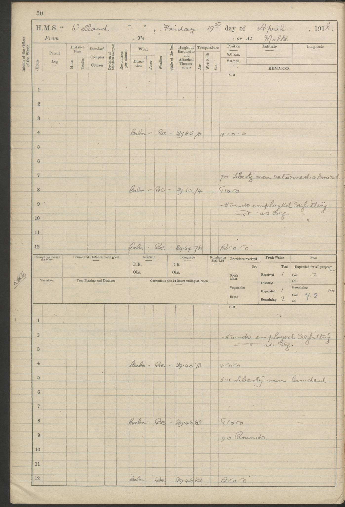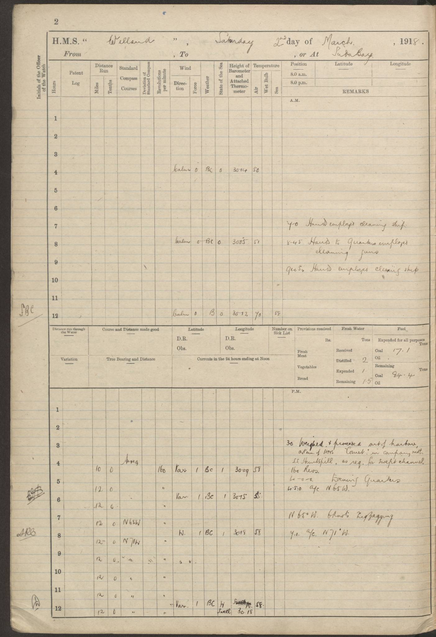 LOGS FOR JANUARY 1918 [Port Kalloni, Rhodes, Port Kalloni, Mudros, Salonika and Port Said] 4caf8ca1cadfd341970372d8: (http://oldweather.s3.amazonaws.com/ADM 53-68386/ADM 53-68386-001_0.jpg) 4caf8ca1cadfd341970372d9: (http://oldweather.s3.amazonaws.com/ADM 53-68386/ADM 53-68386-001_1.jpg) Blue front cover of Logbook for January/February 1918. 4caf8ca1cadfd341970372da: (http://oldweather.s3.amazonaws.com/ADM 53-68386/ADM 53-68386-002_0.jpg) “This is to certify that this is a true copy of the original log of HMS Welland from 1st January 1918 to 28th February 1918, signed FE Ayers, Commanding Officer.” 4caf8ca1cadfd341970372db: (http://oldweather.s3.amazonaws.com/ADM 53-68386/ADM 53-68386-002_1.jpg) Blank except for signature of Eng. Cdr (D) ER Kestell 28th March 1918. 4caf8ca1cadfd341970372dc: (http://oldweather.s3.amazonaws.com/ADM 53-68386/ADM 53-68386-003_0.jpg) Blank. 4caf8ca1cadfd341970372dd: (http://oldweather.s3.amazonaws.com/ADM 53-68386/ADM 53-68386-003_1.jpg) 1 January 1918 Port Kalloni Lat 39.12, Long 26.13 7.45am: Clean ship. 9.00am: Divisions. Physical drill. 9.30am: Hands employed about boats. 1.30pm: Make and mend. 4.00pm: Evening quarters, 9.00pm: Rounds. Weather: Northerly winds, f 3 at times, early rain, clear later, temperatures in the 40ºs F. 4caf8ca1cadfd341970372de: (http://oldweather.s3.amazonaws.com/ADM 53-68386/ADM 53-68386-004_0.jpg) 2 January 1918 Port Kalloni to Rhodes Lat 37.0, Long 26.47 [approx] 1.00am: Weighed and proceeded. 3.50pm: Psara Lt sighted. 5.05am: Same abeam, a/c S. 9.15am: C Papas abeam, a/c S42E. Noon: Levitha abeam. 6.30pm: Anchored off Elmo’s tower, Rhodes [Rodos]. 4caf8ca1cadfd341970372df: (http://oldweather.s3.amazonaws.com/ADM 53-68386/ADM 53-68386-004_1.jpg) 3 January 1918 Rhodes Lat 36.45, Long 28.23 8.00am: Weighed and proceeded into Rodos harbour, moored to buoy, port anchor down. 4caf8ca1cadfd341970372e0: (http://oldweather.s3.amazonaws.com/ADM 53-68386/ADM 53-68386-005_0.jpg) 4 January 1918 Rhodes and at sea Lat 36.45, Long 28.23 6.00pm: Weighed and proceeded to sea, course N84W. 10.45pm: Kandeliusa abeam, a/c N35E. 4caf8ca1cadfd341970372e1: (http://oldweather.s3.amazonaws.com/ADM 53-68386/ADM 53-68386-005_1.jpg) 5 January 1918 At sea to Port Kalloni Lat 38.9, Long 26.05 [approx] 5.40am: C Papas abeam, a/c N. 10.00am: N end of Khios abeam, a/c N25E. 1.30pm: Secured alongside collier in Port Kalloni. Received 105 tons. 7.10pm: Cast off to anchor. 4caf8ca1cadfd341970372e2: (http://oldweather.s3.amazonaws.com/ADM 53-68386/ADM 53-68386-006_0.jpg) 6 January 1918 Port Kalloni Lat 39.12, Long 26.13 Sunday routine. 4caf8ca1cadfd341970372e3: (http://oldweather.s3.amazonaws.com/ADM 53-68386/ADM 53-68386-006_1.jpg) 7 January 1918 Port Kalloni Lat 39.12, Long 26.13 Clean ship, make and mend. 4caf8ca1cadfd341970372e4: (http://oldweather.s3.amazonaws.com/ADM 53-68386/ADM 53-68386-007_0.jpg) 8 January 1918 Port Kalloni Lat 39.12, Long 26.13 Hands employed as requisite. 4caf8ca1cadfd341970372e5: (http://oldweather.s3.amazonaws.com/ADM 53-68386/ADM 53-68386-007_1.jpg) 9 January 1918 Port Kalloni Lat 39.12, Long 26.13 Hands employed in mess decks. Make and mend. 4caf8ca1cadfd341970372e6: (http://oldweather.s3.amazonaws.com/ADM 53-68386/ADM 53-68386-008_0.jpg) 10 January 1918 Port Kalloni Lat 39.12, Long 26.13 Cleaning, refitting. 4caf8ca1cadfd341970372e7: (http://oldweather.s3.amazonaws.com/ADM 53-68386/ADM 53-68386-008_1.jpg) 11 January 1918 Port Kalloni Lat 39.0, Long 26.1 [approx] 11.00am: Weighed and proceeded, took harbour launch in tow. 1.00pm: Slipped launch and returned to harbour. 2.00pm: Anchored. 4caf8ca1cadfd341970372e8: (http://oldweather.s3.amazonaws.com/ADM 53-68386/ADM 53-68386-009_0.jpg) 12 January 1918 Port Kalloni Lat 39.12, Long 26.13 Saturday in harbour. Clean ship. Pipe down at noon. 4caf8ca1cadfd341970372e9: (http://oldweather.s3.amazonaws.com/ADM 53-68386/ADM 53-68386-009_1.jpg) 13 January 1918 Port Kalloni Lat 39.12, Long 26.13 Sunday routine. 4caf8ca1cadfd341970372ea: (http://oldweather.s3.amazonaws.com/ADM 53-68386/ADM 53-68386-010_0.jpg) 14 January 1918 Port Kalloni Lat 39.12, Long 26.13 9.00am: Working party away to relay buoys in channel. 4caf8ca1cadfd341970372eb: (http://oldweather.s3.amazonaws.com/ADM 53-68386/ADM 53-68386-010_1.jpg) 15 January 1918 Port Kalloni Lat 39.12, Long 26.13 Clean ship. Make and mend. 4caf8ca1cadfd341970372ec: (http://oldweather.s3.amazonaws.com/ADM 53-68386/ADM 53-68386-011_0.jpg) 16 January 1918 Port Kalloni Lat 39.12, Long 26.13 3.30pm: Weighed and towed to another billet. 3.45pm: HMS Forward took over SOE [possibly Senior Officer Eastern Med.]. 4caf8ca1cadfd341970372ed: (http://oldweather.s3.amazonaws.com/ADM 53-68386/ADM 53-68386-011_1.jpg) 17 January 1918 Port Kalloni Lat 39.12, Long 26.13 7.30pm: Weighed and proceeded up harbour, secured to collier, received 42 tons and cast off to anchor. Clean ship. 4caf8ca1cadfd341970372ee: (http://oldweather.s3.amazonaws.com/ADM 53-68386/ADM 53-68386-012_0.jpg) 18 January 1918 Port Kalloni Lat 39.12, Long 26.13 Hands employed as requisite. 4caf8ca1cadfd341970372ef: (http://oldweather.s3.amazonaws.com/ADM 53-68386/ADM 53-68386-012_1.jpg) 19 January 1918 Port Kalloni Lat 39.12, Long 26.13 Cleaning, refitting etc. 4caf8ca2cadfd341970372f0: (http://oldweather.s3.amazonaws.com/ADM 53-68386/ADM 53-68386-013_0.jpg) 20 January 1918 Mytilene patrol Lat 38.9, Long 26.6 [approx] 6.45am: Weighed and proceeded. 8.00am: Course SE. 10.15am: Stopped Greek steamer and ordered her into Mytilene harbour. Proceeded SE by E to patrol Mytilene channel. 3.45pm: A/c S40W. 6.30pm: Anchored, Kolokithia [Chios]. 11.00pm: Weighed and proceeded, course N26W. 4caf8ca2cadfd341970372f1: (http://oldweather.s3.amazonaws.com/ADM 53-68386/ADM 53-68386-013_1.jpg) 21 January 1918 At sea to Mudros and on patrol Lat 39.88, Long 25.25 2.37am: Sigri Lt abeam, 5 miles. 8.15am: Secured to collier, Port Mudros. 10.00am: Received 40 tons, cast off to anchor. 2.45pm: Weighed and proceeded. 3