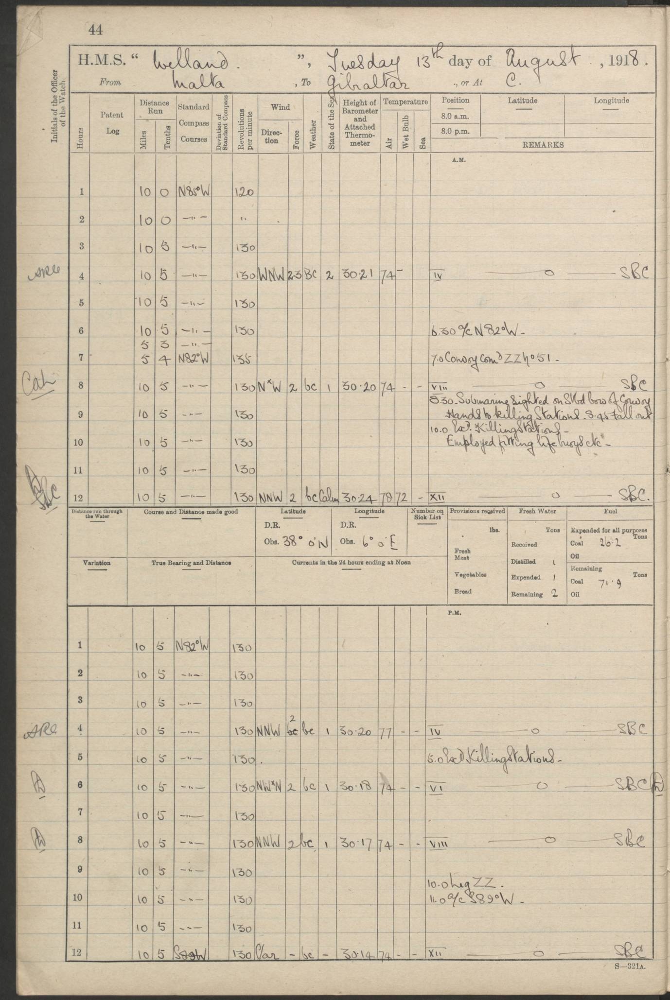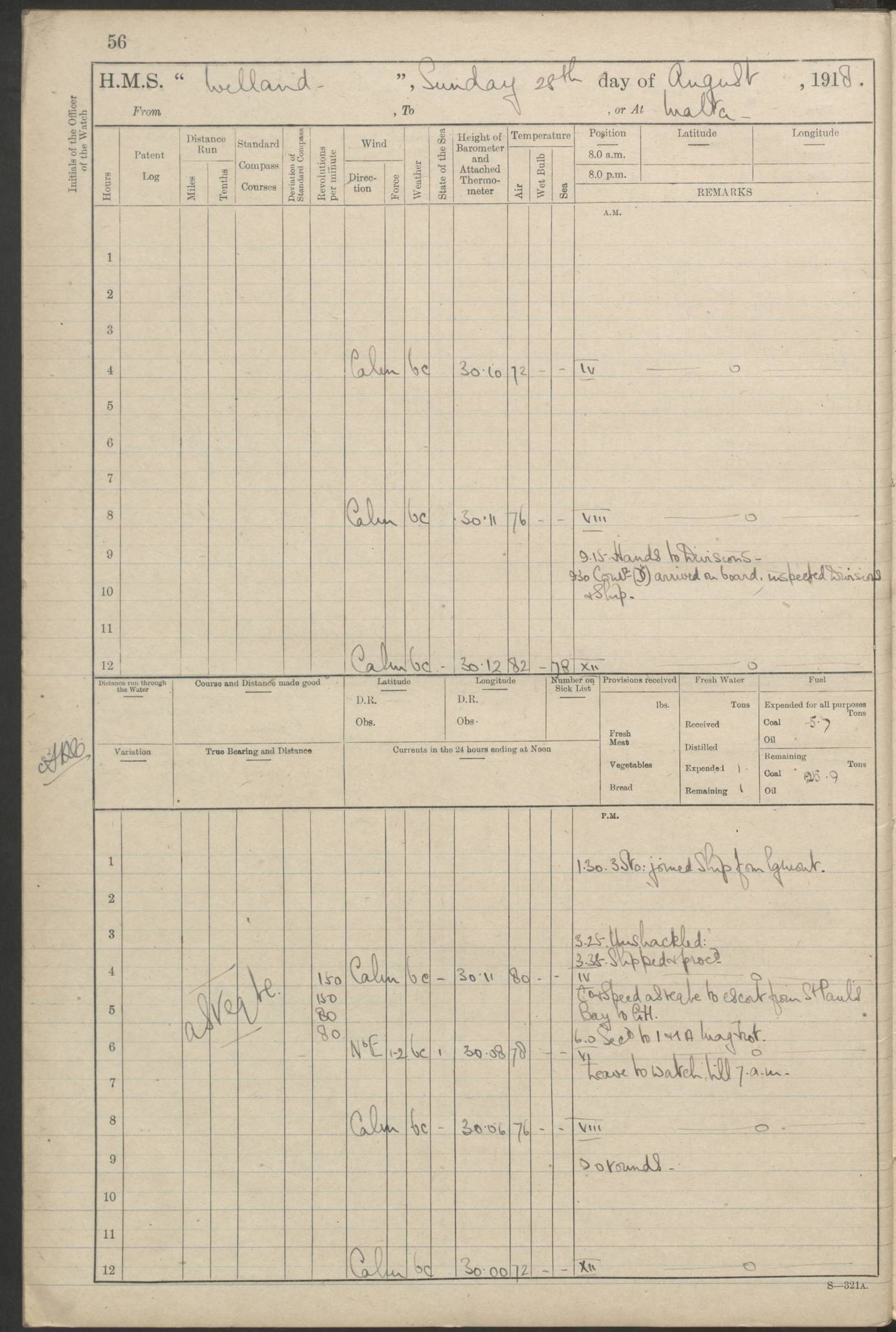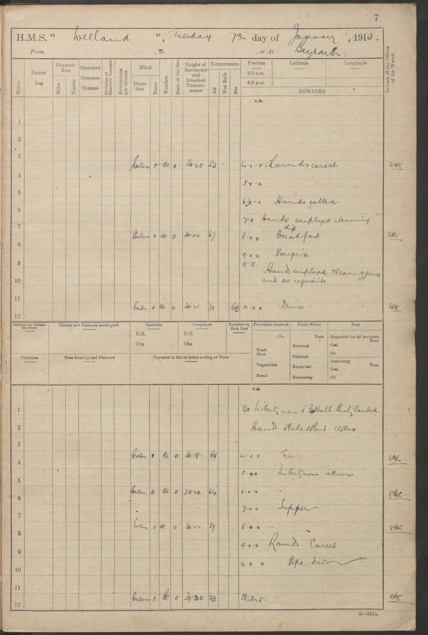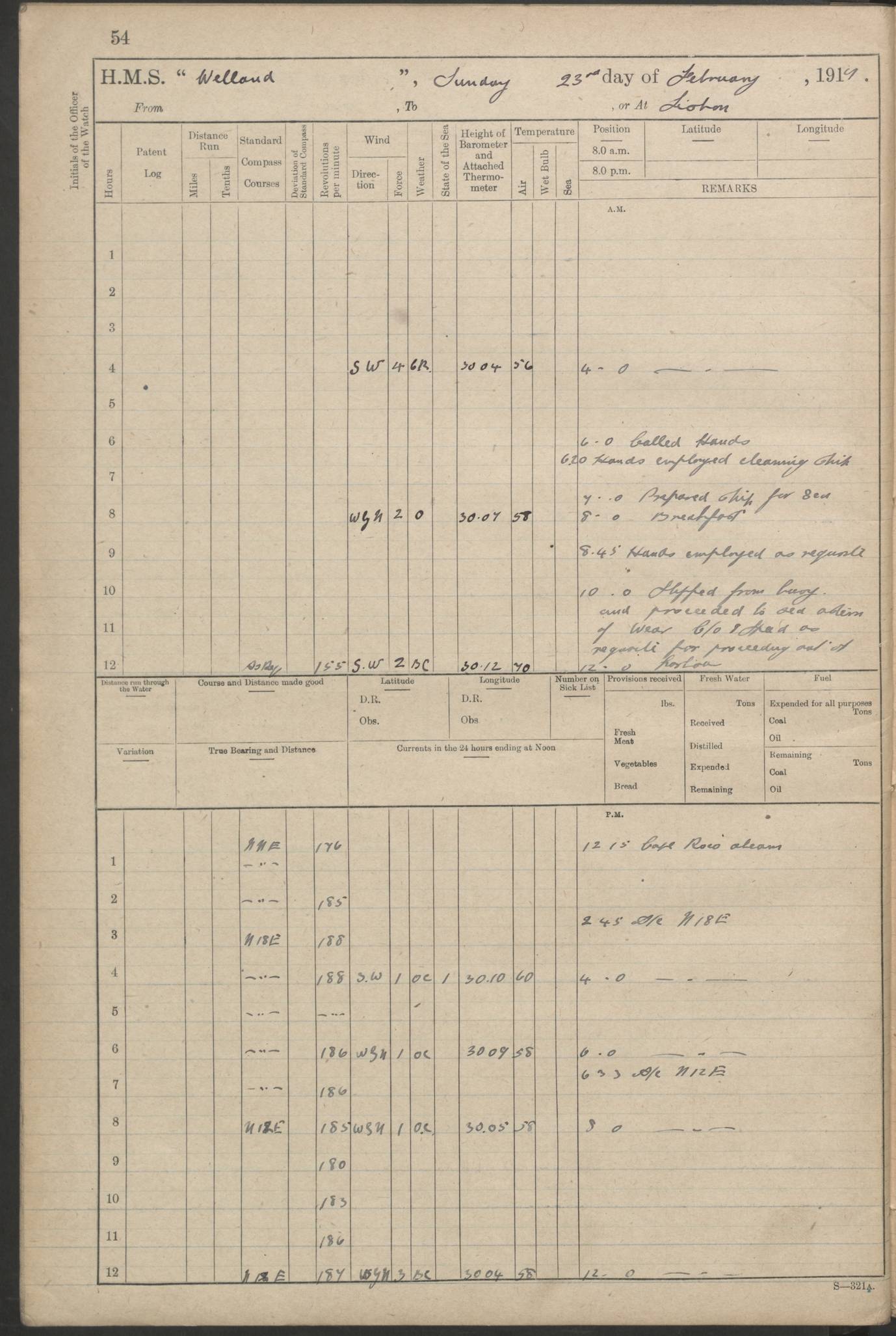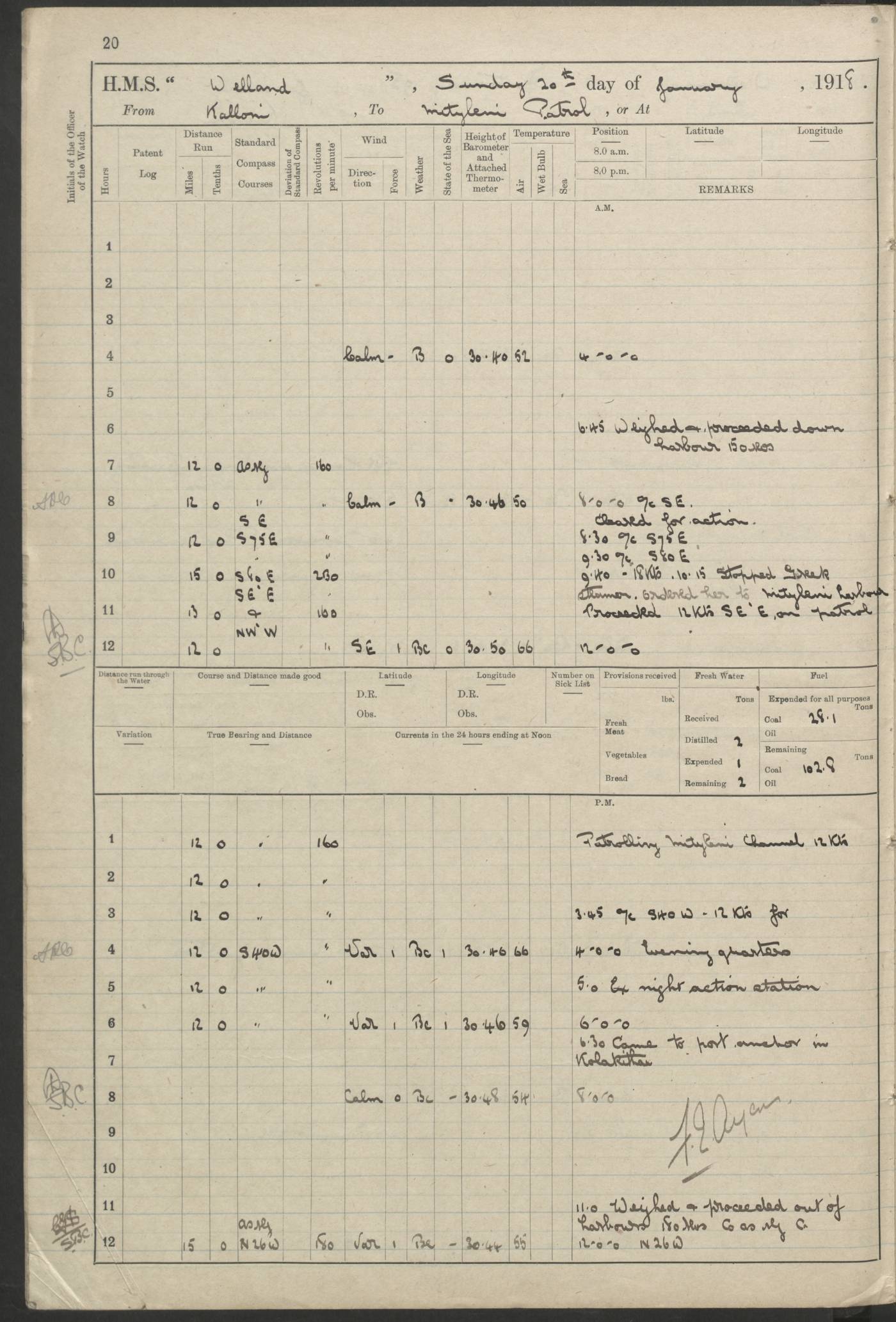 LOGS FOR JANUARY 1918 [Port Kalloni, Rhodes, Port Kalloni, Mudros, Salonika and Port Said] 4caf8ca1cadfd341970372d8: (http://oldweather.s3.amazonaws.com/ADM 53-68386/ADM 53-68386-001_0.jpg) 4caf8ca1cadfd341970372d9: (http://oldweather.s3.amazonaws.com/ADM 53-68386/ADM 53-68386-001_1.jpg) Blue front cover of Logbook for January/February 1918. 4caf8ca1cadfd341970372da: (http://oldweather.s3.amazonaws.com/ADM 53-68386/ADM 53-68386-002_0.jpg) “This is to certify that this is a true copy of the original log of HMS Welland from 1st January 1918 to 28th February 1918, signed FE Ayers, Commanding Officer.” 4caf8ca1cadfd341970372db: (http://oldweather.s3.amazonaws.com/ADM 53-68386/ADM 53-68386-002_1.jpg) Blank except for signature of Eng. Cdr (D) ER Kestell 28th March 1918. 4caf8ca1cadfd341970372dc: (http://oldweather.s3.amazonaws.com/ADM 53-68386/ADM 53-68386-003_0.jpg) Blank. 4caf8ca1cadfd341970372dd: (http://oldweather.s3.amazonaws.com/ADM 53-68386/ADM 53-68386-003_1.jpg) 1 January 1918 Port Kalloni Lat 39.12, Long 26.13 7.45am: Clean ship. 9.00am: Divisions. Physical drill. 9.30am: Hands employed about boats. 1.30pm: Make and mend. 4.00pm: Evening quarters, 9.00pm: Rounds. Weather: Northerly winds, f 3 at times, early rain, clear later, temperatures in the 40ºs F. 4caf8ca1cadfd341970372de: (http://oldweather.s3.amazonaws.com/ADM 53-68386/ADM 53-68386-004_0.jpg) 2 January 1918 Port Kalloni to Rhodes Lat 37.0, Long 26.47 [approx] 1.00am: Weighed and proceeded. 3.50pm: Psara Lt sighted. 5.05am: Same abeam, a/c S. 9.15am: C Papas abeam, a/c S42E. Noon: Levitha abeam. 6.30pm: Anchored off Elmo’s tower, Rhodes [Rodos]. 4caf8ca1cadfd341970372df: (http://oldweather.s3.amazonaws.com/ADM 53-68386/ADM 53-68386-004_1.jpg) 3 January 1918 Rhodes Lat 36.45, Long 28.23 8.00am: Weighed and proceeded into Rodos harbour, moored to buoy, port anchor down. 4caf8ca1cadfd341970372e0: (http://oldweather.s3.amazonaws.com/ADM 53-68386/ADM 53-68386-005_0.jpg) 4 January 1918 Rhodes and at sea Lat 36.45, Long 28.23 6.00pm: Weighed and proceeded to sea, course N84W. 10.45pm: Kandeliusa abeam, a/c N35E. 4caf8ca1cadfd341970372e1: (http://oldweather.s3.amazonaws.com/ADM 53-68386/ADM 53-68386-005_1.jpg) 5 January 1918 At sea to Port Kalloni Lat 38.9, Long 26.05 [approx] 5.40am: C Papas abeam, a/c N. 10.00am: N end of Khios abeam, a/c N25E. 1.30pm: Secured alongside collier in Port Kalloni. Received 105 tons. 7.10pm: Cast off to anchor. 4caf8ca1cadfd341970372e2: (http://oldweather.s3.amazonaws.com/ADM 53-68386/ADM 53-68386-006_0.jpg) 6 January 1918 Port Kalloni Lat 39.12, Long 26.13 Sunday routine. 4caf8ca1cadfd341970372e3: (http://oldweather.s3.amazonaws.com/ADM 53-68386/ADM 53-68386-006_1.jpg) 7 January 1918 Port Kalloni Lat 39.12, Long 26.13 Clean ship, make and mend. 4caf8ca1cadfd341970372e4: (http://oldweather.s3.amazonaws.com/ADM 53-68386/ADM 53-68386-007_0.jpg) 8 January 1918 Port Kalloni Lat 39.12, Long 26.13 Hands employed as requisite. 4caf8ca1cadfd341970372e5: (http://oldweather.s3.amazonaws.com/ADM 53-68386/ADM 53-68386-007_1.jpg) 9 January 1918 Port Kalloni Lat 39.12, Long 26.13 Hands employed in mess decks. Make and mend. 4caf8ca1cadfd341970372e6: (http://oldweather.s3.amazonaws.com/ADM 53-68386/ADM 53-68386-008_0.jpg) 10 January 1918 Port Kalloni Lat 39.12, Long 26.13 Cleaning, refitting. 4caf8ca1cadfd341970372e7: (http://oldweather.s3.amazonaws.com/ADM 53-68386/ADM 53-68386-008_1.jpg) 11 January 1918 Port Kalloni Lat 39.0, Long 26.1 [approx] 11.00am: Weighed and proceeded, took harbour launch in tow. 1.00pm: Slipped launch and returned to harbour. 2.00pm: Anchored. 4caf8ca1cadfd341970372e8: (http://oldweather.s3.amazonaws.com/ADM 53-68386/ADM 53-68386-009_0.jpg) 12 January 1918 Port Kalloni Lat 39.12, Long 26.13 Saturday in harbour. Clean ship. Pipe down at noon. 4caf8ca1cadfd341970372e9: (http://oldweather.s3.amazonaws.com/ADM 53-68386/ADM 53-68386-009_1.jpg) 13 January 1918 Port Kalloni Lat 39.12, Long 26.13 Sunday routine. 4caf8ca1cadfd341970372ea: (http://oldweather.s3.amazonaws.com/ADM 53-68386/ADM 53-68386-010_0.jpg) 14 January 1918 Port Kalloni Lat 39.12, Long 26.13 9.00am: Working party away to relay buoys in channel. 4caf8ca1cadfd341970372eb: (http://oldweather.s3.amazonaws.com/ADM 53-68386/ADM 53-68386-010_1.jpg) 15 January 1918 Port Kalloni Lat 39.12, Long 26.13 Clean ship. Make and mend. 4caf8ca1cadfd341970372ec: (http://oldweather.s3.amazonaws.com/ADM 53-68386/ADM 53-68386-011_0.jpg) 16 January 1918 Port Kalloni Lat 39.12, Long 26.13 3.30pm: Weighed and towed to another billet. 3.45pm: HMS Forward took over SOE [possibly Senior Officer Eastern Med.]. 4caf8ca1cadfd341970372ed: (http://oldweather.s3.amazonaws.com/ADM 53-68386/ADM 53-68386-011_1.jpg) 17 January 1918 Port Kalloni Lat 39.12, Long 26.13 7.30pm: Weighed and proceeded up harbour, secured to collier, received 42 tons and cast off to anchor. Clean ship. 4caf8ca1cadfd341970372ee: (http://oldweather.s3.amazonaws.com/ADM 53-68386/ADM 53-68386-012_0.jpg) 18 January 1918 Port Kalloni Lat 39.12, Long 26.13 Hands employed as requisite. 4caf8ca1cadfd341970372ef: (http://oldweather.s3.amazonaws.com/ADM 53-68386/ADM 53-68386-012_1.jpg) 19 January 1918 Port Kalloni Lat 39.12, Long 26.13 Cleaning, refitting etc. 4caf8ca2cadfd341970372f0: (http://oldweather.s3.amazonaws.com/ADM 53-68386/ADM 53-68386-013_0.jpg) 20 January 1918 Mytilene patrol Lat 38.9, Long 26.6 [approx] 6.45am: Weighed and proceeded. 8.00am: Course SE. 10.15am: Stopped Greek steamer and ordered her into Mytilene harbour. Proceeded SE by E to patrol Mytilene channel. 3.45pm: A/c S40W. 6.30pm: Anchored, Kolokithia [Chios]. 11.00pm: Weighed and proceeded, course N26W. 4caf8ca2cadfd341970372f1: (http://oldweather.s3.amazonaws.com/ADM 53-68386/ADM 53-68386-013_1.jpg) 21 January 1918 At sea to Mudros and on patrol Lat 39.88, Long 25.25 2.37am: Sigri Lt abeam, 5 miles. 8.15am: Secured to collier, Port Mudros. 10.00am: Received 40 tons, cast off to anchor. 2.45pm: Weighed and proceeded. 3