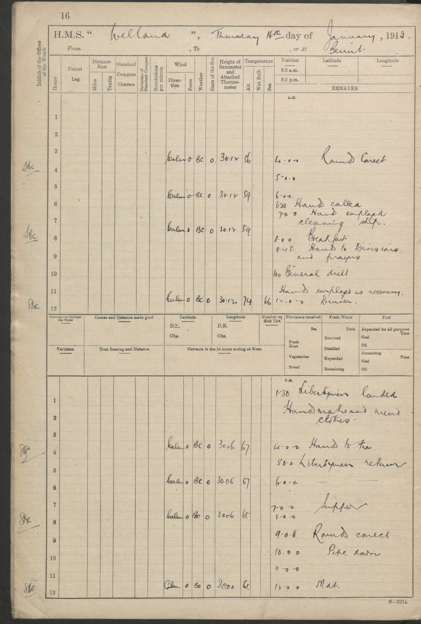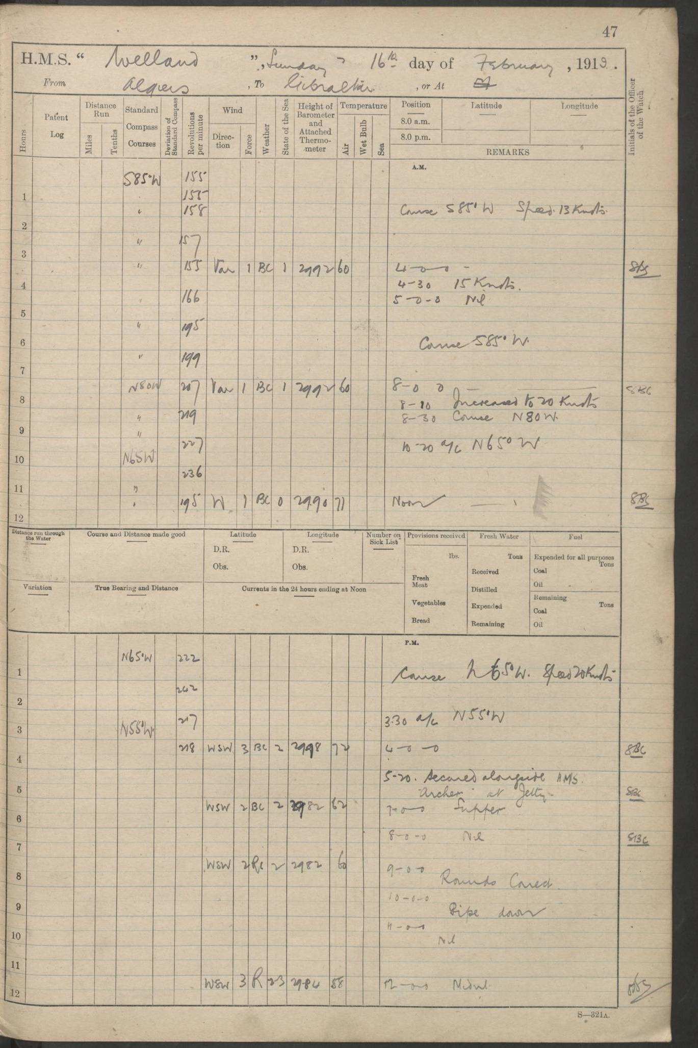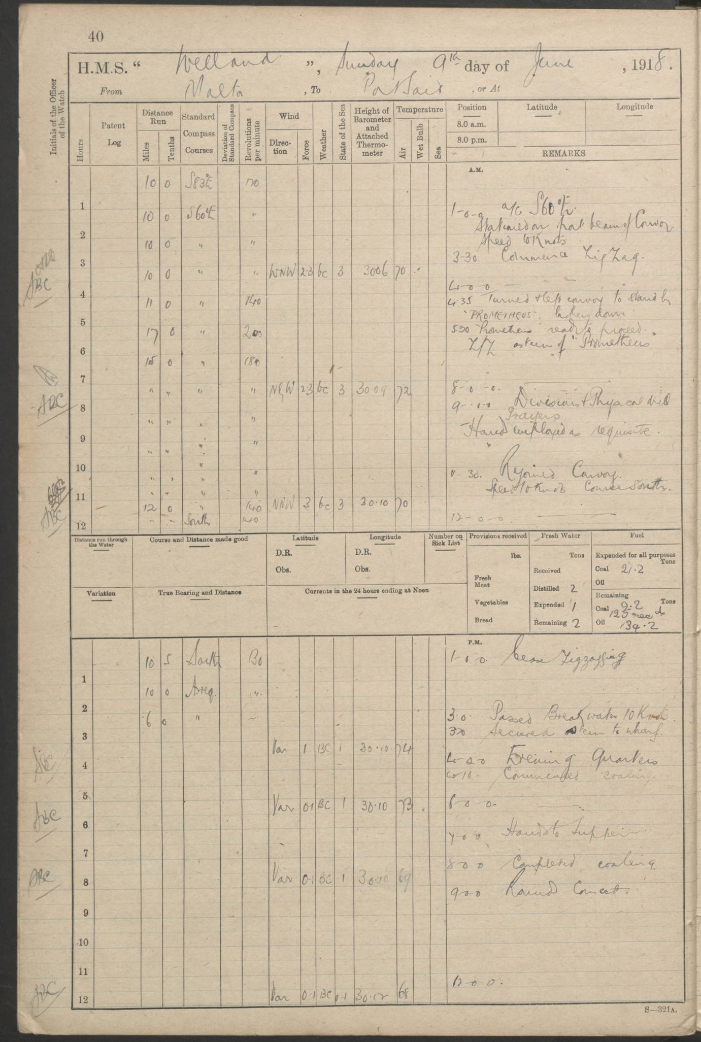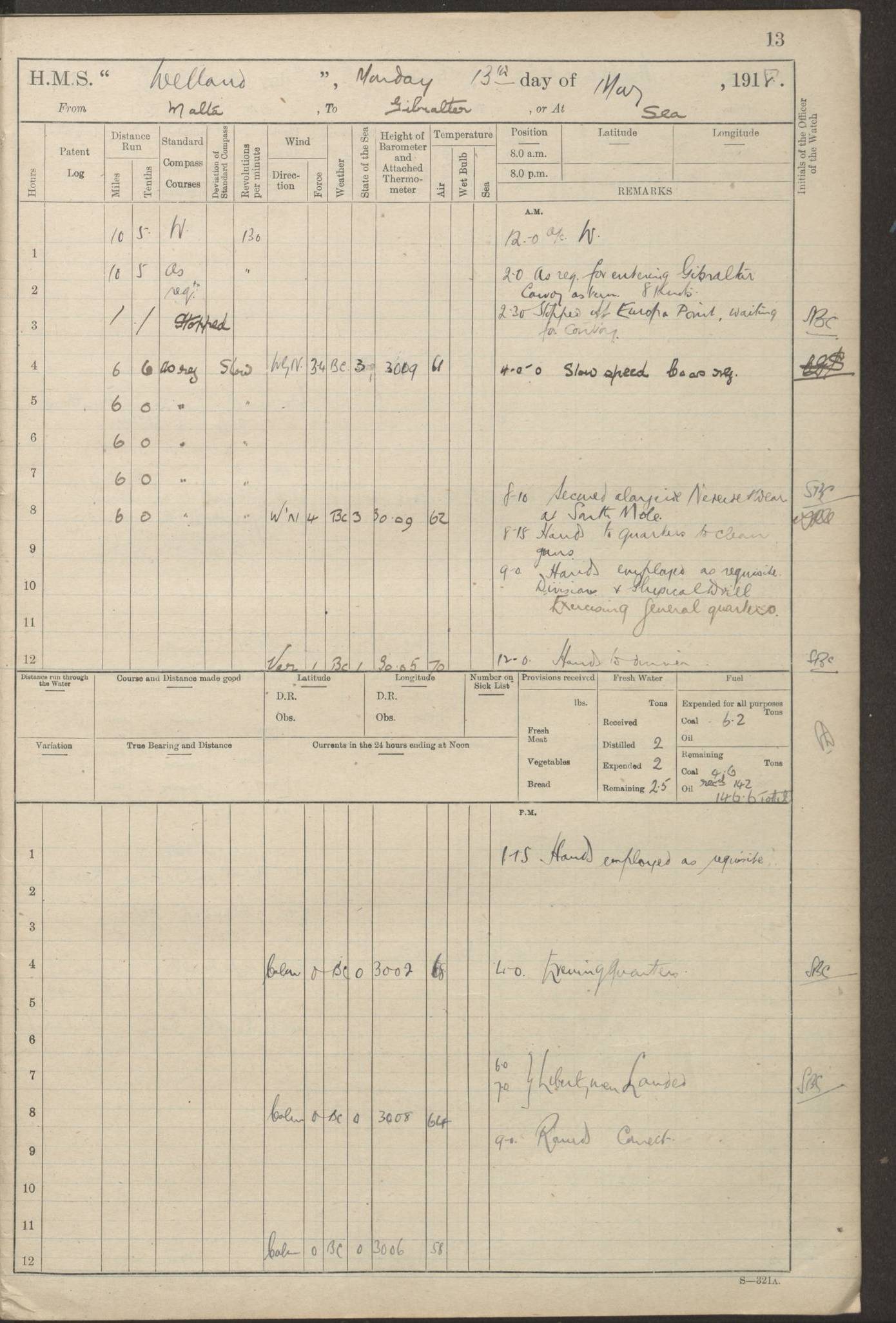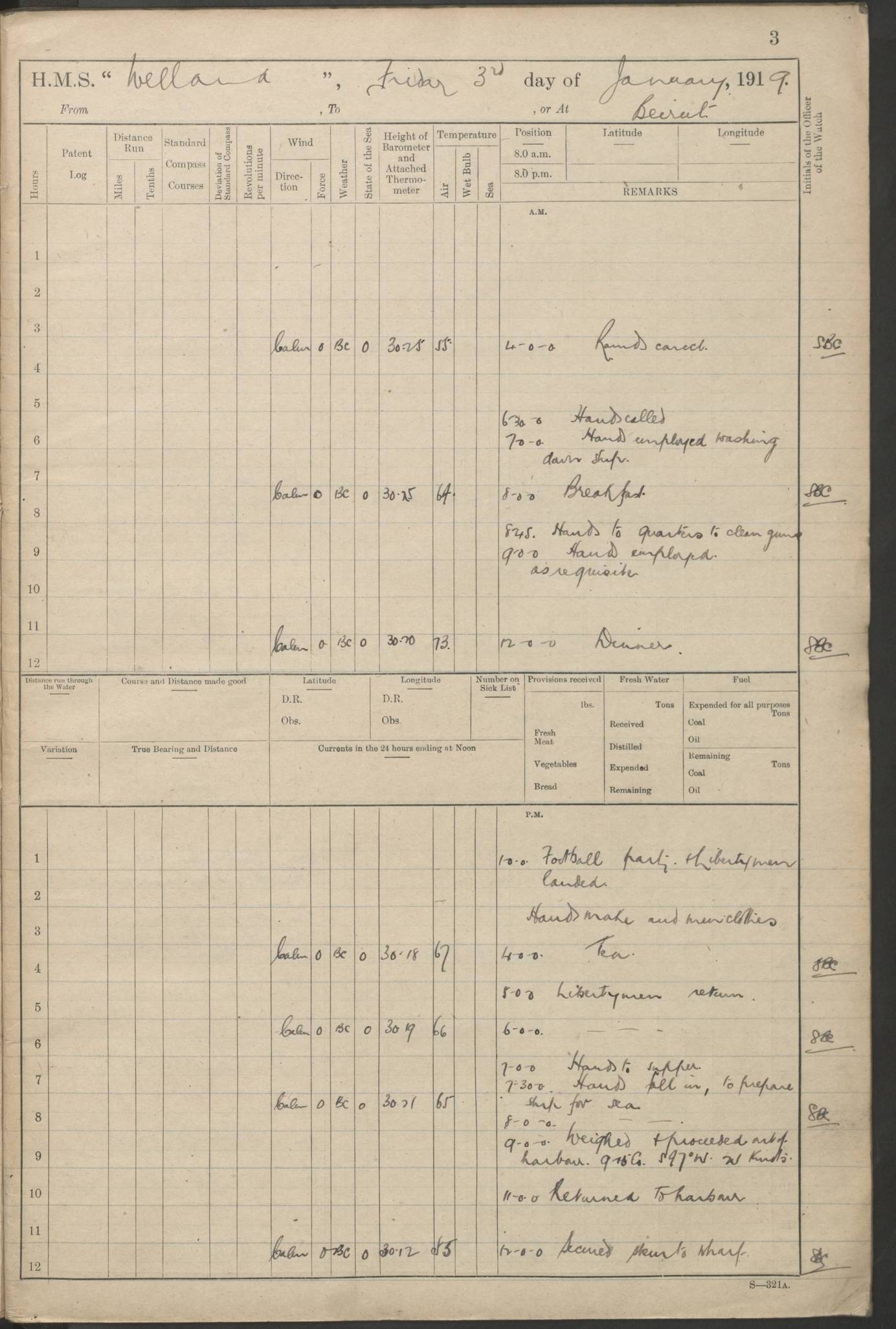 LOGS FOR JANUARY 1918 [Port Kalloni, Rhodes, Port Kalloni, Mudros, Salonika and Port Said] 4caf8ca1cadfd341970372d8: (http://oldweather.s3.amazonaws.com/ADM 53-68386/ADM 53-68386-001_0.jpg) 4caf8ca1cadfd341970372d9: (http://oldweather.s3.amazonaws.com/ADM 53-68386/ADM 53-68386-001_1.jpg) Blue front cover of Logbook for January/February 1918. 4caf8ca1cadfd341970372da: (http://oldweather.s3.amazonaws.com/ADM 53-68386/ADM 53-68386-002_0.jpg) “This is to certify that this is a true copy of the original log of HMS Welland from 1st January 1918 to 28th February 1918, signed FE Ayers, Commanding Officer.” 4caf8ca1cadfd341970372db: (http://oldweather.s3.amazonaws.com/ADM 53-68386/ADM 53-68386-002_1.jpg) Blank except for signature of Eng. Cdr (D) ER Kestell 28th March 1918. 4caf8ca1cadfd341970372dc: (http://oldweather.s3.amazonaws.com/ADM 53-68386/ADM 53-68386-003_0.jpg) Blank. 4caf8ca1cadfd341970372dd: (http://oldweather.s3.amazonaws.com/ADM 53-68386/ADM 53-68386-003_1.jpg) 1 January 1918 Port Kalloni Lat 39.12, Long 26.13 7.45am: Clean ship. 9.00am: Divisions. Physical drill. 9.30am: Hands employed about boats. 1.30pm: Make and mend. 4.00pm: Evening quarters, 9.00pm: Rounds. Weather: Northerly winds, f 3 at times, early rain, clear later, temperatures in the 40ºs F. 4caf8ca1cadfd341970372de: (http://oldweather.s3.amazonaws.com/ADM 53-68386/ADM 53-68386-004_0.jpg) 2 January 1918 Port Kalloni to Rhodes Lat 37.0, Long 26.47 [approx] 1.00am: Weighed and proceeded. 3.50pm: Psara Lt sighted. 5.05am: Same abeam, a/c S. 9.15am: C Papas abeam, a/c S42E. Noon: Levitha abeam. 6.30pm: Anchored off Elmo’s tower, Rhodes [Rodos]. 4caf8ca1cadfd341970372df: (http://oldweather.s3.amazonaws.com/ADM 53-68386/ADM 53-68386-004_1.jpg) 3 January 1918 Rhodes Lat 36.45, Long 28.23 8.00am: Weighed and proceeded into Rodos harbour, moored to buoy, port anchor down. 4caf8ca1cadfd341970372e0: (http://oldweather.s3.amazonaws.com/ADM 53-68386/ADM 53-68386-005_0.jpg) 4 January 1918 Rhodes and at sea Lat 36.45, Long 28.23 6.00pm: Weighed and proceeded to sea, course N84W. 10.45pm: Kandeliusa abeam, a/c N35E. 4caf8ca1cadfd341970372e1: (http://oldweather.s3.amazonaws.com/ADM 53-68386/ADM 53-68386-005_1.jpg) 5 January 1918 At sea to Port Kalloni Lat 38.9, Long 26.05 [approx] 5.40am: C Papas abeam, a/c N. 10.00am: N end of Khios abeam, a/c N25E. 1.30pm: Secured alongside collier in Port Kalloni. Received 105 tons. 7.10pm: Cast off to anchor. 4caf8ca1cadfd341970372e2: (http://oldweather.s3.amazonaws.com/ADM 53-68386/ADM 53-68386-006_0.jpg) 6 January 1918 Port Kalloni Lat 39.12, Long 26.13 Sunday routine. 4caf8ca1cadfd341970372e3: (http://oldweather.s3.amazonaws.com/ADM 53-68386/ADM 53-68386-006_1.jpg) 7 January 1918 Port Kalloni Lat 39.12, Long 26.13 Clean ship, make and mend. 4caf8ca1cadfd341970372e4: (http://oldweather.s3.amazonaws.com/ADM 53-68386/ADM 53-68386-007_0.jpg) 8 January 1918 Port Kalloni Lat 39.12, Long 26.13 Hands employed as requisite. 4caf8ca1cadfd341970372e5: (http://oldweather.s3.amazonaws.com/ADM 53-68386/ADM 53-68386-007_1.jpg) 9 January 1918 Port Kalloni Lat 39.12, Long 26.13 Hands employed in mess decks. Make and mend. 4caf8ca1cadfd341970372e6: (http://oldweather.s3.amazonaws.com/ADM 53-68386/ADM 53-68386-008_0.jpg) 10 January 1918 Port Kalloni Lat 39.12, Long 26.13 Cleaning, refitting. 4caf8ca1cadfd341970372e7: (http://oldweather.s3.amazonaws.com/ADM 53-68386/ADM 53-68386-008_1.jpg) 11 January 1918 Port Kalloni Lat 39.0, Long 26.1 [approx] 11.00am: Weighed and proceeded, took harbour launch in tow. 1.00pm: Slipped launch and returned to harbour. 2.00pm: Anchored. 4caf8ca1cadfd341970372e8: (http://oldweather.s3.amazonaws.com/ADM 53-68386/ADM 53-68386-009_0.jpg) 12 January 1918 Port Kalloni Lat 39.12, Long 26.13 Saturday in harbour. Clean ship. Pipe down at noon. 4caf8ca1cadfd341970372e9: (http://oldweather.s3.amazonaws.com/ADM 53-68386/ADM 53-68386-009_1.jpg) 13 January 1918 Port Kalloni Lat 39.12, Long 26.13 Sunday routine. 4caf8ca1cadfd341970372ea: (http://oldweather.s3.amazonaws.com/ADM 53-68386/ADM 53-68386-010_0.jpg) 14 January 1918 Port Kalloni Lat 39.12, Long 26.13 9.00am: Working party away to relay buoys in channel. 4caf8ca1cadfd341970372eb: (http://oldweather.s3.amazonaws.com/ADM 53-68386/ADM 53-68386-010_1.jpg) 15 January 1918 Port Kalloni Lat 39.12, Long 26.13 Clean ship. Make and mend. 4caf8ca1cadfd341970372ec: (http://oldweather.s3.amazonaws.com/ADM 53-68386/ADM 53-68386-011_0.jpg) 16 January 1918 Port Kalloni Lat 39.12, Long 26.13 3.30pm: Weighed and towed to another billet. 3.45pm: HMS Forward took over SOE [possibly Senior Officer Eastern Med.]. 4caf8ca1cadfd341970372ed: (http://oldweather.s3.amazonaws.com/ADM 53-68386/ADM 53-68386-011_1.jpg) 17 January 1918 Port Kalloni Lat 39.12, Long 26.13 7.30pm: Weighed and proceeded up harbour, secured to collier, received 42 tons and cast off to anchor. Clean ship. 4caf8ca1cadfd341970372ee: (http://oldweather.s3.amazonaws.com/ADM 53-68386/ADM 53-68386-012_0.jpg) 18 January 1918 Port Kalloni Lat 39.12, Long 26.13 Hands employed as requisite. 4caf8ca1cadfd341970372ef: (http://oldweather.s3.amazonaws.com/ADM 53-68386/ADM 53-68386-012_1.jpg) 19 January 1918 Port Kalloni Lat 39.12, Long 26.13 Cleaning, refitting etc. 4caf8ca2cadfd341970372f0: (http://oldweather.s3.amazonaws.com/ADM 53-68386/ADM 53-68386-013_0.jpg) 20 January 1918 Mytilene patrol Lat 38.9, Long 26.6 [approx] 6.45am: Weighed and proceeded. 8.00am: Course SE. 10.15am: Stopped Greek steamer and ordered her into Mytilene harbour. Proceeded SE by E to patrol Mytilene channel. 3.45pm: A/c S40W. 6.30pm: Anchored, Kolokithia [Chios]. 11.00pm: Weighed and proceeded, course N26W. 4caf8ca2cadfd341970372f1: (http://oldweather.s3.amazonaws.com/ADM 53-68386/ADM 53-68386-013_1.jpg) 21 January 1918 At sea to Mudros and on patrol Lat 39.88, Long 25.25 2.37am: Sigri Lt abeam, 5 miles. 8.15am: Secured to collier, Port Mudros. 10.00am: Received 40 tons, cast off to anchor. 2.45pm: Weighed and proceeded. 3