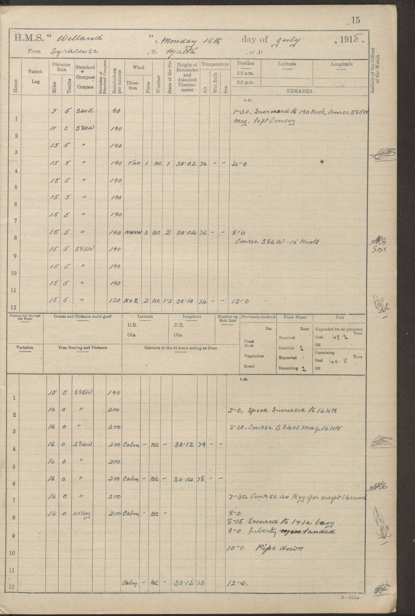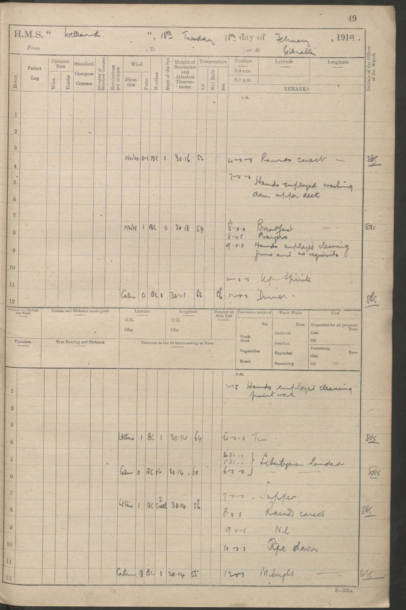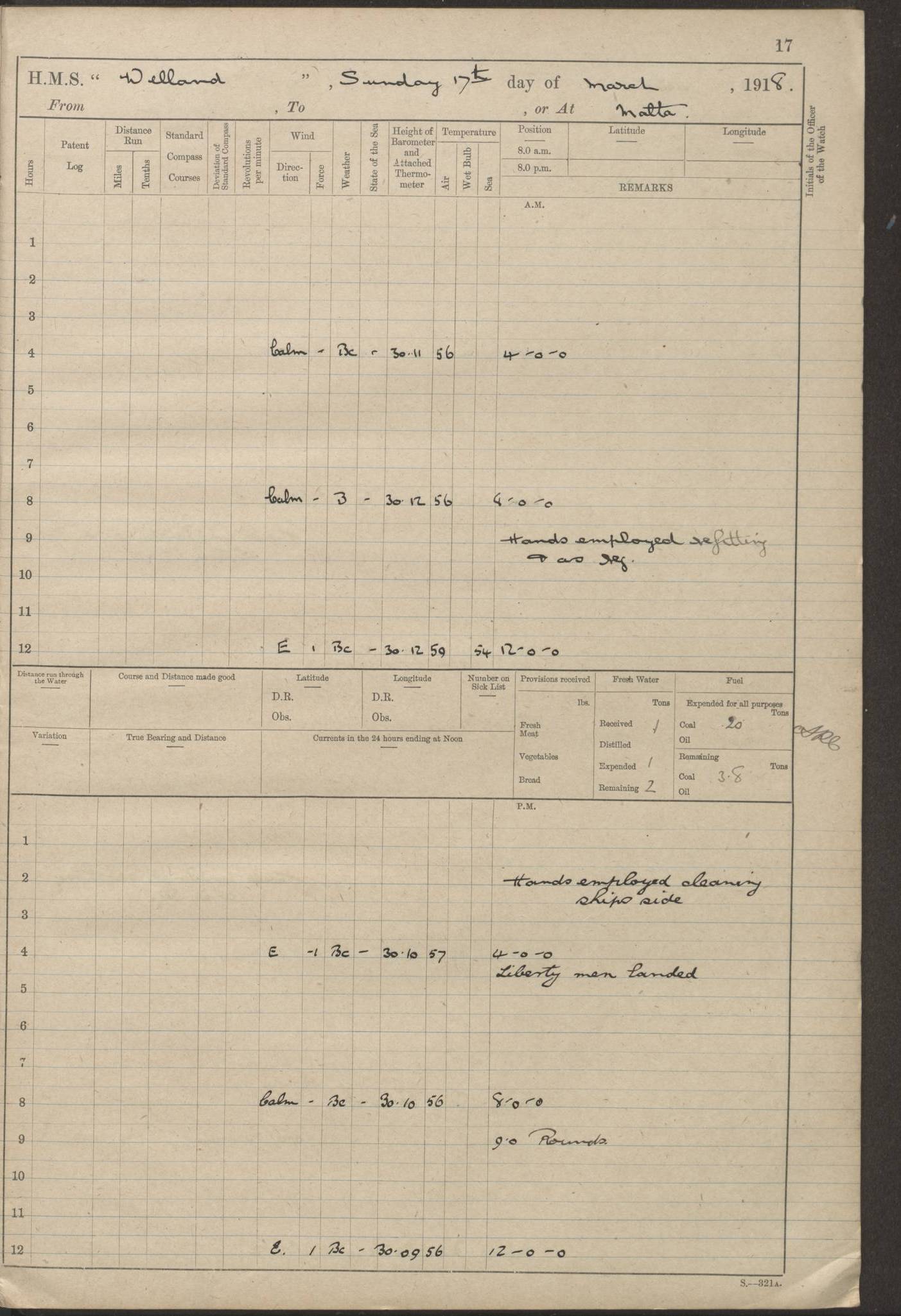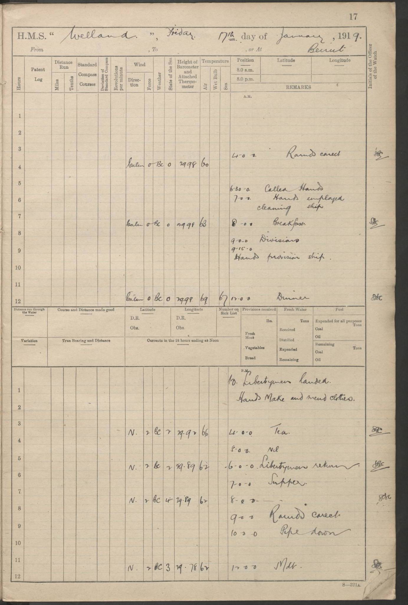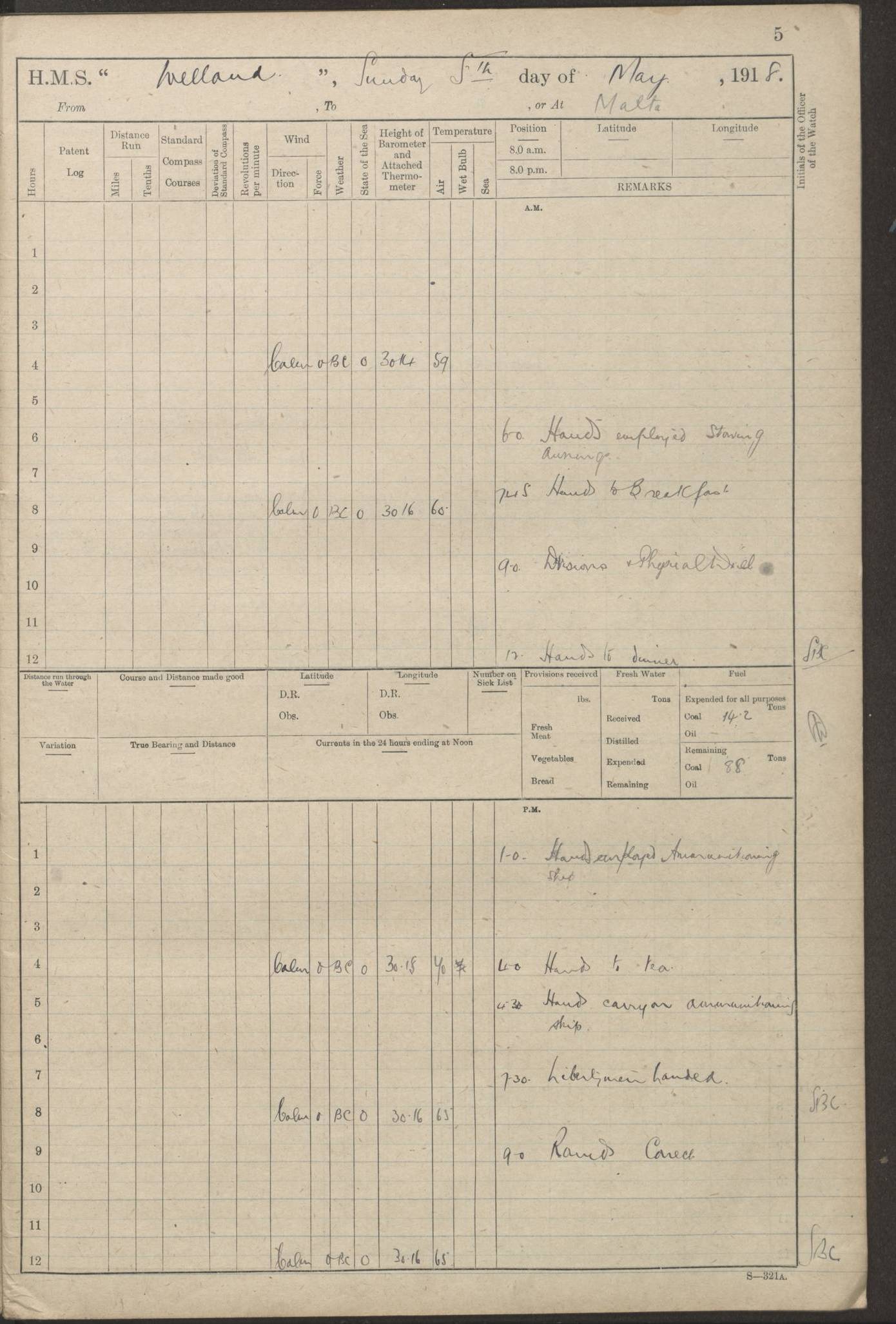LOGS FOR JANUARY 1918 [Port Kalloni, Rhodes, Port Kalloni, Mudros, Salonika and Port Said] 4caf8ca1cadfd341970372d8: (http://oldweather.s3.amazonaws.com/ADM 53-68386/ADM 53-68386-001_0.jpg) 4caf8ca1cadfd341970372d9: (http://oldweather.s3.amazonaws.com/ADM 53-68386/ADM 53-68386-001_1.jpg) Blue front cover of Logbook for January/February 1918. 4caf8ca1cadfd341970372da: (http://oldweather.s3.amazonaws.com/ADM 53-68386/ADM 53-68386-002_0.jpg) “This is to certify that this is a true copy of the original log of HMS Welland from 1st January 1918 to 28th February 1918, signed FE Ayers, Commanding Officer.” 4caf8ca1cadfd341970372db: (http://oldweather.s3.amazonaws.com/ADM 53-68386/ADM 53-68386-002_1.jpg) Blank except for signature of Eng. Cdr (D) ER Kestell 28th March 1918. 4caf8ca1cadfd341970372dc: (http://oldweather.s3.amazonaws.com/ADM 53-68386/ADM 53-68386-003_0.jpg) Blank. 4caf8ca1cadfd341970372dd: (http://oldweather.s3.amazonaws.com/ADM 53-68386/ADM 53-68386-003_1.jpg) 1 January 1918 Port Kalloni Lat 39.12, Long 26.13 7.45am: Clean ship. 9.00am: Divisions. Physical drill. 9.30am: Hands employed about boats. 1.30pm: Make and mend. 4.00pm: Evening quarters, 9.00pm: Rounds. Weather: Northerly winds, f 3 at times, early rain, clear later, temperatures in the 40ºs F. 4caf8ca1cadfd341970372de: (http://oldweather.s3.amazonaws.com/ADM 53-68386/ADM 53-68386-004_0.jpg) 2 January 1918 Port Kalloni to Rhodes Lat 37.0, Long 26.47 [approx] 1.00am: Weighed and proceeded. 3.50pm: Psara Lt sighted. 5.05am: Same abeam, a/c S. 9.15am: C Papas abeam, a/c S42E. Noon: Levitha abeam. 6.30pm: Anchored off Elmo’s tower, Rhodes [Rodos]. 4caf8ca1cadfd341970372df: (http://oldweather.s3.amazonaws.com/ADM 53-68386/ADM 53-68386-004_1.jpg) 3 January 1918 Rhodes Lat 36.45, Long 28.23 8.00am: Weighed and proceeded into Rodos harbour, moored to buoy, port anchor down. 4caf8ca1cadfd341970372e0: (http://oldweather.s3.amazonaws.com/ADM 53-68386/ADM 53-68386-005_0.jpg) 4 January 1918 Rhodes and at sea Lat 36.45, Long 28.23 6.00pm: Weighed and proceeded to sea, course N84W. 10.45pm: Kandeliusa abeam, a/c N35E. 4caf8ca1cadfd341970372e1: (http://oldweather.s3.amazonaws.com/ADM 53-68386/ADM 53-68386-005_1.jpg) 5 January 1918 At sea to Port Kalloni Lat 38.9, Long 26.05 [approx] 5.40am: C Papas abeam, a/c N. 10.00am: N end of Khios abeam, a/c N25E. 1.30pm: Secured alongside collier in Port Kalloni. Received 105 tons. 7.10pm: Cast off to anchor. 4caf8ca1cadfd341970372e2: (http://oldweather.s3.amazonaws.com/ADM 53-68386/ADM 53-68386-006_0.jpg) 6 January 1918 Port Kalloni Lat 39.12, Long 26.13 Sunday routine. 4caf8ca1cadfd341970372e3: (http://oldweather.s3.amazonaws.com/ADM 53-68386/ADM 53-68386-006_1.jpg) 7 January 1918 Port Kalloni Lat 39.12, Long 26.13 Clean ship, make and mend. 4caf8ca1cadfd341970372e4: (http://oldweather.s3.amazonaws.com/ADM 53-68386/ADM 53-68386-007_0.jpg) 8 January 1918 Port Kalloni Lat 39.12, Long 26.13 Hands employed as requisite. 4caf8ca1cadfd341970372e5: (http://oldweather.s3.amazonaws.com/ADM 53-68386/ADM 53-68386-007_1.jpg) 9 January 1918 Port Kalloni Lat 39.12, Long 26.13 Hands employed in mess decks. Make and mend. 4caf8ca1cadfd341970372e6: (http://oldweather.s3.amazonaws.com/ADM 53-68386/ADM 53-68386-008_0.jpg) 10 January 1918 Port Kalloni Lat 39.12, Long 26.13 Cleaning, refitting. 4caf8ca1cadfd341970372e7: (http://oldweather.s3.amazonaws.com/ADM 53-68386/ADM 53-68386-008_1.jpg) 11 January 1918 Port Kalloni Lat 39.0, Long 26.1 [approx] 11.00am: Weighed and proceeded, took harbour launch in tow. 1.00pm: Slipped launch and returned to harbour. 2.00pm: Anchored. 4caf8ca1cadfd341970372e8: (http://oldweather.s3.amazonaws.com/ADM 53-68386/ADM 53-68386-009_0.jpg) 12 January 1918 Port Kalloni Lat 39.12, Long 26.13 Saturday in harbour. Clean ship. Pipe down at noon. 4caf8ca1cadfd341970372e9: (http://oldweather.s3.amazonaws.com/ADM 53-68386/ADM 53-68386-009_1.jpg) 13 January 1918 Port Kalloni Lat 39.12, Long 26.13 Sunday routine. 4caf8ca1cadfd341970372ea: (http://oldweather.s3.amazonaws.com/ADM 53-68386/ADM 53-68386-010_0.jpg) 14 January 1918 Port Kalloni Lat 39.12, Long 26.13 9.00am: Working party away to relay buoys in channel. 4caf8ca1cadfd341970372eb: (http://oldweather.s3.amazonaws.com/ADM 53-68386/ADM 53-68386-010_1.jpg) 15 January 1918 Port Kalloni Lat 39.12, Long 26.13 Clean ship. Make and mend. 4caf8ca1cadfd341970372ec: (http://oldweather.s3.amazonaws.com/ADM 53-68386/ADM 53-68386-011_0.jpg) 16 January 1918 Port Kalloni Lat 39.12, Long 26.13 3.30pm: Weighed and towed to another billet. 3.45pm: HMS Forward took over SOE [possibly Senior Officer Eastern Med.]. 4caf8ca1cadfd341970372ed: (http://oldweather.s3.amazonaws.com/ADM 53-68386/ADM 53-68386-011_1.jpg) 17 January 1918 Port Kalloni Lat 39.12, Long 26.13 7.30pm: Weighed and proceeded up harbour, secured to collier, received 42 tons and cast off to anchor. Clean ship. 4caf8ca1cadfd341970372ee: (http://oldweather.s3.amazonaws.com/ADM 53-68386/ADM 53-68386-012_0.jpg) 18 January 1918 Port Kalloni Lat 39.12, Long 26.13 Hands employed as requisite. 4caf8ca1cadfd341970372ef: (http://oldweather.s3.amazonaws.com/ADM 53-68386/ADM 53-68386-012_1.jpg) 19 January 1918 Port Kalloni Lat 39.12, Long 26.13 Cleaning, refitting etc. 4caf8ca2cadfd341970372f0: (http://oldweather.s3.amazonaws.com/ADM 53-68386/ADM 53-68386-013_0.jpg) 20 January 1918 Mytilene patrol Lat 38.9, Long 26.6 [approx] 6.45am: Weighed and proceeded. 8.00am: Course SE. 10.15am: Stopped Greek steamer and ordered her into Mytilene harbour. Proceeded SE by E to patrol Mytilene channel. 3.45pm: A/c S40W. 6.30pm: Anchored, Kolokithia [Chios]. 11.00pm: Weighed and proceeded, course N26W. 4caf8ca2cadfd341970372f1: (http://oldweather.s3.amazonaws.com/ADM 53-68386/ADM 53-68386-013_1.jpg) 21 January 1918 At sea to Mudros and on patrol Lat 39.88, Long 25.25 2.37am: Sigri Lt abeam, 5 miles. 8.15am: Secured to collier, Port Mudros. 10.00am: Received 40 tons, cast off to anchor. 2.45pm: Weighed and proceeded. 3