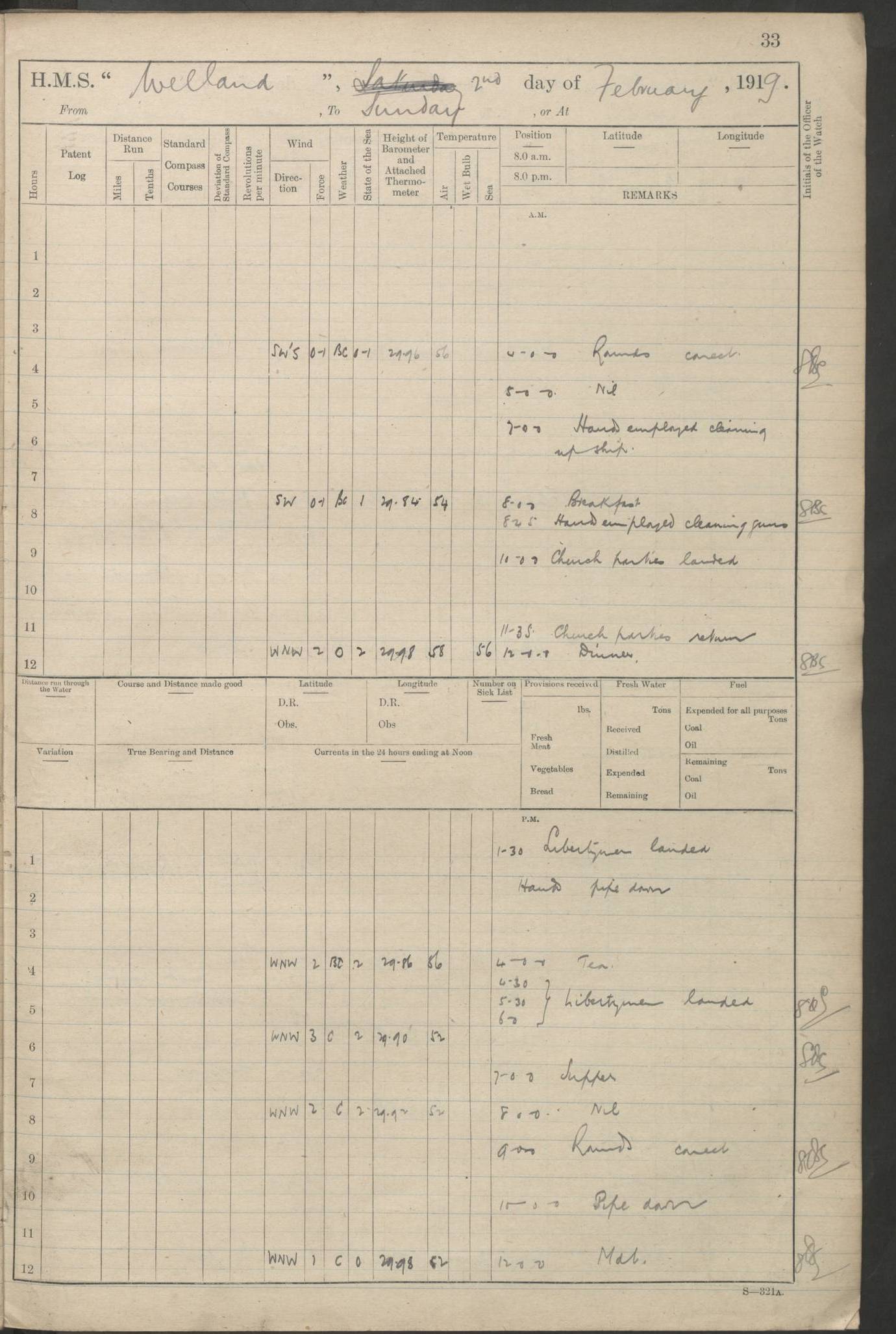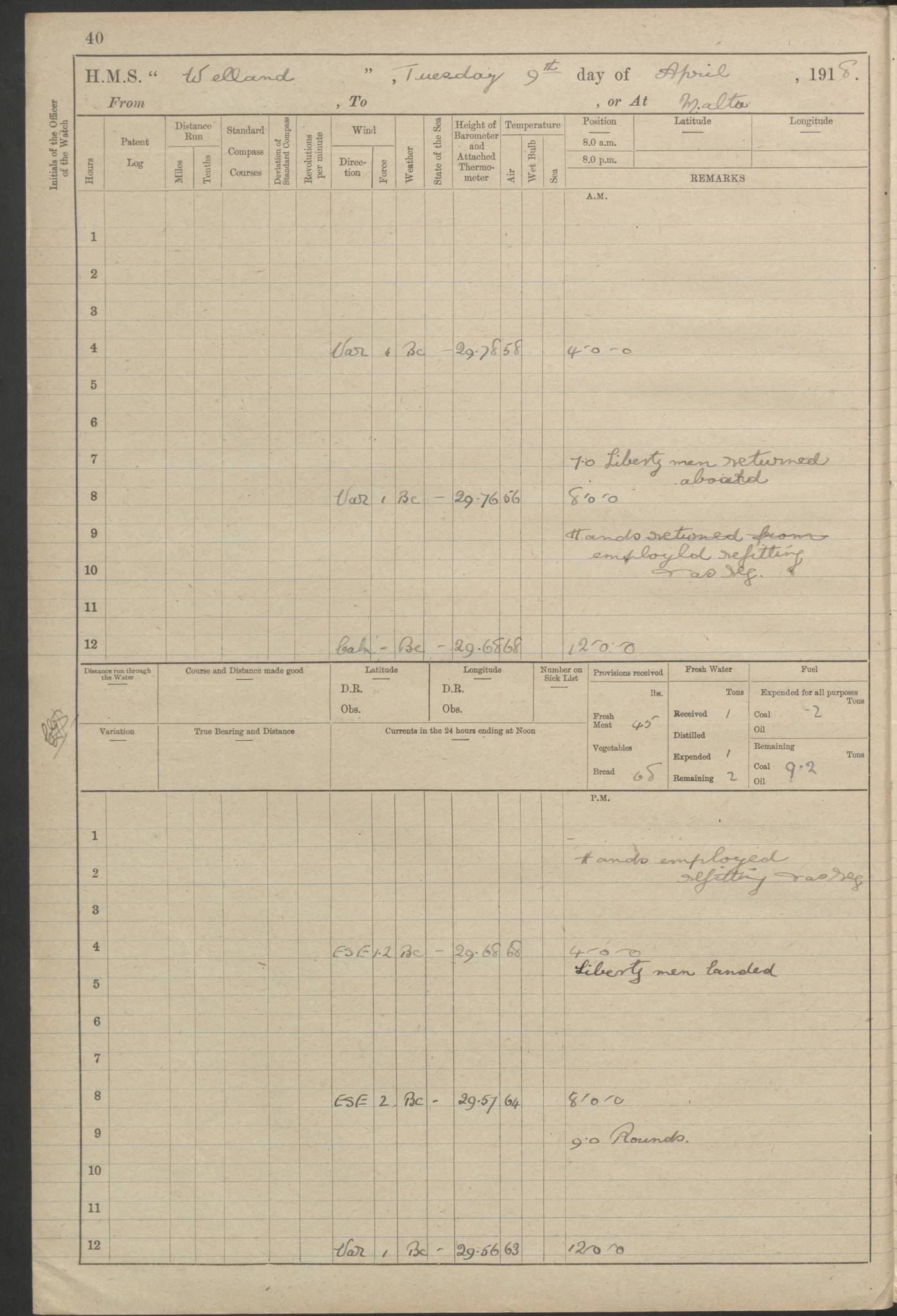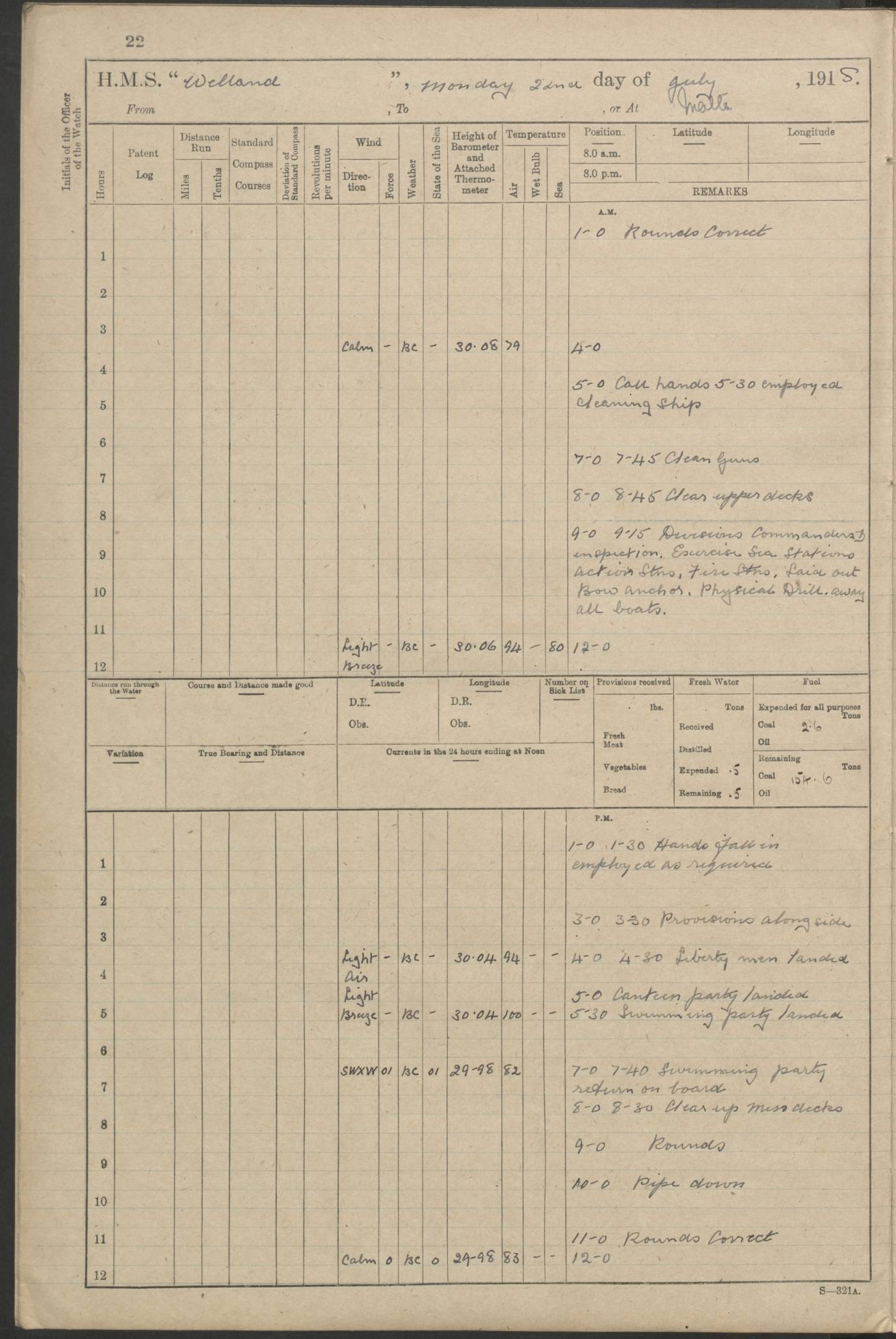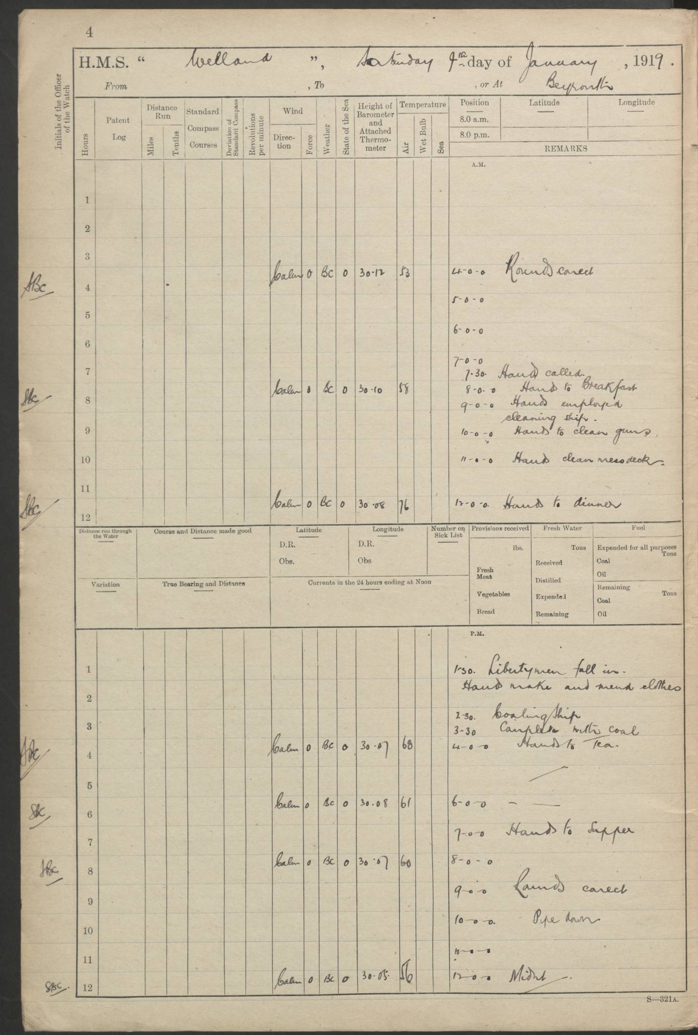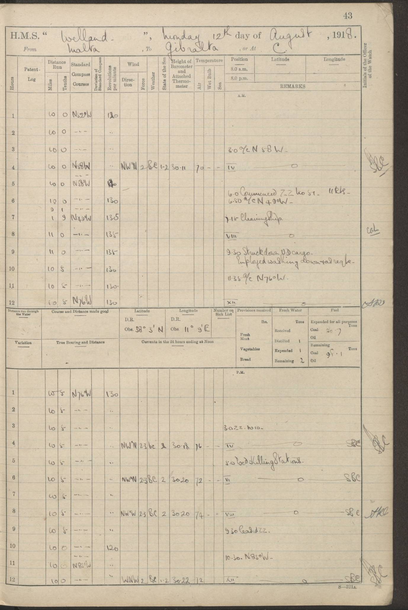 LOGS FOR JANUARY 1918 [Port Kalloni, Rhodes, Port Kalloni, Mudros, Salonika and Port Said] 4caf8ca1cadfd341970372d8: (http://oldweather.s3.amazonaws.com/ADM 53-68386/ADM 53-68386-001_0.jpg) 4caf8ca1cadfd341970372d9: (http://oldweather.s3.amazonaws.com/ADM 53-68386/ADM 53-68386-001_1.jpg) Blue front cover of Logbook for January/February 1918. 4caf8ca1cadfd341970372da: (http://oldweather.s3.amazonaws.com/ADM 53-68386/ADM 53-68386-002_0.jpg) “This is to certify that this is a true copy of the original log of HMS Welland from 1st January 1918 to 28th February 1918, signed FE Ayers, Commanding Officer.” 4caf8ca1cadfd341970372db: (http://oldweather.s3.amazonaws.com/ADM 53-68386/ADM 53-68386-002_1.jpg) Blank except for signature of Eng. Cdr (D) ER Kestell 28th March 1918. 4caf8ca1cadfd341970372dc: (http://oldweather.s3.amazonaws.com/ADM 53-68386/ADM 53-68386-003_0.jpg) Blank. 4caf8ca1cadfd341970372dd: (http://oldweather.s3.amazonaws.com/ADM 53-68386/ADM 53-68386-003_1.jpg) 1 January 1918 Port Kalloni Lat 39.12, Long 26.13 7.45am: Clean ship. 9.00am: Divisions. Physical drill. 9.30am: Hands employed about boats. 1.30pm: Make and mend. 4.00pm: Evening quarters, 9.00pm: Rounds. Weather: Northerly winds, f 3 at times, early rain, clear later, temperatures in the 40ºs F. 4caf8ca1cadfd341970372de: (http://oldweather.s3.amazonaws.com/ADM 53-68386/ADM 53-68386-004_0.jpg) 2 January 1918 Port Kalloni to Rhodes Lat 37.0, Long 26.47 [approx] 1.00am: Weighed and proceeded. 3.50pm: Psara Lt sighted. 5.05am: Same abeam, a/c S. 9.15am: C Papas abeam, a/c S42E. Noon: Levitha abeam. 6.30pm: Anchored off Elmo’s tower, Rhodes [Rodos]. 4caf8ca1cadfd341970372df: (http://oldweather.s3.amazonaws.com/ADM 53-68386/ADM 53-68386-004_1.jpg) 3 January 1918 Rhodes Lat 36.45, Long 28.23 8.00am: Weighed and proceeded into Rodos harbour, moored to buoy, port anchor down. 4caf8ca1cadfd341970372e0: (http://oldweather.s3.amazonaws.com/ADM 53-68386/ADM 53-68386-005_0.jpg) 4 January 1918 Rhodes and at sea Lat 36.45, Long 28.23 6.00pm: Weighed and proceeded to sea, course N84W. 10.45pm: Kandeliusa abeam, a/c N35E. 4caf8ca1cadfd341970372e1: (http://oldweather.s3.amazonaws.com/ADM 53-68386/ADM 53-68386-005_1.jpg) 5 January 1918 At sea to Port Kalloni Lat 38.9, Long 26.05 [approx] 5.40am: C Papas abeam, a/c N. 10.00am: N end of Khios abeam, a/c N25E. 1.30pm: Secured alongside collier in Port Kalloni. Received 105 tons. 7.10pm: Cast off to anchor. 4caf8ca1cadfd341970372e2: (http://oldweather.s3.amazonaws.com/ADM 53-68386/ADM 53-68386-006_0.jpg) 6 January 1918 Port Kalloni Lat 39.12, Long 26.13 Sunday routine. 4caf8ca1cadfd341970372e3: (http://oldweather.s3.amazonaws.com/ADM 53-68386/ADM 53-68386-006_1.jpg) 7 January 1918 Port Kalloni Lat 39.12, Long 26.13 Clean ship, make and mend. 4caf8ca1cadfd341970372e4: (http://oldweather.s3.amazonaws.com/ADM 53-68386/ADM 53-68386-007_0.jpg) 8 January 1918 Port Kalloni Lat 39.12, Long 26.13 Hands employed as requisite. 4caf8ca1cadfd341970372e5: (http://oldweather.s3.amazonaws.com/ADM 53-68386/ADM 53-68386-007_1.jpg) 9 January 1918 Port Kalloni Lat 39.12, Long 26.13 Hands employed in mess decks. Make and mend. 4caf8ca1cadfd341970372e6: (http://oldweather.s3.amazonaws.com/ADM 53-68386/ADM 53-68386-008_0.jpg) 10 January 1918 Port Kalloni Lat 39.12, Long 26.13 Cleaning, refitting. 4caf8ca1cadfd341970372e7: (http://oldweather.s3.amazonaws.com/ADM 53-68386/ADM 53-68386-008_1.jpg) 11 January 1918 Port Kalloni Lat 39.0, Long 26.1 [approx] 11.00am: Weighed and proceeded, took harbour launch in tow. 1.00pm: Slipped launch and returned to harbour. 2.00pm: Anchored. 4caf8ca1cadfd341970372e8: (http://oldweather.s3.amazonaws.com/ADM 53-68386/ADM 53-68386-009_0.jpg) 12 January 1918 Port Kalloni Lat 39.12, Long 26.13 Saturday in harbour. Clean ship. Pipe down at noon. 4caf8ca1cadfd341970372e9: (http://oldweather.s3.amazonaws.com/ADM 53-68386/ADM 53-68386-009_1.jpg) 13 January 1918 Port Kalloni Lat 39.12, Long 26.13 Sunday routine. 4caf8ca1cadfd341970372ea: (http://oldweather.s3.amazonaws.com/ADM 53-68386/ADM 53-68386-010_0.jpg) 14 January 1918 Port Kalloni Lat 39.12, Long 26.13 9.00am: Working party away to relay buoys in channel. 4caf8ca1cadfd341970372eb: (http://oldweather.s3.amazonaws.com/ADM 53-68386/ADM 53-68386-010_1.jpg) 15 January 1918 Port Kalloni Lat 39.12, Long 26.13 Clean ship. Make and mend. 4caf8ca1cadfd341970372ec: (http://oldweather.s3.amazonaws.com/ADM 53-68386/ADM 53-68386-011_0.jpg) 16 January 1918 Port Kalloni Lat 39.12, Long 26.13 3.30pm: Weighed and towed to another billet. 3.45pm: HMS Forward took over SOE [possibly Senior Officer Eastern Med.]. 4caf8ca1cadfd341970372ed: (http://oldweather.s3.amazonaws.com/ADM 53-68386/ADM 53-68386-011_1.jpg) 17 January 1918 Port Kalloni Lat 39.12, Long 26.13 7.30pm: Weighed and proceeded up harbour, secured to collier, received 42 tons and cast off to anchor. Clean ship. 4caf8ca1cadfd341970372ee: (http://oldweather.s3.amazonaws.com/ADM 53-68386/ADM 53-68386-012_0.jpg) 18 January 1918 Port Kalloni Lat 39.12, Long 26.13 Hands employed as requisite. 4caf8ca1cadfd341970372ef: (http://oldweather.s3.amazonaws.com/ADM 53-68386/ADM 53-68386-012_1.jpg) 19 January 1918 Port Kalloni Lat 39.12, Long 26.13 Cleaning, refitting etc. 4caf8ca2cadfd341970372f0: (http://oldweather.s3.amazonaws.com/ADM 53-68386/ADM 53-68386-013_0.jpg) 20 January 1918 Mytilene patrol Lat 38.9, Long 26.6 [approx] 6.45am: Weighed and proceeded. 8.00am: Course SE. 10.15am: Stopped Greek steamer and ordered her into Mytilene harbour. Proceeded SE by E to patrol Mytilene channel. 3.45pm: A/c S40W. 6.30pm: Anchored, Kolokithia [Chios]. 11.00pm: Weighed and proceeded, course N26W. 4caf8ca2cadfd341970372f1: (http://oldweather.s3.amazonaws.com/ADM 53-68386/ADM 53-68386-013_1.jpg) 21 January 1918 At sea to Mudros and on patrol Lat 39.88, Long 25.25 2.37am: Sigri Lt abeam, 5 miles. 8.15am: Secured to collier, Port Mudros. 10.00am: Received 40 tons, cast off to anchor. 2.45pm: Weighed and proceeded. 3