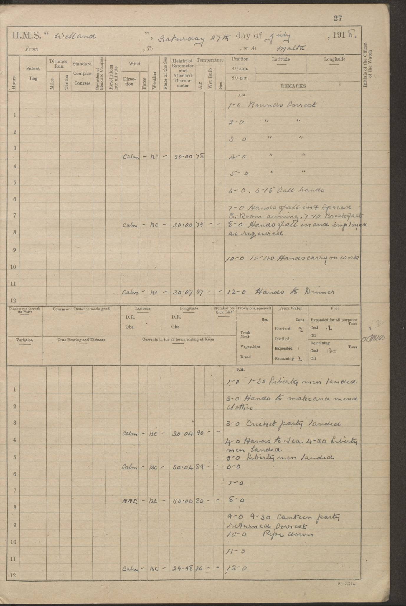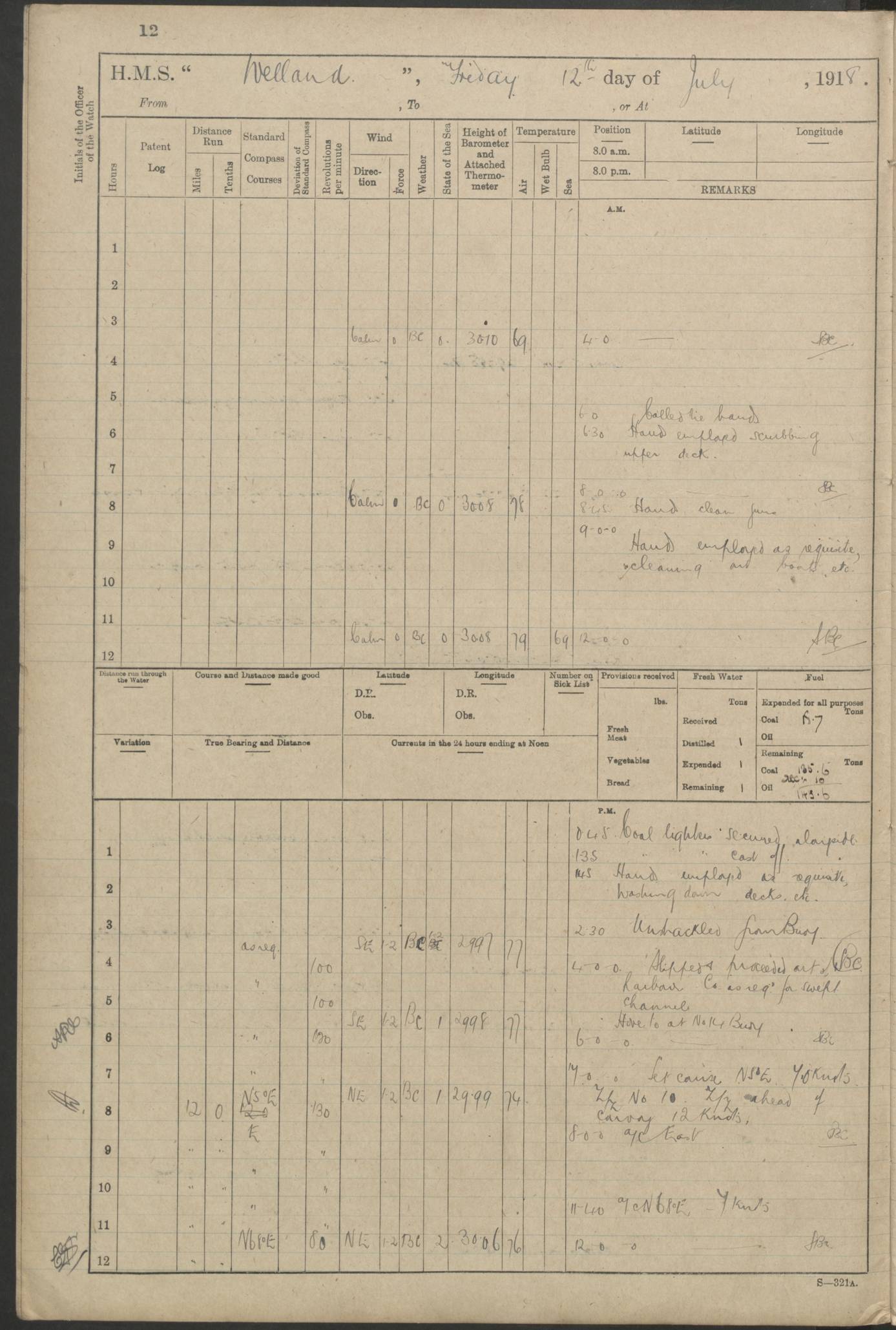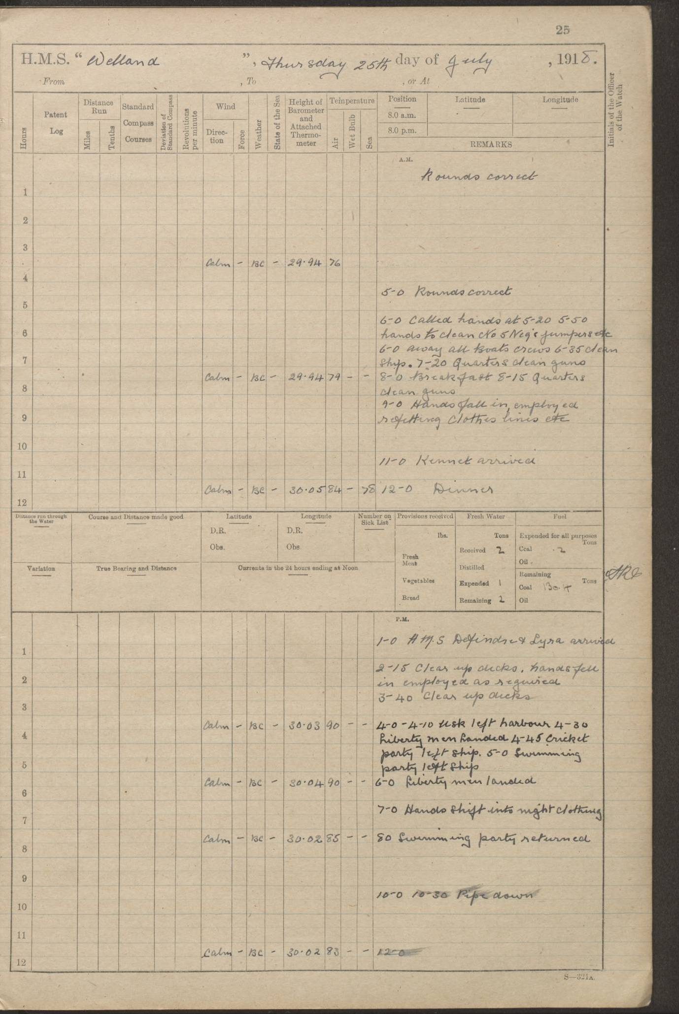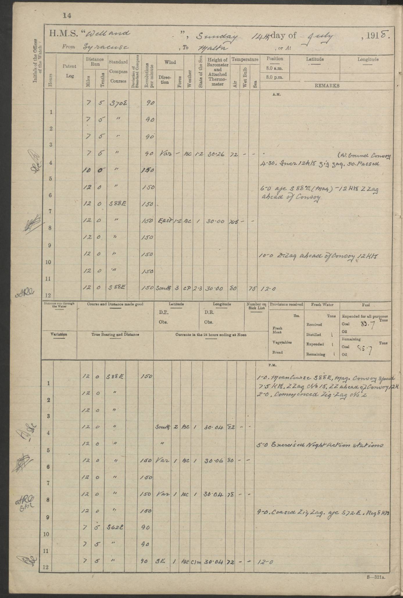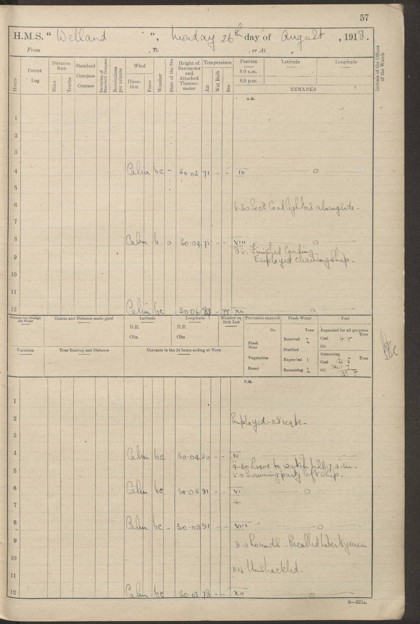LOGS FOR JANUARY 1918 [Port Kalloni, Rhodes, Port Kalloni, Mudros, Salonika and Port Said] 4caf8ca1cadfd341970372d8: (http://oldweather.s3.amazonaws.com/ADM 53-68386/ADM 53-68386-001_0.jpg) 4caf8ca1cadfd341970372d9: (http://oldweather.s3.amazonaws.com/ADM 53-68386/ADM 53-68386-001_1.jpg) Blue front cover of Logbook for January/February 1918. 4caf8ca1cadfd341970372da: (http://oldweather.s3.amazonaws.com/ADM 53-68386/ADM 53-68386-002_0.jpg) “This is to certify that this is a true copy of the original log of HMS Welland from 1st January 1918 to 28th February 1918, signed FE Ayers, Commanding Officer.” 4caf8ca1cadfd341970372db: (http://oldweather.s3.amazonaws.com/ADM 53-68386/ADM 53-68386-002_1.jpg) Blank except for signature of Eng. Cdr (D) ER Kestell 28th March 1918. 4caf8ca1cadfd341970372dc: (http://oldweather.s3.amazonaws.com/ADM 53-68386/ADM 53-68386-003_0.jpg) Blank. 4caf8ca1cadfd341970372dd: (http://oldweather.s3.amazonaws.com/ADM 53-68386/ADM 53-68386-003_1.jpg) 1 January 1918 Port Kalloni Lat 39.12, Long 26.13 7.45am: Clean ship. 9.00am: Divisions. Physical drill. 9.30am: Hands employed about boats. 1.30pm: Make and mend. 4.00pm: Evening quarters, 9.00pm: Rounds. Weather: Northerly winds, f 3 at times, early rain, clear later, temperatures in the 40ºs F. 4caf8ca1cadfd341970372de: (http://oldweather.s3.amazonaws.com/ADM 53-68386/ADM 53-68386-004_0.jpg) 2 January 1918 Port Kalloni to Rhodes Lat 37.0, Long 26.47 [approx] 1.00am: Weighed and proceeded. 3.50pm: Psara Lt sighted. 5.05am: Same abeam, a/c S. 9.15am: C Papas abeam, a/c S42E. Noon: Levitha abeam. 6.30pm: Anchored off Elmo’s tower, Rhodes [Rodos]. 4caf8ca1cadfd341970372df: (http://oldweather.s3.amazonaws.com/ADM 53-68386/ADM 53-68386-004_1.jpg) 3 January 1918 Rhodes Lat 36.45, Long 28.23 8.00am: Weighed and proceeded into Rodos harbour, moored to buoy, port anchor down. 4caf8ca1cadfd341970372e0: (http://oldweather.s3.amazonaws.com/ADM 53-68386/ADM 53-68386-005_0.jpg) 4 January 1918 Rhodes and at sea Lat 36.45, Long 28.23 6.00pm: Weighed and proceeded to sea, course N84W. 10.45pm: Kandeliusa abeam, a/c N35E. 4caf8ca1cadfd341970372e1: (http://oldweather.s3.amazonaws.com/ADM 53-68386/ADM 53-68386-005_1.jpg) 5 January 1918 At sea to Port Kalloni Lat 38.9, Long 26.05 [approx] 5.40am: C Papas abeam, a/c N. 10.00am: N end of Khios abeam, a/c N25E. 1.30pm: Secured alongside collier in Port Kalloni. Received 105 tons. 7.10pm: Cast off to anchor. 4caf8ca1cadfd341970372e2: (http://oldweather.s3.amazonaws.com/ADM 53-68386/ADM 53-68386-006_0.jpg) 6 January 1918 Port Kalloni Lat 39.12, Long 26.13 Sunday routine. 4caf8ca1cadfd341970372e3: (http://oldweather.s3.amazonaws.com/ADM 53-68386/ADM 53-68386-006_1.jpg) 7 January 1918 Port Kalloni Lat 39.12, Long 26.13 Clean ship, make and mend. 4caf8ca1cadfd341970372e4: (http://oldweather.s3.amazonaws.com/ADM 53-68386/ADM 53-68386-007_0.jpg) 8 January 1918 Port Kalloni Lat 39.12, Long 26.13 Hands employed as requisite. 4caf8ca1cadfd341970372e5: (http://oldweather.s3.amazonaws.com/ADM 53-68386/ADM 53-68386-007_1.jpg) 9 January 1918 Port Kalloni Lat 39.12, Long 26.13 Hands employed in mess decks. Make and mend. 4caf8ca1cadfd341970372e6: (http://oldweather.s3.amazonaws.com/ADM 53-68386/ADM 53-68386-008_0.jpg) 10 January 1918 Port Kalloni Lat 39.12, Long 26.13 Cleaning, refitting. 4caf8ca1cadfd341970372e7: (http://oldweather.s3.amazonaws.com/ADM 53-68386/ADM 53-68386-008_1.jpg) 11 January 1918 Port Kalloni Lat 39.0, Long 26.1 [approx] 11.00am: Weighed and proceeded, took harbour launch in tow. 1.00pm: Slipped launch and returned to harbour. 2.00pm: Anchored. 4caf8ca1cadfd341970372e8: (http://oldweather.s3.amazonaws.com/ADM 53-68386/ADM 53-68386-009_0.jpg) 12 January 1918 Port Kalloni Lat 39.12, Long 26.13 Saturday in harbour. Clean ship. Pipe down at noon. 4caf8ca1cadfd341970372e9: (http://oldweather.s3.amazonaws.com/ADM 53-68386/ADM 53-68386-009_1.jpg) 13 January 1918 Port Kalloni Lat 39.12, Long 26.13 Sunday routine. 4caf8ca1cadfd341970372ea: (http://oldweather.s3.amazonaws.com/ADM 53-68386/ADM 53-68386-010_0.jpg) 14 January 1918 Port Kalloni Lat 39.12, Long 26.13 9.00am: Working party away to relay buoys in channel. 4caf8ca1cadfd341970372eb: (http://oldweather.s3.amazonaws.com/ADM 53-68386/ADM 53-68386-010_1.jpg) 15 January 1918 Port Kalloni Lat 39.12, Long 26.13 Clean ship. Make and mend. 4caf8ca1cadfd341970372ec: (http://oldweather.s3.amazonaws.com/ADM 53-68386/ADM 53-68386-011_0.jpg) 16 January 1918 Port Kalloni Lat 39.12, Long 26.13 3.30pm: Weighed and towed to another billet. 3.45pm: HMS Forward took over SOE [possibly Senior Officer Eastern Med.]. 4caf8ca1cadfd341970372ed: (http://oldweather.s3.amazonaws.com/ADM 53-68386/ADM 53-68386-011_1.jpg) 17 January 1918 Port Kalloni Lat 39.12, Long 26.13 7.30pm: Weighed and proceeded up harbour, secured to collier, received 42 tons and cast off to anchor. Clean ship. 4caf8ca1cadfd341970372ee: (http://oldweather.s3.amazonaws.com/ADM 53-68386/ADM 53-68386-012_0.jpg) 18 January 1918 Port Kalloni Lat 39.12, Long 26.13 Hands employed as requisite. 4caf8ca1cadfd341970372ef: (http://oldweather.s3.amazonaws.com/ADM 53-68386/ADM 53-68386-012_1.jpg) 19 January 1918 Port Kalloni Lat 39.12, Long 26.13 Cleaning, refitting etc. 4caf8ca2cadfd341970372f0: (http://oldweather.s3.amazonaws.com/ADM 53-68386/ADM 53-68386-013_0.jpg) 20 January 1918 Mytilene patrol Lat 38.9, Long 26.6 [approx] 6.45am: Weighed and proceeded. 8.00am: Course SE. 10.15am: Stopped Greek steamer and ordered her into Mytilene harbour. Proceeded SE by E to patrol Mytilene channel. 3.45pm: A/c S40W. 6.30pm: Anchored, Kolokithia [Chios]. 11.00pm: Weighed and proceeded, course N26W. 4caf8ca2cadfd341970372f1: (http://oldweather.s3.amazonaws.com/ADM 53-68386/ADM 53-68386-013_1.jpg) 21 January 1918 At sea to Mudros and on patrol Lat 39.88, Long 25.25 2.37am: Sigri Lt abeam, 5 miles. 8.15am: Secured to collier, Port Mudros. 10.00am: Received 40 tons, cast off to anchor. 2.45pm: Weighed and proceeded. 3