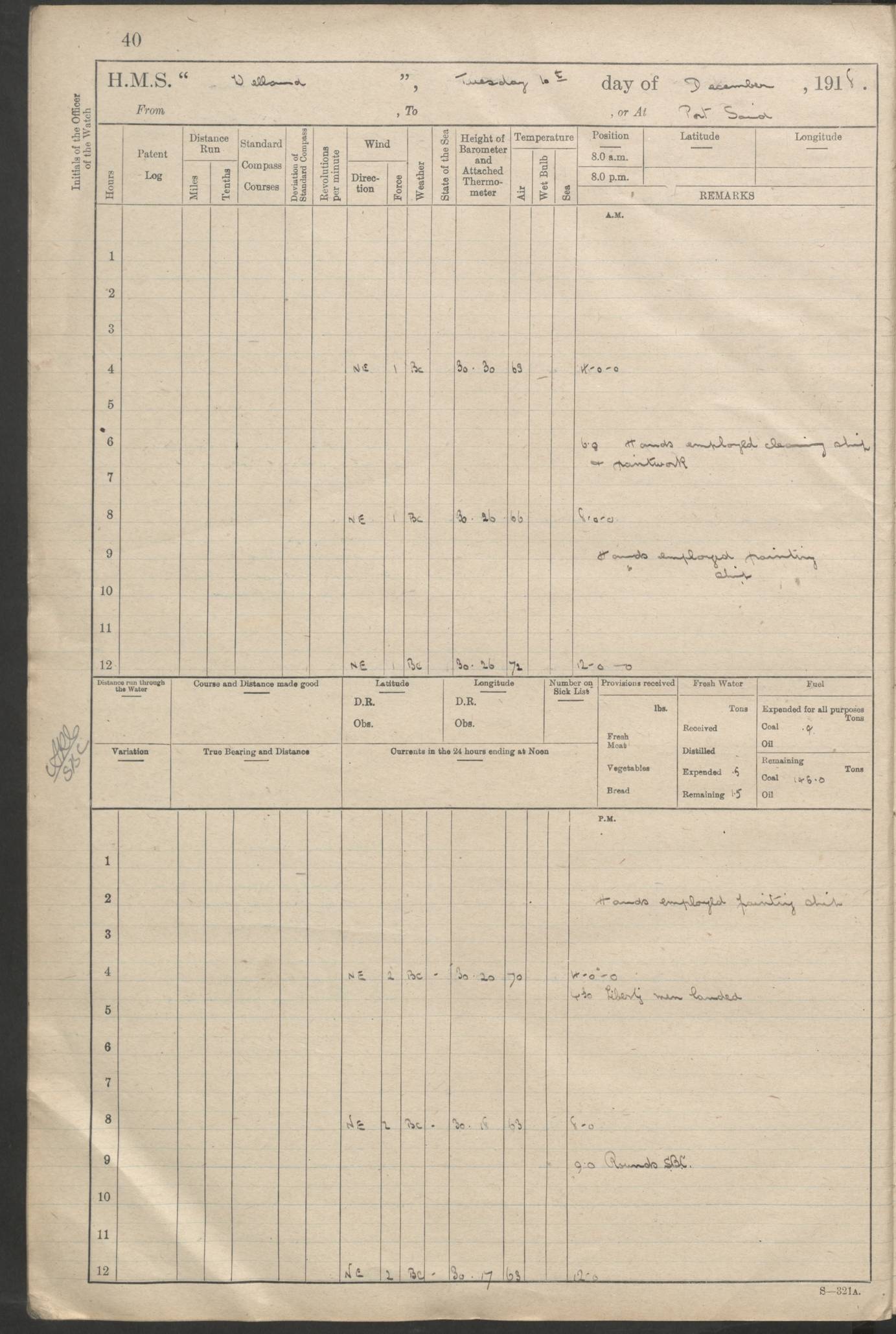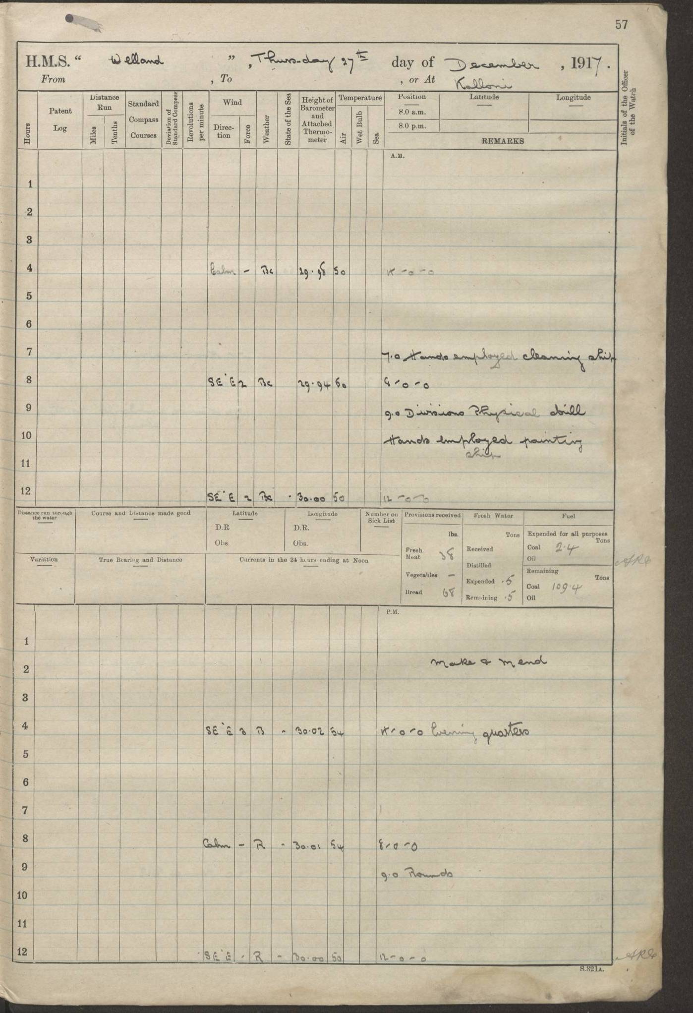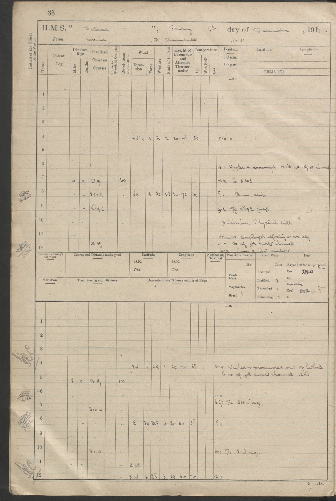 LOGS FOR DECEMBER 1913 4caf8ca7cadfd341970374c4: (http://oldweather.s3.amazonaws.com/ADM 53-68360/ADM 53-68360-001_0.jpg) 4caf8ca7cadfd341970374c5: (http://oldweather.s3.amazonaws.com/ADM 53-68360/ADM 53-68360-001_1.jpg) Cover 4caf8ca7cadfd341970374c6: (http://oldweather.s3.amazonaws.com/ADM 53-68360/ADM 53-68360-002_0.jpg) Log Page – Blank 4caf8ca7cadfd341970374c7: (http://oldweather.s3.amazonaws.com/ADM 53-68360/ADM 53-68360-002_1.jpg) Completed chart of coal usage at various speeds and under various conditions. Signed GW Nicolson, Engineer Commander 4caf8ca7cadfd341970374c8: (http://oldweather.s3.amazonaws.com/ADM 53-68360/ADM 53-68360-003_0.jpg) Log Page ‒ Blank 4caf8ca7cadfd341970374c9: (http://oldweather.s3.amazonaws.com/ADM 53-68360/ADM 53-68360-003_1.jpg) 1 December 1913 Hong Kong Lat 22.3, Long 114.2 9.00am: German gunboat TIGER left harbour. Hands employed drawing ammunition. 11.30am: Paid Monthly Payments. Hands employed embarking ammunition. 1.00pm: Hands employed ammunitioning ship. 4.20pm: Coal lighters came alongside. 9.00pm: Rounds. 4caf8ca7cadfd341970374ca: (http://oldweather.s3.amazonaws.com/ADM 53-68360/ADM 53-68360-004_0.jpg) 2 December 1913 Hong Kong Lat 22.3, Long 114.2 6.00am: Hands coaled ship & drawing torpedoes. 9.00am: Hands employed drawing arming tubes, torpedoes, & scrubbing deck clothes. 1.15pm: Finished coaling. Received 180 tons. 2.00pm: Employed cleaning ship. 3.00pm: 1 Engine Room Artificer & 1 Leading Stoker rejoined ship from Hospital. 5.00pm: Leave from 4.30pm to 6.30am. 9.00pm: Rounds 4caf8ca7cadfd341970374cb: (http://oldweather.s3.amazonaws.com/ADM 53-68360/ADM 53-68360-004_1.jpg) 3 December 1913 Hong Kong Lat 22.3, Long 114.2 6.00am: Lit up No. 4 Boiler. 7.55am: RIBBLE came into Basin. 8.00am: Employed cleaning ship. 10.00am: WELLAND & USK carrying out Basin trials. 1.00pm: Torpedo Boat 036 came into harbour. Let fires die out in No. 4 Boiler. 1.15pm: Hands employed spreading awnings & painting ship. 4.00pm: Leave from 4.30pm to 6.30am. 5.00pm: Japanese gunboat arrived. 9.00pm: Rounds. 4caf8ca7cadfd341970374cc: (http://oldweather.s3.amazonaws.com/ADM 53-68360/ADM 53-68360-005_0.jpg) 4 December 1913 Hong Kong Lat 22.3, Long 114.2 6.30am: Employed scrubbing decks in WIVERN. 8.00am: Hands employed painting ship. spreading awnings & launching boats. 1.00pm: Hands painting ship. 4.00pm: Leave from 4.30pm to 6.30am. 9.00pm: Rounds 4caf8ca7cadfd341970374cd: (http://oldweather.s3.amazonaws.com/ADM 53-68360/ADM 53-68360-005_1.jpg) 5 December 1913 Hong Kong Lat 22.3, Long 114.2 8.00am: Hands employed as requisite. 8.30am: Russian cruiser arrived. Discharged 1 Seaman to TAMAR, sick. 1.00pm: Hands employed painting ship's side. 2.30pm: 1 Stoker returned from Hospital. 4.00pm: Leave from 4.30pm to 6.30am. 9.00pm: Rounds. 4caf8ca7cadfd341970374ce: (http://oldweather.s3.amazonaws.com/ADM 53-68360/ADM 53-68360-006_0.jpg) 6 December 1913 Hong Kong Lat 22.3, Long 114.2 6.00am: Employed scrubbing deck of WIVERN. 8.00am: Employed cleaning ship & painting. 1.00pm: Leave from 1.30pm to 6.30am. 2.00pm: Hands make and mend clothes. 2.30pm: One Leading Stoker returned from Hospital. 9.00pm: Rounds. 4caf8ca7cadfd341970374cf: (http://oldweather.s3.amazonaws.com/ADM 53-68360/ADM 53-68360-006_1.jpg) 7 December 1913 Hong Kong Lat 22.3, Long 114.2 6.00am: Employed cleaning ship. 8.45am: Landed Roman Catholic party. 9.00am: Divisions. 9.45am: Landed Non Conformist party. 10.15am: Church of England party to TAMAR. 1.00pm: Leave from 1.30pm to 6.30am. 9.00pm: Rounds. 4caf8ca7cadfd341970374d0: (http://oldweather.s3.amazonaws.com/ADM 53-68360/ADM 53-68360-007_0.jpg) 8 December 1913 Hong Kong Lat 22.3, Long 114.2 6.00am: Hands cleaning WIVERN. 8.00am: Hands as requisite. 9.30am: 1 Stoker returned from Sick List. 1.00pm: Employed cleaning ship. 4.00pm: Leave from 4.30pm to 6.30am. 9.00pm: Rounds. 4caf8ca7cadfd341970374d1: (http://oldweather.s3.amazonaws.com/ADM 53-68360/ADM 53-68360-007_1.jpg) 9 December 1913 Hong Kong Lat 22.3, Long 114.2 8.00am: Hands employed preparing ship for Paying Off. 11.00am: Paid Money & Mess Savings. 11.30am: Paid off Medical Inspection. 1.00pm: Leave from 1.30pm to 6.30am. 9.00pm: Rounds. 4caf8ca7cadfd341970374d2: (http://oldweather.s3.amazonaws.com/ADM 53-68360/ADM 53-68360-008_0.jpg) 10 December 1913 Hong Kong Lat 22.3, Long 114.2 9.00am: Commissioned ship with crew of WHITING. 10.30am: Left Basin & proceeded for short run. 12.00pm: Made fast to No. 9 Buoy. 12.30pm: SUNDA (P & O) sailed with crews of WELLAND & USK. 1.30pm: Clear lower deck. Exercised Fire & Collision Stations. 4.00pm: Employed cleaning ship. Leave from 4.30pm to 6.30am. 9.00pm: Rounds. 4caf8ca8cadfd341970374d3: (http://oldweather.s3.amazonaws.com/ADM 53-68360/ADM 53-68360-008_1.jpg) 11 December 1913 Hong Kong to Tai Po Lat 22.446, Long 114.187 6.30am: Sent working party to WHITING. 7.00am: Hands as requisite & preparing ship for Sea. 8.35am: Working party returned. 9.00am: Slipped & proceeded. Course & Speed as requisite for leaving harbour. 9.20am: 12 knots. Set course for Mirs Bay. 11.20am: Course & Speed as requisite for entering Tolo harbour. 12.00pm: Came to with Starboard anchor in 12½ fathoms. Conspicuous house on point. Small headland to North of pier. 1.00pm: Hands employed scraping & painting. 4.00pm: Hands make and mend clothes. 6.45pm: Burnt searchlights. 9.00pm: Rounds. 4caf8ca8cadfd341970374d4: (http://oldweather.s3.amazonaws.com/ADM 53-68360/ADM 53-68360-009_0.jpg) 12 December 1913 Tai Po Lat 22.446, Long 114.187 6.00am: Hands scrub & wash upper deck. 9.00am: Divisions. Exercised General Quarters. 10.30am: Employed as requisite. Returned Stores. 1.00pm: Employed scrubbing after part & putting down deck clothes. 3.00pm: Leave from 4.30pm to 7.00pm. 4.00pm: Hands make and mend clothes. 9.00pm: Rounds 4caf8ca8cadfd341970374d5: (http://oldweather.s3.amazonaws.com/ADM 53-68360/ADM 53-68360-009_1.jpg) 13 December 1913 Tai Po Lat 22.446, Long 114.187 6.00am: Hands employed c