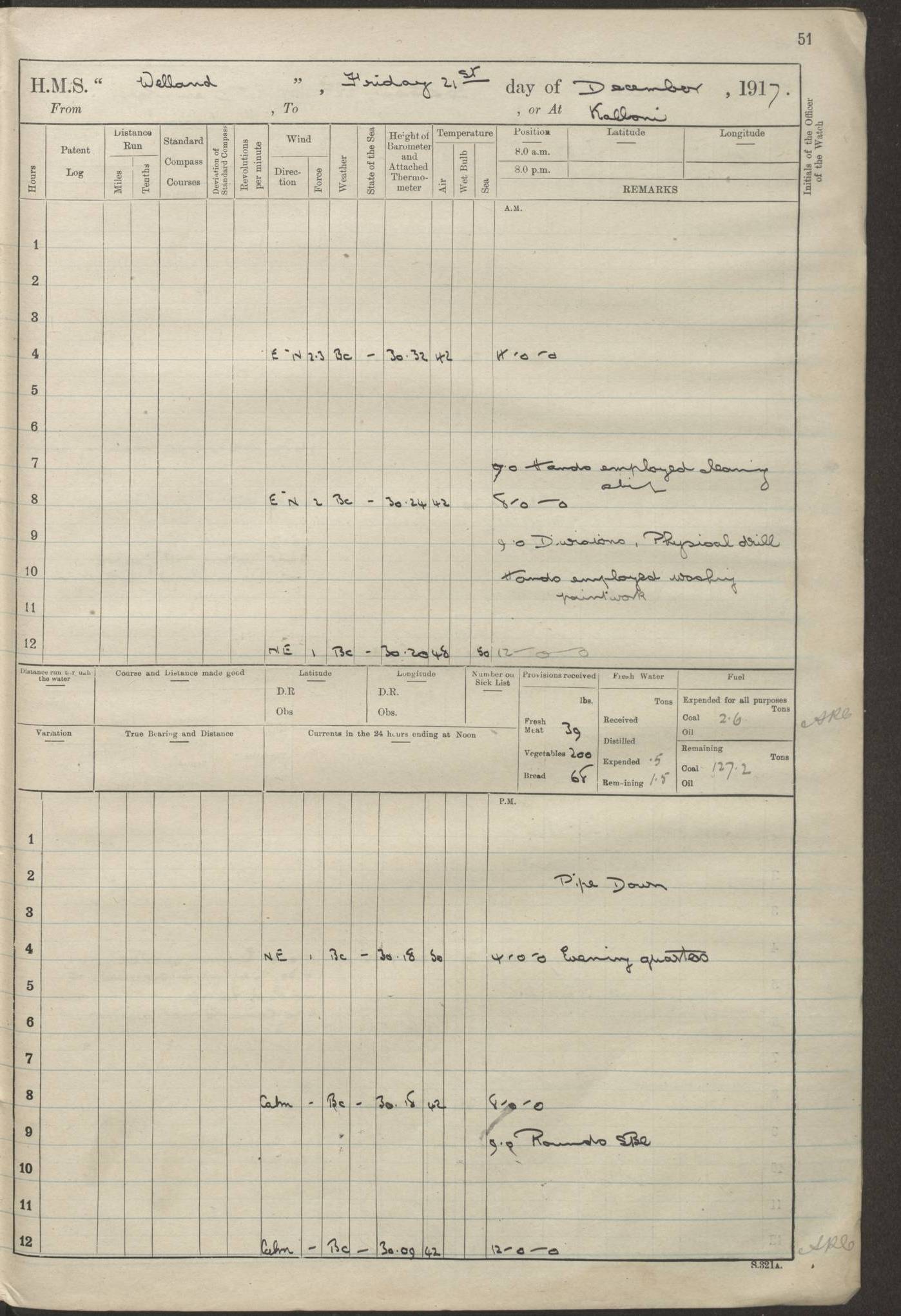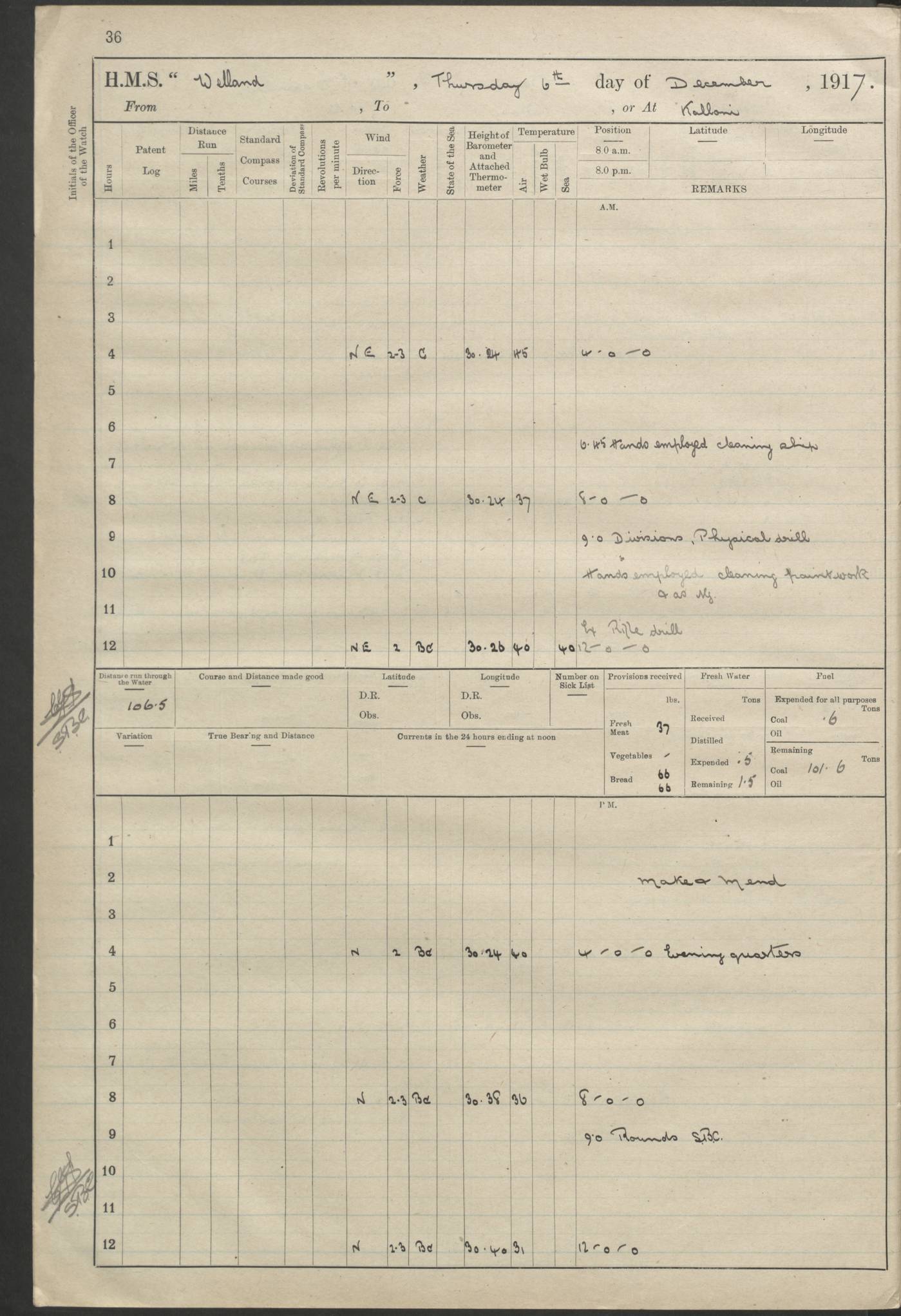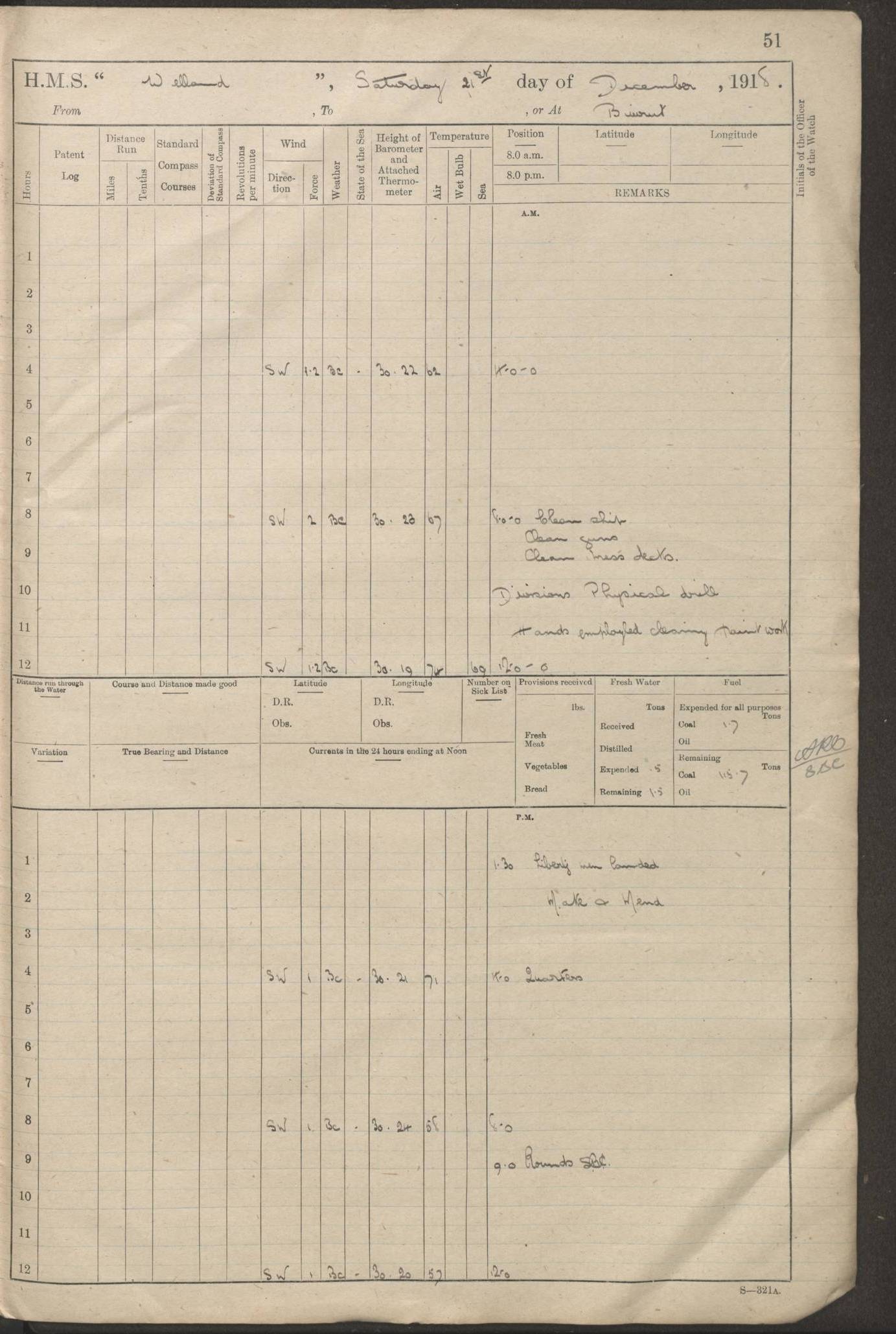 LOGS FOR DECEMBER 1913 4caf8ca7cadfd341970374c4: (http://oldweather.s3.amazonaws.com/ADM 53-68360/ADM 53-68360-001_0.jpg) 4caf8ca7cadfd341970374c5: (http://oldweather.s3.amazonaws.com/ADM 53-68360/ADM 53-68360-001_1.jpg) Cover 4caf8ca7cadfd341970374c6: (http://oldweather.s3.amazonaws.com/ADM 53-68360/ADM 53-68360-002_0.jpg) Log Page – Blank 4caf8ca7cadfd341970374c7: (http://oldweather.s3.amazonaws.com/ADM 53-68360/ADM 53-68360-002_1.jpg) Completed chart of coal usage at various speeds and under various conditions. Signed GW Nicolson, Engineer Commander 4caf8ca7cadfd341970374c8: (http://oldweather.s3.amazonaws.com/ADM 53-68360/ADM 53-68360-003_0.jpg) Log Page ‒ Blank 4caf8ca7cadfd341970374c9: (http://oldweather.s3.amazonaws.com/ADM 53-68360/ADM 53-68360-003_1.jpg) 1 December 1913 Hong Kong Lat 22.3, Long 114.2 9.00am: German gunboat TIGER left harbour. Hands employed drawing ammunition. 11.30am: Paid Monthly Payments. Hands employed embarking ammunition. 1.00pm: Hands employed ammunitioning ship. 4.20pm: Coal lighters came alongside. 9.00pm: Rounds. 4caf8ca7cadfd341970374ca: (http://oldweather.s3.amazonaws.com/ADM 53-68360/ADM 53-68360-004_0.jpg) 2 December 1913 Hong Kong Lat 22.3, Long 114.2 6.00am: Hands coaled ship & drawing torpedoes. 9.00am: Hands employed drawing arming tubes, torpedoes, & scrubbing deck clothes. 1.15pm: Finished coaling. Received 180 tons. 2.00pm: Employed cleaning ship. 3.00pm: 1 Engine Room Artificer & 1 Leading Stoker rejoined ship from Hospital. 5.00pm: Leave from 4.30pm to 6.30am. 9.00pm: Rounds 4caf8ca7cadfd341970374cb: (http://oldweather.s3.amazonaws.com/ADM 53-68360/ADM 53-68360-004_1.jpg) 3 December 1913 Hong Kong Lat 22.3, Long 114.2 6.00am: Lit up No. 4 Boiler. 7.55am: RIBBLE came into Basin. 8.00am: Employed cleaning ship. 10.00am: WELLAND & USK carrying out Basin trials. 1.00pm: Torpedo Boat 036 came into harbour. Let fires die out in No. 4 Boiler. 1.15pm: Hands employed spreading awnings & painting ship. 4.00pm: Leave from 4.30pm to 6.30am. 5.00pm: Japanese gunboat arrived. 9.00pm: Rounds. 4caf8ca7cadfd341970374cc: (http://oldweather.s3.amazonaws.com/ADM 53-68360/ADM 53-68360-005_0.jpg) 4 December 1913 Hong Kong Lat 22.3, Long 114.2 6.30am: Employed scrubbing decks in WIVERN. 8.00am: Hands employed painting ship. spreading awnings & launching boats. 1.00pm: Hands painting ship. 4.00pm: Leave from 4.30pm to 6.30am. 9.00pm: Rounds 4caf8ca7cadfd341970374cd: (http://oldweather.s3.amazonaws.com/ADM 53-68360/ADM 53-68360-005_1.jpg) 5 December 1913 Hong Kong Lat 22.3, Long 114.2 8.00am: Hands employed as requisite. 8.30am: Russian cruiser arrived. Discharged 1 Seaman to TAMAR, sick. 1.00pm: Hands employed painting ship's side. 2.30pm: 1 Stoker returned from Hospital. 4.00pm: Leave from 4.30pm to 6.30am. 9.00pm: Rounds. 4caf8ca7cadfd341970374ce: (http://oldweather.s3.amazonaws.com/ADM 53-68360/ADM 53-68360-006_0.jpg) 6 December 1913 Hong Kong Lat 22.3, Long 114.2 6.00am: Employed scrubbing deck of WIVERN. 8.00am: Employed cleaning ship & painting. 1.00pm: Leave from 1.30pm to 6.30am. 2.00pm: Hands make and mend clothes. 2.30pm: One Leading Stoker returned from Hospital. 9.00pm: Rounds. 4caf8ca7cadfd341970374cf: (http://oldweather.s3.amazonaws.com/ADM 53-68360/ADM 53-68360-006_1.jpg) 7 December 1913 Hong Kong Lat 22.3, Long 114.2 6.00am: Employed cleaning ship. 8.45am: Landed Roman Catholic party. 9.00am: Divisions. 9.45am: Landed Non Conformist party. 10.15am: Church of England party to TAMAR. 1.00pm: Leave from 1.30pm to 6.30am. 9.00pm: Rounds. 4caf8ca7cadfd341970374d0: (http://oldweather.s3.amazonaws.com/ADM 53-68360/ADM 53-68360-007_0.jpg) 8 December 1913 Hong Kong Lat 22.3, Long 114.2 6.00am: Hands cleaning WIVERN. 8.00am: Hands as requisite. 9.30am: 1 Stoker returned from Sick List. 1.00pm: Employed cleaning ship. 4.00pm: Leave from 4.30pm to 6.30am. 9.00pm: Rounds. 4caf8ca7cadfd341970374d1: (http://oldweather.s3.amazonaws.com/ADM 53-68360/ADM 53-68360-007_1.jpg) 9 December 1913 Hong Kong Lat 22.3, Long 114.2 8.00am: Hands employed preparing ship for Paying Off. 11.00am: Paid Money & Mess Savings. 11.30am: Paid off Medical Inspection. 1.00pm: Leave from 1.30pm to 6.30am. 9.00pm: Rounds. 4caf8ca7cadfd341970374d2: (http://oldweather.s3.amazonaws.com/ADM 53-68360/ADM 53-68360-008_0.jpg) 10 December 1913 Hong Kong Lat 22.3, Long 114.2 9.00am: Commissioned ship with crew of WHITING. 10.30am: Left Basin & proceeded for short run. 12.00pm: Made fast to No. 9 Buoy. 12.30pm: SUNDA (P & O) sailed with crews of WELLAND & USK. 1.30pm: Clear lower deck. Exercised Fire & Collision Stations. 4.00pm: Employed cleaning ship. Leave from 4.30pm to 6.30am. 9.00pm: Rounds. 4caf8ca8cadfd341970374d3: (http://oldweather.s3.amazonaws.com/ADM 53-68360/ADM 53-68360-008_1.jpg) 11 December 1913 Hong Kong to Tai Po Lat 22.446, Long 114.187 6.30am: Sent working party to WHITING. 7.00am: Hands as requisite & preparing ship for Sea. 8.35am: Working party returned. 9.00am: Slipped & proceeded. Course & Speed as requisite for leaving harbour. 9.20am: 12 knots. Set course for Mirs Bay. 11.20am: Course & Speed as requisite for entering Tolo harbour. 12.00pm: Came to with Starboard anchor in 12½ fathoms. Conspicuous house on point. Small headland to North of pier. 1.00pm: Hands employed scraping & painting. 4.00pm: Hands make and mend clothes. 6.45pm: Burnt searchlights. 9.00pm: Rounds. 4caf8ca8cadfd341970374d4: (http://oldweather.s3.amazonaws.com/ADM 53-68360/ADM 53-68360-009_0.jpg) 12 December 1913 Tai Po Lat 22.446, Long 114.187 6.00am: Hands scrub & wash upper deck. 9.00am: Divisions. Exercised General Quarters. 10.30am: Employed as requisite. Returned Stores. 1.00pm: Employed scrubbing after part & putting down deck clothes. 3.00pm: Leave from 4.30pm to 7.00pm. 4.00pm: Hands make and mend clothes. 9.00pm: Rounds 4caf8ca8cadfd341970374d5: (http://oldweather.s3.amazonaws.com/ADM 53-68360/ADM 53-68360-009_1.jpg) 13 December 1913 Tai Po Lat 22.446, Long 114.187 6.00am: Hands employed c