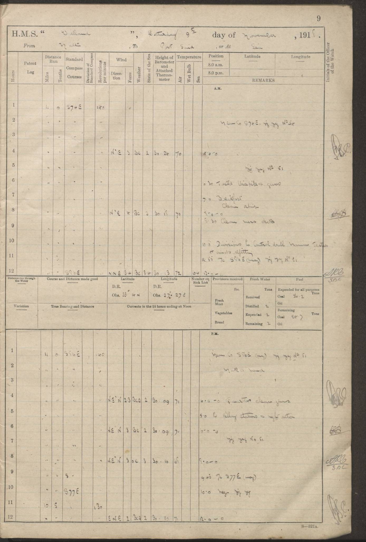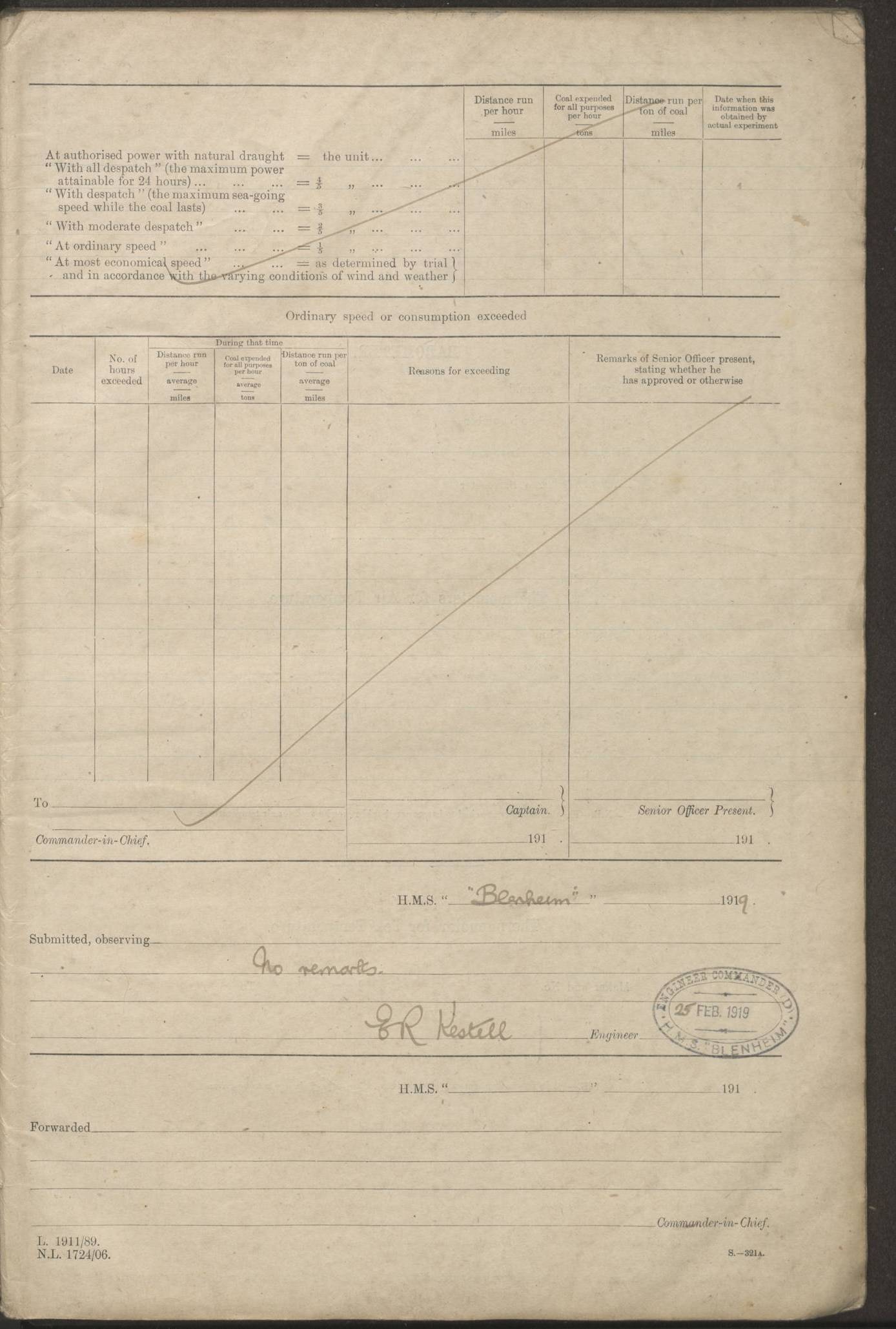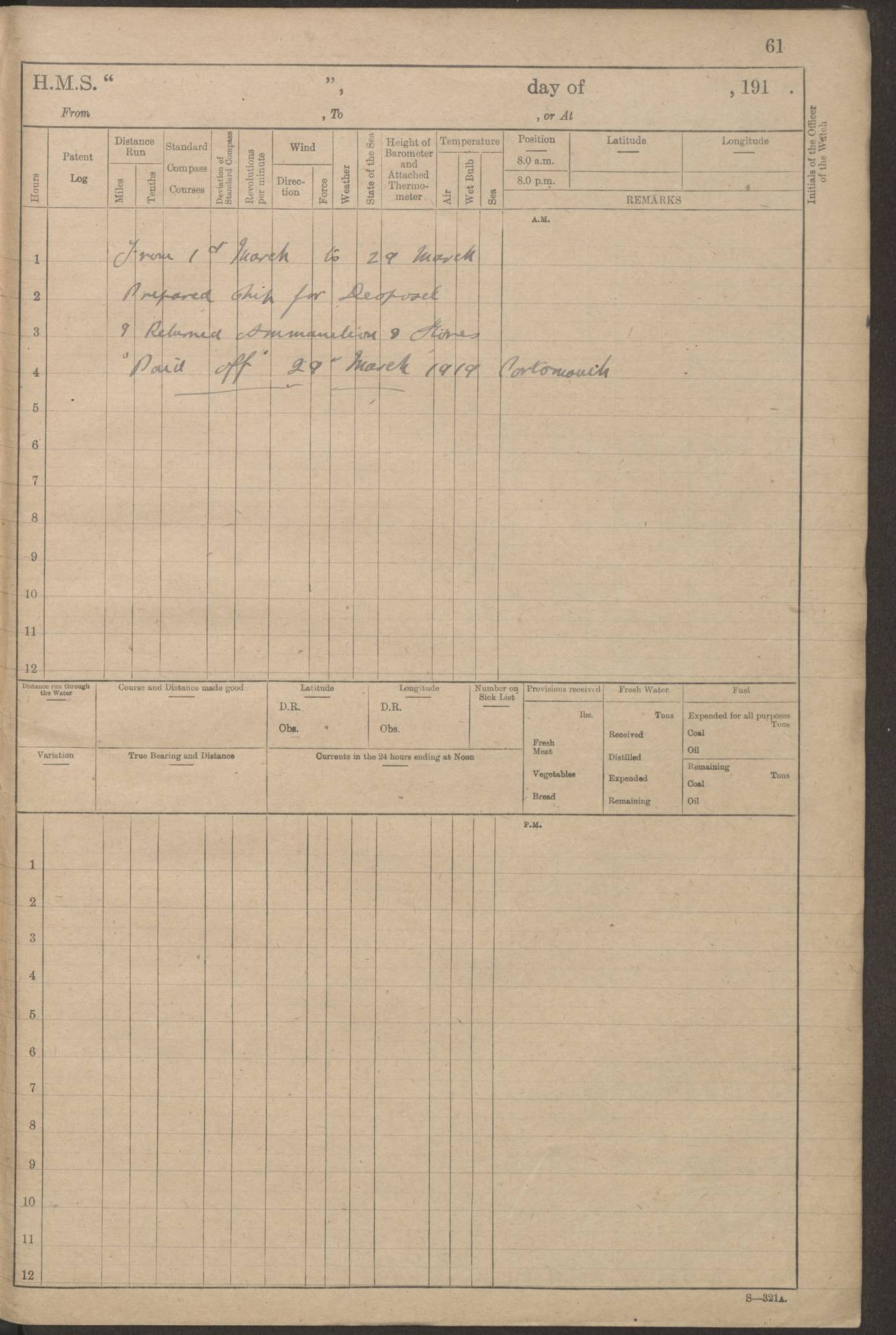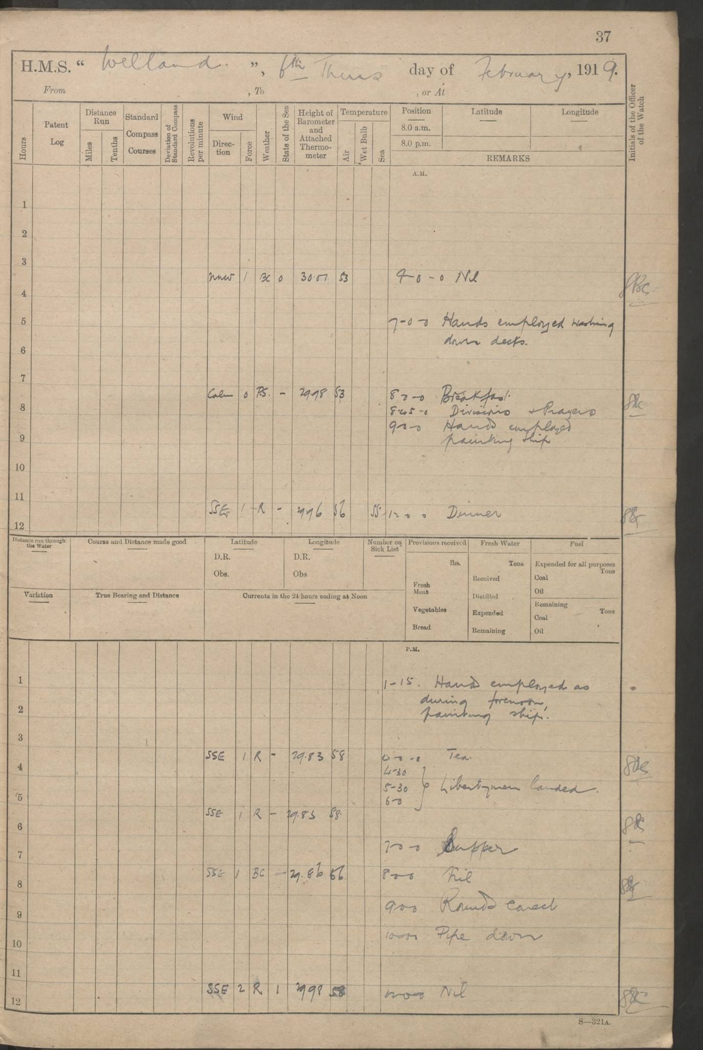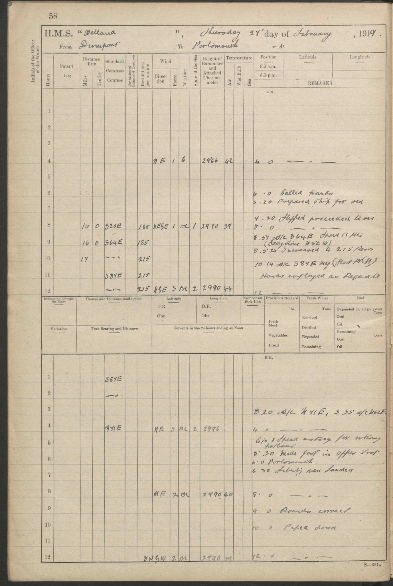 4caf8ca7cadfd341970374b6: (http://oldweather.s3.amazonaws.com/ADM 53-68392/ADM 53-68392-029_0.jpg) 21 February 1919 Gibraltar and at sea Lat 36.15, Long -5.37 11.30am: Slipped and proceeded to sea. Took up position astern of HMS Wear. NW’ly courses, 15 knots. 4caf8ca7cadfd341970374b7: (http://oldweather.s3.amazonaws.com/ADM 53-68392/ADM 53-68392-029_1.jpg) 22 February 1919 At sea to Lisbon Lat 38.7, Long -9.14 1.25am: Cape St Vincent abeam, 7.5 miles, a/c North. 9.30am: Secured to buoy at Lisbon. 4caf8ca7cadfd341970374b8: (http://oldweather.s3.amazonaws.com/ADM 53-68392/ADM 53-68392-030_0.jpg) 23 February 1919 Lisbon and at sea Lat 38.78, Long -9.51 [approx] 10.00am: Slipped from buoy and proceeded to sea astern of HMS Wear. Courses and speeds as requisite. 12.15pm: C Roca abeam. Courses East of North, 4caf8ca7cadfd341970374b9: (http://oldweather.s3.amazonaws.com/ADM 53-68392/ADM 53-68392-030_1.jpg) 24 February 1919 At sea Lat 44.3, Long -8.7 [approx] 7.00am: Hands securing gear on upper deck. [West winds f 5-7] 4caf8ca7cadfd341970374ba: (http://oldweather.s3.amazonaws.com/ADM 53-68392/ADM 53-68392-031_0.jpg) 25 February 1919 At sea to Plymouth Lat 49.5, Long -4.5 [approx] 7.30am: Ushant Light abeam, a/c N38E. 5.00pm: Eddystone Lt abeam. 5.30pm: Made fast to coaling jetty. 4caf8ca7cadfd341970374bb: (http://oldweather.s3.amazonaws.com/ADM 53-68392/ADM 53-68392-031_1.jpg) 26 February 1919 Lat 50.38, Long -4.19 2.30pm: Finished coaling, 60 tons. Washed down decks. Slipped and made fast to buoy. Landed liberty men. 4caf8ca7cadfd341970374bc: (http://oldweather.s3.amazonaws.com/ADM 53-68392/ADM 53-68392-032_0.jpg) 27 February 1919 Devonport to Portsmouth Lat 50.4, Long -2.1 [approx] 7.30am: Proceeded to sea. 8.51am: Eddystone bg N52W, a/c S64E. 10.14am: Start Pt Lt bg North, a/c S87E. 5.30pm: Made fast in upper trot, Portsmouth. 4caf8ca7cadfd341970374bd: (http://oldweather.s3.amazonaws.com/ADM 53-68392/ADM 53-68392-032_1.jpg) 28 February 1919 Portsmouth Lat 50.81, Long -1.11 1.15pm: Hands fall in and prepare to discharge ammunition. 4caf8ca7cadfd341970374be: (http://oldweather.s3.amazonaws.com/ADM 53-68392/ADM 53-68392-033_0.jpg) 4caf8ca7cadfd341970374be: (http://oldweather.s3.amazonaws.com/ADM 53-68392/ADM 53-68392-033_0.jpg) Above two pages blank. 4caf8ca7cadfd341970374bf: (http://oldweather.s3.amazonaws.com/ADM 53-68392/ADM 53-68392-033_1.jpg) Portsmouth Lat 50.81, Long -1.11 From 1st March to 29th March prepared ship for disposal and returned ammunition and stores. Paid off 29th March 1919, Portsmouth. 4caf8ca7cadfd341970374c0: (http://oldweather.s3.amazonaws.com/ADM 53-68392/ADM 53-68392-034_0.jpg) 4caf8ca7cadfd341970374c1: (http://oldweather.s3.amazonaws.com/ADM 53-68392/ADM 53-68392-034_1.jpg) 4caf8ca7cadfd341970374c2: (http://oldweather.s3.amazonaws.com/ADM 53-68392/ADM 53-68392-035_0.jpg) 4caf8ca7cadfd341970374c3: (http://oldweather.s3.amazonaws.com/ADM 53-68392/ADM 53-68392-035_1.jpg) Above four pages blank. |