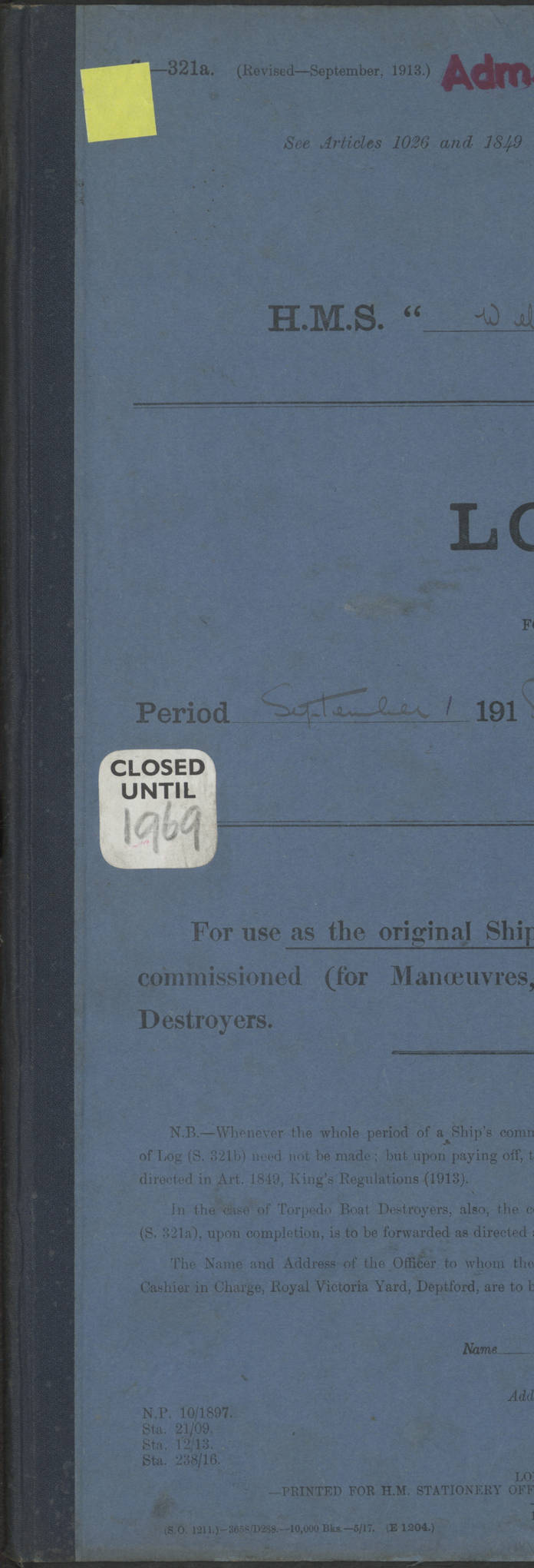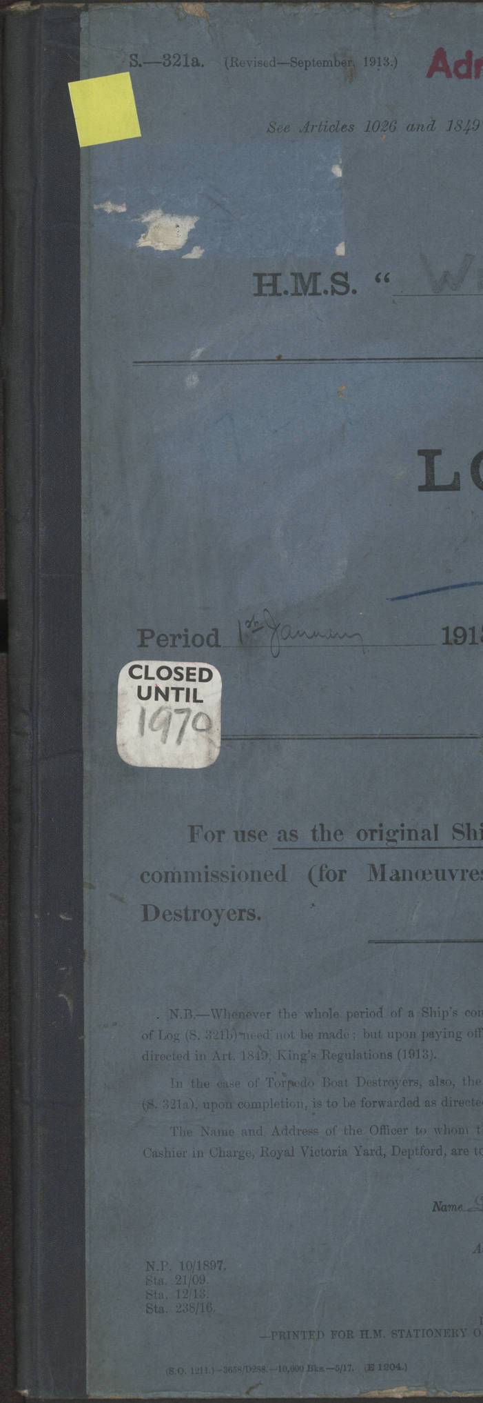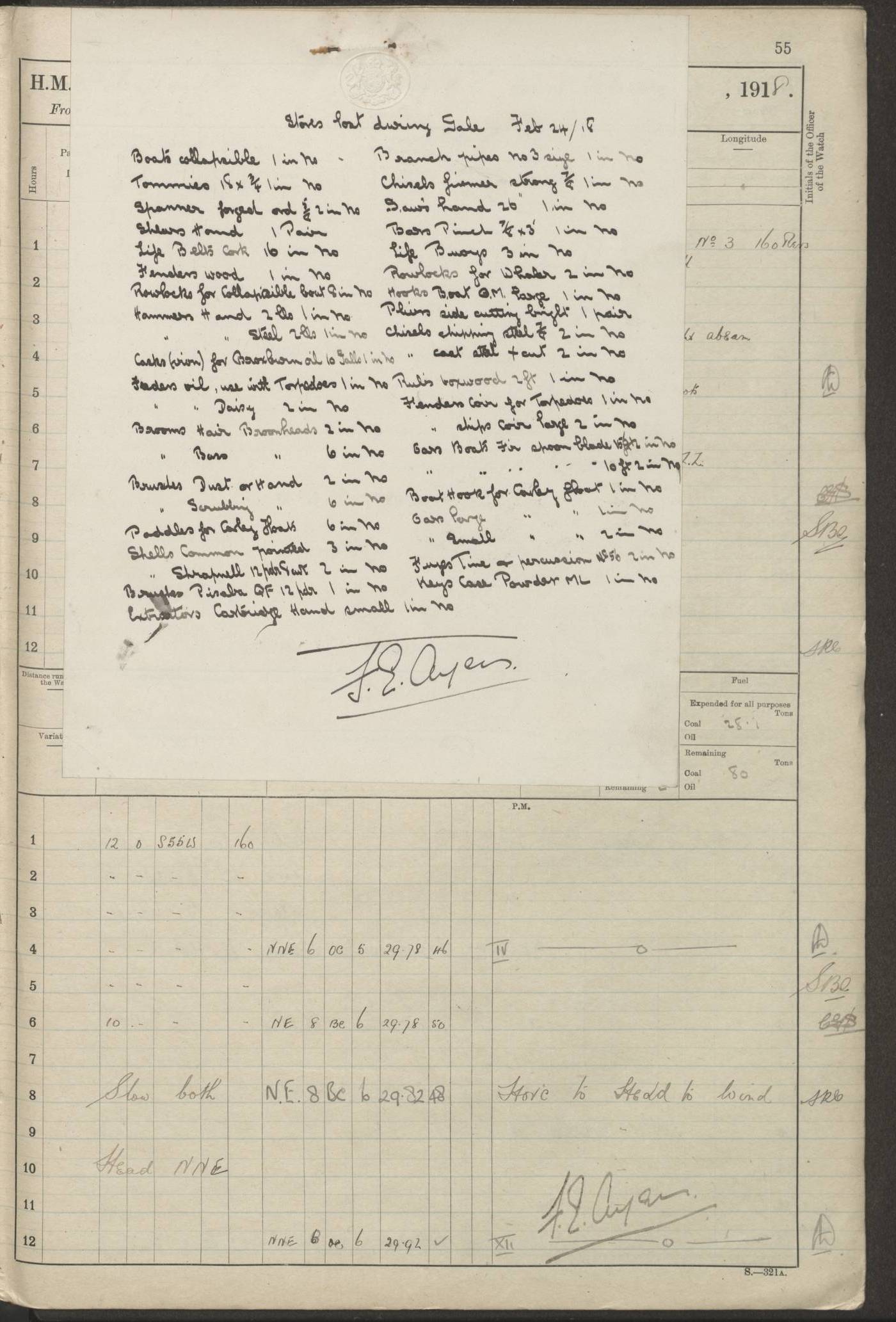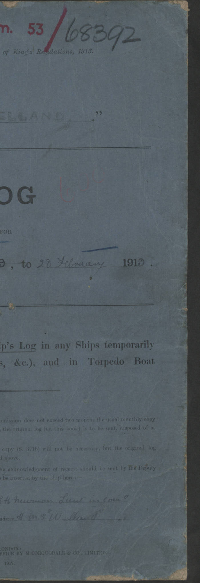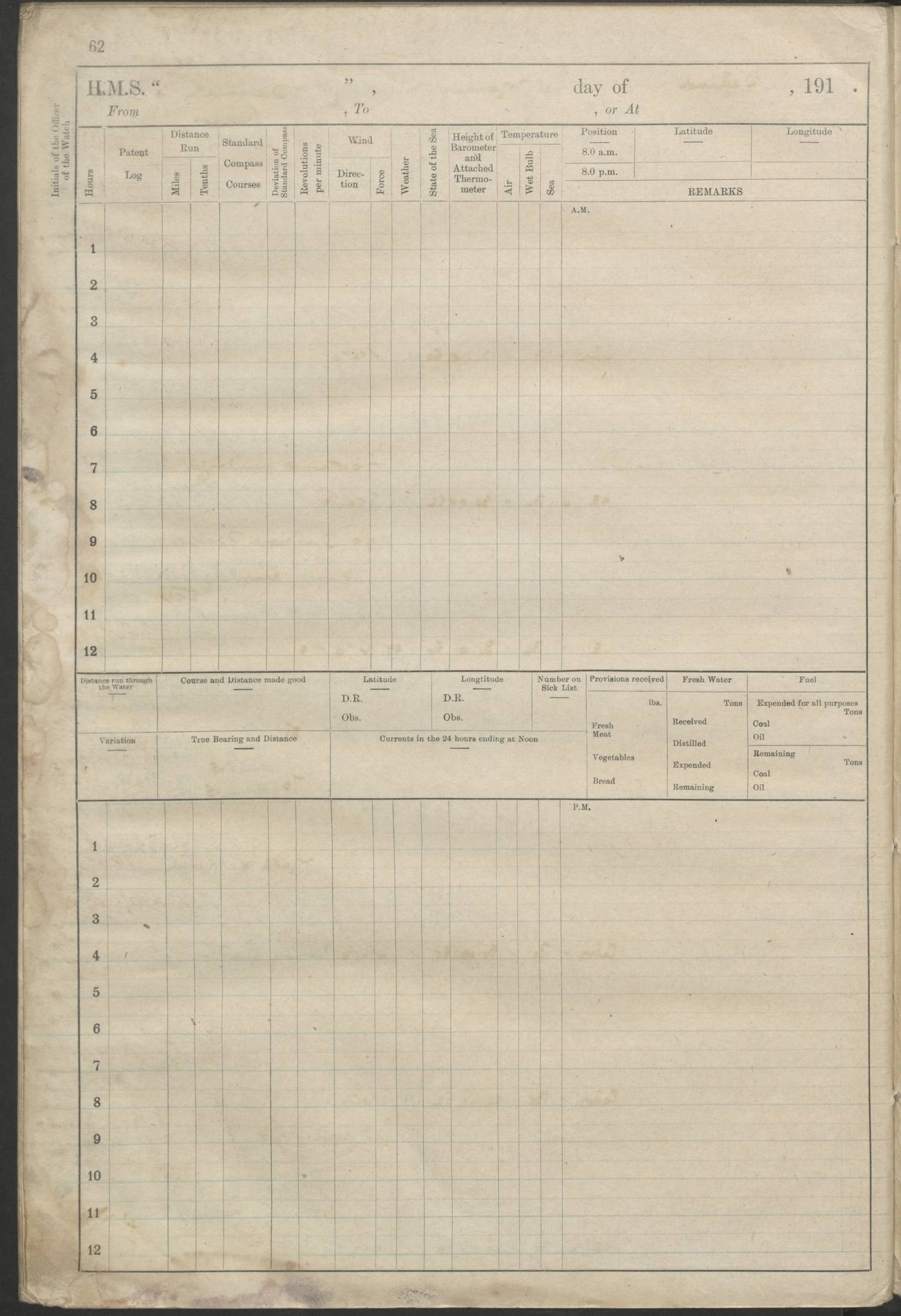 4caf8ca7cadfd341970374b6: (http://oldweather.s3.amazonaws.com/ADM 53-68392/ADM 53-68392-029_0.jpg) 21 February 1919 Gibraltar and at sea Lat 36.15, Long -5.37 11.30am: Slipped and proceeded to sea. Took up position astern of HMS Wear. NW’ly courses, 15 knots. 4caf8ca7cadfd341970374b7: (http://oldweather.s3.amazonaws.com/ADM 53-68392/ADM 53-68392-029_1.jpg) 22 February 1919 At sea to Lisbon Lat 38.7, Long -9.14 1.25am: Cape St Vincent abeam, 7.5 miles, a/c North. 9.30am: Secured to buoy at Lisbon. 4caf8ca7cadfd341970374b8: (http://oldweather.s3.amazonaws.com/ADM 53-68392/ADM 53-68392-030_0.jpg) 23 February 1919 Lisbon and at sea Lat 38.78, Long -9.51 [approx] 10.00am: Slipped from buoy and proceeded to sea astern of HMS Wear. Courses and speeds as requisite. 12.15pm: C Roca abeam. Courses East of North, 4caf8ca7cadfd341970374b9: (http://oldweather.s3.amazonaws.com/ADM 53-68392/ADM 53-68392-030_1.jpg) 24 February 1919 At sea Lat 44.3, Long -8.7 [approx] 7.00am: Hands securing gear on upper deck. [West winds f 5-7] 4caf8ca7cadfd341970374ba: (http://oldweather.s3.amazonaws.com/ADM 53-68392/ADM 53-68392-031_0.jpg) 25 February 1919 At sea to Plymouth Lat 49.5, Long -4.5 [approx] 7.30am: Ushant Light abeam, a/c N38E. 5.00pm: Eddystone Lt abeam. 5.30pm: Made fast to coaling jetty. 4caf8ca7cadfd341970374bb: (http://oldweather.s3.amazonaws.com/ADM 53-68392/ADM 53-68392-031_1.jpg) 26 February 1919 Lat 50.38, Long -4.19 2.30pm: Finished coaling, 60 tons. Washed down decks. Slipped and made fast to buoy. Landed liberty men. 4caf8ca7cadfd341970374bc: (http://oldweather.s3.amazonaws.com/ADM 53-68392/ADM 53-68392-032_0.jpg) 27 February 1919 Devonport to Portsmouth Lat 50.4, Long -2.1 [approx] 7.30am: Proceeded to sea. 8.51am: Eddystone bg N52W, a/c S64E. 10.14am: Start Pt Lt bg North, a/c S87E. 5.30pm: Made fast in upper trot, Portsmouth. 4caf8ca7cadfd341970374bd: (http://oldweather.s3.amazonaws.com/ADM 53-68392/ADM 53-68392-032_1.jpg) 28 February 1919 Portsmouth Lat 50.81, Long -1.11 1.15pm: Hands fall in and prepare to discharge ammunition. 4caf8ca7cadfd341970374be: (http://oldweather.s3.amazonaws.com/ADM 53-68392/ADM 53-68392-033_0.jpg) 4caf8ca7cadfd341970374be: (http://oldweather.s3.amazonaws.com/ADM 53-68392/ADM 53-68392-033_0.jpg) Above two pages blank. 4caf8ca7cadfd341970374bf: (http://oldweather.s3.amazonaws.com/ADM 53-68392/ADM 53-68392-033_1.jpg) Portsmouth Lat 50.81, Long -1.11 From 1st March to 29th March prepared ship for disposal and returned ammunition and stores. Paid off 29th March 1919, Portsmouth. 4caf8ca7cadfd341970374c0: (http://oldweather.s3.amazonaws.com/ADM 53-68392/ADM 53-68392-034_0.jpg) 4caf8ca7cadfd341970374c1: (http://oldweather.s3.amazonaws.com/ADM 53-68392/ADM 53-68392-034_1.jpg) 4caf8ca7cadfd341970374c2: (http://oldweather.s3.amazonaws.com/ADM 53-68392/ADM 53-68392-035_0.jpg) 4caf8ca7cadfd341970374c3: (http://oldweather.s3.amazonaws.com/ADM 53-68392/ADM 53-68392-035_1.jpg) Above four pages blank. |