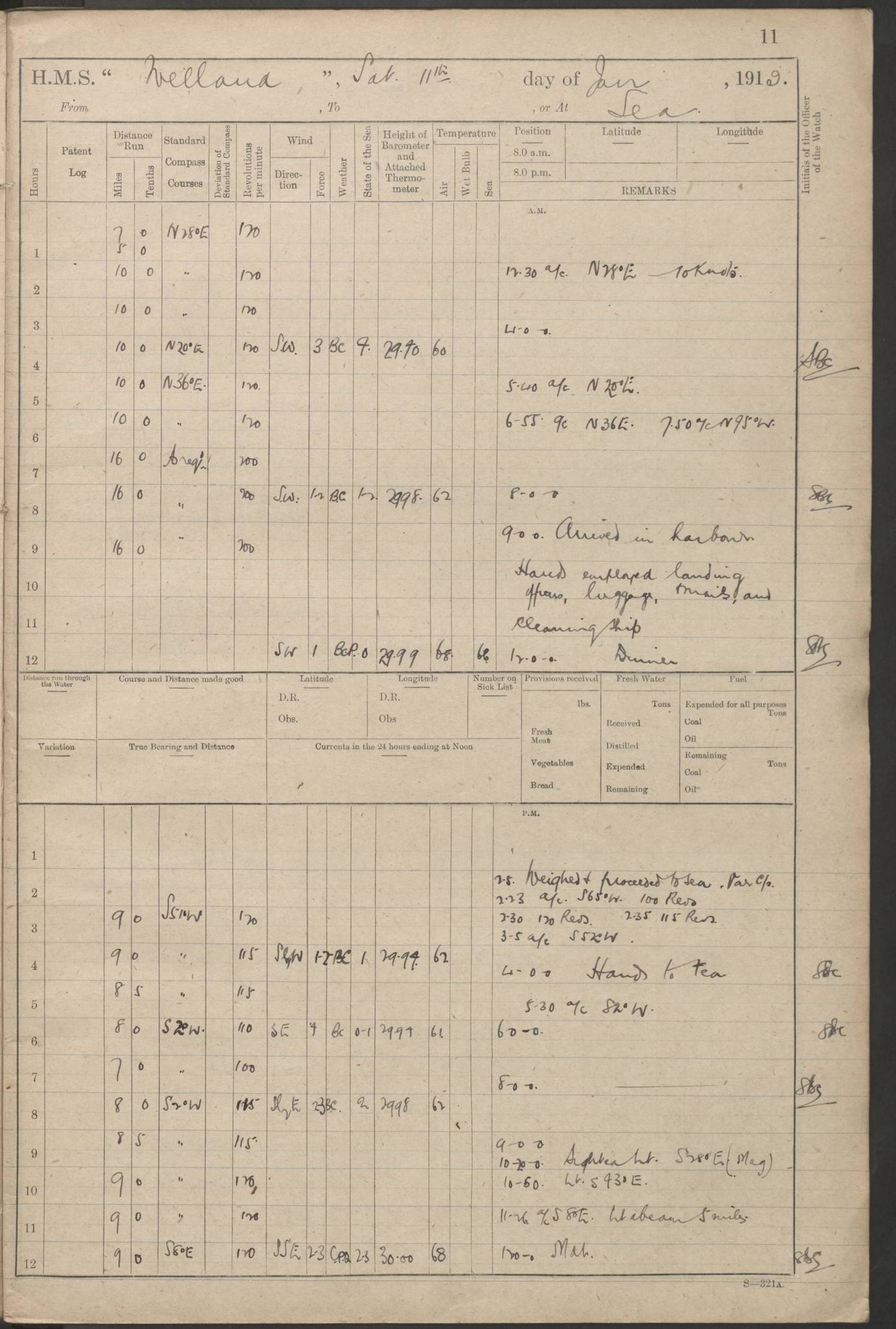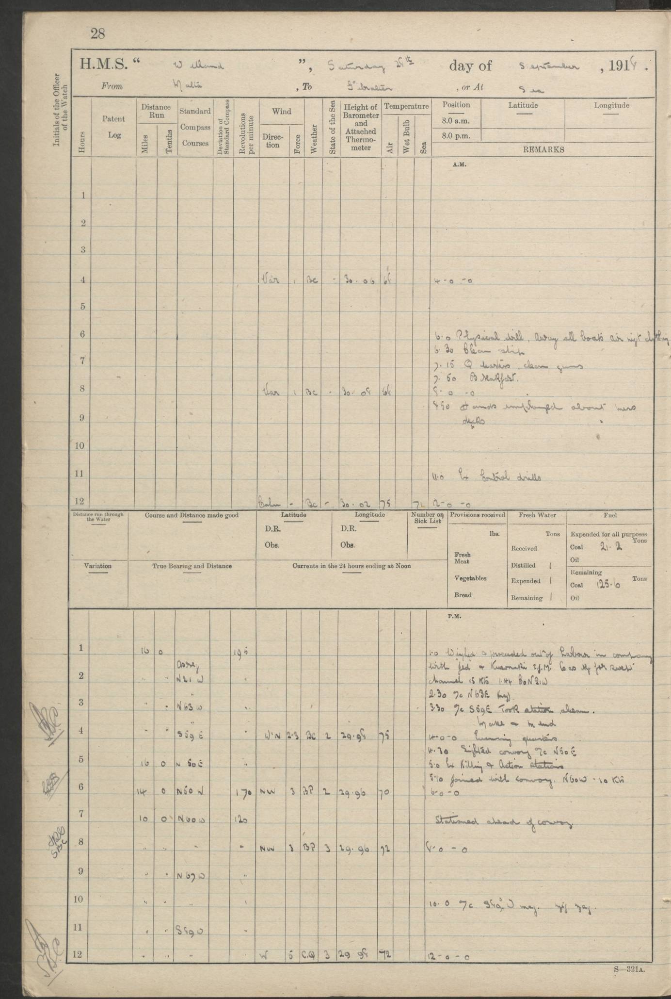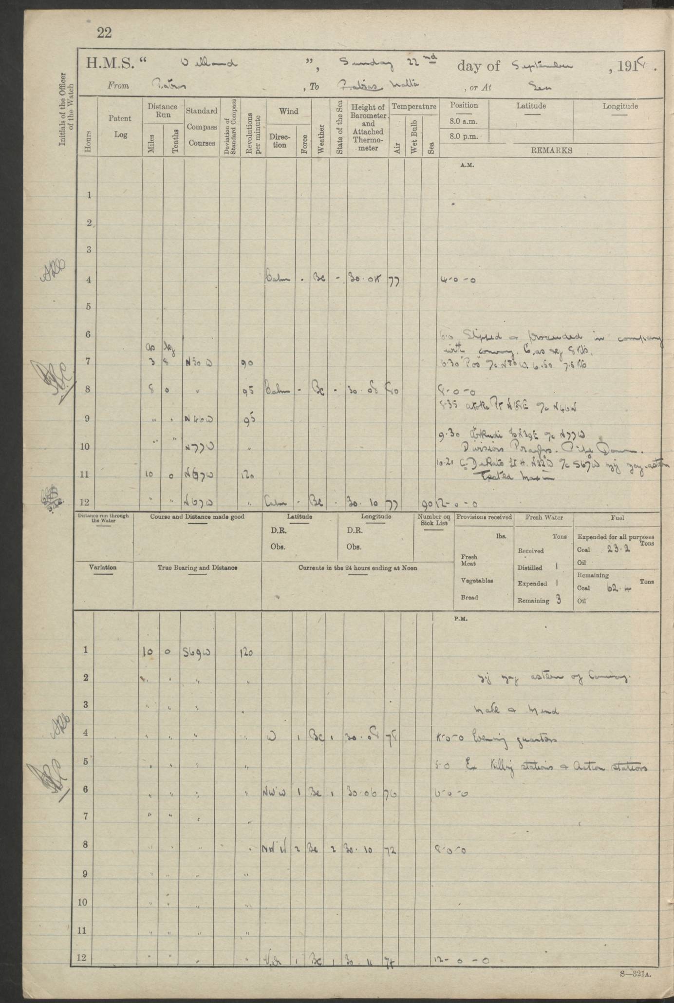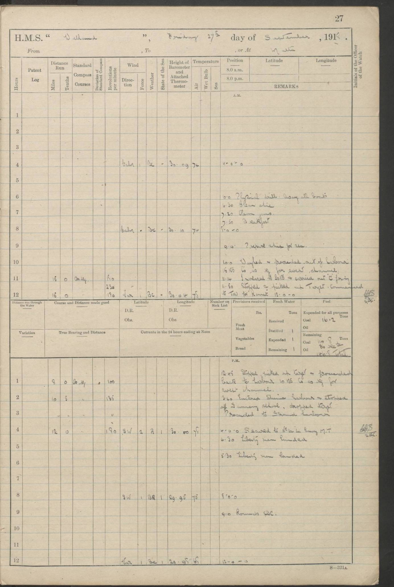 Slipped & went alongside. 10.40am: Finished coaling. Made fast to Buoy. 1.15pm: Hands cleaning ship & with Funeral parties. 4.05pm: Funeral parties landed. 9.00pm: Rounds. 4caf8cabcadfd34197037604: (http://oldweather.s3.amazonaws.com/ADM 53-68364/ADM 53-68364-016_0.jpg) 26 August 1914 Wei Hai Wei Lat 37.1, Long 122.8 4.30am: Lit fires in No. 2 & 3 Boilers. 5.30am: Lit No. 1 Boiler. 7.00am: Took in provisions. 8.00am: Slipped & proceeded. Course as requisite for leaving harbour. 10.30am: NE Prominence bearing South. Altered course SE. 10.50am: Altered course S 65º W. 5.55pm: Took Station astern of FRISIA. 4caf8cabcadfd34197037605: (http://oldweather.s3.amazonaws.com/ADM 53-68364/ADM 53-68364-016_1.jpg) 27 August 1914 Wei hai Wei to Hong Kong Lat 32.4, Long 122.7 1.00am: Course S 5º W. 11 knots. 6.30am: Hands cleaning ship. 9.45am: Reduced to 10 knots. 10.45am: JED detached. 11.00am: Increased to 11 knots. 1.40pm: JED rejoined. 2.00pm: Hands make and mend clothes. 6.30pm: N. Saddle: S 5º W. 9.30pm: Altered course S 6º W. Mid: Altered course S 78º W. 4caf8cabcadfd34197037606: (http://oldweather.s3.amazonaws.com/ADM 53-68364/ADM 53-68364-017_0.jpg) 28 August 1914 Wei Hai Wei to Hong Kong & at Sea Lat 28.2, Long 121.9 1.18am: Sheep Island N 60º W; Tongting S 74º W 4.00am: Tongting N 30º W. 6.45am: Heishan Island SW. 9.00am: Altered course S 35º W. Hands cleaning ship. 1.53pm: Sondan Island abeam. 4.00pm: Altered course S 80º W. 9.53pm: Tung Yung S 50º W. 11.45pm: Tung Yung abeam. 4caf8cabcadfd34197037607: (http://oldweather.s3.amazonaws.com/ADM 53-68364/ADM 53-68364-017_1.jpg) 29 August 1914 Wei Hai Wei to Hong Kong & at Sea Lat 24.5, Long 119.3 5.00am: Turnabout Island NW. Altered course SW. 7.00am: Ocksen Island S 70º W. 8.00am: Ocksen Island abeam. Altered course S 55º W. 10.00am: Hands employed fitting fenders. 12.25pm: Altered course WSW. 1.00pm: Altered course SW by W. 2.00pm: Altered course S 60º W. 3.13pm: Chapel Island abeam 1½ miles. Altered course S 25º W. 6.10pm: Altered course S 40º W. 7.22pm: Brothers abeam. 9.35pm: Altered course S 60º W. 4caf8cabcadfd34197037608: (http://oldweather.s3.amazonaws.com/ADM 53-68364/ADM 53-68364-018_0.jpg) 30 August 1914 Wei Hai Wei to Hong Kong & at Sea Lat 22.2, Long 114.7 1.08am: Breaker Point N 75º W. 5.45am: Chilang Point N 88º W. 8.53am: Sighted Pedro Blanco. 9.55am: Pedro Blanco abeam. 12.08pm: Altered course N 70º W. 1.45pm: Waglan Light. Speed as requisite for Hong Kong. 2.55pm: Secured to No. 7 Buoy. 4.00pm: 1 Senior Petty Officer & 3 Stokers detained in TAMAR on Sick List. 6.00pm: Leave to watch till 6.30am. 9.00pm: Rounds. 4caf8cabcadfd34197037609: (http://oldweather.s3.amazonaws.com/ADM 53-68364/ADM 53-68364-018_1.jpg) 31 August 1914 Hong Kong Lat 22.3, Long 114.2 6.00am: Hands cleaning ship. 8.45am: Hands employed drawing stores & provisions. 11.55am: Shifted from No. 7 to No. 9 Buoy. 12.00pm: Leave to Watch from 6.60pm to 6.30am. 12.30pm: Coal lighter came alongside 12.35pm: Commenced coaling. 4.05pm: Japanese gunboat left harbour. 9.20pm: Finished coaling. LOGS FOR SEPTEMBER 1914 4caf8cabcadfd3419703760a: (http://oldweather.s3.amazonaws.com/ADM 53-68364/ADM 53-68364-019_0.jpg) 1 September 1914 Hong Kong Lat 22.3, Long 114.2 6.00am: Hands reeving new boats falls. 8.30am: Sent party to Dockyard. 11.05am: Dockyard party returned. 11.30am: Typhoon signals hoisted. 1.30pm: 1 Rating joined ship. 2.00pm: Hands employed drawing stores. 7.00pm: 1 Able Seaman joined from KENNET. 4caf8cabcadfd3419703760b: (http://oldweather.s3.amazonaws.com/ADM 53-68364/ADM 53-68364-019_1.jpg) 2 September 1914 Hong Kong Lat 22.3, Long 114.2 6.00am: Hands employed cleaning ship. 8.45am: Hands fitting wires & canvas gear. 1.15pm: Hands employed cleaning ship. 2.10pm: Coal lighter came alongside. 9.00pm: Rounds. 4caf8cabcadfd3419703760c: (http://oldweather.s3.amazonaws.com/ADM 53-68364/ADM 53-68364-020_0.jpg) 3 September 1914 Hong Kong to Sea Lat 22.3, Long 114.2 6.30am: Hands employed cleaning ship. 9.00am: Hands rigging new awning gear & fittings. 1.00pm: Hands make and mend clothes. 5.45pm: Slipped & proceeded. Course & speed as requisite for Lye Mun. 7.154pm: Waglan SW. Altered course S 30º E. 4caf8cabcadfd3419703760d: (http://oldweather.s3.amazonaws.com/ADM 53-68364/ADM 53-68364-020_1.jpg) 4 September 1914 At Sea Lat 20.2, Long 115.7 5.00am: Heavy rain squall. 7.30am: Altered course S 20º E. 9.00am: Altered course S 22º E. 10.00am: Hands employed cleaning ship. 12.57pm: Altered course S 19º E. 1.00pm: Hands piped down. 5.45pm: Took station astern of KENNET. 6.30pm: Darkened ship. 4caf8cabcadfd3419703760e: (http://oldweather.s3.amazonaws.com/ADM 53-68364/ADM 53-68364-021_0.jpg) 5 September 1914 At Sea Lat 16.5, Long 117.0 2.33am: Stopped. Half astern. 2.35am: Full ahead both. Collier SKERRIES grazed port propeller guard. 6.00am: Reserved Station in line. 9.00am: Hands employed cleaning & oiling out all guns. 11.15am: Took Station astern of JED. 1.00pm: Hands piped down. 6.45pm: Darkened ship. 4caf8cabcadfd3419703760f: (http://oldweather.s3.amazonaws.com/ADM 53-68364/ADM 53-68364-021_1.jpg) 6 September 1914 Hong Kong to Pandarochan Bay or at Sea Lat 13.8, Long 119.3 2.30am: Altered course S 70º E. Sub Lieutenant R. Leeds was found asleep whilst in charge of the Watch; the Flotilla at the time were steaming without lights. 6.30am: Hands employed cleaning ship. 9.00am: Read Prayers. Hands piped down. 5.45pm: Eased as requisite for taking Station astern. 9.00pm: Cabra Light N 15º W. Altered course S 35º E. 4caf8cabcadfd34197037610: (http://oldweather.s3.amazonaws.com/ADM 53-68364/ADM 53-68364-022_0.jpg) 7 September 1914 Hong Kong to Pandarochan Bay Lat 11.6, Long 121.2 2.40am: Apo Light abeam. Altered course S 25º E. 4.00am: Altered course S 22º E. 6.50am: Altered course ESE. 7.25am: Altered course as requisite for anchorage. 9.40am: Anchored in 8 fathoms with 4 shackles. 11.00am: Hands employed cleaning ship. 1.00pm: Hands piped dow