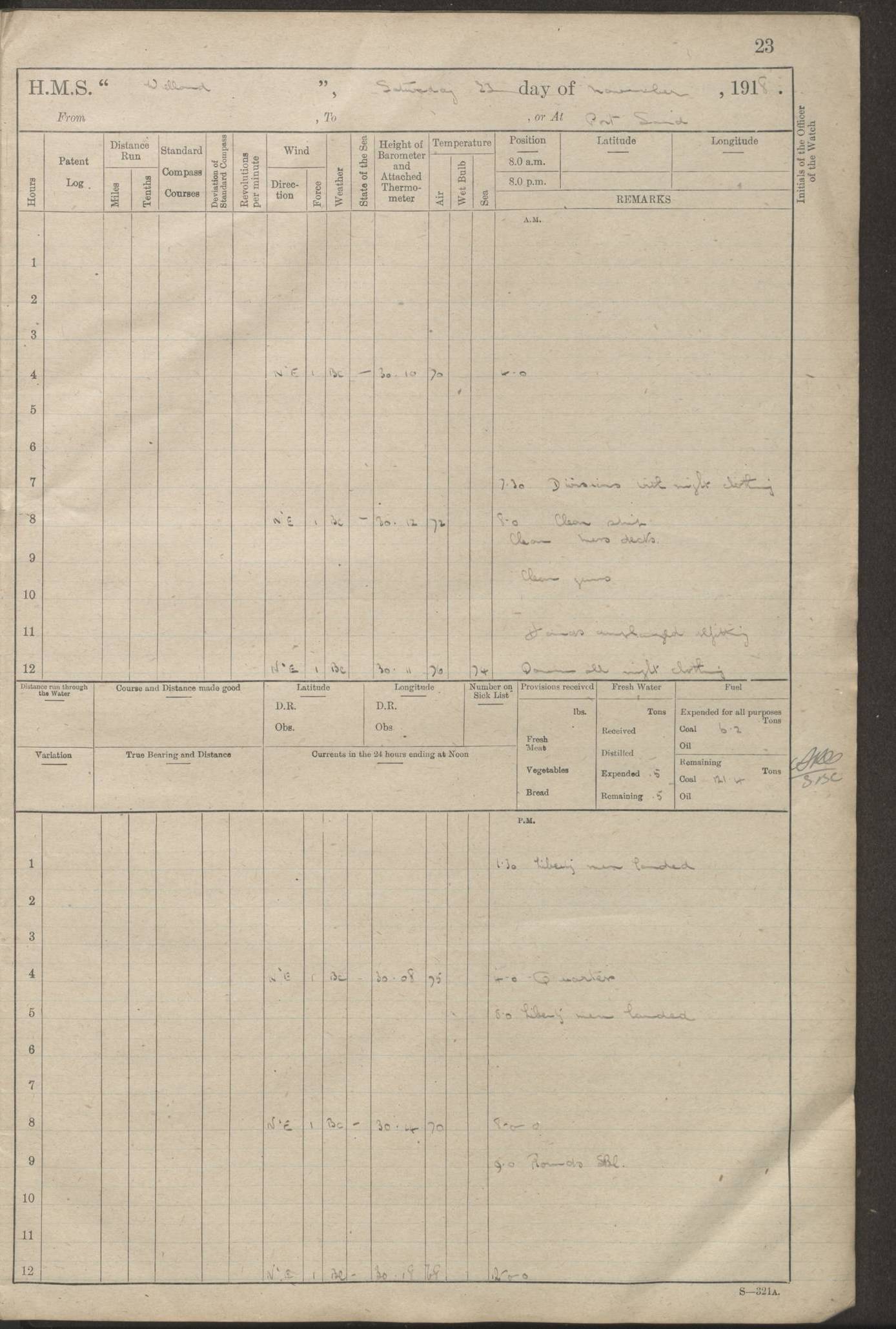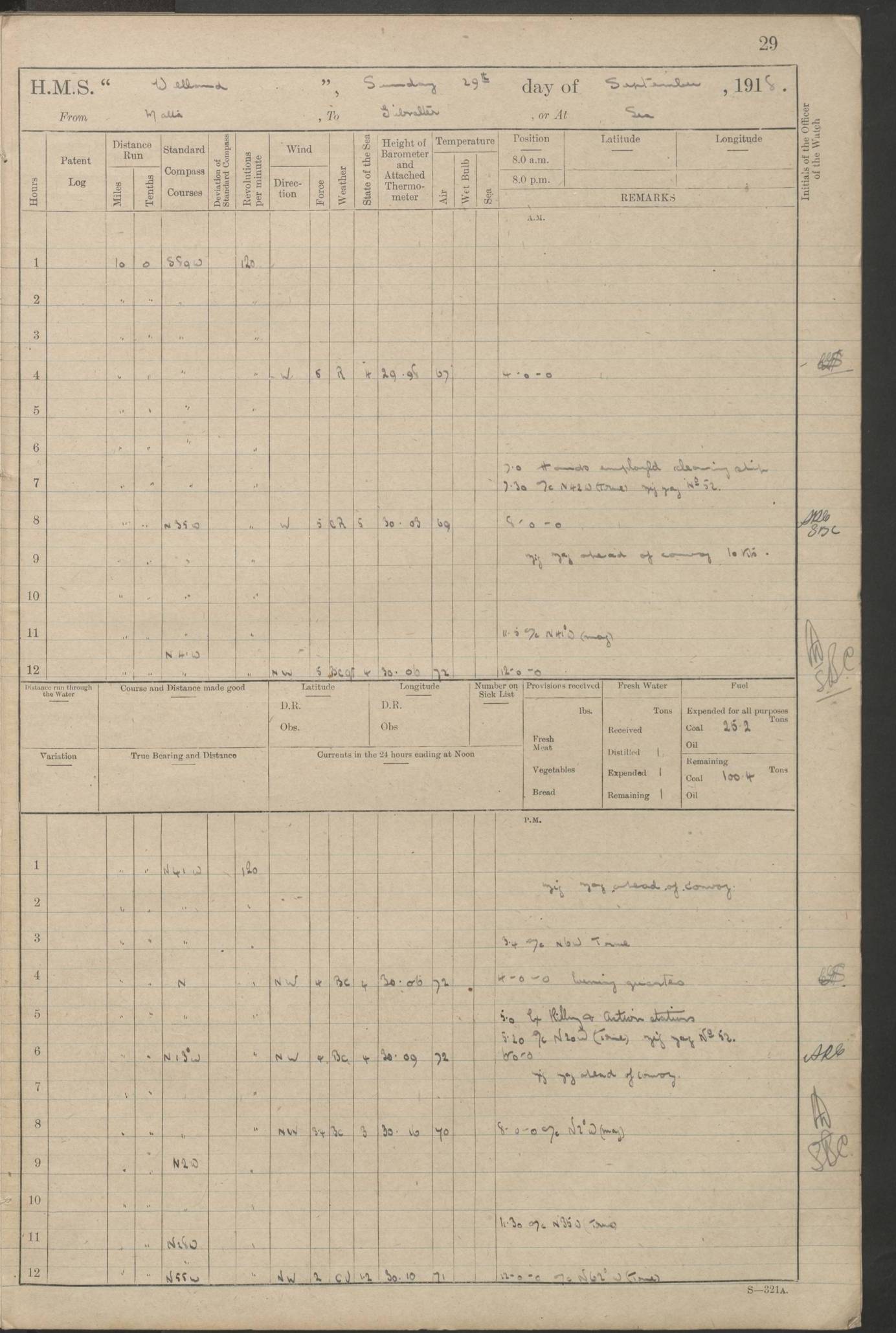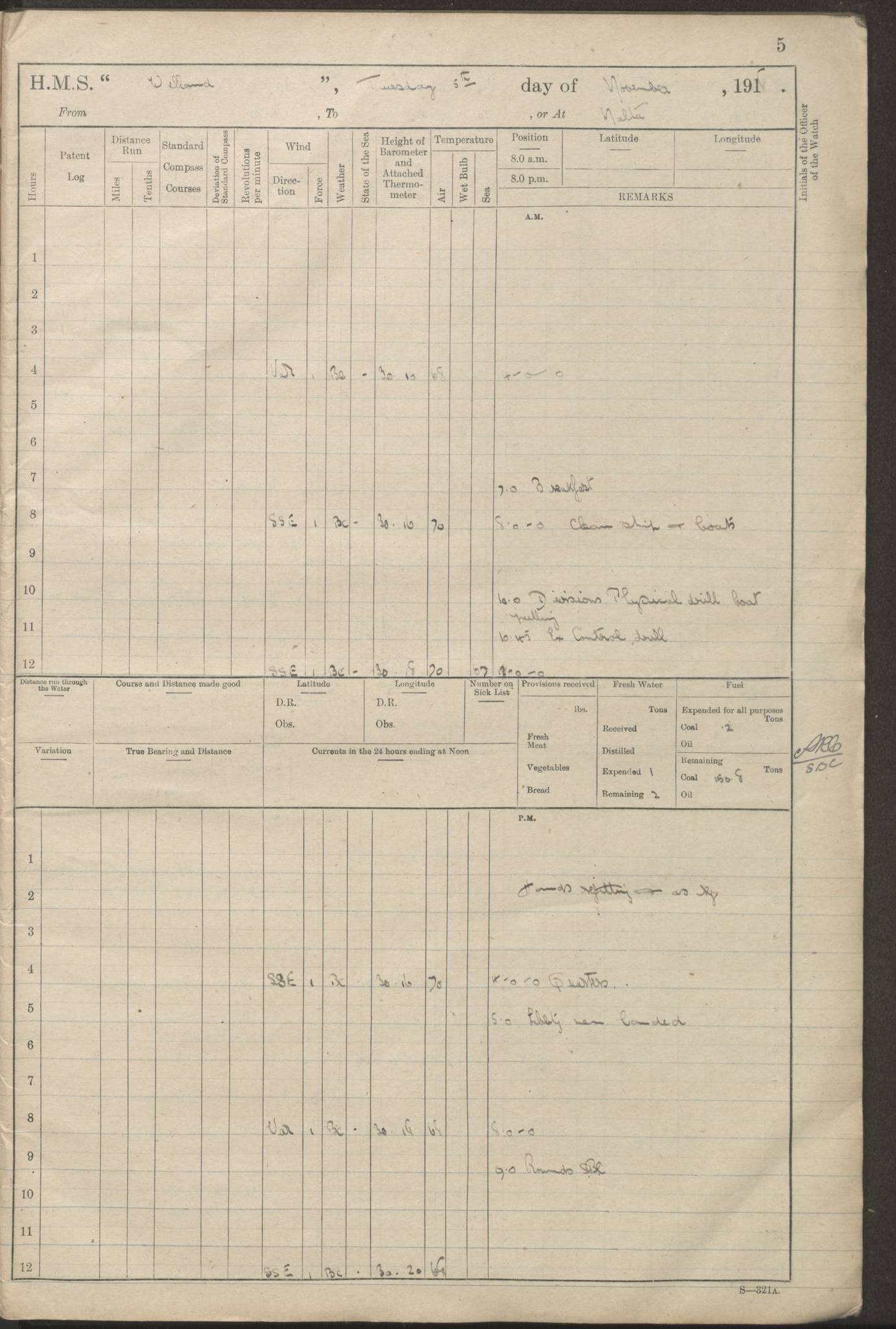 Slipped & went alongside. 10.40am: Finished coaling. Made fast to Buoy. 1.15pm: Hands cleaning ship & with Funeral parties. 4.05pm: Funeral parties landed. 9.00pm: Rounds. 4caf8cabcadfd34197037604: (http://oldweather.s3.amazonaws.com/ADM 53-68364/ADM 53-68364-016_0.jpg) 26 August 1914 Wei Hai Wei Lat 37.1, Long 122.8 4.30am: Lit fires in No. 2 & 3 Boilers. 5.30am: Lit No. 1 Boiler. 7.00am: Took in provisions. 8.00am: Slipped & proceeded. Course as requisite for leaving harbour. 10.30am: NE Prominence bearing South. Altered course SE. 10.50am: Altered course S 65º W. 5.55pm: Took Station astern of FRISIA. 4caf8cabcadfd34197037605: (http://oldweather.s3.amazonaws.com/ADM 53-68364/ADM 53-68364-016_1.jpg) 27 August 1914 Wei hai Wei to Hong Kong Lat 32.4, Long 122.7 1.00am: Course S 5º W. 11 knots. 6.30am: Hands cleaning ship. 9.45am: Reduced to 10 knots. 10.45am: JED detached. 11.00am: Increased to 11 knots. 1.40pm: JED rejoined. 2.00pm: Hands make and mend clothes. 6.30pm: N. Saddle: S 5º W. 9.30pm: Altered course S 6º W. Mid: Altered course S 78º W. 4caf8cabcadfd34197037606: (http://oldweather.s3.amazonaws.com/ADM 53-68364/ADM 53-68364-017_0.jpg) 28 August 1914 Wei Hai Wei to Hong Kong & at Sea Lat 28.2, Long 121.9 1.18am: Sheep Island N 60º W; Tongting S 74º W 4.00am: Tongting N 30º W. 6.45am: Heishan Island SW. 9.00am: Altered course S 35º W. Hands cleaning ship. 1.53pm: Sondan Island abeam. 4.00pm: Altered course S 80º W. 9.53pm: Tung Yung S 50º W. 11.45pm: Tung Yung abeam. 4caf8cabcadfd34197037607: (http://oldweather.s3.amazonaws.com/ADM 53-68364/ADM 53-68364-017_1.jpg) 29 August 1914 Wei Hai Wei to Hong Kong & at Sea Lat 24.5, Long 119.3 5.00am: Turnabout Island NW. Altered course SW. 7.00am: Ocksen Island S 70º W. 8.00am: Ocksen Island abeam. Altered course S 55º W. 10.00am: Hands employed fitting fenders. 12.25pm: Altered course WSW. 1.00pm: Altered course SW by W. 2.00pm: Altered course S 60º W. 3.13pm: Chapel Island abeam 1½ miles. Altered course S 25º W. 6.10pm: Altered course S 40º W. 7.22pm: Brothers abeam. 9.35pm: Altered course S 60º W. 4caf8cabcadfd34197037608: (http://oldweather.s3.amazonaws.com/ADM 53-68364/ADM 53-68364-018_0.jpg) 30 August 1914 Wei Hai Wei to Hong Kong & at Sea Lat 22.2, Long 114.7 1.08am: Breaker Point N 75º W. 5.45am: Chilang Point N 88º W. 8.53am: Sighted Pedro Blanco. 9.55am: Pedro Blanco abeam. 12.08pm: Altered course N 70º W. 1.45pm: Waglan Light. Speed as requisite for Hong Kong. 2.55pm: Secured to No. 7 Buoy. 4.00pm: 1 Senior Petty Officer & 3 Stokers detained in TAMAR on Sick List. 6.00pm: Leave to watch till 6.30am. 9.00pm: Rounds. 4caf8cabcadfd34197037609: (http://oldweather.s3.amazonaws.com/ADM 53-68364/ADM 53-68364-018_1.jpg) 31 August 1914 Hong Kong Lat 22.3, Long 114.2 6.00am: Hands cleaning ship. 8.45am: Hands employed drawing stores & provisions. 11.55am: Shifted from No. 7 to No. 9 Buoy. 12.00pm: Leave to Watch from 6.60pm to 6.30am. 12.30pm: Coal lighter came alongside 12.35pm: Commenced coaling. 4.05pm: Japanese gunboat left harbour. 9.20pm: Finished coaling. LOGS FOR SEPTEMBER 1914 4caf8cabcadfd3419703760a: (http://oldweather.s3.amazonaws.com/ADM 53-68364/ADM 53-68364-019_0.jpg) 1 September 1914 Hong Kong Lat 22.3, Long 114.2 6.00am: Hands reeving new boats falls. 8.30am: Sent party to Dockyard. 11.05am: Dockyard party returned. 11.30am: Typhoon signals hoisted. 1.30pm: 1 Rating joined ship. 2.00pm: Hands employed drawing stores. 7.00pm: 1 Able Seaman joined from KENNET. 4caf8cabcadfd3419703760b: (http://oldweather.s3.amazonaws.com/ADM 53-68364/ADM 53-68364-019_1.jpg) 2 September 1914 Hong Kong Lat 22.3, Long 114.2 6.00am: Hands employed cleaning ship. 8.45am: Hands fitting wires & canvas gear. 1.15pm: Hands employed cleaning ship. 2.10pm: Coal lighter came alongside. 9.00pm: Rounds. 4caf8cabcadfd3419703760c: (http://oldweather.s3.amazonaws.com/ADM 53-68364/ADM 53-68364-020_0.jpg) 3 September 1914 Hong Kong to Sea Lat 22.3, Long 114.2 6.30am: Hands employed cleaning ship. 9.00am: Hands rigging new awning gear & fittings. 1.00pm: Hands make and mend clothes. 5.45pm: Slipped & proceeded. Course & speed as requisite for Lye Mun. 7.154pm: Waglan SW. Altered course S 30º E. 4caf8cabcadfd3419703760d: (http://oldweather.s3.amazonaws.com/ADM 53-68364/ADM 53-68364-020_1.jpg) 4 September 1914 At Sea Lat 20.2, Long 115.7 5.00am: Heavy rain squall. 7.30am: Altered course S 20º E. 9.00am: Altered course S 22º E. 10.00am: Hands employed cleaning ship. 12.57pm: Altered course S 19º E. 1.00pm: Hands piped down. 5.45pm: Took station astern of KENNET. 6.30pm: Darkened ship. 4caf8cabcadfd3419703760e: (http://oldweather.s3.amazonaws.com/ADM 53-68364/ADM 53-68364-021_0.jpg) 5 September 1914 At Sea Lat 16.5, Long 117.0 2.33am: Stopped. Half astern. 2.35am: Full ahead both. Collier SKERRIES grazed port propeller guard. 6.00am: Reserved Station in line. 9.00am: Hands employed cleaning & oiling out all guns. 11.15am: Took Station astern of JED. 1.00pm: Hands piped down. 6.45pm: Darkened ship. 4caf8cabcadfd3419703760f: (http://oldweather.s3.amazonaws.com/ADM 53-68364/ADM 53-68364-021_1.jpg) 6 September 1914 Hong Kong to Pandarochan Bay or at Sea Lat 13.8, Long 119.3 2.30am: Altered course S 70º E. Sub Lieutenant R. Leeds was found asleep whilst in charge of the Watch; the Flotilla at the time were steaming without lights. 6.30am: Hands employed cleaning ship. 9.00am: Read Prayers. Hands piped down. 5.45pm: Eased as requisite for taking Station astern. 9.00pm: Cabra Light N 15º W. Altered course S 35º E. 4caf8cabcadfd34197037610: (http://oldweather.s3.amazonaws.com/ADM 53-68364/ADM 53-68364-022_0.jpg) 7 September 1914 Hong Kong to Pandarochan Bay Lat 11.6, Long 121.2 2.40am: Apo Light abeam. Altered course S 25º E. 4.00am: Altered course S 22º E. 6.50am: Altered course ESE. 7.25am: Altered course as requisite for anchorage. 9.40am: Anchored in 8 fathoms with 4 shackles. 11.00am: Hands employed cleaning ship. 1.00pm: Hands piped dow