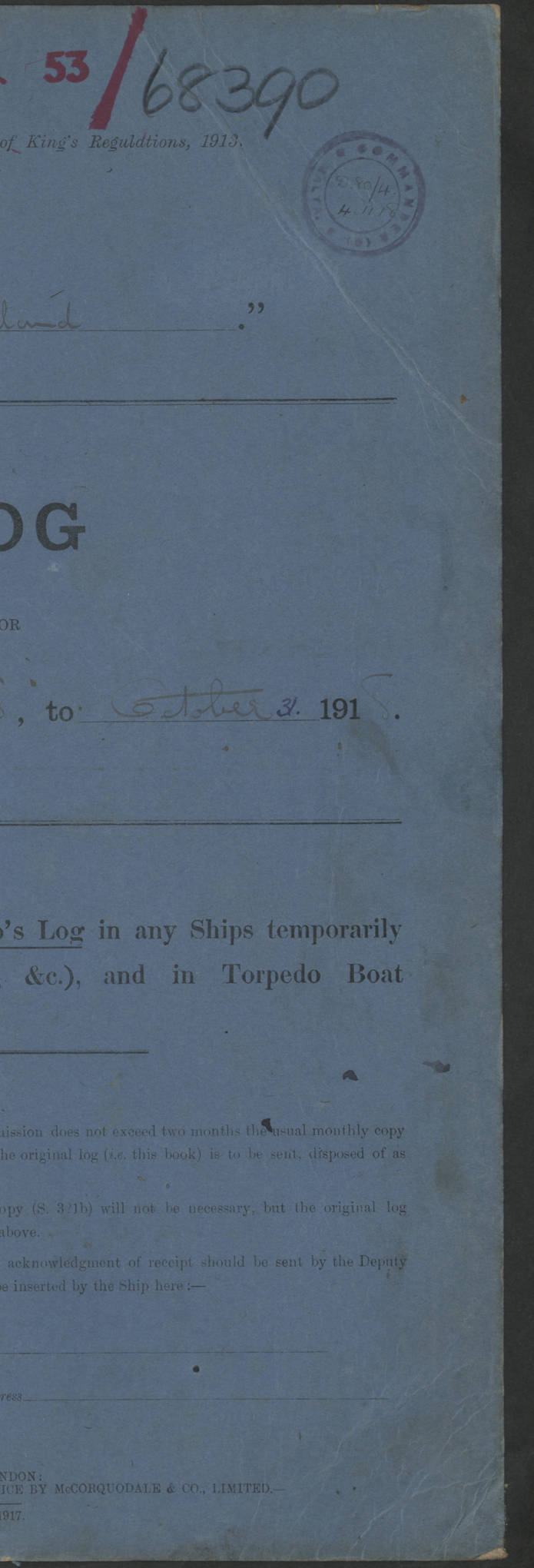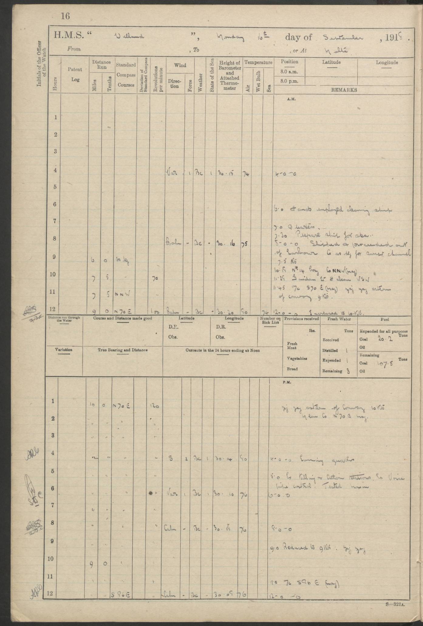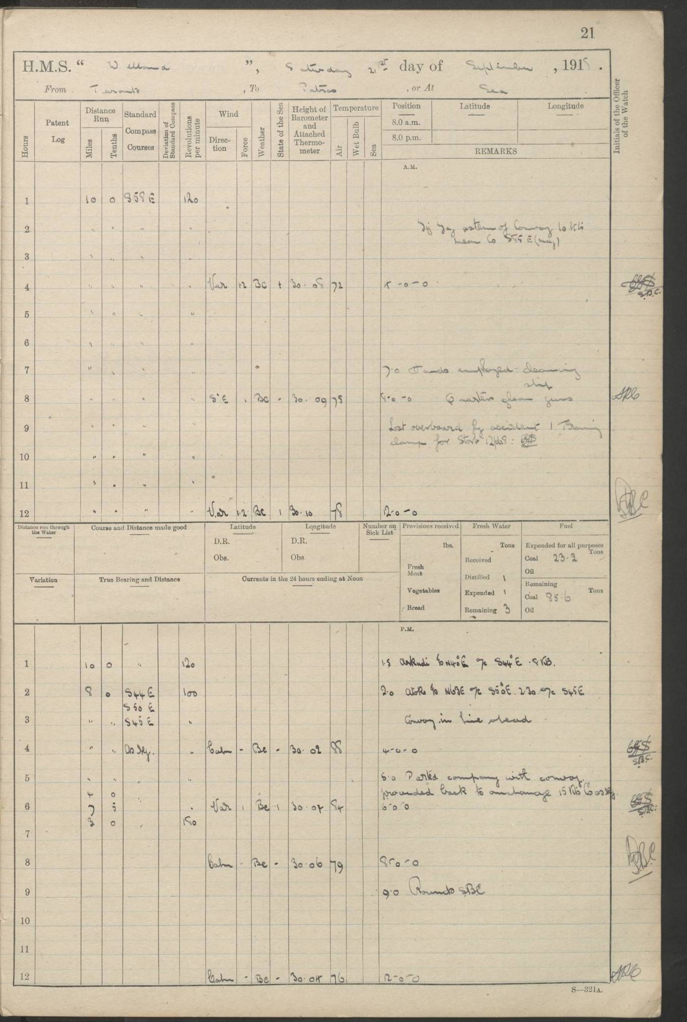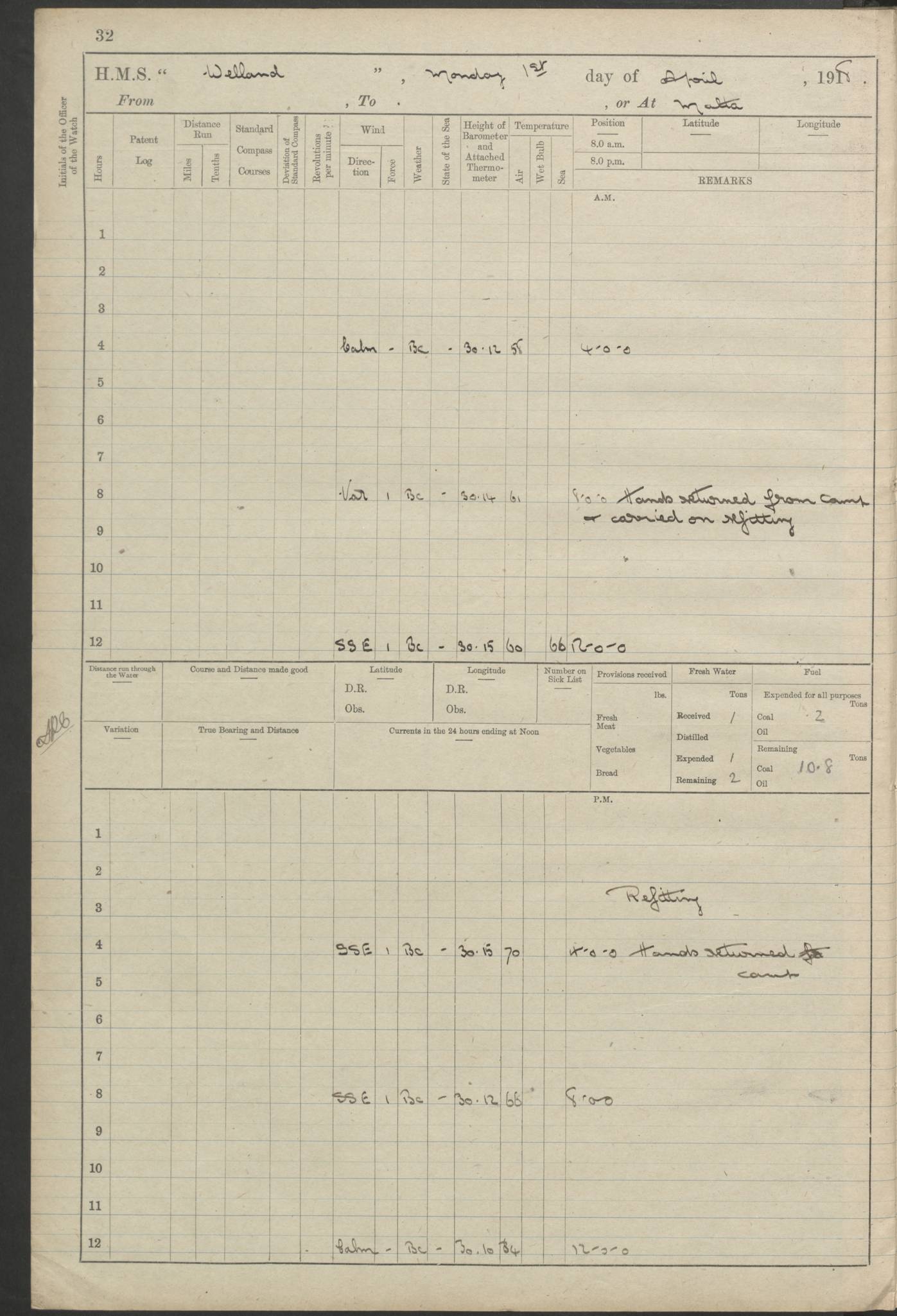 Slipped & went alongside. 10.40am: Finished coaling. Made fast to Buoy. 1.15pm: Hands cleaning ship & with Funeral parties. 4.05pm: Funeral parties landed. 9.00pm: Rounds. 4caf8cabcadfd34197037604: (http://oldweather.s3.amazonaws.com/ADM 53-68364/ADM 53-68364-016_0.jpg) 26 August 1914 Wei Hai Wei Lat 37.1, Long 122.8 4.30am: Lit fires in No. 2 & 3 Boilers. 5.30am: Lit No. 1 Boiler. 7.00am: Took in provisions. 8.00am: Slipped & proceeded. Course as requisite for leaving harbour. 10.30am: NE Prominence bearing South. Altered course SE. 10.50am: Altered course S 65º W. 5.55pm: Took Station astern of FRISIA. 4caf8cabcadfd34197037605: (http://oldweather.s3.amazonaws.com/ADM 53-68364/ADM 53-68364-016_1.jpg) 27 August 1914 Wei hai Wei to Hong Kong Lat 32.4, Long 122.7 1.00am: Course S 5º W. 11 knots. 6.30am: Hands cleaning ship. 9.45am: Reduced to 10 knots. 10.45am: JED detached. 11.00am: Increased to 11 knots. 1.40pm: JED rejoined. 2.00pm: Hands make and mend clothes. 6.30pm: N. Saddle: S 5º W. 9.30pm: Altered course S 6º W. Mid: Altered course S 78º W. 4caf8cabcadfd34197037606: (http://oldweather.s3.amazonaws.com/ADM 53-68364/ADM 53-68364-017_0.jpg) 28 August 1914 Wei Hai Wei to Hong Kong & at Sea Lat 28.2, Long 121.9 1.18am: Sheep Island N 60º W; Tongting S 74º W 4.00am: Tongting N 30º W. 6.45am: Heishan Island SW. 9.00am: Altered course S 35º W. Hands cleaning ship. 1.53pm: Sondan Island abeam. 4.00pm: Altered course S 80º W. 9.53pm: Tung Yung S 50º W. 11.45pm: Tung Yung abeam. 4caf8cabcadfd34197037607: (http://oldweather.s3.amazonaws.com/ADM 53-68364/ADM 53-68364-017_1.jpg) 29 August 1914 Wei Hai Wei to Hong Kong & at Sea Lat 24.5, Long 119.3 5.00am: Turnabout Island NW. Altered course SW. 7.00am: Ocksen Island S 70º W. 8.00am: Ocksen Island abeam. Altered course S 55º W. 10.00am: Hands employed fitting fenders. 12.25pm: Altered course WSW. 1.00pm: Altered course SW by W. 2.00pm: Altered course S 60º W. 3.13pm: Chapel Island abeam 1½ miles. Altered course S 25º W. 6.10pm: Altered course S 40º W. 7.22pm: Brothers abeam. 9.35pm: Altered course S 60º W. 4caf8cabcadfd34197037608: (http://oldweather.s3.amazonaws.com/ADM 53-68364/ADM 53-68364-018_0.jpg) 30 August 1914 Wei Hai Wei to Hong Kong & at Sea Lat 22.2, Long 114.7 1.08am: Breaker Point N 75º W. 5.45am: Chilang Point N 88º W. 8.53am: Sighted Pedro Blanco. 9.55am: Pedro Blanco abeam. 12.08pm: Altered course N 70º W. 1.45pm: Waglan Light. Speed as requisite for Hong Kong. 2.55pm: Secured to No. 7 Buoy. 4.00pm: 1 Senior Petty Officer & 3 Stokers detained in TAMAR on Sick List. 6.00pm: Leave to watch till 6.30am. 9.00pm: Rounds. 4caf8cabcadfd34197037609: (http://oldweather.s3.amazonaws.com/ADM 53-68364/ADM 53-68364-018_1.jpg) 31 August 1914 Hong Kong Lat 22.3, Long 114.2 6.00am: Hands cleaning ship. 8.45am: Hands employed drawing stores & provisions. 11.55am: Shifted from No. 7 to No. 9 Buoy. 12.00pm: Leave to Watch from 6.60pm to 6.30am. 12.30pm: Coal lighter came alongside 12.35pm: Commenced coaling. 4.05pm: Japanese gunboat left harbour. 9.20pm: Finished coaling. LOGS FOR SEPTEMBER 1914 4caf8cabcadfd3419703760a: (http://oldweather.s3.amazonaws.com/ADM 53-68364/ADM 53-68364-019_0.jpg) 1 September 1914 Hong Kong Lat 22.3, Long 114.2 6.00am: Hands reeving new boats falls. 8.30am: Sent party to Dockyard. 11.05am: Dockyard party returned. 11.30am: Typhoon signals hoisted. 1.30pm: 1 Rating joined ship. 2.00pm: Hands employed drawing stores. 7.00pm: 1 Able Seaman joined from KENNET. 4caf8cabcadfd3419703760b: (http://oldweather.s3.amazonaws.com/ADM 53-68364/ADM 53-68364-019_1.jpg) 2 September 1914 Hong Kong Lat 22.3, Long 114.2 6.00am: Hands employed cleaning ship. 8.45am: Hands fitting wires & canvas gear. 1.15pm: Hands employed cleaning ship. 2.10pm: Coal lighter came alongside. 9.00pm: Rounds. 4caf8cabcadfd3419703760c: (http://oldweather.s3.amazonaws.com/ADM 53-68364/ADM 53-68364-020_0.jpg) 3 September 1914 Hong Kong to Sea Lat 22.3, Long 114.2 6.30am: Hands employed cleaning ship. 9.00am: Hands rigging new awning gear & fittings. 1.00pm: Hands make and mend clothes. 5.45pm: Slipped & proceeded. Course & speed as requisite for Lye Mun. 7.154pm: Waglan SW. Altered course S 30º E. 4caf8cabcadfd3419703760d: (http://oldweather.s3.amazonaws.com/ADM 53-68364/ADM 53-68364-020_1.jpg) 4 September 1914 At Sea Lat 20.2, Long 115.7 5.00am: Heavy rain squall. 7.30am: Altered course S 20º E. 9.00am: Altered course S 22º E. 10.00am: Hands employed cleaning ship. 12.57pm: Altered course S 19º E. 1.00pm: Hands piped down. 5.45pm: Took station astern of KENNET. 6.30pm: Darkened ship. 4caf8cabcadfd3419703760e: (http://oldweather.s3.amazonaws.com/ADM 53-68364/ADM 53-68364-021_0.jpg) 5 September 1914 At Sea Lat 16.5, Long 117.0 2.33am: Stopped. Half astern. 2.35am: Full ahead both. Collier SKERRIES grazed port propeller guard. 6.00am: Reserved Station in line. 9.00am: Hands employed cleaning & oiling out all guns. 11.15am: Took Station astern of JED. 1.00pm: Hands piped down. 6.45pm: Darkened ship. 4caf8cabcadfd3419703760f: (http://oldweather.s3.amazonaws.com/ADM 53-68364/ADM 53-68364-021_1.jpg) 6 September 1914 Hong Kong to Pandarochan Bay or at Sea Lat 13.8, Long 119.3 2.30am: Altered course S 70º E. Sub Lieutenant R. Leeds was found asleep whilst in charge of the Watch; the Flotilla at the time were steaming without lights. 6.30am: Hands employed cleaning ship. 9.00am: Read Prayers. Hands piped down. 5.45pm: Eased as requisite for taking Station astern. 9.00pm: Cabra Light N 15º W. Altered course S 35º E. 4caf8cabcadfd34197037610: (http://oldweather.s3.amazonaws.com/ADM 53-68364/ADM 53-68364-022_0.jpg) 7 September 1914 Hong Kong to Pandarochan Bay Lat 11.6, Long 121.2 2.40am: Apo Light abeam. Altered course S 25º E. 4.00am: Altered course S 22º E. 6.50am: Altered course ESE. 7.25am: Altered course as requisite for anchorage. 9.40am: Anchored in 8 fathoms with 4 shackles. 11.00am: Hands employed cleaning ship. 1.00pm: Hands piped dow