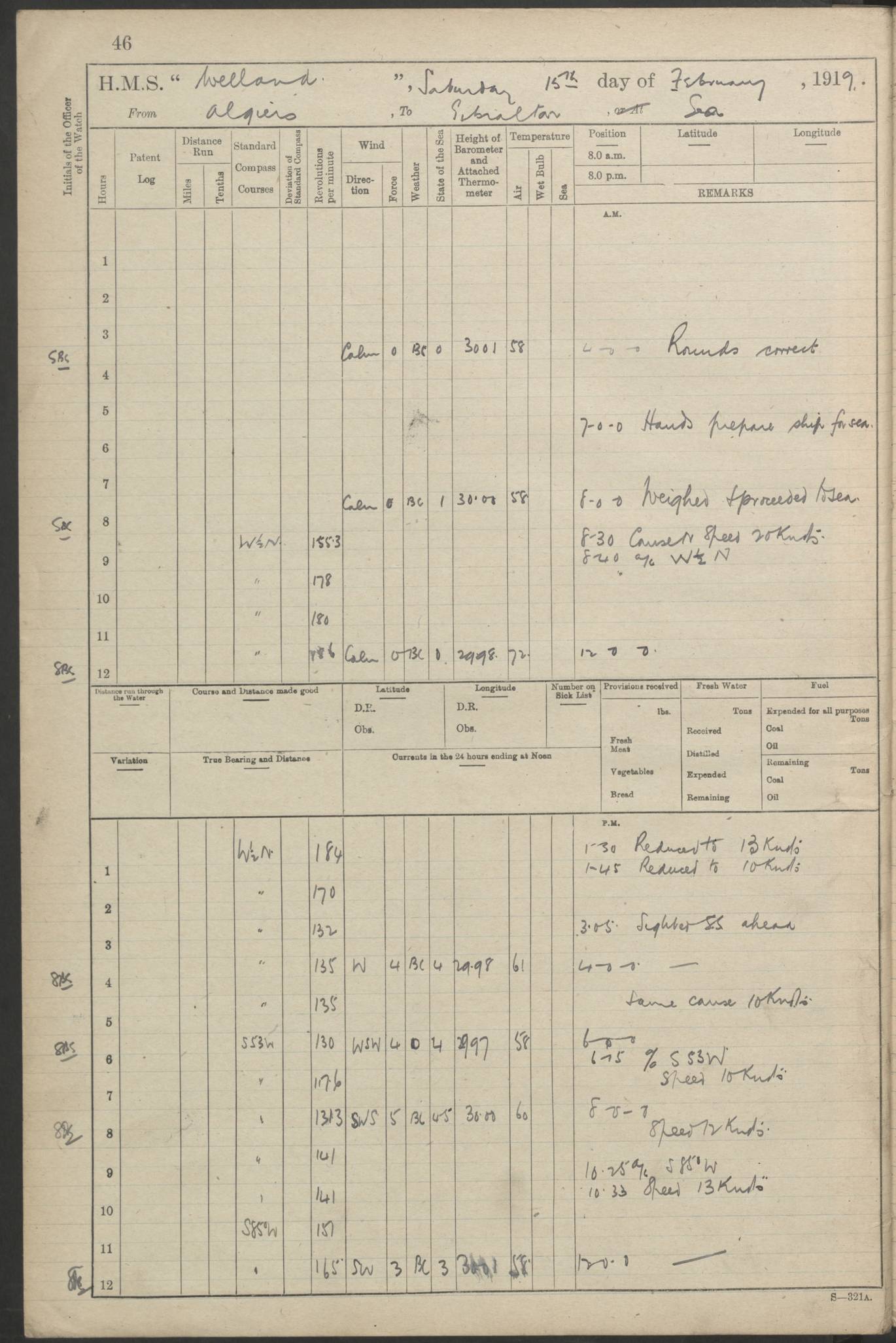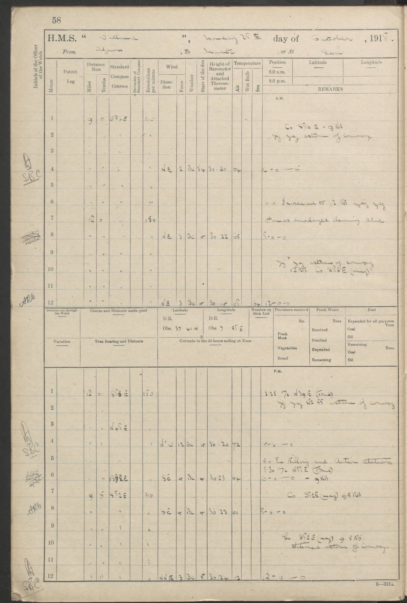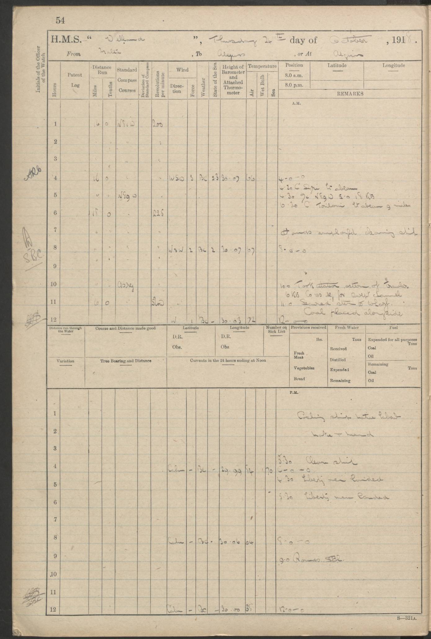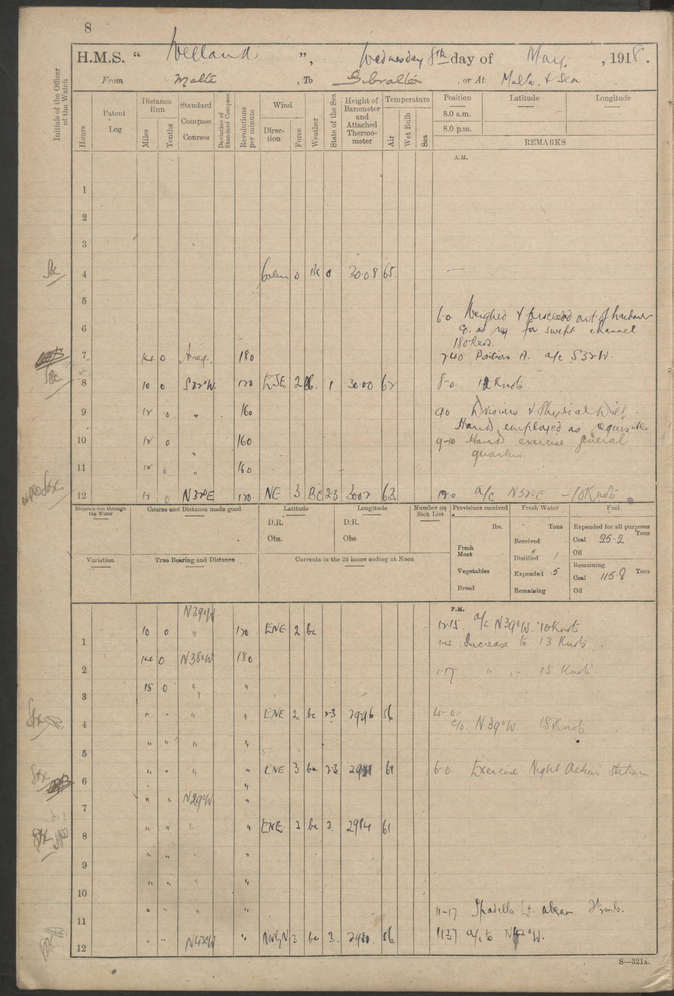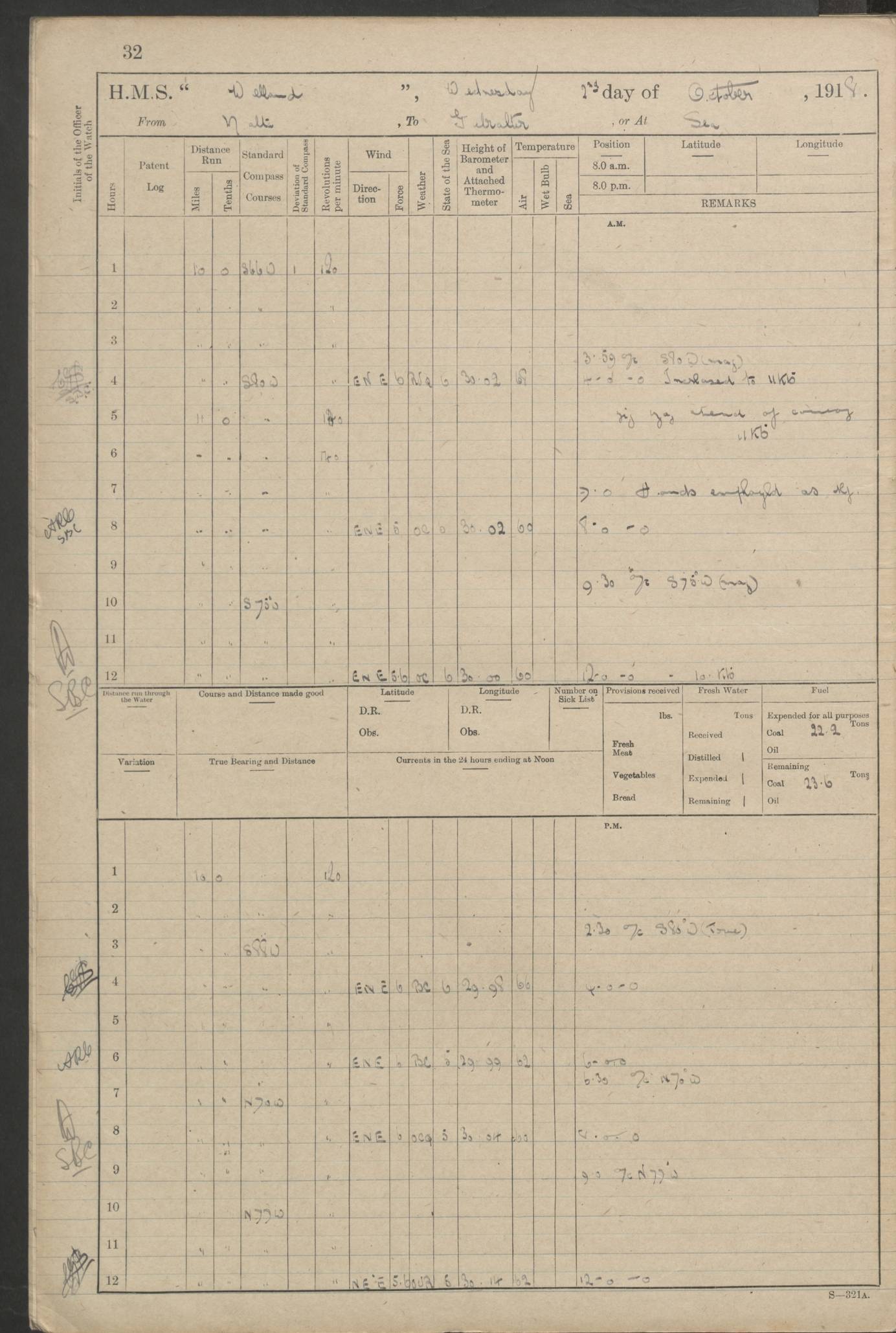 4caf8cb3cadfd34197037855: (http://oldweather.s3.amazonaws.com/ADM 53-68373/ADM 53-68373-011_1.jpg) 17 January 1916 Malta Lat 35.89, Long 14.51 8.30am: Hands restowing bunker rack* and drawing gear from lay-apart store in dockyard. 1.30pm: Hands cleaning out whaler and dinghy and returning gear to dockyard. [Not mentioned in the log but it is very likely that the starboard watch also got a run ashore.] 4.50pm: Joined for passage to England, one RM Bandmaster, one SPO and one RM Drummer. * Coal bunkers are not filled right up to the deck, to allow access to the coal trimmers, so to utilise some of the space, racks are fitted to the underside of the deck for stowing lumber, lengths of iron and the like. 4caf8cb3cadfd34197037856: (http://oldweather.s3.amazonaws.com/ADM 53-68373/ADM 53-68373-012_0.jpg) 18 January 1916 Malta and at sea for Algiers Lat 36.23, Long 13.85 7.40am: HMS’ Talbot and Minstrel arrived in harbour. 8.15am: Slipped and proceeded to sea. 8.45am: Passed transport SS Orsova and set course N40W. 12.30pm: A/c N68W. 3.30pm: Overtook SS Bardon Hall [?] steering same course. 3.45pm: Pantelleria I. on starboard bow, a/c N64W. 9.40pm: Cap Bon bg N60W. 10.35pm: Passed French cruiser Jeanne d’Arc steaming ESE, 5 miles on starboard beam. 11.00pm: C Bon bg West, 12 miles, a/c N55W. 4caf8cb3cadfd34197037857: (http://oldweather.s3.amazonaws.com/ADM 53-68373/ADM 53-68373-012_1.jpg) 19 January 1916 At sea Lat 37.23, Long 8.19 1.00am: C Bon Lt bg S34E. 8.05am: Cap Serrat abeam, bg S10E. 10.00am: Passed hospital ship steering East. 11.25am: Passed SS Sarpedon (Dutch) steering East. 4.10pm: Cap de Fer bg South, 6 miles. Passed SS Newisbrook [?], same course. 4.45pm: Passed SS’ Plymouth and Boston steering opposite course. 6.15pm: Cap Bougaroni abeam 4 miles, a/c N83W. 9.45pm: Hospital ship passed steering to Westward. 11.00pm: Cape Carbon bg S40W. 11.59pm: C Sigli [Sigri in log] Lt bg S60W. 4caf8cb3cadfd34197037858: (http://oldweather.s3.amazonaws.com/ADM 53-68373/ADM 53-68373-013_0.jpg) 20 January 1916 At sea to Algiers and at sea Lat 36.75, Long 3.06 1.30am: Sigli Lt abeam. 8.30am: SS Zealand (Br) passed reporting having sighted periscope 3 miles to East, a/c as requisite for searching. 9.30am: Fired one round at object like periscope and closed. Object turned out to be a broken boat of the Japanese SS Yaku Maru and hoisted it onboard. 9.45am: SS’ Knight of the Garter and City of Edinburgh signalled names. 10.30am: Courses to enter port of Algiers. Anchored and secured stern to jetty. Noon: Coal lighter alongside. Received 50 tons from Watt and Watt & Co of Algiers, native labour. 4.50pm: Weighed and proceeded to sea. 6.00pm: Set course N88W, 12 knots. 6.20pm: Cape Caxine abeam, 5 miles. 4caf8cb3cadfd34197037859: (http://oldweather.s3.amazonaws.com/ADM 53-68373/ADM 53-68373-013_1.jpg) 21 January 1916 At sea for Gibraltar Lat 35.89, Long -0.8 11.20am: Passed French trawler patrol (DL659) (B2-93) (B.10). 7.55pm: Alboran I. Lt bg N55W. 9.00pm: Same abeam, 3.25 miles. 4caf8cb3cadfd3419703785a: (http://oldweather.s3.amazonaws.com/ADM 53-68373/ADM 53-68373-014_0.jpg) 22 January 1916 At sea to Gibraltar Lat 36.15, Long -5.37 2.00am: Large steamer with no lights passed steering East. 6.40am: Courses for Gibraltar harbour. 8.30am: Secured alongside Southern Mole. 3.00pm: Landed libertymen. 4caf8cb3cadfd3419703785b: (http://oldweather.s3.amazonaws.com/ADM 53-68373/ADM 53-68373-014_1.jpg) 23 January 1916 Gibraltar and at sea Lat 36.15, Long -5.37 8.00am: Commenced coaling (native labour). 11.00am: HMS Talbot in. 11.55am: Completed with coal (115 tons) from NSO Gibraltar. 12.15pm: Slipped jetty and proceeded to sea. 2.10pm: Tarifa Lt bg North, 2 miles. 4caf8cb3cadfd3419703785c: (http://oldweather.s3.amazonaws.com/ADM 53-68373/ADM 53-68373-015_0.jpg) 24 January 1916 At sea for UK Lat 38.42, Long -9.5 2.55am: Cape St Vincent Light bg N20W. 4.45am: Same abeam. 8.45am: Hands striking down coal on upper deck. 1.50pm: Cape Roca Lt [Cabo da Roca] bg E, 1.5 miles. 5.00pm: Burling Lighthouse [Ilhas de Berlengas] abeam 8 miles. 4caf8cb3cadfd3419703785d: (http://oldweather.s3.amazonaws.com/ADM 53-68373/ADM 53-68373-015_1.jpg) 25 January 1916 At sea Lat 43.22, Long -9.42 [Latitude in log 23º, clearly incorrect] 6.30am: Two steamers passed to port on opposite course. 10.10am: C Finisterre abeam. 5.00pm: Steamer passed on opposite course. 5.30pm: Ditto. 4caf8cb3cadfd3419703785e: (http://oldweather.s3.amazonaws.com/ADM 53-68373/ADM 53-68373-016_0.jpg) 26 January 1916 At sea Lat 48.1, Long -8.5 6.05am: Steamer passed on opposite course. 5.45pm: Steamer passed steering WSW. 4caf8cb3cadfd3419703785f: (http://oldweather.s3.amazonaws.com/ADM 53-68373/ADM 53-68373-016_1.jpg) 27 January 1916 At sea to Queenstown Lat 51.842, Long -8.3 6.00am: Kinsale Head Light on port bow. 7.00am: Awaiting daylight off Queenstown harbour. 7.45am: Entered harbour and secured to buoy. 10.30am: Tug Shamrock put ship alongside jetty. 3.00pm: Ratings taking passage to England left. 4caf8cb3cadfd34197037860: (http://oldweather.s3.amazonaws.com/ADM 53-68373/ADM 53-68373-017_0.jpg) 28 January 1916 Lat 51.842, Long -8.3 Hands employed returning stores and gear to dockyard. 4caf8cb3cadfd34197037861: (http://oldweather.s3.amazonaws.com/ADM 53-68373/ADM 53-68373-017_1.jpg) 29 January 1916 Haulbowline Lat 51.842, Long -8.3 Hands returning torpedoes to dockyard. 1.30pm: Landed libertymen. 4caf8cb3cadfd34197037862: (http://oldweather.s3.amazonaws.com/ADM 53-68373/ADM 53-68373-018_0.jpg) 30 January 1916 Haulbowline Lat 51.842, Long -8.3 Sunday routine. 4caf8cb3cadfd34197037863: (http://oldweather.s3.amazonaws.com/ADM 53-68373/ADM 53-68373-018_1.jpg) 31 January 1916 Haulbowline Lat 51.842, Long -8.3 Hands employed sending down topmast. 1.30pm: Landed libertymen. LOGS FOR FEBRUARY 1916 [Haulbowline for docking and refit] 4caf8cb3cadfd34197037864: (http://oldweather.s3.amazonaws.com/ADM 53-68373/ADM 53-68373-019_0.jpg) 1 February 1916 Haulbowline Lat