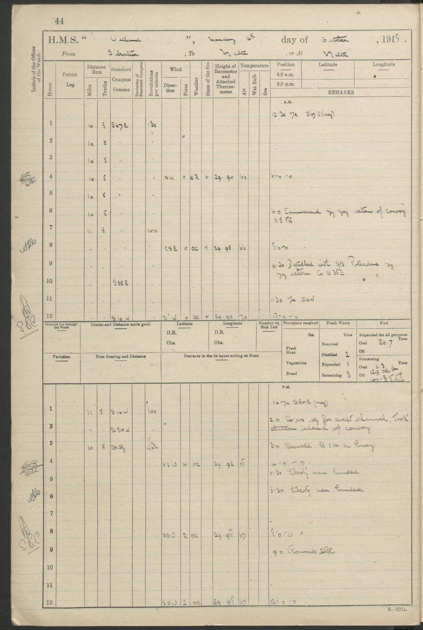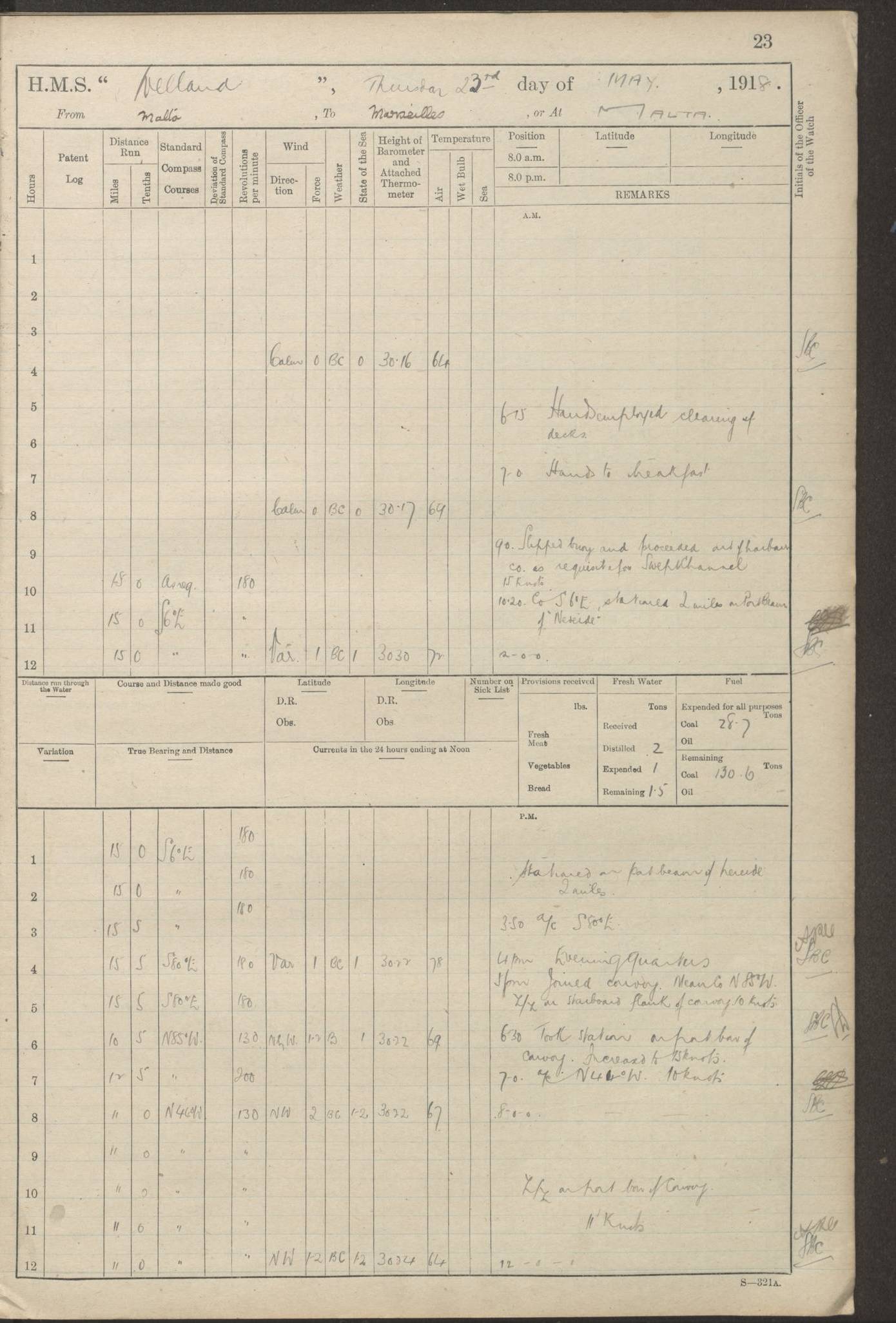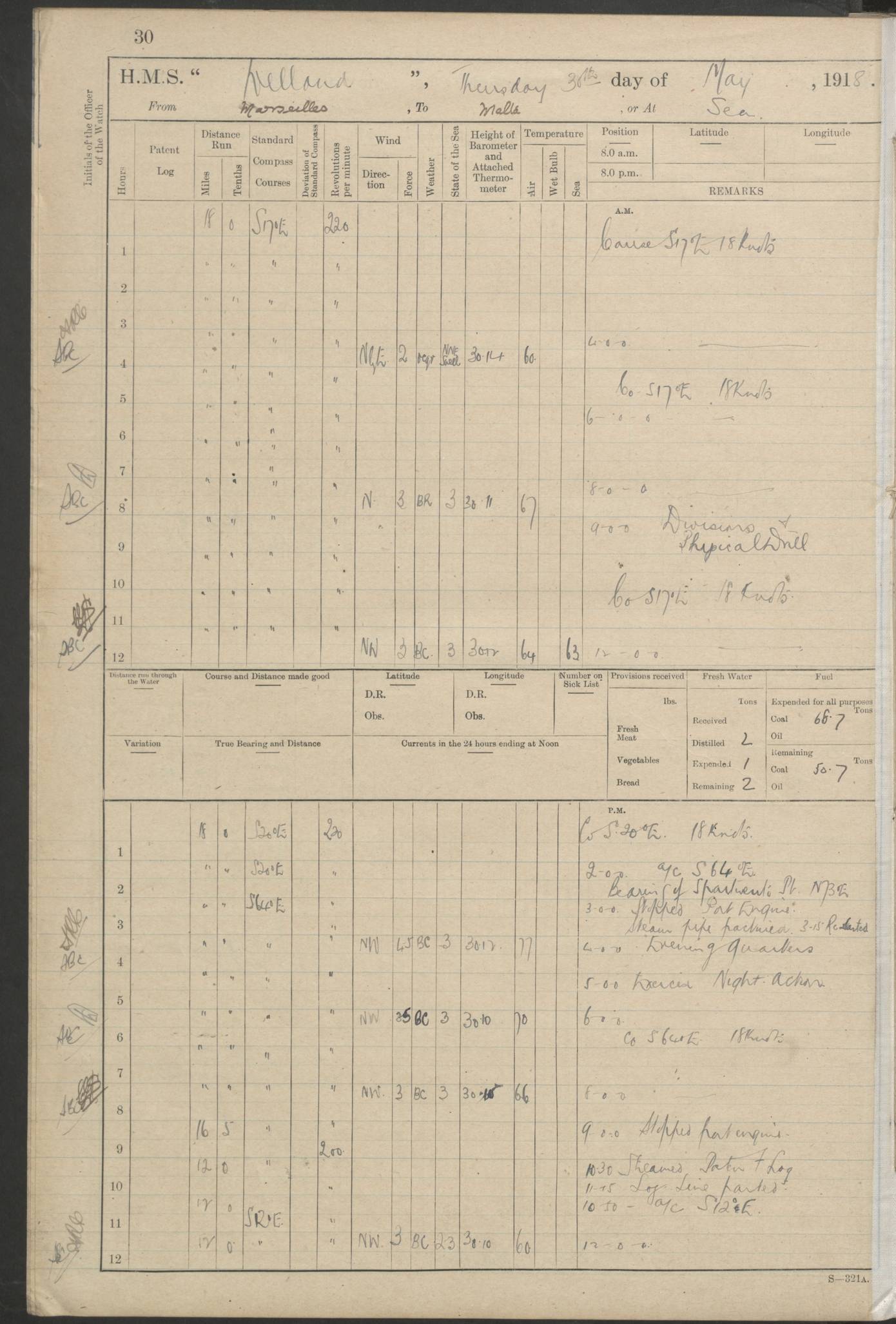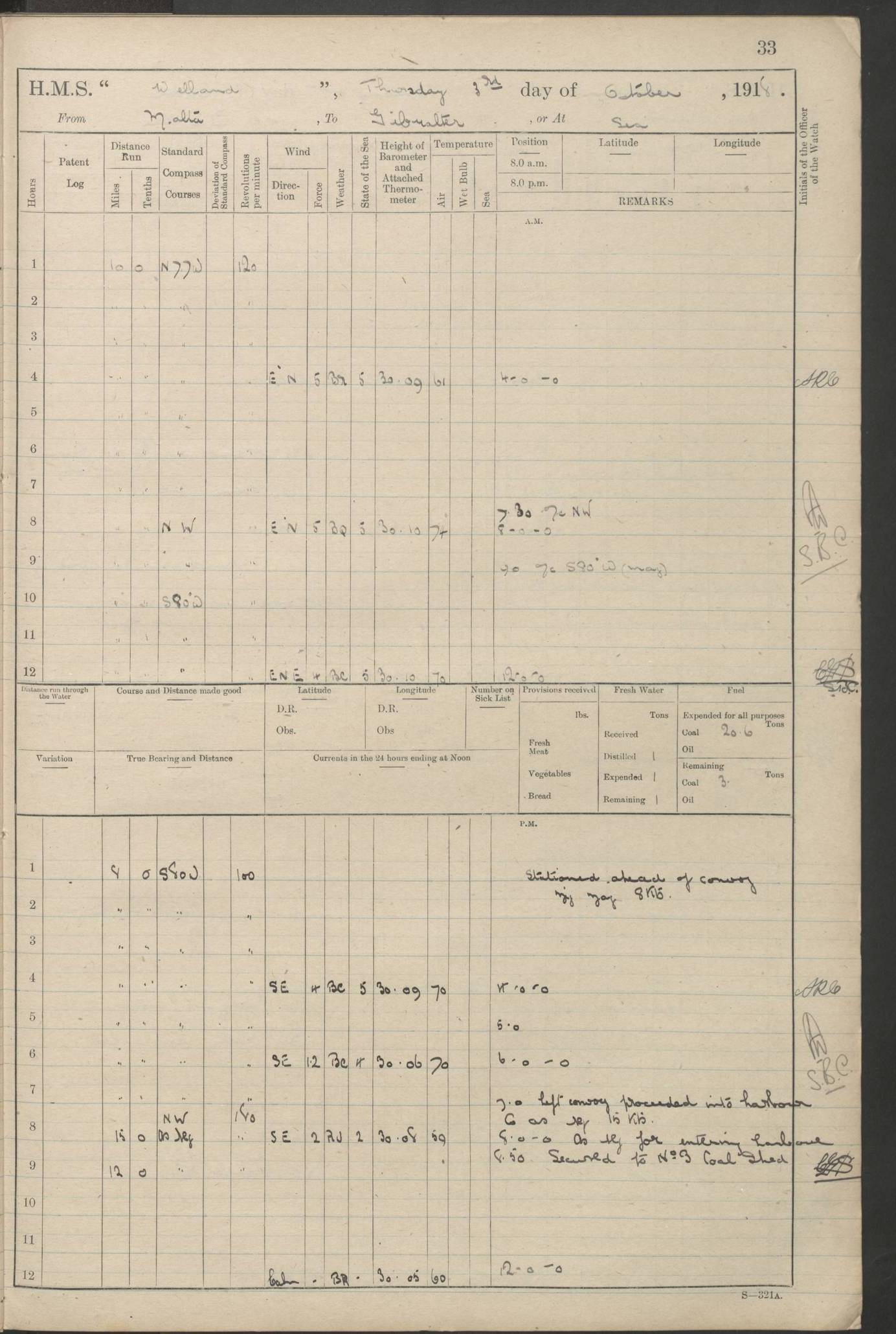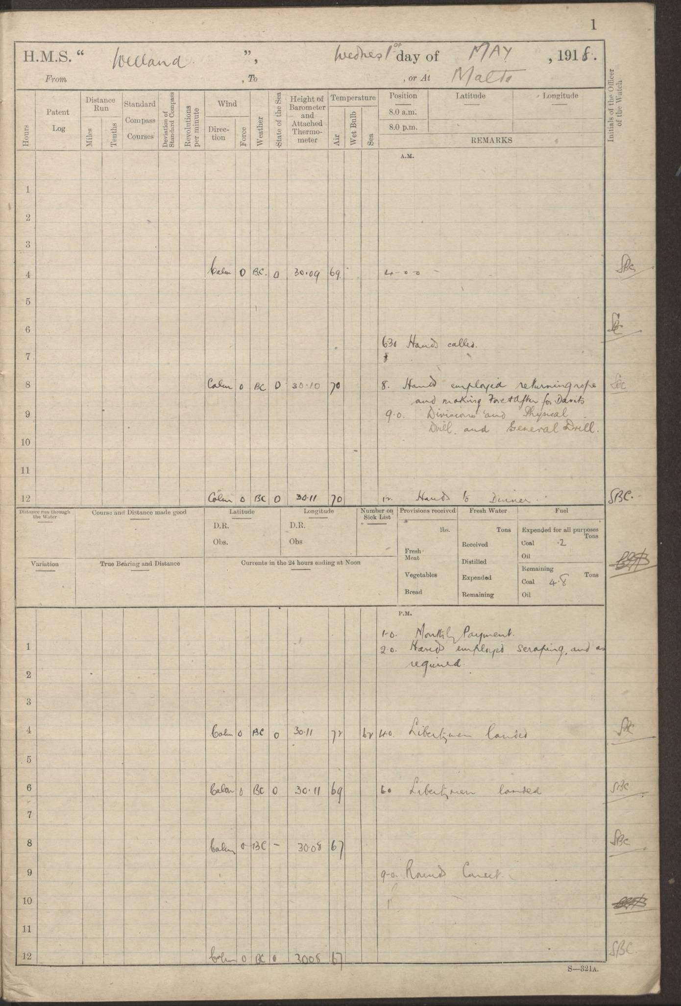 4caf8cb3cadfd34197037855: (http://oldweather.s3.amazonaws.com/ADM 53-68373/ADM 53-68373-011_1.jpg) 17 January 1916 Malta Lat 35.89, Long 14.51 8.30am: Hands restowing bunker rack* and drawing gear from lay-apart store in dockyard. 1.30pm: Hands cleaning out whaler and dinghy and returning gear to dockyard. [Not mentioned in the log but it is very likely that the starboard watch also got a run ashore.] 4.50pm: Joined for passage to England, one RM Bandmaster, one SPO and one RM Drummer. * Coal bunkers are not filled right up to the deck, to allow access to the coal trimmers, so to utilise some of the space, racks are fitted to the underside of the deck for stowing lumber, lengths of iron and the like. 4caf8cb3cadfd34197037856: (http://oldweather.s3.amazonaws.com/ADM 53-68373/ADM 53-68373-012_0.jpg) 18 January 1916 Malta and at sea for Algiers Lat 36.23, Long 13.85 7.40am: HMS’ Talbot and Minstrel arrived in harbour. 8.15am: Slipped and proceeded to sea. 8.45am: Passed transport SS Orsova and set course N40W. 12.30pm: A/c N68W. 3.30pm: Overtook SS Bardon Hall [?] steering same course. 3.45pm: Pantelleria I. on starboard bow, a/c N64W. 9.40pm: Cap Bon bg N60W. 10.35pm: Passed French cruiser Jeanne d’Arc steaming ESE, 5 miles on starboard beam. 11.00pm: C Bon bg West, 12 miles, a/c N55W. 4caf8cb3cadfd34197037857: (http://oldweather.s3.amazonaws.com/ADM 53-68373/ADM 53-68373-012_1.jpg) 19 January 1916 At sea Lat 37.23, Long 8.19 1.00am: C Bon Lt bg S34E. 8.05am: Cap Serrat abeam, bg S10E. 10.00am: Passed hospital ship steering East. 11.25am: Passed SS Sarpedon (Dutch) steering East. 4.10pm: Cap de Fer bg South, 6 miles. Passed SS Newisbrook [?], same course. 4.45pm: Passed SS’ Plymouth and Boston steering opposite course. 6.15pm: Cap Bougaroni abeam 4 miles, a/c N83W. 9.45pm: Hospital ship passed steering to Westward. 11.00pm: Cape Carbon bg S40W. 11.59pm: C Sigli [Sigri in log] Lt bg S60W. 4caf8cb3cadfd34197037858: (http://oldweather.s3.amazonaws.com/ADM 53-68373/ADM 53-68373-013_0.jpg) 20 January 1916 At sea to Algiers and at sea Lat 36.75, Long 3.06 1.30am: Sigli Lt abeam. 8.30am: SS Zealand (Br) passed reporting having sighted periscope 3 miles to East, a/c as requisite for searching. 9.30am: Fired one round at object like periscope and closed. Object turned out to be a broken boat of the Japanese SS Yaku Maru and hoisted it onboard. 9.45am: SS’ Knight of the Garter and City of Edinburgh signalled names. 10.30am: Courses to enter port of Algiers. Anchored and secured stern to jetty. Noon: Coal lighter alongside. Received 50 tons from Watt and Watt & Co of Algiers, native labour. 4.50pm: Weighed and proceeded to sea. 6.00pm: Set course N88W, 12 knots. 6.20pm: Cape Caxine abeam, 5 miles. 4caf8cb3cadfd34197037859: (http://oldweather.s3.amazonaws.com/ADM 53-68373/ADM 53-68373-013_1.jpg) 21 January 1916 At sea for Gibraltar Lat 35.89, Long -0.8 11.20am: Passed French trawler patrol (DL659) (B2-93) (B.10). 7.55pm: Alboran I. Lt bg N55W. 9.00pm: Same abeam, 3.25 miles. 4caf8cb3cadfd3419703785a: (http://oldweather.s3.amazonaws.com/ADM 53-68373/ADM 53-68373-014_0.jpg) 22 January 1916 At sea to Gibraltar Lat 36.15, Long -5.37 2.00am: Large steamer with no lights passed steering East. 6.40am: Courses for Gibraltar harbour. 8.30am: Secured alongside Southern Mole. 3.00pm: Landed libertymen. 4caf8cb3cadfd3419703785b: (http://oldweather.s3.amazonaws.com/ADM 53-68373/ADM 53-68373-014_1.jpg) 23 January 1916 Gibraltar and at sea Lat 36.15, Long -5.37 8.00am: Commenced coaling (native labour). 11.00am: HMS Talbot in. 11.55am: Completed with coal (115 tons) from NSO Gibraltar. 12.15pm: Slipped jetty and proceeded to sea. 2.10pm: Tarifa Lt bg North, 2 miles. 4caf8cb3cadfd3419703785c: (http://oldweather.s3.amazonaws.com/ADM 53-68373/ADM 53-68373-015_0.jpg) 24 January 1916 At sea for UK Lat 38.42, Long -9.5 2.55am: Cape St Vincent Light bg N20W. 4.45am: Same abeam. 8.45am: Hands striking down coal on upper deck. 1.50pm: Cape Roca Lt [Cabo da Roca] bg E, 1.5 miles. 5.00pm: Burling Lighthouse [Ilhas de Berlengas] abeam 8 miles. 4caf8cb3cadfd3419703785d: (http://oldweather.s3.amazonaws.com/ADM 53-68373/ADM 53-68373-015_1.jpg) 25 January 1916 At sea Lat 43.22, Long -9.42 [Latitude in log 23º, clearly incorrect] 6.30am: Two steamers passed to port on opposite course. 10.10am: C Finisterre abeam. 5.00pm: Steamer passed on opposite course. 5.30pm: Ditto. 4caf8cb3cadfd3419703785e: (http://oldweather.s3.amazonaws.com/ADM 53-68373/ADM 53-68373-016_0.jpg) 26 January 1916 At sea Lat 48.1, Long -8.5 6.05am: Steamer passed on opposite course. 5.45pm: Steamer passed steering WSW. 4caf8cb3cadfd3419703785f: (http://oldweather.s3.amazonaws.com/ADM 53-68373/ADM 53-68373-016_1.jpg) 27 January 1916 At sea to Queenstown Lat 51.842, Long -8.3 6.00am: Kinsale Head Light on port bow. 7.00am: Awaiting daylight off Queenstown harbour. 7.45am: Entered harbour and secured to buoy. 10.30am: Tug Shamrock put ship alongside jetty. 3.00pm: Ratings taking passage to England left. 4caf8cb3cadfd34197037860: (http://oldweather.s3.amazonaws.com/ADM 53-68373/ADM 53-68373-017_0.jpg) 28 January 1916 Lat 51.842, Long -8.3 Hands employed returning stores and gear to dockyard. 4caf8cb3cadfd34197037861: (http://oldweather.s3.amazonaws.com/ADM 53-68373/ADM 53-68373-017_1.jpg) 29 January 1916 Haulbowline Lat 51.842, Long -8.3 Hands returning torpedoes to dockyard. 1.30pm: Landed libertymen. 4caf8cb3cadfd34197037862: (http://oldweather.s3.amazonaws.com/ADM 53-68373/ADM 53-68373-018_0.jpg) 30 January 1916 Haulbowline Lat 51.842, Long -8.3 Sunday routine. 4caf8cb3cadfd34197037863: (http://oldweather.s3.amazonaws.com/ADM 53-68373/ADM 53-68373-018_1.jpg) 31 January 1916 Haulbowline Lat 51.842, Long -8.3 Hands employed sending down topmast. 1.30pm: Landed libertymen. LOGS FOR FEBRUARY 1916 [Haulbowline for docking and refit] 4caf8cb3cadfd34197037864: (http://oldweather.s3.amazonaws.com/ADM 53-68373/ADM 53-68373-019_0.jpg) 1 February 1916 Haulbowline Lat