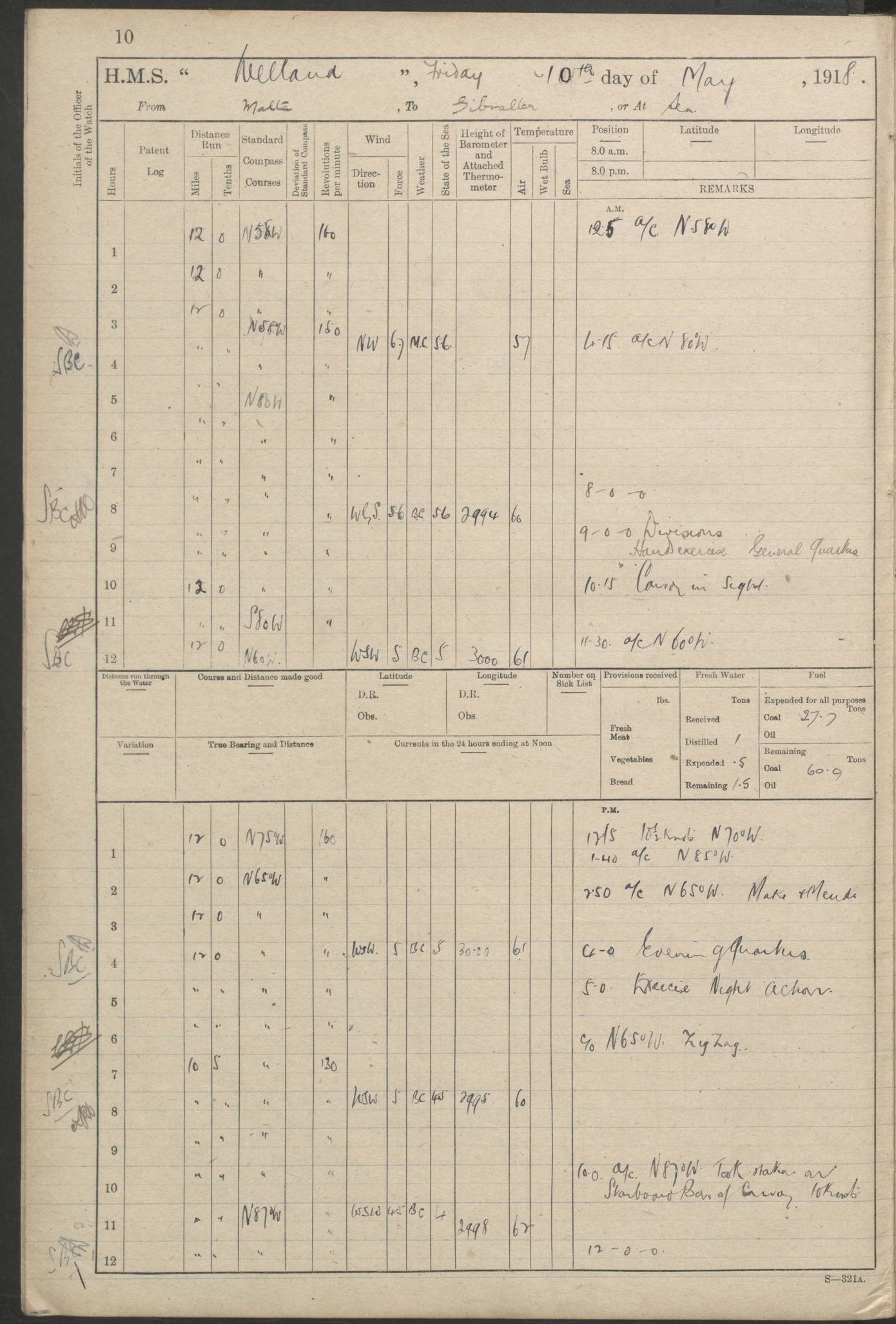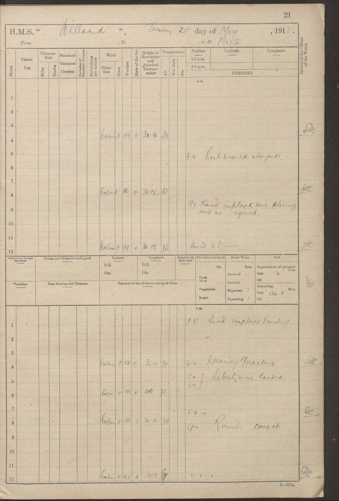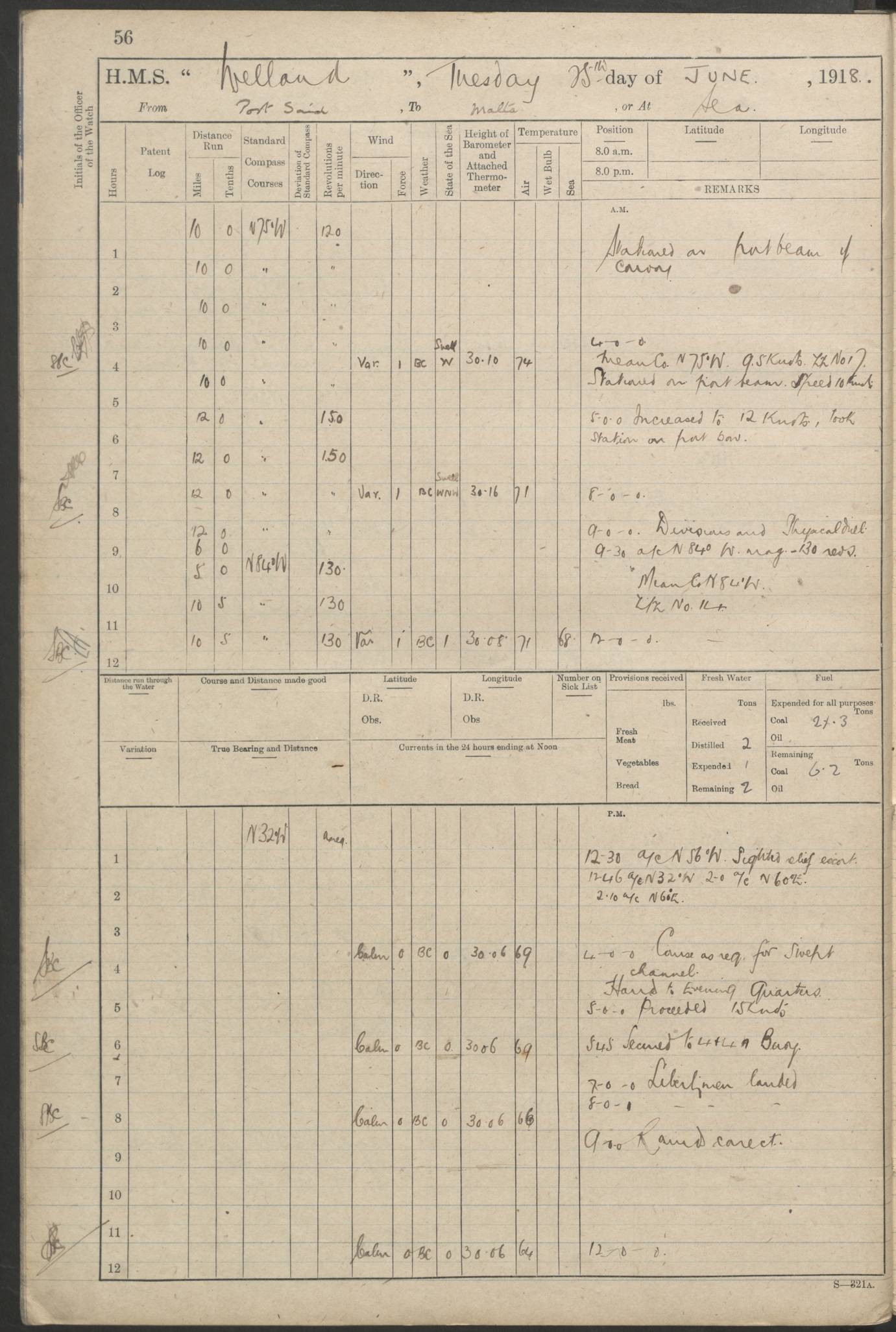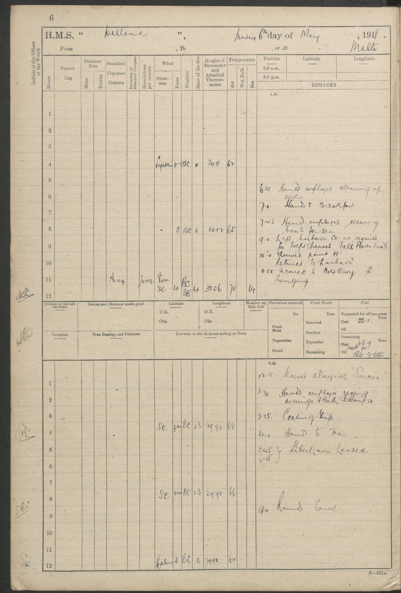 4caf8cb4cadfd341970378c6: (http://oldweather.s3.amazonaws.com/ADM 53-68374/ADM 53-68374-033_0.jpg) 29 April 1916 At sea to Malta Lat 35.89, Long 14.51 12.58am: Gozo Lt bg SE. 4.20am: Same abeam. A/c S40E. 8.00am: Waiting for permission to enter Grand harbour. 11.00am: Secured to Nos 1 and 1a buoys. 2.15pm: Commenced coaling, received from NSO Malta 76 tons. 4caf8cb4cadfd341970378c7: (http://oldweather.s3.amazonaws.com/ADM 53-68374/ADM 53-68374-033_1.jpg) 30 April 1916 Malta Lat 35.89, Long 14.51 Harbour routine, leave to watch, 1.00pm to 10.00pm. 4caf8cb4cadfd341970378c8: (http://oldweather.s3.amazonaws.com/ADM 53-68374/ADM 53-68374-034_0.jpg) 4caf8cb4cadfd341970378c9: (http://oldweather.s3.amazonaws.com/ADM 53-68374/ADM 53-68374-034_1.jpg) 4caf8cb4cadfd341970378ca: (http://oldweather.s3.amazonaws.com/ADM 53-68374/ADM 53-68374-035_0.jpg) 4caf8cb4cadfd341970378cb: (http://oldweather.s3.amazonaws.com/ADM 53-68374/ADM 53-68374-035_1.jpg) Above four pages blanks and covers. LOGS FOR MAY 1916 [Malta, Mudros and Dodecanese patrol based at Port Iero] 4caf8cb4cadfd341970378cc: (http://oldweather.s3.amazonaws.com/ADM 53-68375/ADM 53-68375-001_0.jpg) 4caf8cb4cadfd341970378cd: (http://oldweather.s3.amazonaws.com/ADM 53-68375/ADM 53-68375-001_1.jpg) Cover of Logbook copy for May 1916. 4caf8cb4cadfd341970378ce: (http://oldweather.s3.amazonaws.com/ADM 53-68375/ADM 53-68375-002_0.jpg) “This is to certify that this is a true copy of the original log of HMS Welland from 1st May 1916 to 31st May 1916, signed PA Heyder Lieut-in-Command.” [Dated 1915 in log!] 4caf8cb5cadfd341970378cf: (http://oldweather.s3.amazonaws.com/ADM 53-68375/ADM 53-68375-002_1.jpg) Fuel consumption page, including full power trial result for 14th April. Signed by the Captain (13th June) and Eng. Lt/Cdr HL Hammond, 5th Destroyer flotilla, 19th June 1916. 4caf8cb5cadfd341970378d0: (http://oldweather.s3.amazonaws.com/ADM 53-68375/ADM 53-68375-003_0.jpg) Blank. 4caf8cb5cadfd341970378d1: (http://oldweather.s3.amazonaws.com/ADM 53-68375/ADM 53-68375-003_1.jpg) 1 May 1916 Malta and at sea for Mudros Lat 36.0, Long 15.67 6.30am: Preparing for sea. 8.20am: Slipped and proceeded to sea, course N72E, 165 revs [14 knots]. 10.20am: A/c to read signal from transport on opposite course. 1.45pm: A/c to examine empty lifeboat. 4.00pm: A/c to answer challenge from sloop on opposite course. 7.30pm: Darkened ship. Passed various unidentified steamers during the day. 4caf8cb5cadfd341970378d2: (http://oldweather.s3.amazonaws.com/ADM 53-68375/ADM 53-68375-004_0.jpg) 2 May 1916 At sea Lat 35.75, Long 21.64 Easterly courses until 5.10pm. 5.10pm: A/c N37E. 6.30pm: A/c N6E. 9.20pm: A/c N52E. 11.00pm: C Zurva abeam 12.5 miles. 11.59pm: A/c N36E. Passed numerous unidentified steamers during the day. 4caf8cb5cadfd341970378d3: (http://oldweather.s3.amazonaws.com/ADM 53-68375/ADM 53-68375-004_1.jpg) 3 May 1916 At sea to Mudros Lat 39.64, Long 25.19 5.25am: Challenged by HMS Sentinel, replied. 11.05am: Strati I. abeam to port, a/c N20 E. 1.30pm: Secured alongside collier Ikaki. Commenced coaling. 4.15pm: Completed coaling, 82 tons. Cast off and anchored off HMS Blenheim. 6.25pm: Hands to bathe. 4caf8cb5cadfd341970378d4: (http://oldweather.s3.amazonaws.com/ADM 53-68375/ADM 53-68375-005_0.jpg) 4 May 1916 Mudros and on Patrol Lat 40.11, Long 25.94 [approx] 8.45am: Weighed and proceeded. Embarked three Captains RN for passage to HMS Triad [The Dardanelles HQ ship]. 12.25pm: Anchored in Aliki Bay* [on the South coast of Imbros, now Gökçeada]. Sent three Captains to Triad. 2.55pm: Weighed and proceeded for Kephalo*. 4.30pm: Anchored in Kephalo harbour [a large bay on the East coast of Imbros, aka Pyrgos Bay]. Sent money to HMS Grafton. 5.05pm: Weighed and proceeded to patrol position. 6.35pm: Arrived on position. 10.03pm: Took station astern of HMS Comet, HMS Grampus following astern. Patrolling SE and NW between Tenedos [now Bozcaada] and Imbros. * A detailed map of the Aegean Sea at Lemnos Gallipoli Commemorative Comittee shows how Mudros, Imbros and Tenados lie in relation to Gallipoli. Kephalo Bay is the deep bay on the SE corner of Imbros, Aliki Bay lies just below it on the South coast and Kusu Bay is on the NE coast. 4caf8cb5cadfd341970378d5: (http://oldweather.s3.amazonaws.com/ADM 53-68375/ADM 53-68375-005_1.jpg) 5 May 1916 On Patrol Lat 40.0, Long 26.0 [approx] 12.01am: On patrol between Tenedos and Imbros. 10.30am: Proceeded to relieve HMS Racoon. 12.25pm: Resumed former patrol. 8.30pm: Took station astern of HMS Comet. 4caf8cb5cadfd341970378d6: (http://oldweather.s3.amazonaws.com/ADM 53-68375/ADM 53-68375-006_0.jpg) 6 May 1916 Patrol, Kephalo Bay, at sea Lat 40.15, Long 25.98 12.01am: On patrol i/c with HMS Comet. 6.30am: Tending on Submarines during exercise. 7.30am: Proceeded for Kephalo Bay. 8.06am: Anchored abreast of HMS Grafton. 5.11pm: Weighed and proceeded for Port Iero. 11.14pm: C Sigri [actually a small island with a lighthouse] abeam to Port, 7.75 miles. 4caf8cb5cadfd341970378d7: (http://oldweather.s3.amazonaws.com/ADM 53-68375/ADM 53-68375-006_1.jpg) 7 May 1916 Port Iero Lat 39.1, Long 26.47 4.00am: Approaching and entering Port Iero. 4.30am: Secured to collier Somersby and coaled ship. 8.30am: Received 68 tons, cast off to anchor. 4caf8cb5cadfd341970378d8: (http://oldweather.s3.amazonaws.com/ADM 53-68375/ADM 53-68375-007_0.jpg) 8 May 1916 Port Iero Lat 39.1, Long 26.47 Hands employed painting. 9.10pm: Embarked one L/Cpl and six privates, RMLI. 4caf8cb5cadfd341970378d9: (http://oldweather.s3.amazonaws.com/ADM 53-68375/ADM 53-68375-007_1.jpg) 9 May 1916 Port Iero and at sea escorting monitor Lat 38.6, Long 26.6 [approx] 4.30am: Weighed and proceeded to sea. 5.30am: Escorting monitor HMS Earl of Peterborough. 10.15am: Closed HMS Kennet. Transferred marines and mail to Kennet for Long I. 10.45am: Patrolling to seaward of monitor whilst bombarding enemy’s batteries. 3.30pm: Monitor commenced bombarding Ines Tepi. 4.10pm: Completed firing, proce