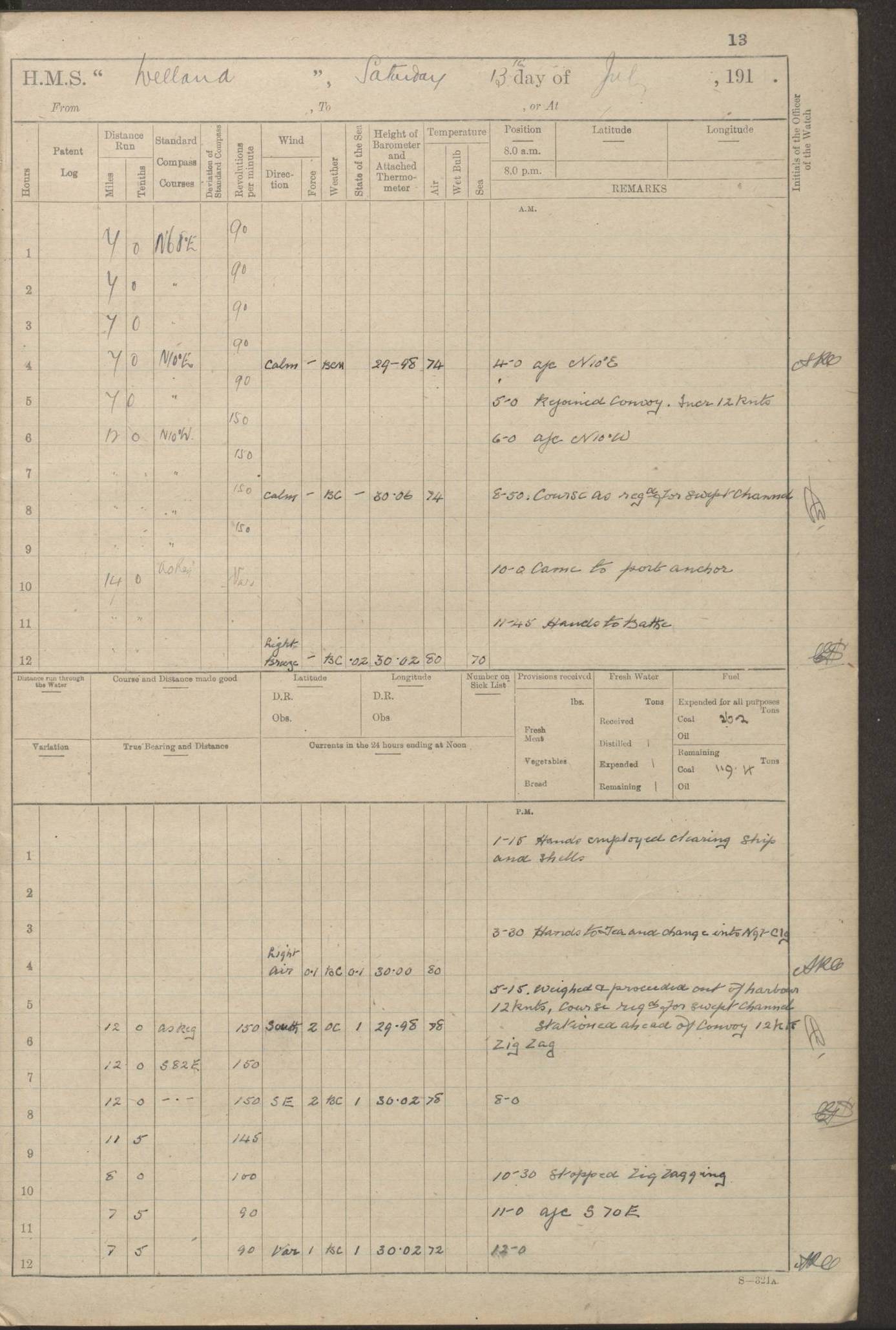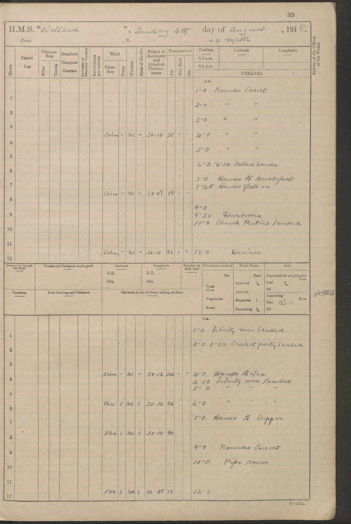 Notes: 1. Latitude/longitude, including for days in port, show representative decimal positions for each day, as calculated by the Old Weather project's analysis program. As such, they differ by varying amounts from the positions recorded, usually at noon, in the log pages. In addition, some latitudes/longitudes have been amended in edited logs for errors in the logs, for errors in identifying locations by the analysis program, or simply for greater accuracy. In all cases, refer to the log-page scans for the positions as originally recorded. Not all log pages contain this information and the ships' positions have therefore often been estimated. 2. Full account of any day is available by clicking on the link above that day. Groups of links refer to log book covers and introductory information; some may be blank. Editor Paul’s notes: Each days entry is a précis of the entries recorded in the log for that day. Routine events are usually omitted, but occasionally (usually on the first of the month) there is a full entry to give a flavour of life aboard. The second line of each day is the noon position, either from the co-ordinates of a known port or from a position recorded in the log from sightings or cross-bearings. Like many small ships, Welland often does not trouble to record the noon position or gets it demonstrably wrong and where that has happened the editor has estimated the position from other logged information, usually using the invaluable Journey Plotter program. Estimated positions are marked [approx]. Some useful abbreviations: