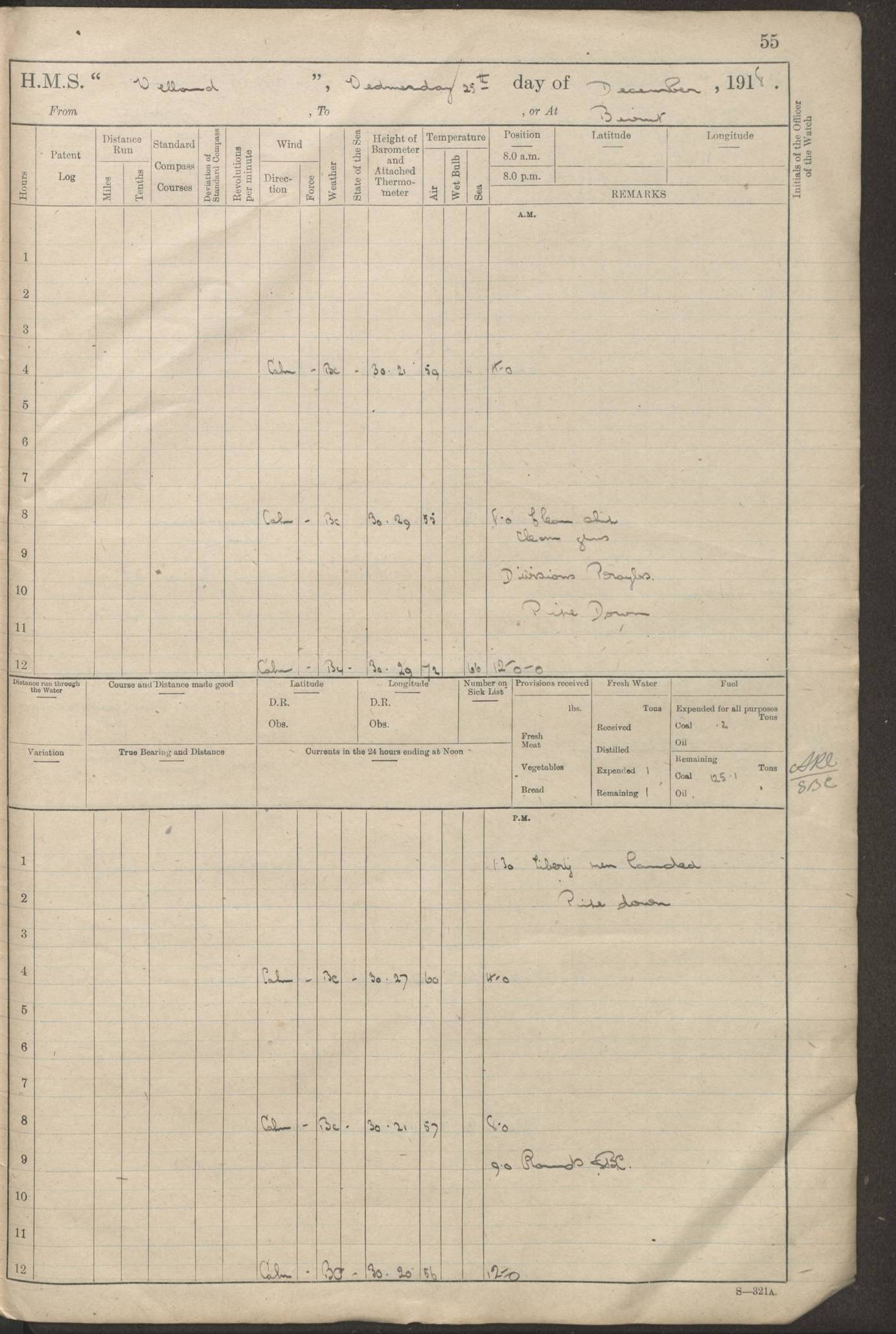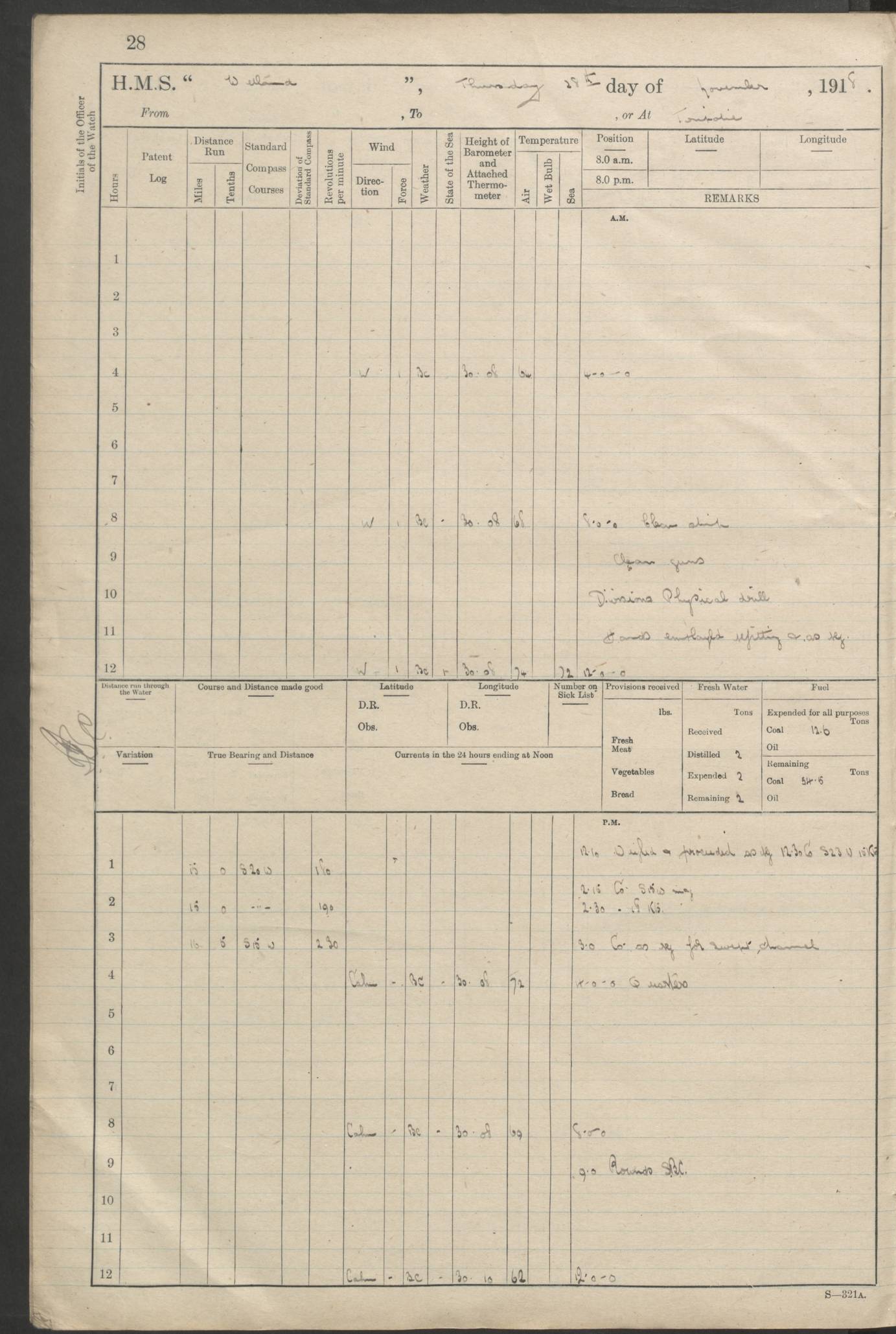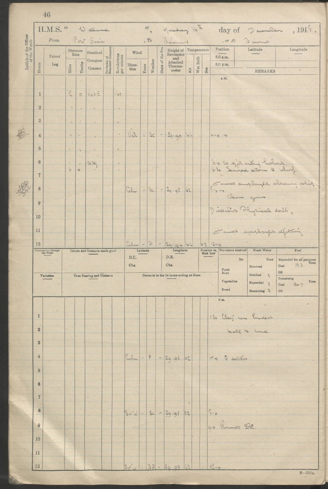 Altered course N 69º W. 8.05pm: Altered course N 72º W. 4caf8cadcadfd34197037687: (http://oldweather.s3.amazonaws.com/ADM 53-68366/ADM 53-68366-011_1.jpg) 17 December 1914 Ihavandiffulu Atoll to Aden Lat 10.7, Long 61.0 8.35am: COLNE hauled out of line. 10.00am: Put clocks back 15 minutes. Hands cleaning guns. Gun Layers & guns crews to Deflection Teacher & drill. 1.30pm: Hands piped down. 4.45pm: Course & speed as requisite for closing SWANLEY. 4.50pm: Stopped. Drew fresh beef. 5.40pm: Proceeded N 72º W. 9 ½ knots. 10.00pm: Altered course N 70º W. 4caf8cadcadfd34197037688: (http://oldweather.s3.amazonaws.com/ADM 53-68366/ADM 53-68366-012_0.jpg) 18 December 1914 Ihavandiffulu Atoll to Aden Lat 11.5, Long 57.3 7.00am: Formed Divisions Line Ahead. Hands securing gear on upper deck. 8.45am: Hands employed refitting heaving lines, dead lines & fenders. 11.00am: Put clocks back 15 minutes. 1.30pm: Hands piped down. 5.40pm: Formed Single Line Ahead. . 4caf8cadcadfd34197037689: (http://oldweather.s3.amazonaws.com/ADM 53-68366/ADM 53-68366-012_1.jpg) 19 December 1914 Ihavandiffulu Atoll to Aden Lat 12.4, Long 53.3 6.15am: Sighted Socotra Island starboard bow. 8.50am: Course N 65º W 9 knots. Hands employed cleaning guns & repairing fenders. 9.50am: Altered course N 46º W. 10.05am: Altered course as requisite for closing SWANLEY. 10.30am: Stopped. 11.00am: Proceeded N 79º W 11 knots. 12.00pm: Put clocks back 10 minutes. 1.25pm: Altered course N 78º W. 4.05pm: Sighted Abd-el-Kais abeam. 5.30pm: Altered course N 83º W. 7.45pm: Sight Setters at Night Sight Setting drill. 4caf8cadcadfd3419703768a: (http://oldweather.s3.amazonaws.com/ADM 53-68366/ADM 53-68366-013_0.jpg) 20 December 1914 Ihavandiffulu Atoll to Aden Lat 12.8, Long 48.2 7.35am: Formed divisions Line Ahead 10 knots. 8.50am: Hands employed cleaning guns. 9.30am: Read Prayers. Piped down. 12.20pm: Altered course N 89º W. Hands piped down. 5.05pm: Reduced to 9 knots. 8.05pm: Increased to 10 knots. 8.10pm: Altered course N 87º W. 4caf8cadcadfd3419703768b: (http://oldweather.s3.amazonaws.com/ADM 53-68366/ADM 53-68366-013_1.jpg) 21 December 1914 Aden Lat 12.8, Long 45.0 3.45am: Sighted Aden Light House Bearing West. 5.45am: Increased to 10 knots. Course & speed as requisite for approaching Aden. 6.45am: Stopped. 8.45am: Hands cleaning guns. 1.00pm: Special Leave to watch 4.30pm till 9.00pm. 2.00pm: Hands employed drawing stores. 9.00pm: Rounds. 4caf8cadcadfd3419703768c: (http://oldweather.s3.amazonaws.com/ADM 53-68366/ADM 53-68366-014_0.jpg) 22 December 1914 Aden Lat 12.8, Long 45.0 5.45am: Hands employed preparing for coaling. 7.00am: Coal lighters came alongside. Commenced coaling. 11.30am: Finished coaling. Received 132 tons. 1.30pm: Hands employed provisioning ship. 4.50pm: Preparing ship for Sea. 5.45pm: Weighed & slipped buoy and proceeded as requisite with Flotilla and SWANLEY. 6.30pm: Course S 35º W. 8 knots. 6.45pm: Increased to 10 knots. 7.00pm: Altered course S 50º W. 7.20pm: Altered course S 75º W. 10.48pm: Altered course N 80º W. 4caf8cadcadfd3419703768d: (http://oldweather.s3.amazonaws.com/ADM 53-68366/ADM 53-68366-014_1.jpg) 23 December 1914 Aden to Suez Lat 14.1, Long 42.8 1.20am: Sighted Perim Light NW by N. 3.20am: Altered course N 40º W. 3.45am: Altered course N 18º W. 7.50am: Formed Divisions Line Ahead. 9.00am: Hands employed cleaning ship & painting & cleaning torpedoes. Guns crews to Loader drill. 11.00am: Put clocks back 7 minutes. 11.05am: Altered course N 25º W. 11.52am: Abu Ali Light House abeam. Altered course N 42º W. 1.35pm: Altered course N 27º W. Hands piped down. 4.55pm: Stopped. Sent boat to SWANLEY for beef. 5.10pm: Proceeded N 35º W. 10½ knots. 6.00pm: Altered course N 32º W. 6.38pm: Sighted Zebayia Island Light bearing N 13º E. 9.00pm: Jebel Teir bearing N 15º W. 10.40pm: Jebel Teir abeam. 4caf8cadcadfd3419703768e: (http://oldweather.s3.amazonaws.com/ADM 53-68366/ADM 53-68366-015_0.jpg) 24 December 1914 Aden to Suez Lat 17.5, Long 40.5 5.45am: Returned ammunition. Fell out Special Lookouts. 7.30am: Formed Divisions Line Ahead. 8.45am: Hands employed refitting gangway ladders, painting gun covers & cleaning torpedoes. Guns crews at drill. 11.10am: Put clocks back 10 minutes. 1.30pm: Hands piped down. 4.30pm: As requisite for closing SWANLEY. Stopped & sent boat for provisions. 5.00pm: Proceeded N 28º W. 10 knots. 7.30pm: Guns crews to Night Loader drill & sight setter drill. 4caf8cadcadfd3419703768f: (http://oldweather.s3.amazonaws.com/ADM 53-68366/ADM 53-68366-015_1.jpg) 25 December 1914 Aden to Suez Lat 21.1, Long 38.2 2.05am: Altered course as requisite to clear steamer. 6.00am: Returned ammunition. Fell out Special Lookouts. 7.15am: Formed Divisions Line Ahead. 9.30am: Read Prayers. 9.40am: Hands piped down. 10.10am: Put clocks back 9 minutes. 1.30pm: Hands piped down. 2.00pm: Altered course N 24º W. 4.45pm: As requisite for closing SWANLEY and drawing fresh meat. 5.00pm: Proceeded N 24º W. 8.15pm: Altered course N 23º W. 4caf8cadcadfd34197037690: (http://oldweather.s3.amazonaws.com/ADM 53-68366/ADM 53-68366-016_0.jpg) 26 December 1914 Aden to Suez Lat 24.5, Long 36.3 6.35am: Sighted St John's Island S 75º W. 9.00am: Put clocks back 15 minutes. 9.30am: Hands employed cleaning ship & at Deflection Teacher. Torpedo party painting torpedoes. 12.10pm: Altered course N 82º W. Hands piped down. 3.00pm: Daedalus Light House abeam. 3.10pm: Altered course N 27º W. 4.45pm: As requisite for closing SWANLEY. 5.00pm: Proceeded N 27º W 9 ½ knots. 11.55pm: Sighted Brothers Light House bearing N 40º W. 4caf8cadcadfd34197037691: (http://oldweather.s3.amazonaws.com/ADM 53-68366/ADM 53-68366-016_1.jpg) 27 December 1914 Aden to Suez Lat 27.8, Long 33.8 1.30am: Brothers Light abeam. 6.15am: Secured. Returned ammunition. 6.45am: Sighted land on Port & Starboard bow. 7.20am: Altered course N 42º W. 9.30am: Read Prayers. 10.10am: Put clocks back 10 minutes. 12.15pm: Ashrafi Light House: abeam 