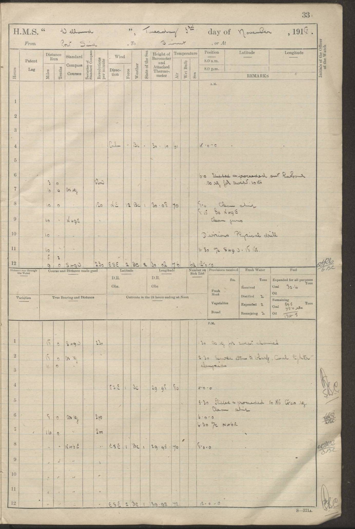 Course & speed as requisite for intercepting steamer 8.00pm: Altered course S 71º W. 10.00pm: Hands at Night patrol Stations. 4caf8cadcadfd3419703764f: (http://oldweather.s3.amazonaws.com/ADM 53-68365/ADM 53-68365-018_1.jpg) 31 October 1914 Sandakan Lat 5.8, Long 118.0 5.30am: Secured. 7.30am: Sighted Bagnan Island bearing S 74º W. 8.15am: Altered course S 60º W. 8.27am: Bagnan abeam. 9.30am: Altered course SW. 9.55am: Altered course as requisite for entering harbour. 10.40am: Secured alongside SWANLEY. 12.55pm: Left SWANLEY went alongside SKERRIES. Commenced coaling. 9.50pm: Finished coaling. Left collier. 10.00pm: Came to Starboard anchor veered 2 shackles. LOGS FOR NOVEMBER 1914 4caf8cadcadfd34197037650: (http://oldweather.s3.amazonaws.com/ADM 53-68365/ADM 53-68365-019_0.jpg) 1 November 1914 Sandakan Lat 5.8, Long 118.0 7.30am: JED arrived. 8.45am: Paid Monthly Money. 9.00am: Hands employed cleaning ship after coaling. 1.00pm: Leave to Watch 1.30pm till 8.00pm. 4.30pm: 1 Able seaman discharged to COLNE. 9.00pm: Rounds. 4caf8cadcadfd34197037651: (http://oldweather.s3.amazonaws.com/ADM 53-68365/ADM 53-68365-019_1.jpg) 2 November 1914 Sandakan To Singapore Lat 5.8, Long 118.0 7.00am: JED entered harbour. 9.00am: Hands employed cleaning ship. 10.40am: 2 Ratings joined from CLIO. 1.30pm: Weighed & proceeded as requisite in company with COLNE & JED left harbour. 2.30pm: Course N 28º E. 2.45pm: Stopped. 3.00pm: Proceeded 9 knots. N 41º E. 4.00pm: Altered course N 4º W. 4.47pm: Clotilde Rock N 41º E. 5.05pm: Clotilde Rock abeam. 5.55pm: Took Station astern of SWANLEY 8.55pm: Sighted ships bearing WNW. 9.35pm: Altered course N 46º W. 4caf8cadcadfd34197037652: (http://oldweather.s3.amazonaws.com/ADM 53-68365/ADM 53-68365-020_0.jpg) 3 November 1914 Sandakan To Singapore Lat 7.2, Long 116.6 5.30am: Altered course S 60º W. 7.55am: Altered course S 78º W. 8.55am: Resumed Formation No. 1. 10.00am: Hands employed fitting awnings. 1.30pm: Hands piped down. 4.57pm: Stopped engines. 5.20pm: Proceeded in Night Cruising Formation. S 46º W. 9.00pm: Hands at No. 1 Patrol Stations. 4caf8cadcadfd34197037653: (http://oldweather.s3.amazonaws.com/ADM 53-68365/ADM 53-68365-020_1.jpg) 4 November 1914 Sandakan To Singapore Lat 5.5, Long 113.8 5.45am: Secured. 9.00am: Hands employed cleaning ship & guns. 12.15pm: Altered course S 41º W. 12.45pm: Put clocks back ½ hour. Hands piped down. 7.00pm: Took up Night Cruising Formations. 4caf8cadcadfd34197037654: (http://oldweather.s3.amazonaws.com/ADM 53-68365/ADM 53-68365-021_0.jpg) 5 November 1914 Sandakan To Singapore Lat 2.1, Long 109.3 8.45am: Hands employed preparing ship for coaling. 10.45am: Altered course S 80º W. 11.35am: Altered course S 25º W. 12.25pm: Altered course West. 1.00pm: Put clocks back ¼ hour. 1.18pm: Altered course SW. 2.18pm: Altered course South. 2.33pm: Altered course SE. 4.00pm: Stopped. 4.20pm: Went alongside SWANLEY 4.30pm: Commenced coaling. 8.45pm: Finished coaling. 10.00pm: As requisite for taking Station astern of JED. 11.05pm: Course S 79º W 8 knots. 4caf8cadcadfd34197037655: (http://oldweather.s3.amazonaws.com/ADM 53-68365/ADM 53-68365-021_1.jpg) 6 November 1914 Sandakan To Singapore Lat 2.1, Long 109.3 5.30am: Secured. 6.15am: Resumed Day Formation. 7.30am: Altered course S 62º W. 9.20am: Sighted steamer. 9.37am: Proceeded as requisite for intercepting & stopping SS INDIA SAMBA (British). 10.56am: As requisite for taking Station astern of JED. 12.45pm: Sighted steamer. 1.00pm: Put clocks back 15 minutes. 1.35pm: Stopped. 1.55pm: Proceeded S 57º W. 7.30pm: Stopped engines. Took up Night Cruising Formation. 8.45pm: Proceeded as requisite S 57º W. 9.10pm: Heavy Rain Squall. 4caf8cadcadfd34197037656: (http://oldweather.s3.amazonaws.com/ADM 53-68365/ADM 53-68365-022_0.jpg) 7 November 1914 Sandakan To Singapore Lat 0.7, Long 107.3 [longitude mistakenly noted as 101°19' in log] 2.55am: Sighted an island S 74º W. 3.00am: Altered course S 72º W. 4.00am: Proceeded as requisite for examining islands. Speed 10 knots. 9.00am: Examined Tambelan Island for enemy. 11.30am: Course S 8º W. 2.00pm: Set course for Saint Barbe Island. Hands piped down. 5.00pm: Continued examination of Saint Barbe Island. 6.10pm: Proceeded as requisite for rendezvous. 6.55pm: Altered course S 60º W. 15 knots. 8.10pm: Course as requisite for rejoining CLIO. 8.25pm: Altered course N 65º W. 8.45pm: Proceed at 8 knots. 4caf8cadcadfd34197037657: (http://oldweather.s3.amazonaws.com/ADM 53-68365/ADM 53-68365-022_1.jpg) 8 November 1914 Sandakan To Singapore Lat 1.1, Long 104.8 5.00am: Secured. Took up day Cruising Formation. 9.35am: Altered course N 58º W. 10.30am: Read Prayers. 12.15pm: Altered course S 66º W. 1.30pm: Altered course N 78º W. 1.41pm: Altered course N 52º W. 1.57pm: