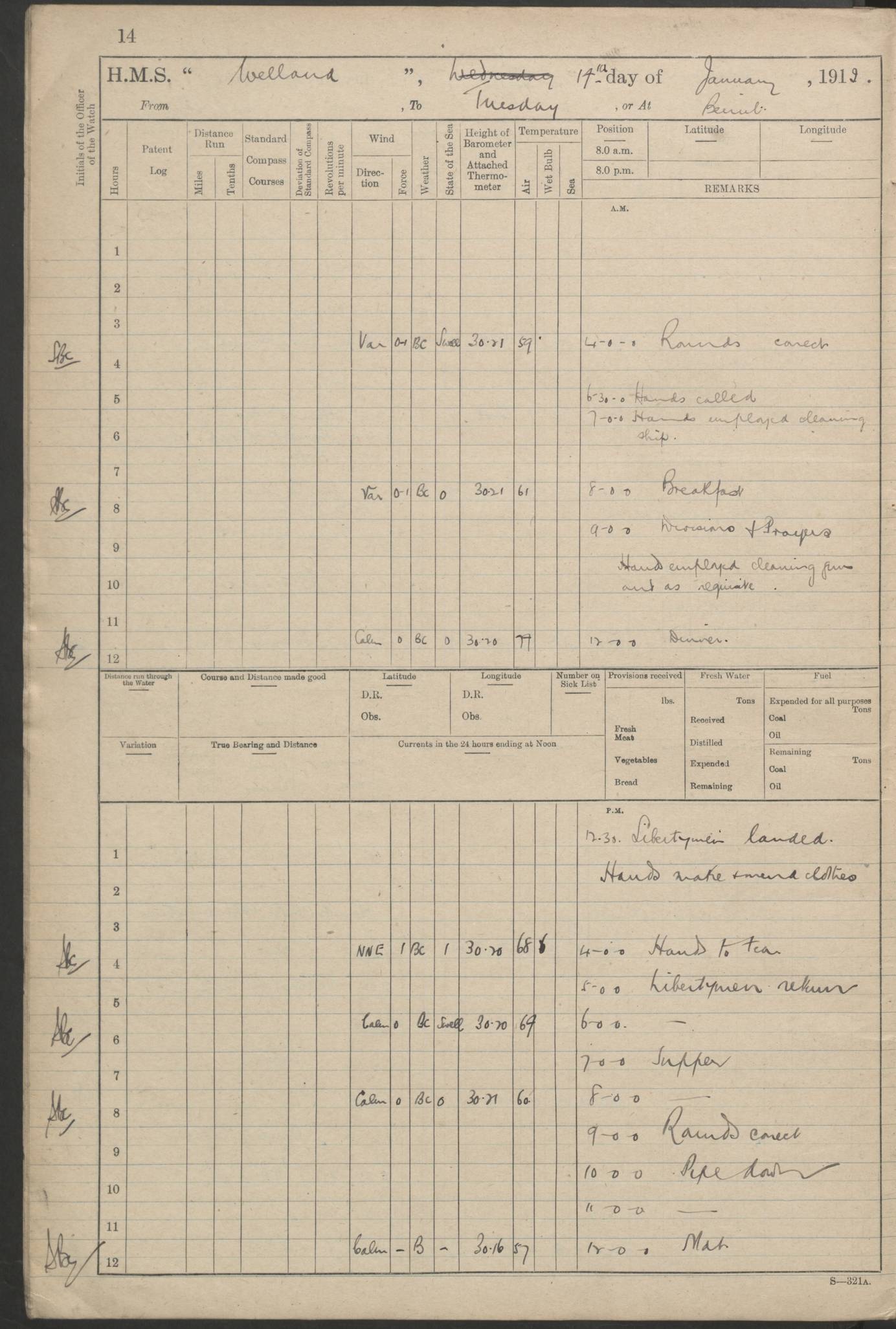 Course & speed as requisite for entering harbour. 2.00pm: Employed cleaning ship. 3.00pm: Torpedo party employed painting torpedoes. 4.00pm: Quarters. Leave from 4.30pm to 6.30am. 4.28pm: SMS EMDEN left harbour. 9.00pm: Rounds. 4caf8ca8cadfd341970374f5: (http://oldweather.s3.amazonaws.com/ADM 53-68360/ADM 53-68360-025_1.jpg) 14 January 1914 Hong Kong Lat 22.3, Long 114.2 6.00am: Employed cleaning ship. 7.00am: Torpedo party about torpedoes. 8.45am: USS WILMINGTON left harbour. 9.00am: Hands employed making deck clothes. Torpedo party carrying on about torpedoes. 1.00pm: Hands employed as in forenoon. 2.00pm: Landed Dockyard party. 4.00pm: Quarters. Leave from 4.30pm to 6.30am. 9.00pm: Rounds. 4caf8ca8cadfd341970374f6: (http://oldweather.s3.amazonaws.com/ADM 53-68360/ADM 53-68360-026_0.jpg) 15 January 1914 Hong Kong Lat 22.3, Long 114.2 4.00am: Employed preparing for coaling. Torpedo party preparing foremost torpedo for returning. 7.30am: Commenced coaling. 8.40am: Torpedo party to Kowloon to return torpedo. 10.40am: Torpedo party returned with torpedo. 11.50am: Finished coaling. Received 65 tons Welsh coal. 1.00pm: Employed cleaning ship after coaling. 4.00pm: Leave from 4.30pm to 6.30am. 9.00pm: Rounds. 4caf8ca8cadfd341970374f7: (http://oldweather.s3.amazonaws.com/ADM 53-68360/ADM 53-68360-026_1.jpg) 16 January 1914 Hong Kong Lat 22.3, Long 114.2 6.00am: Employed cleaning ship. 8.00am: Employed painting ship. 1.00pm: Employed painting ship. 4.00pm: Quarters. Leave from 4.30pm to 6.30am. 9.00pm: Rounds. 4caf8ca8cadfd341970374f8: (http://oldweather.s3.amazonaws.com/ADM 53-68360/ADM 53-68360-027_0.jpg) 17 January 1914 Hong Kong Lat 22.3, Long 114.2 6.00am: Employed cleaning ship. 8.30am: Aired Night clothing. 9.00am: Employed painting cowls & funnels. 1.00pm: Hands make and mend clothes. 2.00pm: Leave from 1.30pm to 6.30am. 4.00pm: Quarters. 9.00pm: Rounds. 4caf8ca8cadfd341970374f9: (http://oldweather.s3.amazonaws.com/ADM 53-68360/ADM 53-68360-027_1.jpg) 18 January 1914 Hong Kong Lat 22.3, Long 114.2 6.00am: Employed cleaning ship. 8.30am: Landed Roman Catholic party. 9.20am: Non Conformists landed. 9.35am: Divisions. 9.45am: Church of England party landed. 1.00pm: