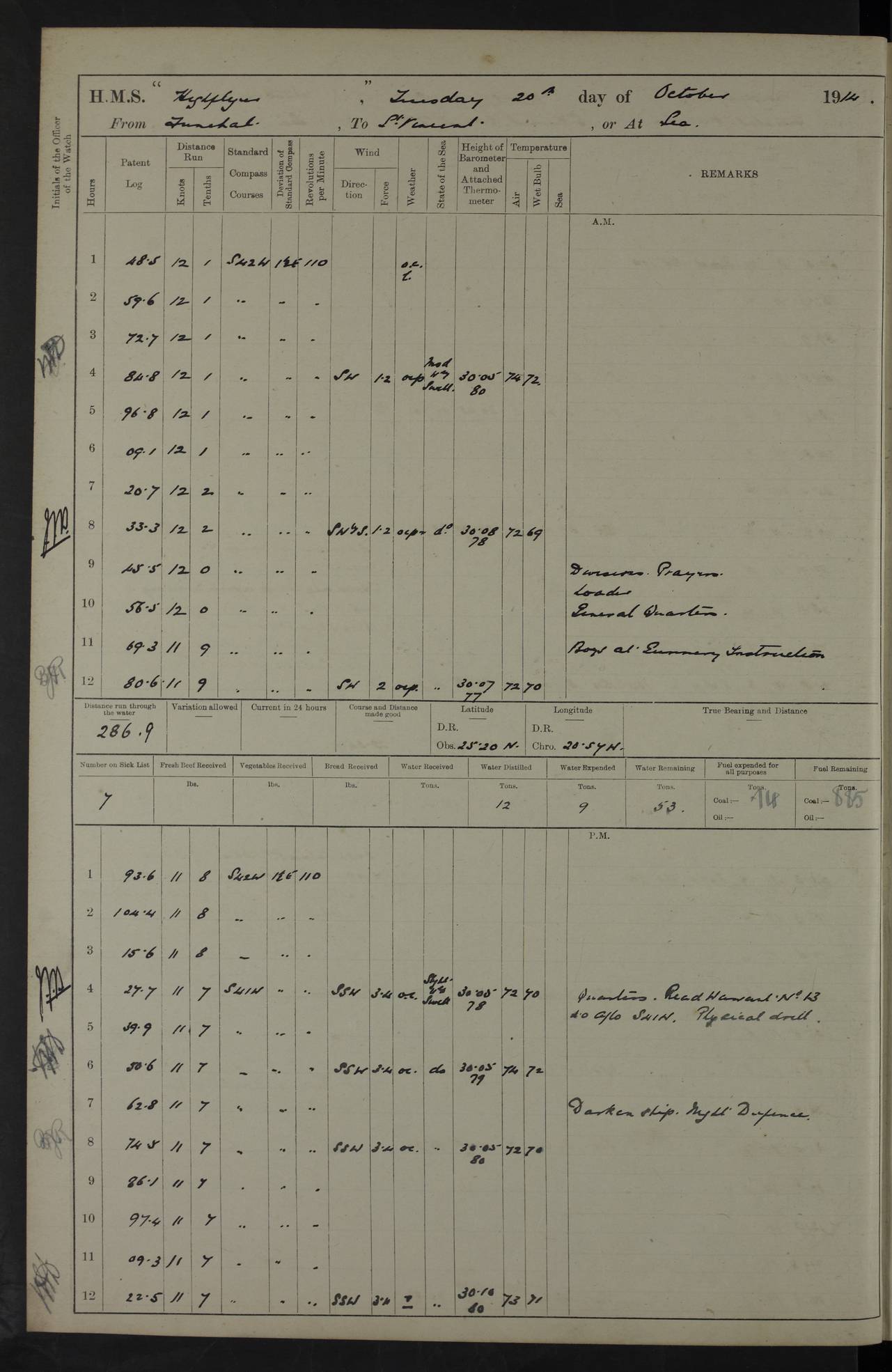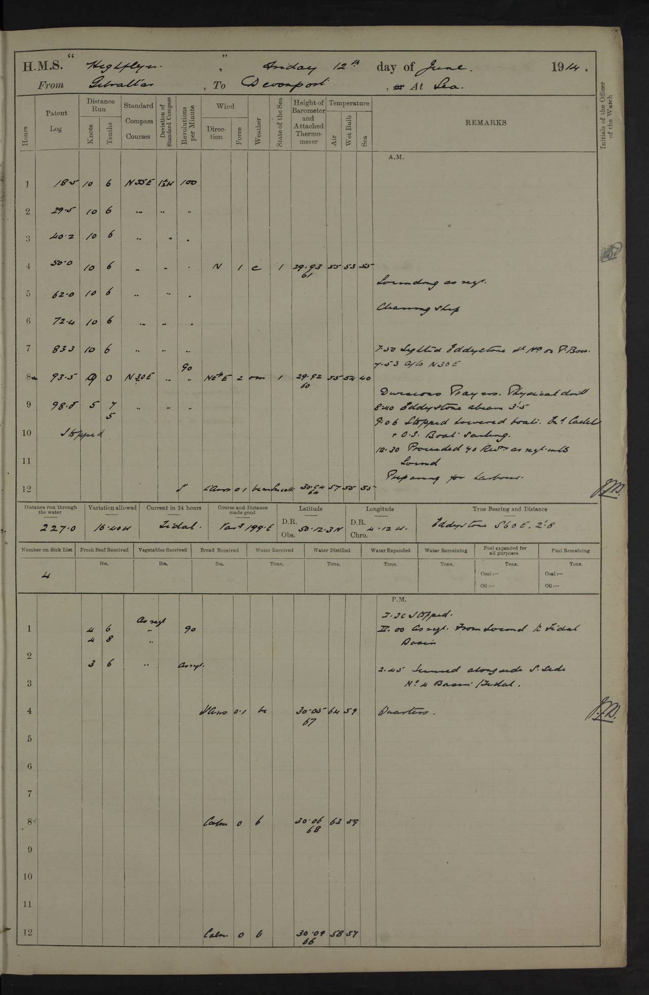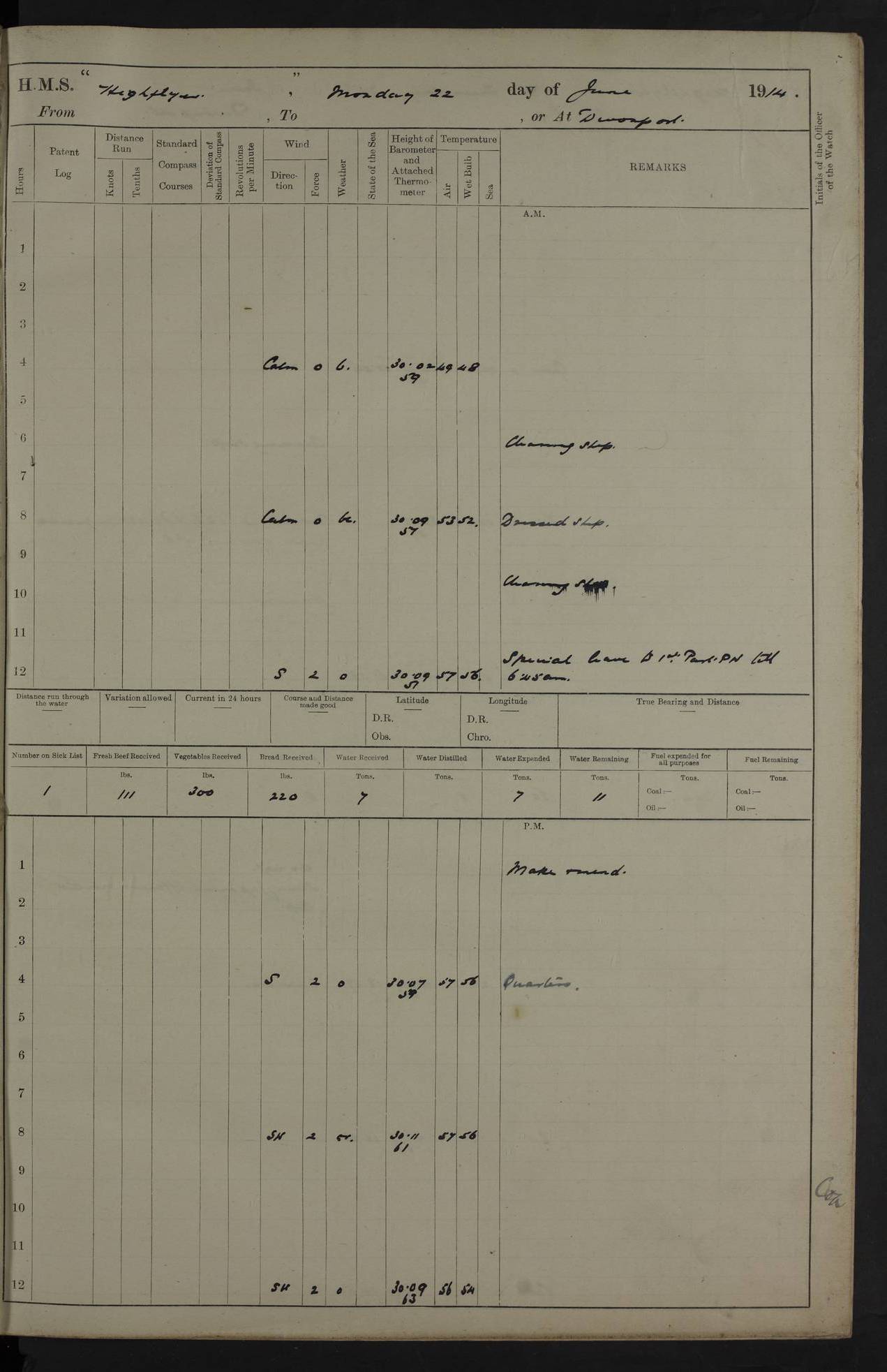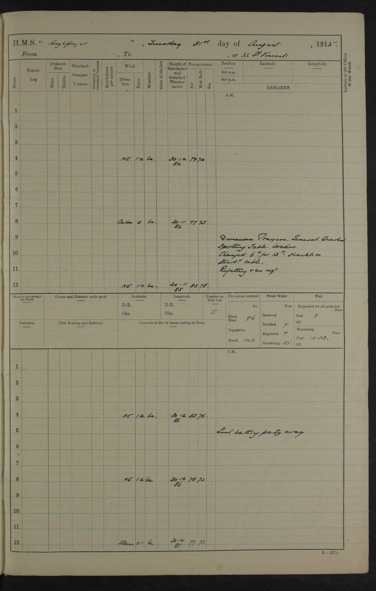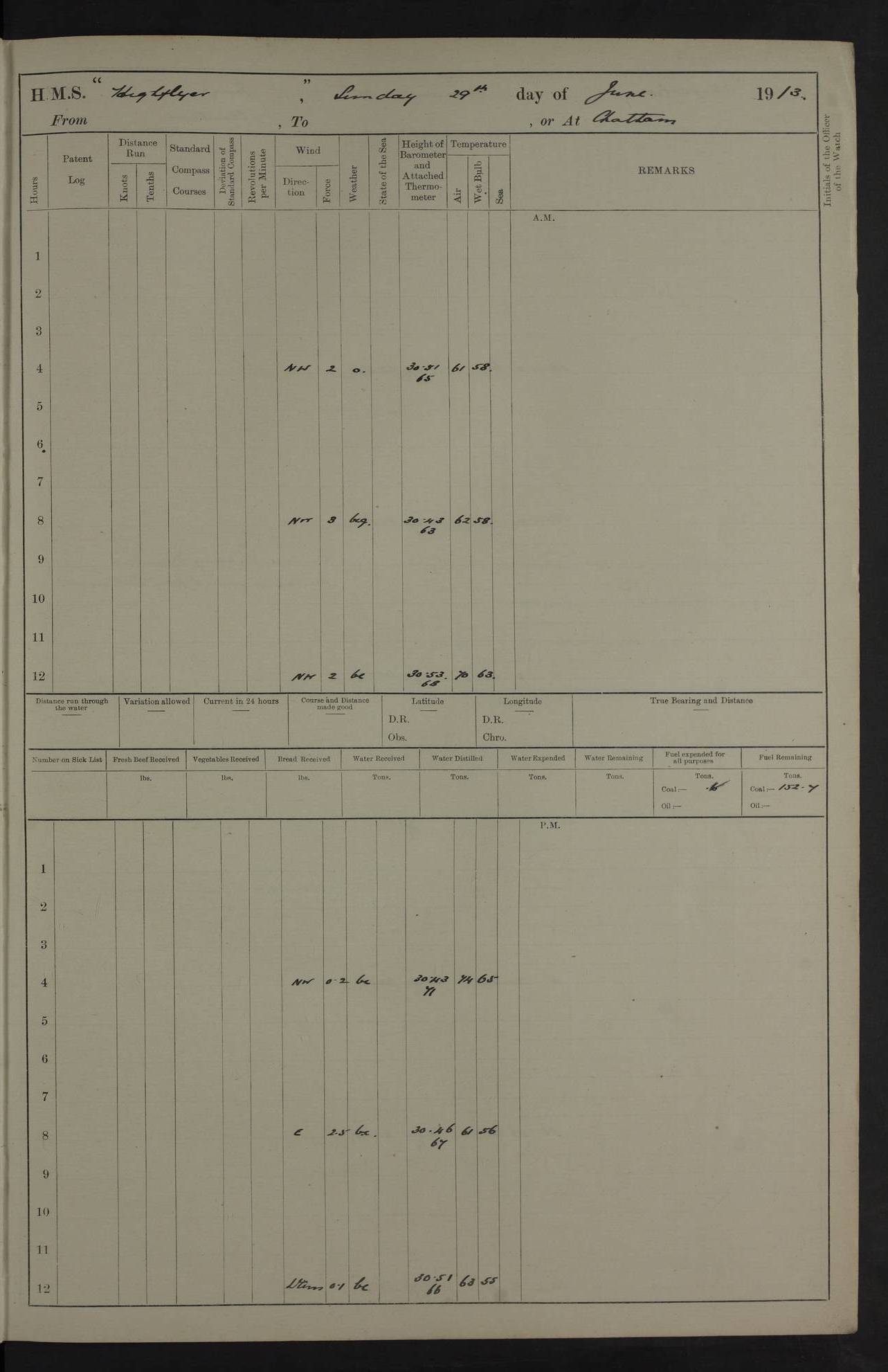 (Maps prepared using Journey Plotter, developed by Maikel. The Plots can only be approximate. They are made by joining-up positions on successive days, and sometimes positions are not given. There will therefore be occasions when the ship appears to have travelled overland) LOG BOOK – JUNE 14TH 1913 TO MAY 31ST 1914 4f960fe4a2fc8e2def00041b: (http://s3.amazonaws.com/oldweather/ADM53-44291/ADM 53-44291-001_0.jpg) 4f960fe5a2fc8e2def00041c: (http://s3.amazonaws.com/oldweather/ADM53-44291/ADM 53-44291-001_1.jpg) 4f960fe5a2fc8e2def00041d: (http://s3.amazonaws.com/oldweather/ADM53-44291/ADM 53-44291-002_0.jpg) 4f960fe5a2fc8e2def00041e: (http://s3.amazonaws.com/oldweather/ADM53-44291/ADM 53-44291-002_1.jpg) LOG of HMS Highflyer Commanded by Captain HT Buller MVO FOR THE PERIOD Commencing Saturday 14th June 1913 Ending Sunday 31st May 1914 Tonnage (displacement): 5600 Extreme length: 350 ft Extreme breadth: 54 ft ENGINES Manufacturer: Fairfield Shipbuilding & Engineering Co, Glasgow IHP: 10.000 Description: Vertical triple expansion 4 cylinders When fixed on board: 1898 BOILERS Manufacturer: Fairfield Shipbuilding & Engineering Co Description: Belleville with economisers 18 in No When made: 1898 When put in vessel: 1898 SCREW PROPELLER Manufacturer: Fairfield Shipbuilding & Engineering Co Description: Twin 3 bladed Admiralty design (bronze) General state of repair: Good 4f960fe6a2fc8e2def00041f: (http://s3.amazonaws.com/oldweather/ADM53-44291/ADM 53-44291-003_0.jpg) [Directions for using the log, figures to indicate the force of the wind and the state of the sea, and letters to denote the state of the weather.] 4f960fe6a2fc8e2def000420: (http://s3.amazonaws.com/oldweather/ADM53-44291/ADM 53-44291-003_1.jpg) Establishment of ship’s company Officers 32 Seamen 164 Boys 24 Marines 50 Engine-room establishment 134 Other non-executive ratings 466 BAROMETER Mercurial or aneroid: Mercurial Name of maker & number: Adie A 577 Height of cistern above sea: 9 feet Thermometers for air temperature Position in ship: Fore bridge Whether in screen: Yes Maker & number: Negretti & Zambra MO/A 9607 dry; from June 14, 1913 to June 1, 1914 MO/A 9603 wet; from June 14, 1913 to June 1, 1914 Thermometer for sea temperature Maker & number: J Hicks A 434; from June 14, 1913 to June 1, 1914 Position of standard compass Fore upper bridge DEVIATION OF STANDARD COMPASS Date obtained: August 29th 1913 Position: Sheerness, No 28 buoy ARMAMENT Fxle: one 6” QF PII S waist: four 6” QF PII P waist: four 6” QF PII OD: two 6” QF PII Battle deck: two 12-pounder 12-cwt SII S waist: three 12-pounder 12-cwt SII P waist: three 12-pounder 12-cwt SII AS deck: 3-pounder QF (Hotchkiss) P waist: 12-pounder 8-cwt field gun Torpedo armament 2 18” tubes BOATS 2 pinnaces, 36 ft sailing 2 cutters 1 gig, 30 ft 1 whaler 1 steam cutter, 32 ft MISCELLANEOUS INFORMATION Draught of water with bunkers full, and complete with provisions, stores and water: forward 22 ft 0 in, aft 23 ft 2 in Load draught, 600 tons coal: forward 19 ft 6 in, aft 21 ft 6 in Number of tons necessary to increase draught 1 inch: 31.5 Number of tons of coal carried (43 cubic feet per ton): a) At load draught, 600 b) With bunkers full, 1132 c) In places other than bunkers, nil Quantity of water carried: a) For boilers, 207 tons b) For drinking 60 tons THE VOYAGES OF HMS HIGHFLYER 1913-1914