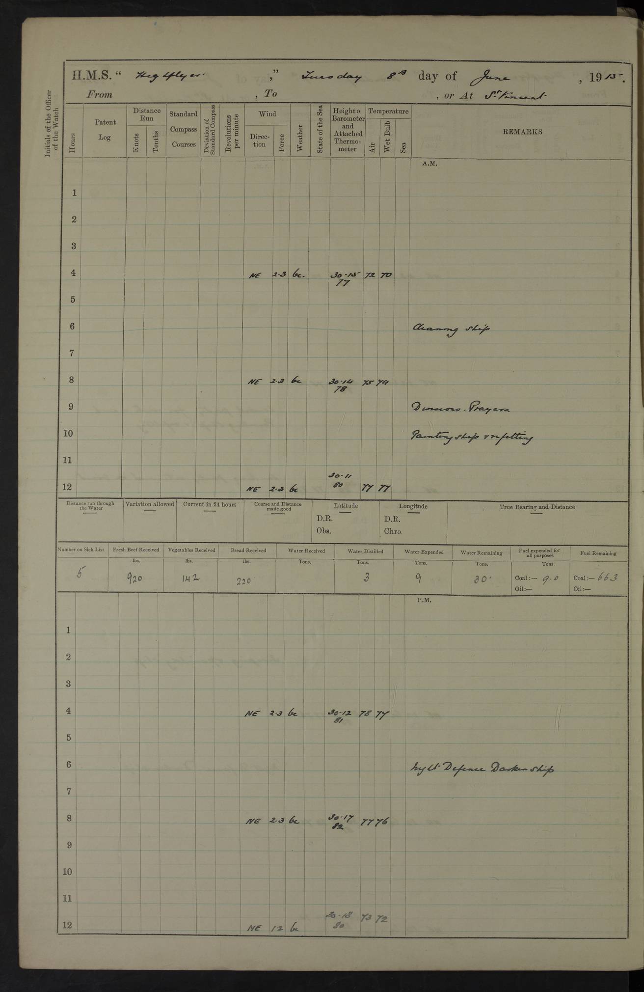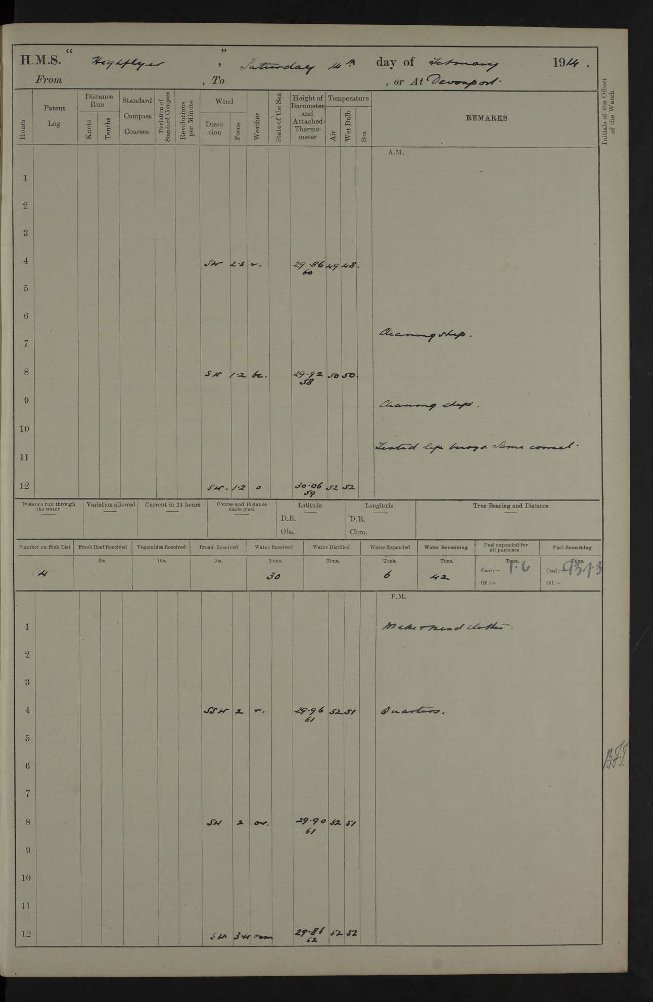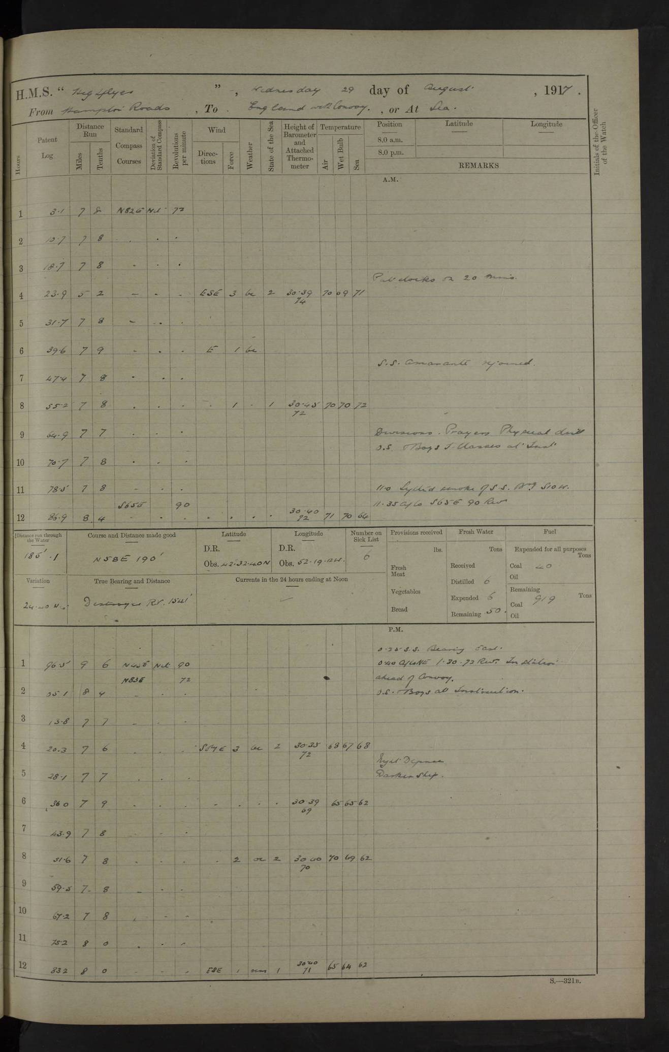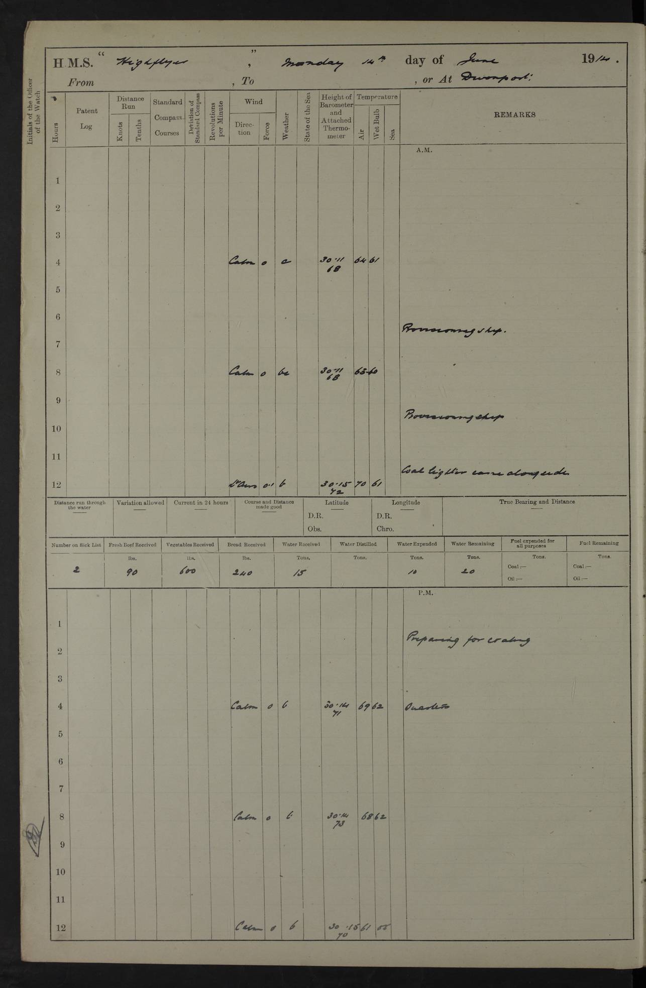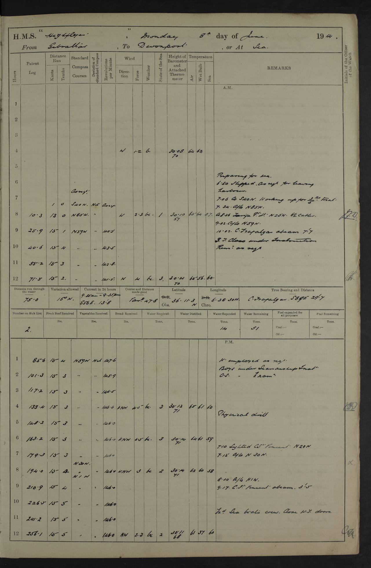 (Maps prepared using Journey Plotter, developed by Maikel. The Plots can only be approximate. They are made by joining-up positions on successive days, and sometimes positions are not given. There will therefore be occasions when the ship appears to have travelled overland) LOG BOOK – JUNE 14TH 1913 TO MAY 31ST 1914 4f960fe4a2fc8e2def00041b: (http://s3.amazonaws.com/oldweather/ADM53-44291/ADM 53-44291-001_0.jpg) 4f960fe5a2fc8e2def00041c: (http://s3.amazonaws.com/oldweather/ADM53-44291/ADM 53-44291-001_1.jpg) 4f960fe5a2fc8e2def00041d: (http://s3.amazonaws.com/oldweather/ADM53-44291/ADM 53-44291-002_0.jpg) 4f960fe5a2fc8e2def00041e: (http://s3.amazonaws.com/oldweather/ADM53-44291/ADM 53-44291-002_1.jpg) LOG of HMS Highflyer Commanded by Captain HT Buller MVO FOR THE PERIOD Commencing Saturday 14th June 1913 Ending Sunday 31st May 1914 Tonnage (displacement): 5600 Extreme length: 350 ft Extreme breadth: 54 ft ENGINES Manufacturer: Fairfield Shipbuilding & Engineering Co, Glasgow IHP: 10.000 Description: Vertical triple expansion 4 cylinders When fixed on board: 1898 BOILERS Manufacturer: Fairfield Shipbuilding & Engineering Co Description: Belleville with economisers 18 in No When made: 1898 When put in vessel: 1898 SCREW PROPELLER Manufacturer: Fairfield Shipbuilding & Engineering Co Description: Twin 3 bladed Admiralty design (bronze) General state of repair: Good 4f960fe6a2fc8e2def00041f: (http://s3.amazonaws.com/oldweather/ADM53-44291/ADM 53-44291-003_0.jpg) [Directions for using the log, figures to indicate the force of the wind and the state of the sea, and letters to denote the state of the weather.] 4f960fe6a2fc8e2def000420: (http://s3.amazonaws.com/oldweather/ADM53-44291/ADM 53-44291-003_1.jpg) Establishment of ship’s company Officers 32 Seamen 164 Boys 24 Marines 50 Engine-room establishment 134 Other non-executive ratings 466 BAROMETER Mercurial or aneroid: Mercurial Name of maker & number: Adie A 577 Height of cistern above sea: 9 feet Thermometers for air temperature Position in ship: Fore bridge Whether in screen: Yes Maker & number: Negretti & Zambra MO/A 9607 dry; from June 14, 1913 to June 1, 1914 MO/A 9603 wet; from June 14, 1913 to June 1, 1914 Thermometer for sea temperature Maker & number: J Hicks A 434; from June 14, 1913 to June 1, 1914 Position of standard compass Fore upper bridge DEVIATION OF STANDARD COMPASS Date obtained: August 29th 1913 Position: Sheerness, No 28 buoy ARMAMENT Fxle: one 6” QF PII S waist: four 6” QF PII P waist: four 6” QF PII OD: two 6” QF PII Battle deck: two 12-pounder 12-cwt SII S waist: three 12-pounder 12-cwt SII P waist: three 12-pounder 12-cwt SII AS deck: 3-pounder QF (Hotchkiss) P waist: 12-pounder 8-cwt field gun Torpedo armament 2 18” tubes BOATS 2 pinnaces, 36 ft sailing 2 cutters 1 gig, 30 ft 1 whaler 1 steam cutter, 32 ft MISCELLANEOUS INFORMATION Draught of water with bunkers full, and complete with provisions, stores and water: forward 22 ft 0 in, aft 23 ft 2 in Load draught, 600 tons coal: forward 19 ft 6 in, aft 21 ft 6 in Number of tons necessary to increase draught 1 inch: 31.5 Number of tons of coal carried (43 cubic feet per ton): a) At load draught, 600 b) With bunkers full, 1132 c) In places other than bunkers, nil Quantity of water carried: a) For boilers, 207 tons b) For drinking 60 tons THE VOYAGES OF HMS HIGHFLYER 1913-1914