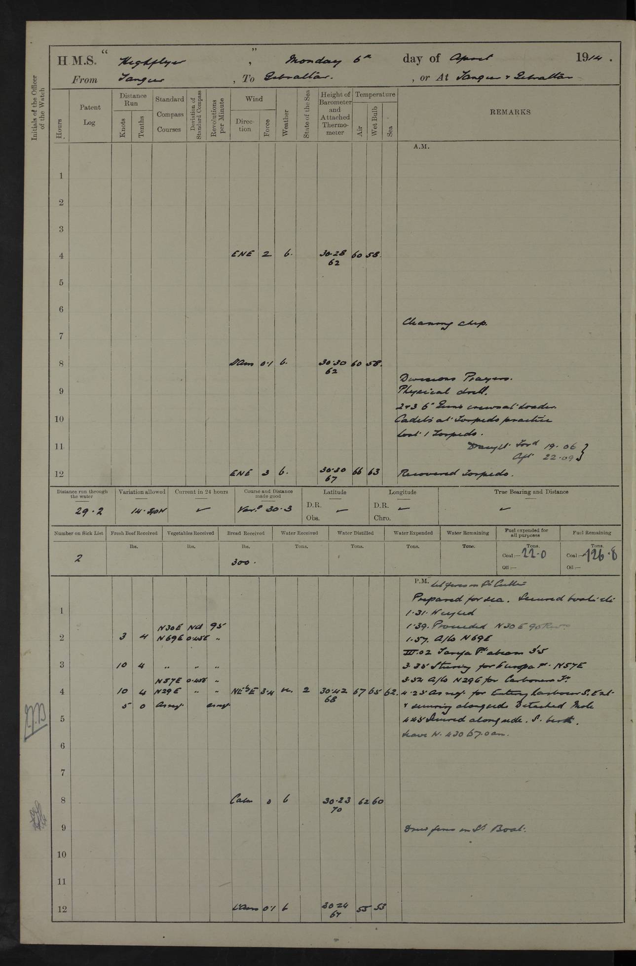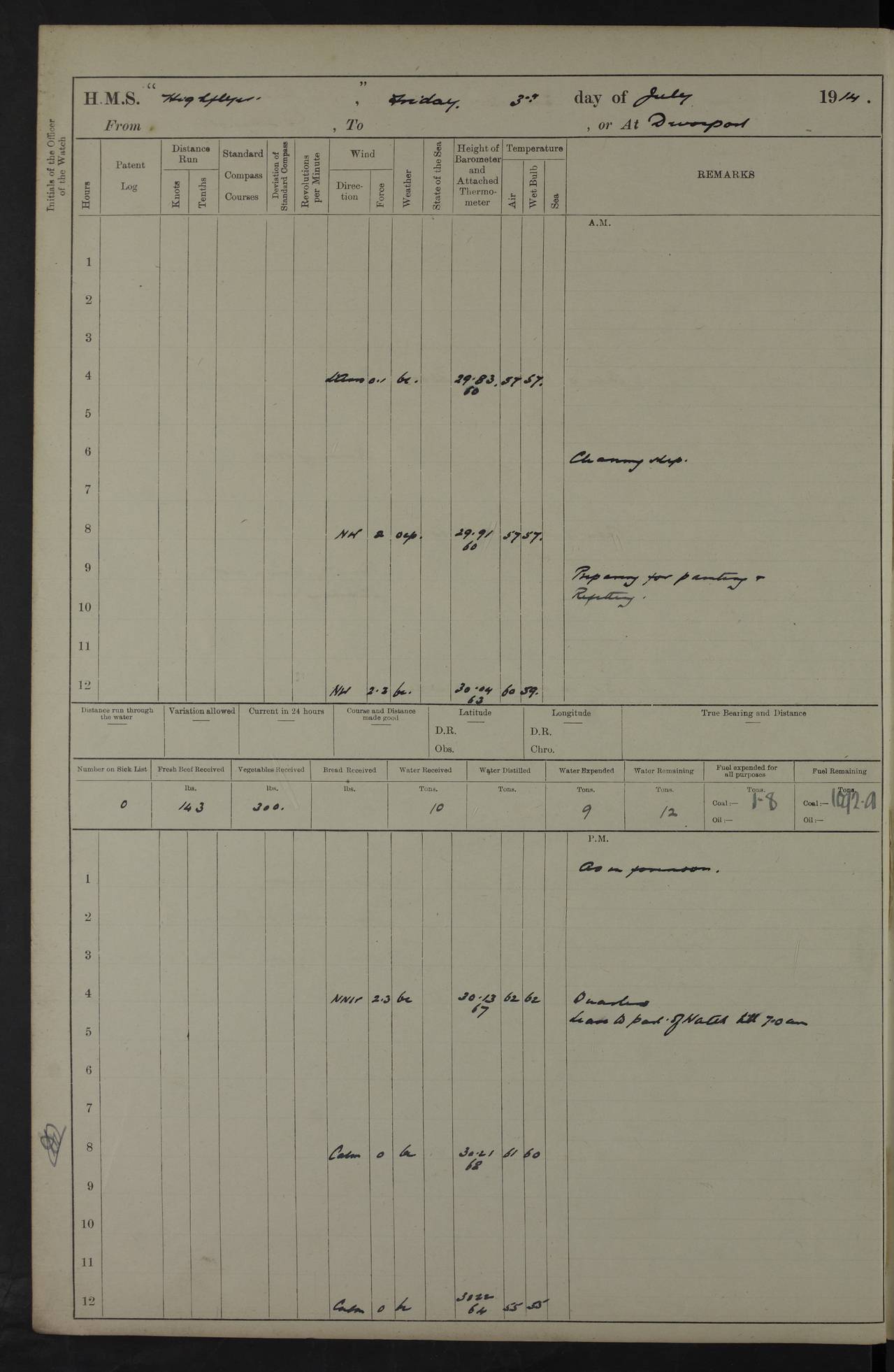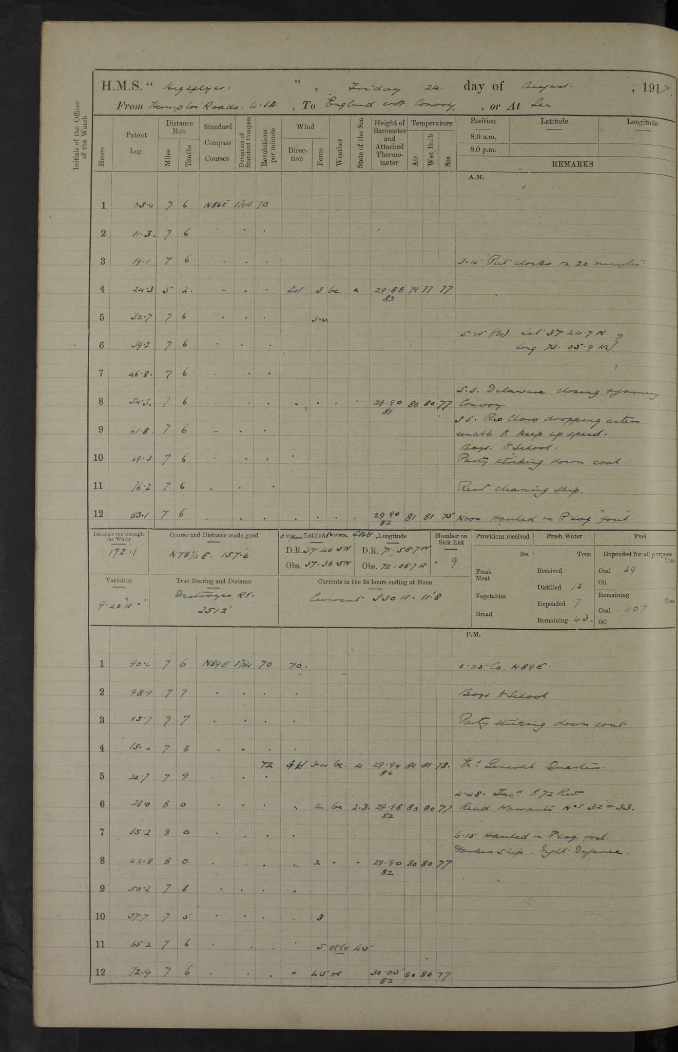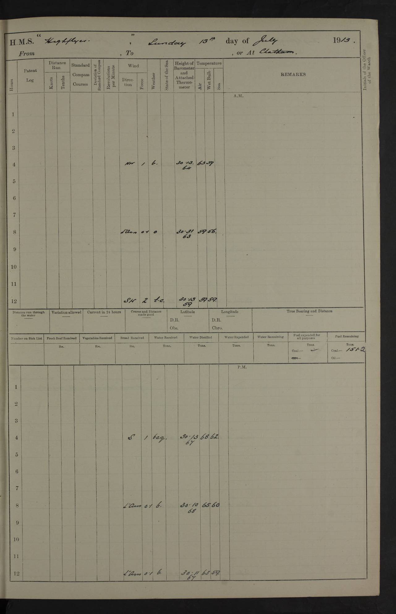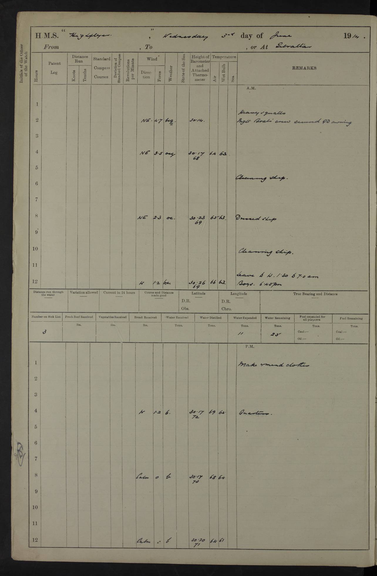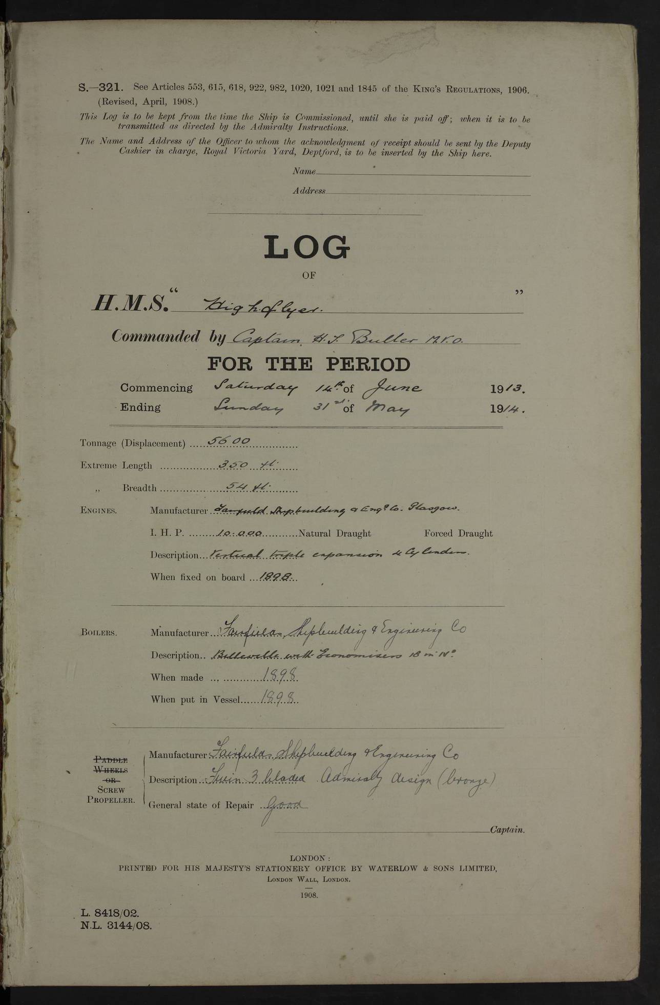(Maps prepared using Journey Plotter, developed by Maikel. The Plots can only be approximate. They are made by joining-up positions on successive days, and sometimes positions are not given. There will therefore be occasions when the ship appears to have travelled overland) LOG BOOK – JUNE 14TH 1913 TO MAY 31ST 1914 4f960fe4a2fc8e2def00041b: (http://s3.amazonaws.com/oldweather/ADM53-44291/ADM 53-44291-001_0.jpg) 4f960fe5a2fc8e2def00041c: (http://s3.amazonaws.com/oldweather/ADM53-44291/ADM 53-44291-001_1.jpg) 4f960fe5a2fc8e2def00041d: (http://s3.amazonaws.com/oldweather/ADM53-44291/ADM 53-44291-002_0.jpg) 4f960fe5a2fc8e2def00041e: (http://s3.amazonaws.com/oldweather/ADM53-44291/ADM 53-44291-002_1.jpg) LOG of HMS Highflyer Commanded by Captain HT Buller MVO FOR THE PERIOD Commencing Saturday 14th June 1913 Ending Sunday 31st May 1914 Tonnage (displacement): 5600 Extreme length: 350 ft Extreme breadth: 54 ft ENGINES Manufacturer: Fairfield Shipbuilding & Engineering Co, Glasgow IHP: 10.000 Description: Vertical triple expansion 4 cylinders When fixed on board: 1898 BOILERS Manufacturer: Fairfield Shipbuilding & Engineering Co Description: Belleville with economisers 18 in No When made: 1898 When put in vessel: 1898 SCREW PROPELLER Manufacturer: Fairfield Shipbuilding & Engineering Co Description: Twin 3 bladed Admiralty design (bronze) General state of repair: Good 4f960fe6a2fc8e2def00041f: (http://s3.amazonaws.com/oldweather/ADM53-44291/ADM 53-44291-003_0.jpg) [Directions for using the log, figures to indicate the force of the wind and the state of the sea, and letters to denote the state of the weather.] 4f960fe6a2fc8e2def000420: (http://s3.amazonaws.com/oldweather/ADM53-44291/ADM 53-44291-003_1.jpg) Establishment of ship’s company Officers 32 Seamen 164 Boys 24 Marines 50 Engine-room establishment 134 Other non-executive ratings 466 BAROMETER Mercurial or aneroid: Mercurial Name of maker & number: Adie A 577 Height of cistern above sea: 9 feet Thermometers for air temperature Position in ship: Fore bridge Whether in screen: Yes Maker & number: Negretti & Zambra MO/A 9607 dry; from June 14, 1913 to June 1, 1914 MO/A 9603 wet; from June 14, 1913 to June 1, 1914 Thermometer for sea temperature Maker & number: J Hicks A 434; from June 14, 1913 to June 1, 1914 Position of standard compass Fore upper bridge DEVIATION OF STANDARD COMPASS Date obtained: August 29th 1913 Position: Sheerness, No 28 buoy ARMAMENT Fxle: one 6” QF PII S waist: four 6” QF PII P waist: four 6” QF PII OD: two 6” QF PII Battle deck: two 12-pounder 12-cwt SII S waist: three 12-pounder 12-cwt SII P waist: three 12-pounder 12-cwt SII AS deck: 3-pounder QF (Hotchkiss) P waist: 12-pounder 8-cwt field gun Torpedo armament 2 18” tubes BOATS 2 pinnaces, 36 ft sailing 2 cutters 1 gig, 30 ft 1 whaler 1 steam cutter, 32 ft MISCELLANEOUS INFORMATION Draught of water with bunkers full, and complete with provisions, stores and water: forward 22 ft 0 in, aft 23 ft 2 in Load draught, 600 tons coal: forward 19 ft 6 in, aft 21 ft 6 in Number of tons necessary to increase draught 1 inch: 31.5 Number of tons of coal carried (43 cubic feet per ton): a) At load draught, 600 b) With bunkers full, 1132 c) In places other than bunkers, nil Quantity of water carried: a) For boilers, 207 tons b) For drinking 60 tons THE VOYAGES OF HMS HIGHFLYER 1913-1914