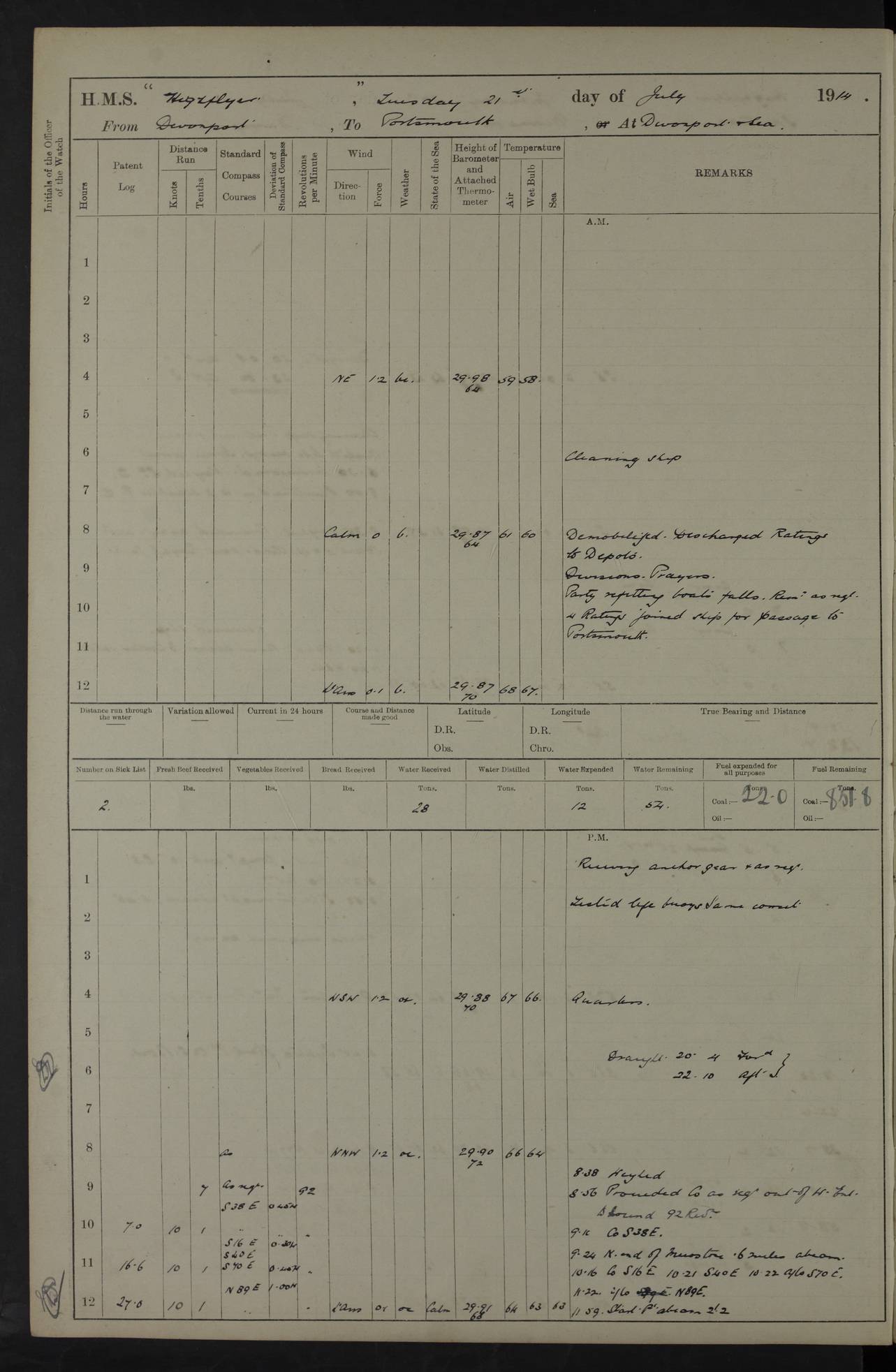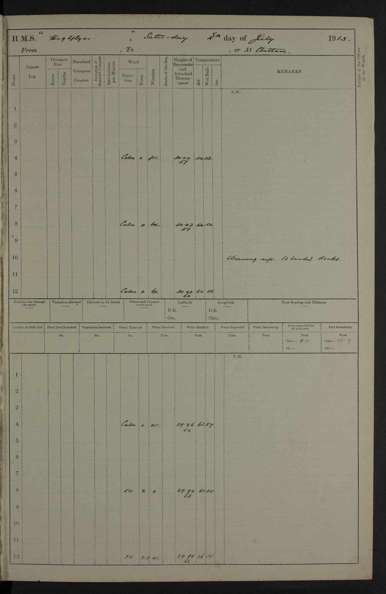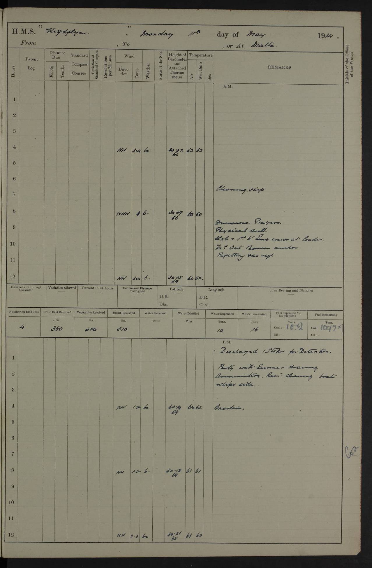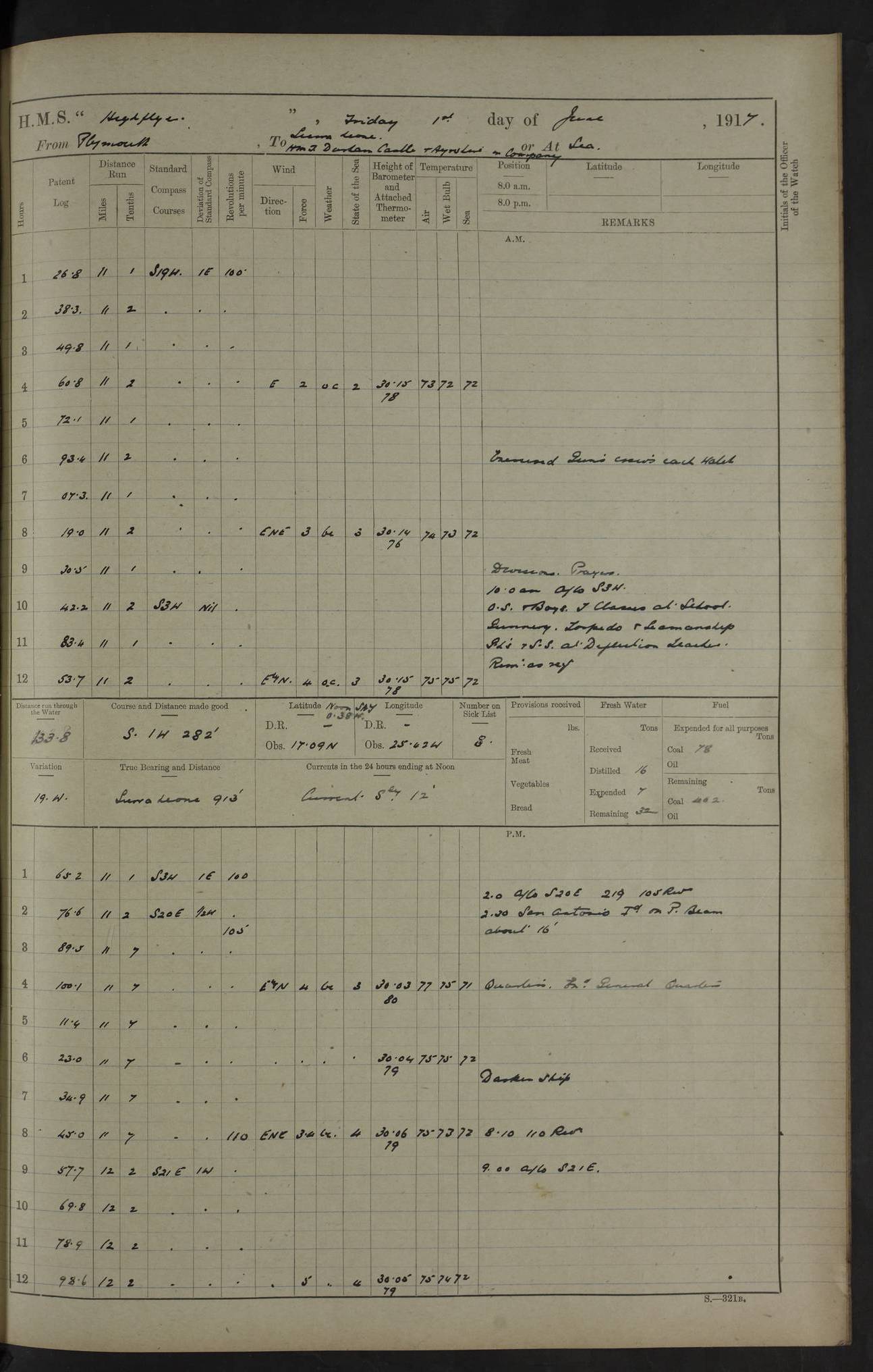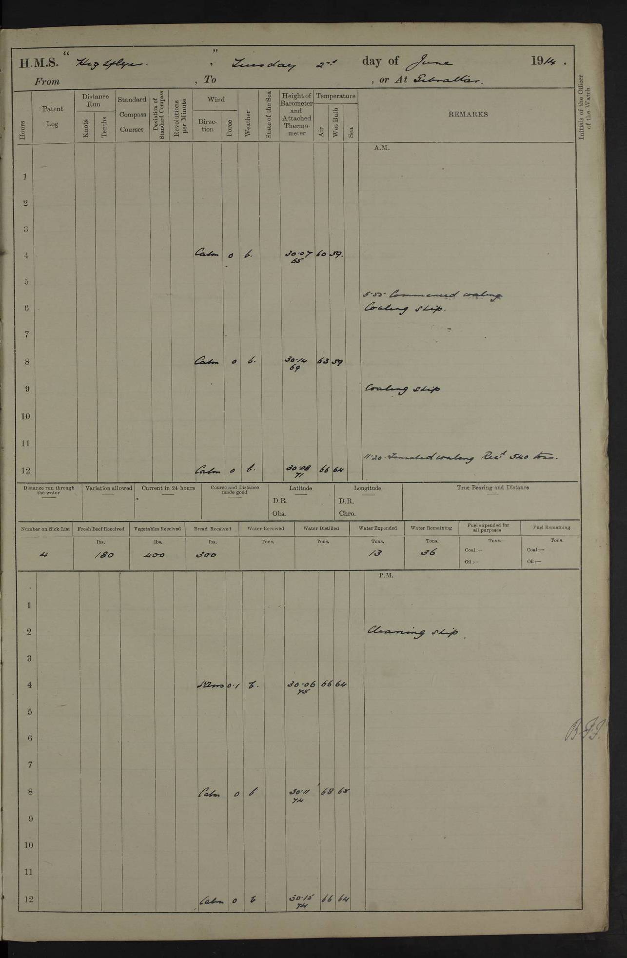 (Maps prepared using Journey Plotter, developed by Maikel. The Plots can only be approximate. They are made by joining-up positions on successive days, and sometimes positions are not given. There will therefore be occasions when the ship appears to have travelled overland) LOG BOOK – JUNE 14TH 1913 TO MAY 31ST 1914 4f960fe4a2fc8e2def00041b: (http://s3.amazonaws.com/oldweather/ADM53-44291/ADM 53-44291-001_0.jpg) 4f960fe5a2fc8e2def00041c: (http://s3.amazonaws.com/oldweather/ADM53-44291/ADM 53-44291-001_1.jpg) 4f960fe5a2fc8e2def00041d: (http://s3.amazonaws.com/oldweather/ADM53-44291/ADM 53-44291-002_0.jpg) 4f960fe5a2fc8e2def00041e: (http://s3.amazonaws.com/oldweather/ADM53-44291/ADM 53-44291-002_1.jpg) LOG of HMS Highflyer Commanded by Captain HT Buller MVO FOR THE PERIOD Commencing Saturday 14th June 1913 Ending Sunday 31st May 1914 Tonnage (displacement): 5600 Extreme length: 350 ft Extreme breadth: 54 ft ENGINES Manufacturer: Fairfield Shipbuilding & Engineering Co, Glasgow IHP: 10.000 Description: Vertical triple expansion 4 cylinders When fixed on board: 1898 BOILERS Manufacturer: Fairfield Shipbuilding & Engineering Co Description: Belleville with economisers 18 in No When made: 1898 When put in vessel: 1898 SCREW PROPELLER Manufacturer: Fairfield Shipbuilding & Engineering Co Description: Twin 3 bladed Admiralty design (bronze) General state of repair: Good 4f960fe6a2fc8e2def00041f: (http://s3.amazonaws.com/oldweather/ADM53-44291/ADM 53-44291-003_0.jpg) [Directions for using the log, figures to indicate the force of the wind and the state of the sea, and letters to denote the state of the weather.] 4f960fe6a2fc8e2def000420: (http://s3.amazonaws.com/oldweather/ADM53-44291/ADM 53-44291-003_1.jpg) Establishment of ship’s company Officers 32 Seamen 164 Boys 24 Marines 50 Engine-room establishment 134 Other non-executive ratings 466 BAROMETER Mercurial or aneroid: Mercurial Name of maker & number: Adie A 577 Height of cistern above sea: 9 feet Thermometers for air temperature Position in ship: Fore bridge Whether in screen: Yes Maker & number: Negretti & Zambra MO/A 9607 dry; from June 14, 1913 to June 1, 1914 MO/A 9603 wet; from June 14, 1913 to June 1, 1914 Thermometer for sea temperature Maker & number: J Hicks A 434; from June 14, 1913 to June 1, 1914 Position of standard compass Fore upper bridge DEVIATION OF STANDARD COMPASS Date obtained: August 29th 1913 Position: Sheerness, No 28 buoy ARMAMENT Fxle: one 6” QF PII S waist: four 6” QF PII P waist: four 6” QF PII OD: two 6” QF PII Battle deck: two 12-pounder 12-cwt SII S waist: three 12-pounder 12-cwt SII P waist: three 12-pounder 12-cwt SII AS deck: 3-pounder QF (Hotchkiss) P waist: 12-pounder 8-cwt field gun Torpedo armament 2 18” tubes BOATS 2 pinnaces, 36 ft sailing 2 cutters 1 gig, 30 ft 1 whaler 1 steam cutter, 32 ft MISCELLANEOUS INFORMATION Draught of water with bunkers full, and complete with provisions, stores and water: forward 22 ft 0 in, aft 23 ft 2 in Load draught, 600 tons coal: forward 19 ft 6 in, aft 21 ft 6 in Number of tons necessary to increase draught 1 inch: 31.5 Number of tons of coal carried (43 cubic feet per ton): a) At load draught, 600 b) With bunkers full, 1132 c) In places other than bunkers, nil Quantity of water carried: a) For boilers, 207 tons b) For drinking 60 tons THE VOYAGES OF HMS HIGHFLYER 1913-1914