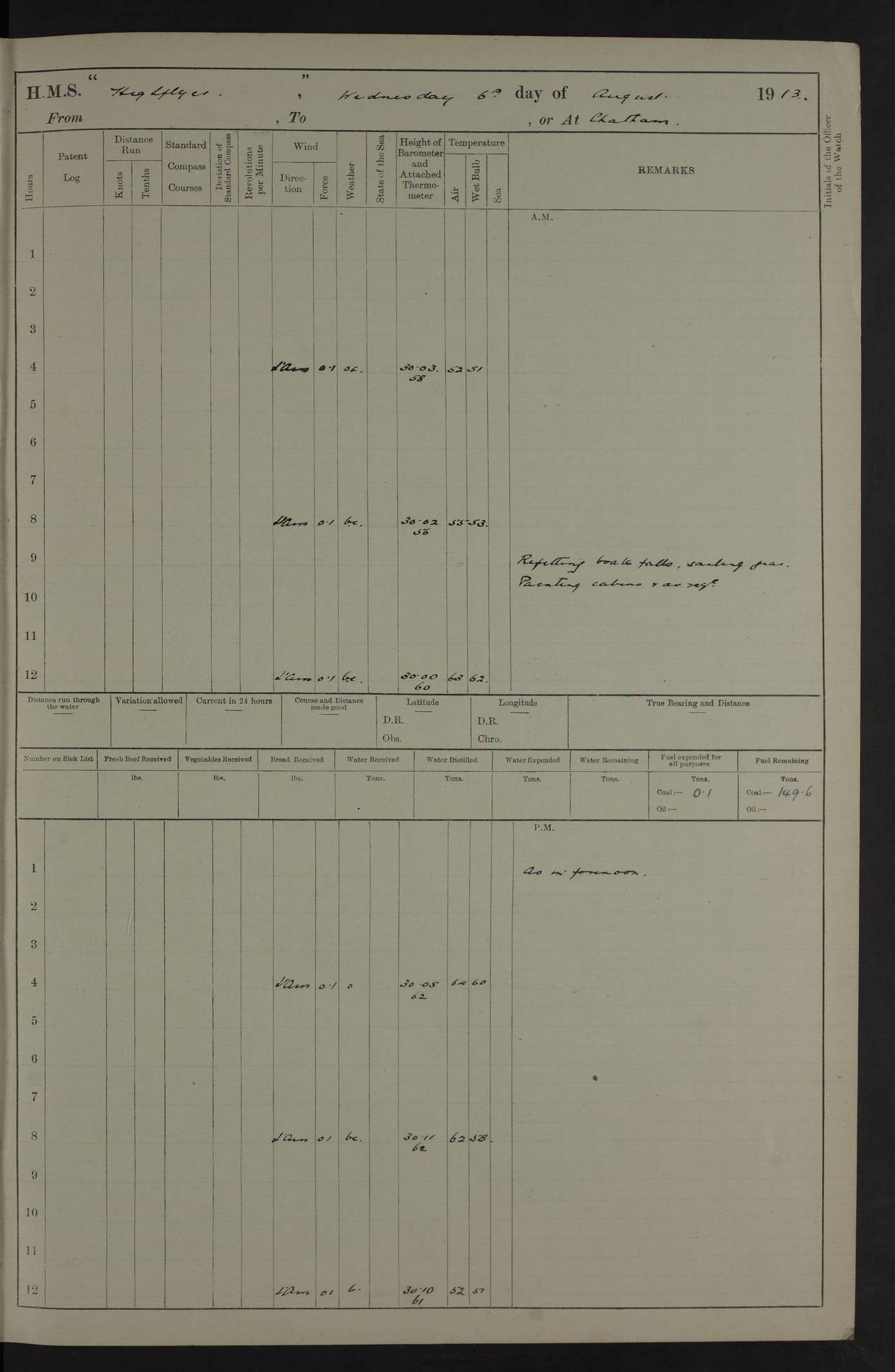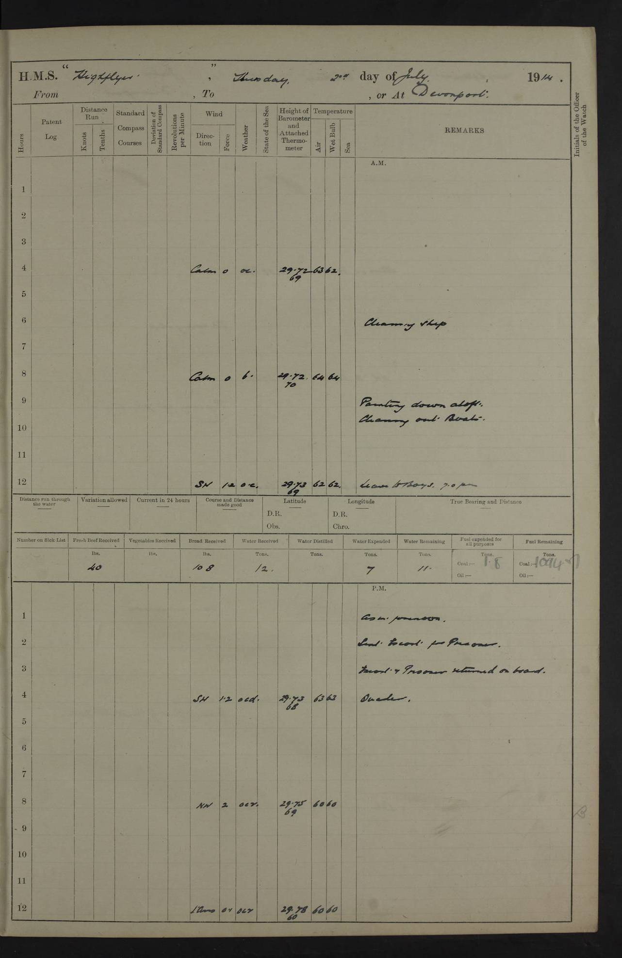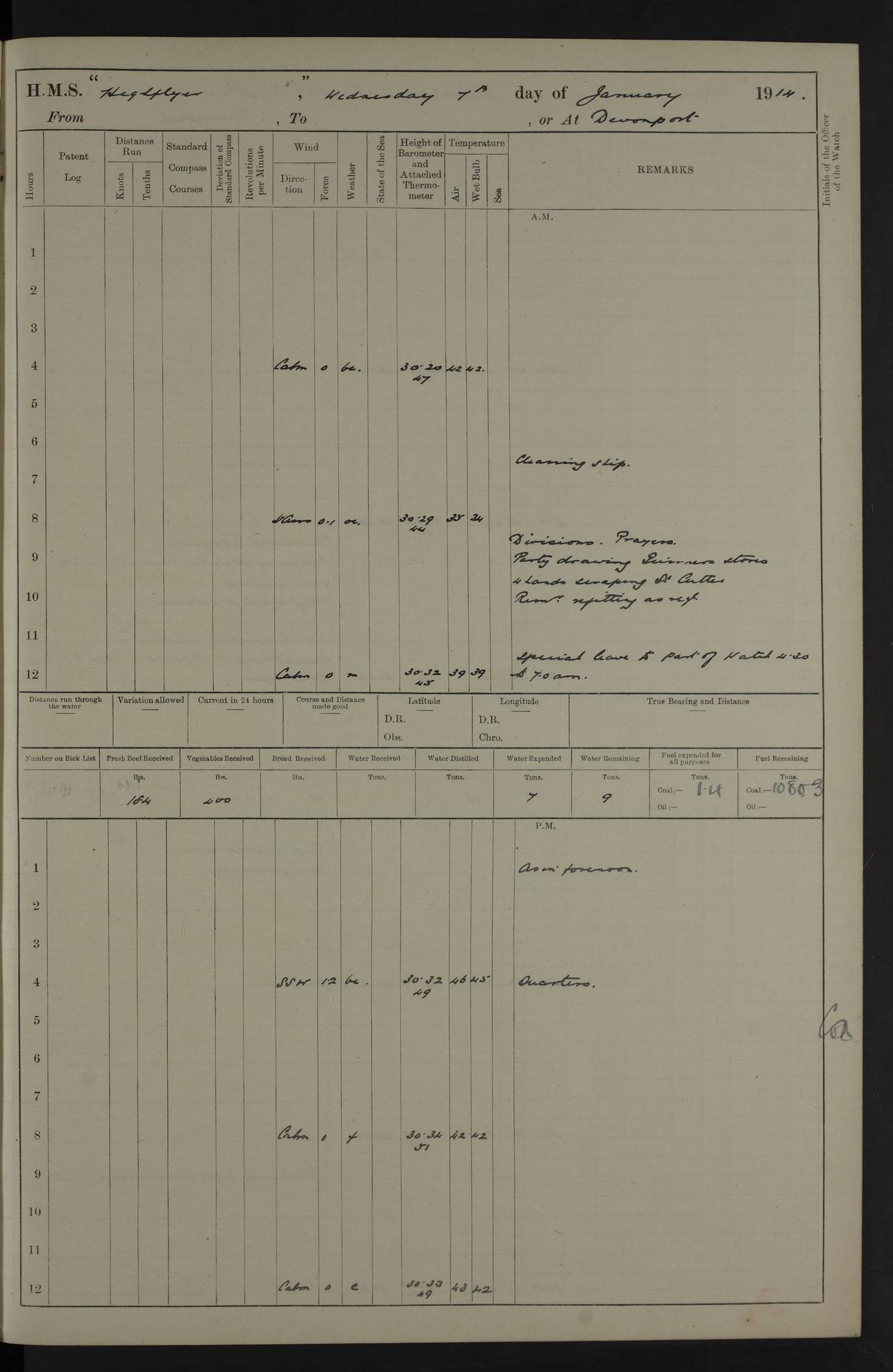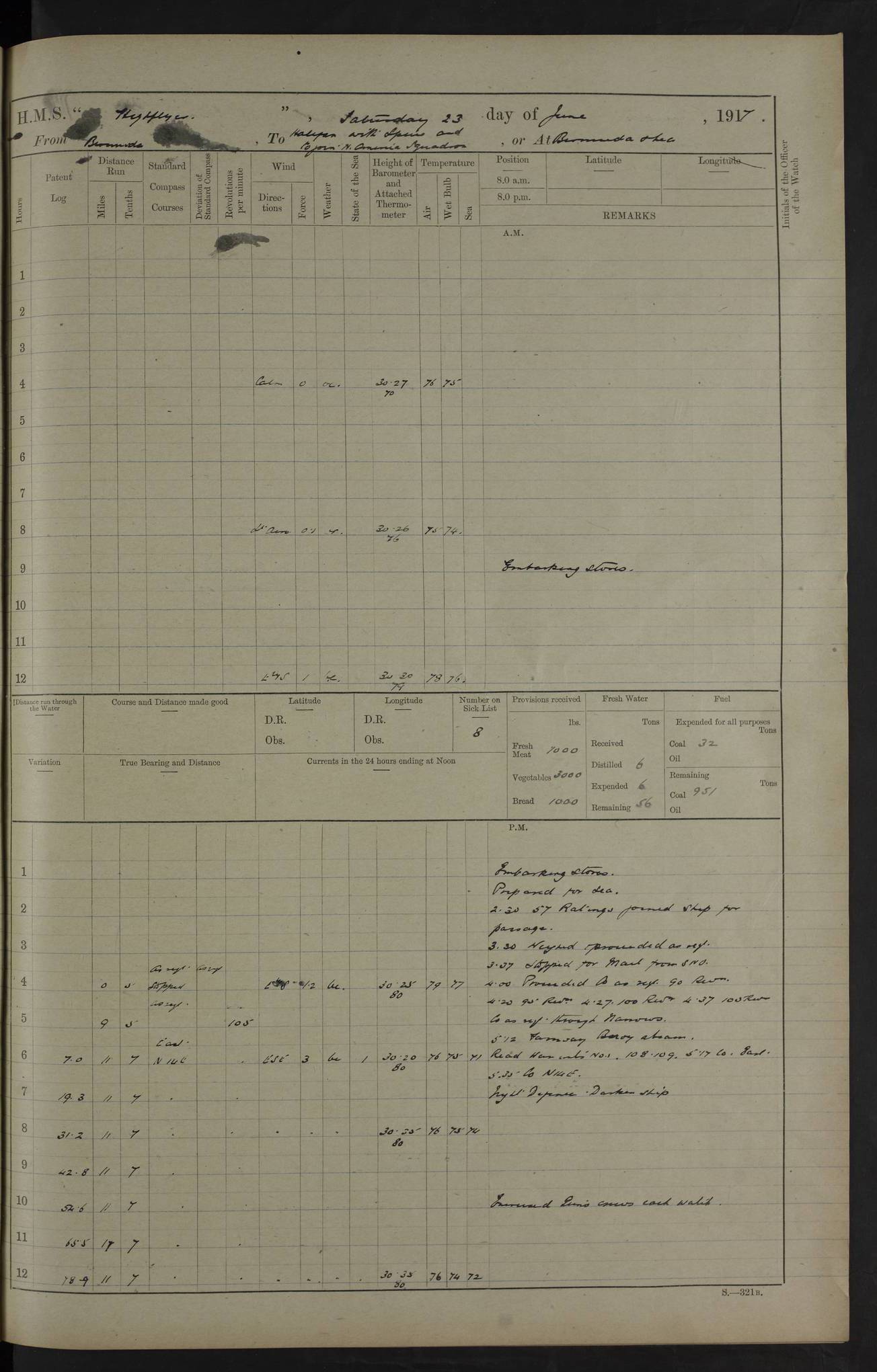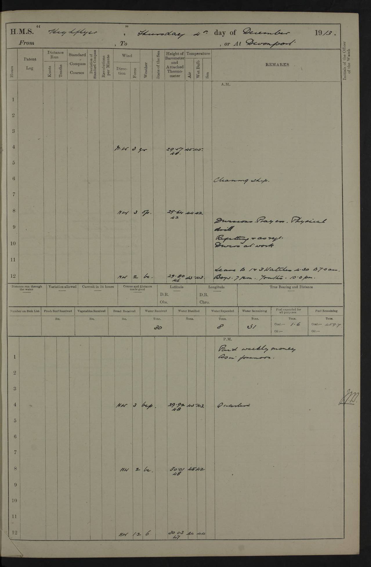 (Maps prepared using Journey Plotter, developed by Maikel. The Plots can only be approximate. They are made by joining-up positions on successive days, and sometimes positions are not given. There will therefore be occasions when the ship appears to have travelled overland) LOG BOOK – JUNE 14TH 1913 TO MAY 31ST 1914 4f960fe4a2fc8e2def00041b: (http://s3.amazonaws.com/oldweather/ADM53-44291/ADM 53-44291-001_0.jpg) 4f960fe5a2fc8e2def00041c: (http://s3.amazonaws.com/oldweather/ADM53-44291/ADM 53-44291-001_1.jpg) 4f960fe5a2fc8e2def00041d: (http://s3.amazonaws.com/oldweather/ADM53-44291/ADM 53-44291-002_0.jpg) 4f960fe5a2fc8e2def00041e: (http://s3.amazonaws.com/oldweather/ADM53-44291/ADM 53-44291-002_1.jpg) LOG of HMS Highflyer Commanded by Captain HT Buller MVO FOR THE PERIOD Commencing Saturday 14th June 1913 Ending Sunday 31st May 1914 Tonnage (displacement): 5600 Extreme length: 350 ft Extreme breadth: 54 ft ENGINES Manufacturer: Fairfield Shipbuilding & Engineering Co, Glasgow IHP: 10.000 Description: Vertical triple expansion 4 cylinders When fixed on board: 1898 BOILERS Manufacturer: Fairfield Shipbuilding & Engineering Co Description: Belleville with economisers 18 in No When made: 1898 When put in vessel: 1898 SCREW PROPELLER Manufacturer: Fairfield Shipbuilding & Engineering Co Description: Twin 3 bladed Admiralty design (bronze) General state of repair: Good 4f960fe6a2fc8e2def00041f: (http://s3.amazonaws.com/oldweather/ADM53-44291/ADM 53-44291-003_0.jpg) [Directions for using the log, figures to indicate the force of the wind and the state of the sea, and letters to denote the state of the weather.] 4f960fe6a2fc8e2def000420: (http://s3.amazonaws.com/oldweather/ADM53-44291/ADM 53-44291-003_1.jpg) Establishment of ship’s company Officers 32 Seamen 164 Boys 24 Marines 50 Engine-room establishment 134 Other non-executive ratings 466 BAROMETER Mercurial or aneroid: Mercurial Name of maker & number: Adie A 577 Height of cistern above sea: 9 feet Thermometers for air temperature Position in ship: Fore bridge Whether in screen: Yes Maker & number: Negretti & Zambra MO/A 9607 dry; from June 14, 1913 to June 1, 1914 MO/A 9603 wet; from June 14, 1913 to June 1, 1914 Thermometer for sea temperature Maker & number: J Hicks A 434; from June 14, 1913 to June 1, 1914 Position of standard compass Fore upper bridge DEVIATION OF STANDARD COMPASS Date obtained: August 29th 1913 Position: Sheerness, No 28 buoy ARMAMENT Fxle: one 6” QF PII S waist: four 6” QF PII P waist: four 6” QF PII OD: two 6” QF PII Battle deck: two 12-pounder 12-cwt SII S waist: three 12-pounder 12-cwt SII P waist: three 12-pounder 12-cwt SII AS deck: 3-pounder QF (Hotchkiss) P waist: 12-pounder 8-cwt field gun Torpedo armament 2 18” tubes BOATS 2 pinnaces, 36 ft sailing 2 cutters 1 gig, 30 ft 1 whaler 1 steam cutter, 32 ft MISCELLANEOUS INFORMATION Draught of water with bunkers full, and complete with provisions, stores and water: forward 22 ft 0 in, aft 23 ft 2 in Load draught, 600 tons coal: forward 19 ft 6 in, aft 21 ft 6 in Number of tons necessary to increase draught 1 inch: 31.5 Number of tons of coal carried (43 cubic feet per ton): a) At load draught, 600 b) With bunkers full, 1132 c) In places other than bunkers, nil Quantity of water carried: a) For boilers, 207 tons b) For drinking 60 tons THE VOYAGES OF HMS HIGHFLYER 1913-1914