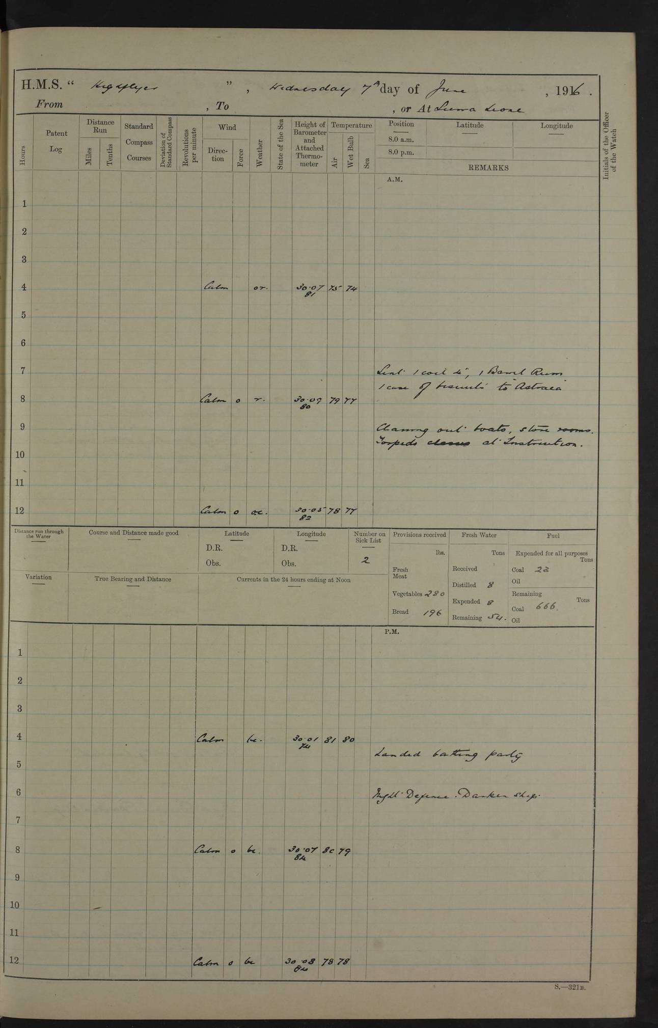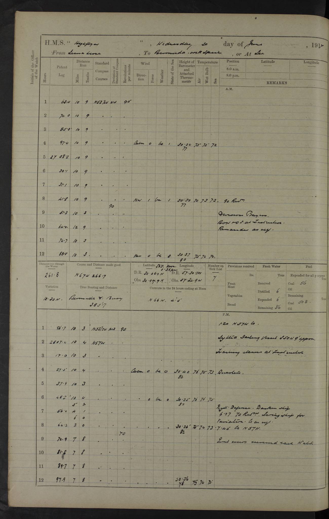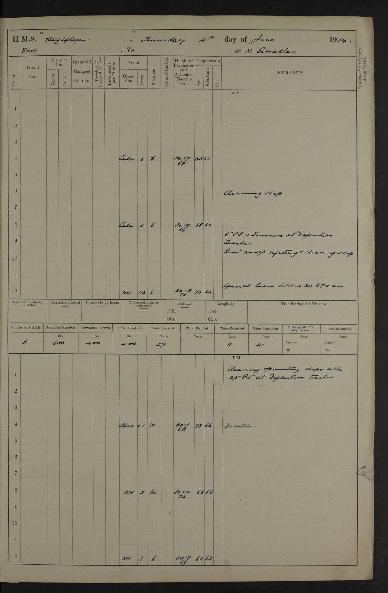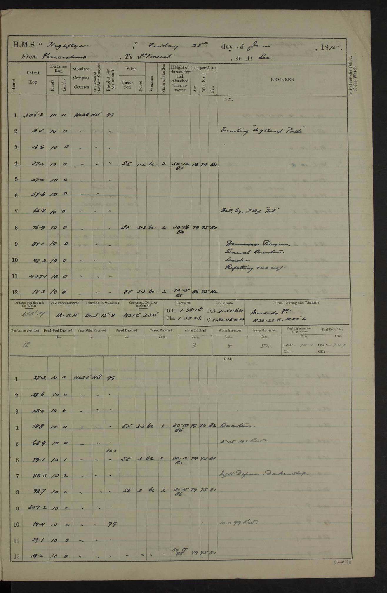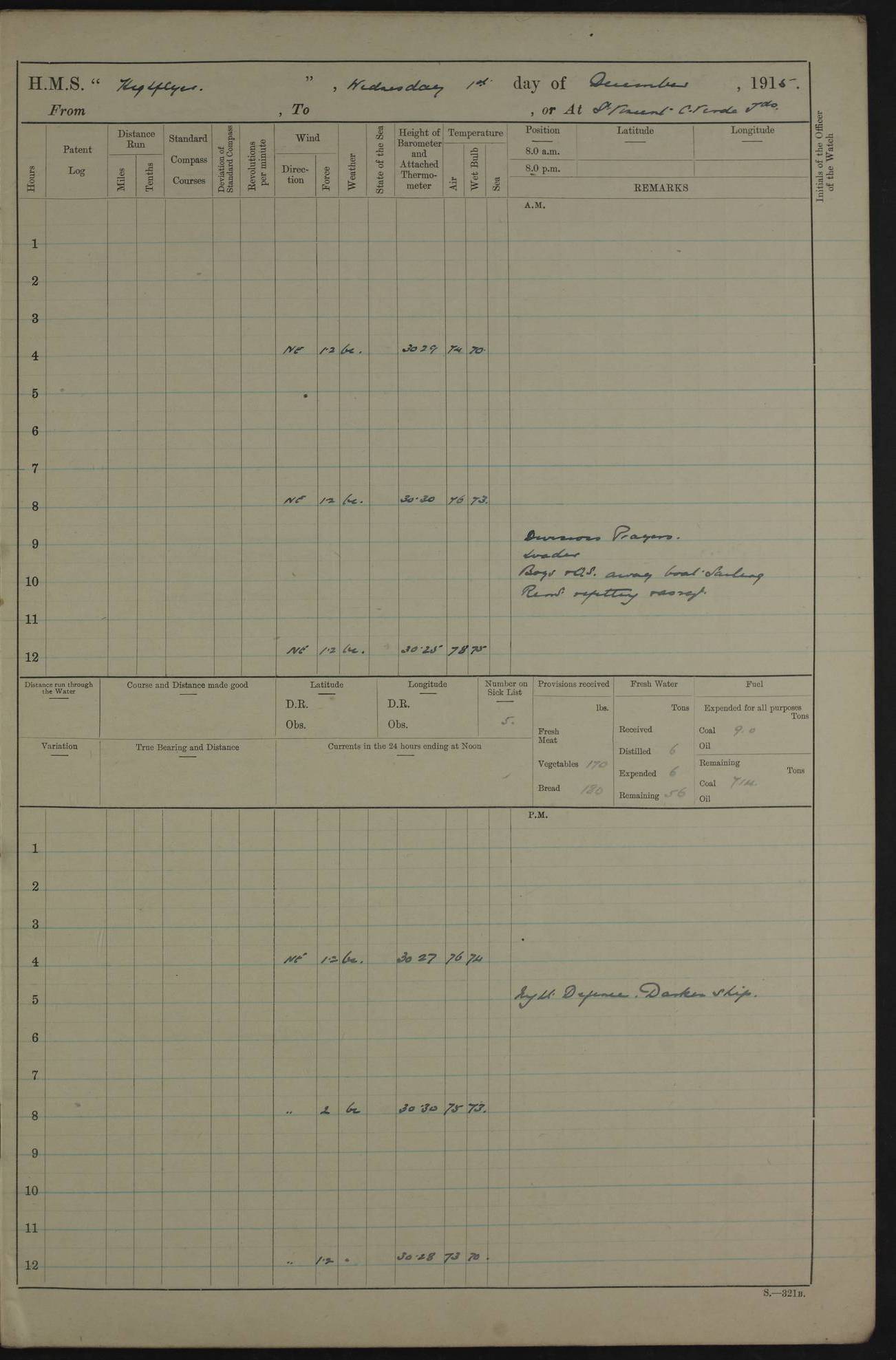 (Maps prepared using Journey Plotter, developed by Maikel. The Plots can only be approximate. They are made by joining-up positions on successive days, and sometimes positions are not given. There will therefore be occasions when the ship appears to have travelled overland) LOG BOOK – JUNE 14TH 1913 TO MAY 31ST 1914 4f960fe4a2fc8e2def00041b: (http://s3.amazonaws.com/oldweather/ADM53-44291/ADM 53-44291-001_0.jpg) 4f960fe5a2fc8e2def00041c: (http://s3.amazonaws.com/oldweather/ADM53-44291/ADM 53-44291-001_1.jpg) 4f960fe5a2fc8e2def00041d: (http://s3.amazonaws.com/oldweather/ADM53-44291/ADM 53-44291-002_0.jpg) 4f960fe5a2fc8e2def00041e: (http://s3.amazonaws.com/oldweather/ADM53-44291/ADM 53-44291-002_1.jpg) LOG of HMS Highflyer Commanded by Captain HT Buller MVO FOR THE PERIOD Commencing Saturday 14th June 1913 Ending Sunday 31st May 1914 Tonnage (displacement): 5600 Extreme length: 350 ft Extreme breadth: 54 ft ENGINES Manufacturer: Fairfield Shipbuilding & Engineering Co, Glasgow IHP: 10.000 Description: Vertical triple expansion 4 cylinders When fixed on board: 1898 BOILERS Manufacturer: Fairfield Shipbuilding & Engineering Co Description: Belleville with economisers 18 in No When made: 1898 When put in vessel: 1898 SCREW PROPELLER Manufacturer: Fairfield Shipbuilding & Engineering Co Description: Twin 3 bladed Admiralty design (bronze) General state of repair: Good 4f960fe6a2fc8e2def00041f: (http://s3.amazonaws.com/oldweather/ADM53-44291/ADM 53-44291-003_0.jpg) [Directions for using the log, figures to indicate the force of the wind and the state of the sea, and letters to denote the state of the weather.] 4f960fe6a2fc8e2def000420: (http://s3.amazonaws.com/oldweather/ADM53-44291/ADM 53-44291-003_1.jpg) Establishment of ship’s company Officers 32 Seamen 164 Boys 24 Marines 50 Engine-room establishment 134 Other non-executive ratings 466 BAROMETER Mercurial or aneroid: Mercurial Name of maker & number: Adie A 577 Height of cistern above sea: 9 feet Thermometers for air temperature Position in ship: Fore bridge Whether in screen: Yes Maker & number: Negretti & Zambra MO/A 9607 dry; from June 14, 1913 to June 1, 1914 MO/A 9603 wet; from June 14, 1913 to June 1, 1914 Thermometer for sea temperature Maker & number: J Hicks A 434; from June 14, 1913 to June 1, 1914 Position of standard compass Fore upper bridge DEVIATION OF STANDARD COMPASS Date obtained: August 29th 1913 Position: Sheerness, No 28 buoy ARMAMENT Fxle: one 6” QF PII S waist: four 6” QF PII P waist: four 6” QF PII OD: two 6” QF PII Battle deck: two 12-pounder 12-cwt SII S waist: three 12-pounder 12-cwt SII P waist: three 12-pounder 12-cwt SII AS deck: 3-pounder QF (Hotchkiss) P waist: 12-pounder 8-cwt field gun Torpedo armament 2 18” tubes BOATS 2 pinnaces, 36 ft sailing 2 cutters 1 gig, 30 ft 1 whaler 1 steam cutter, 32 ft MISCELLANEOUS INFORMATION Draught of water with bunkers full, and complete with provisions, stores and water: forward 22 ft 0 in, aft 23 ft 2 in Load draught, 600 tons coal: forward 19 ft 6 in, aft 21 ft 6 in Number of tons necessary to increase draught 1 inch: 31.5 Number of tons of coal carried (43 cubic feet per ton): a) At load draught, 600 b) With bunkers full, 1132 c) In places other than bunkers, nil Quantity of water carried: a) For boilers, 207 tons b) For drinking 60 tons THE VOYAGES OF HMS HIGHFLYER 1913-1914