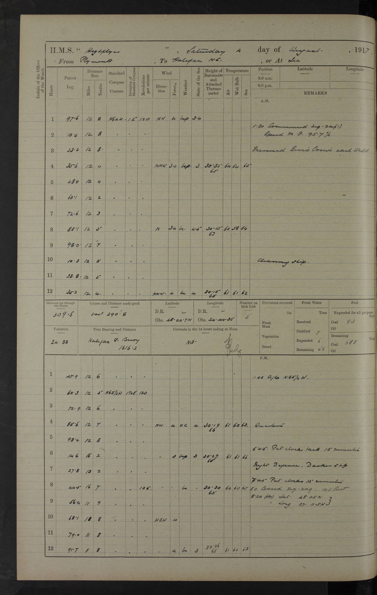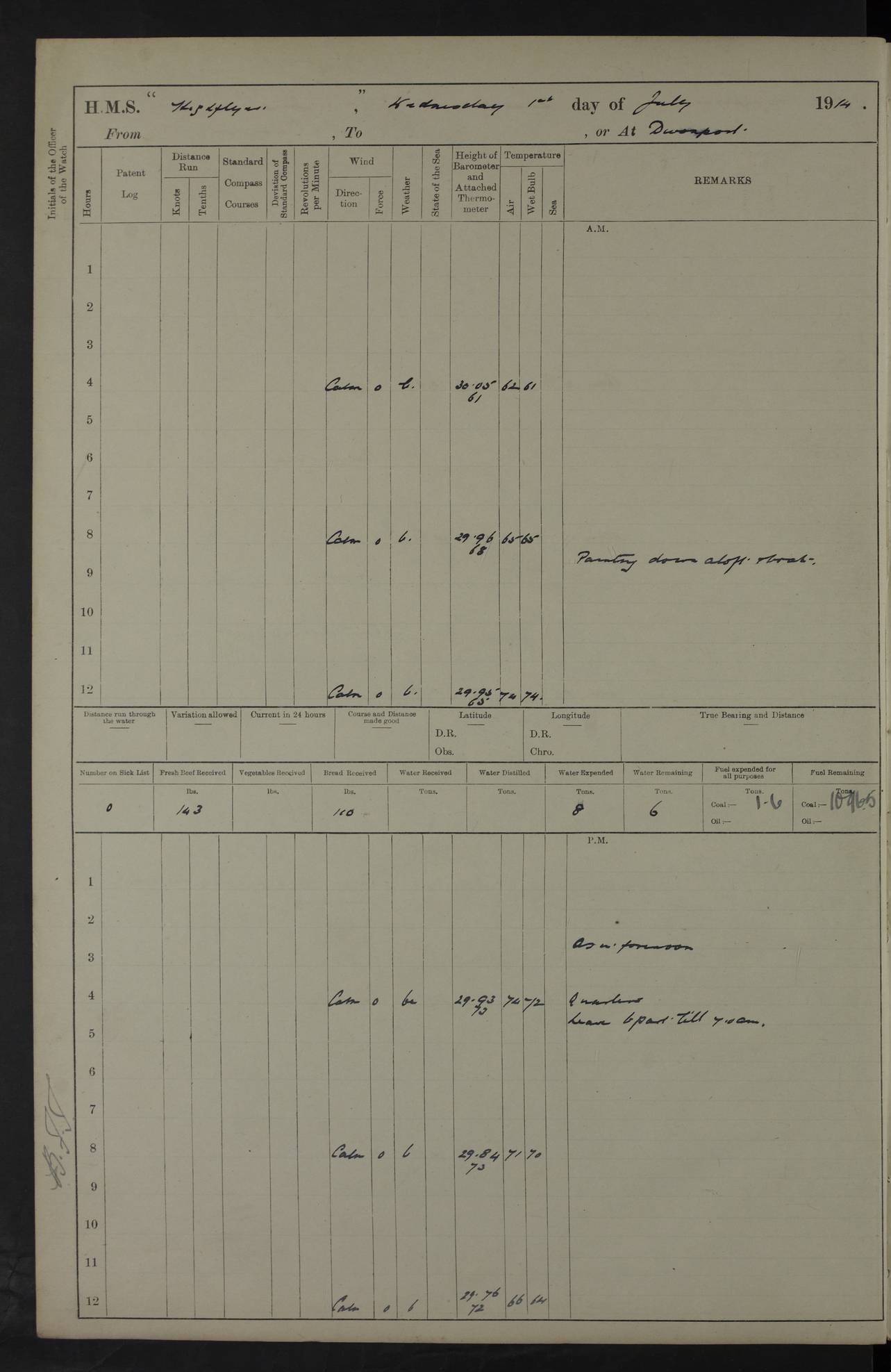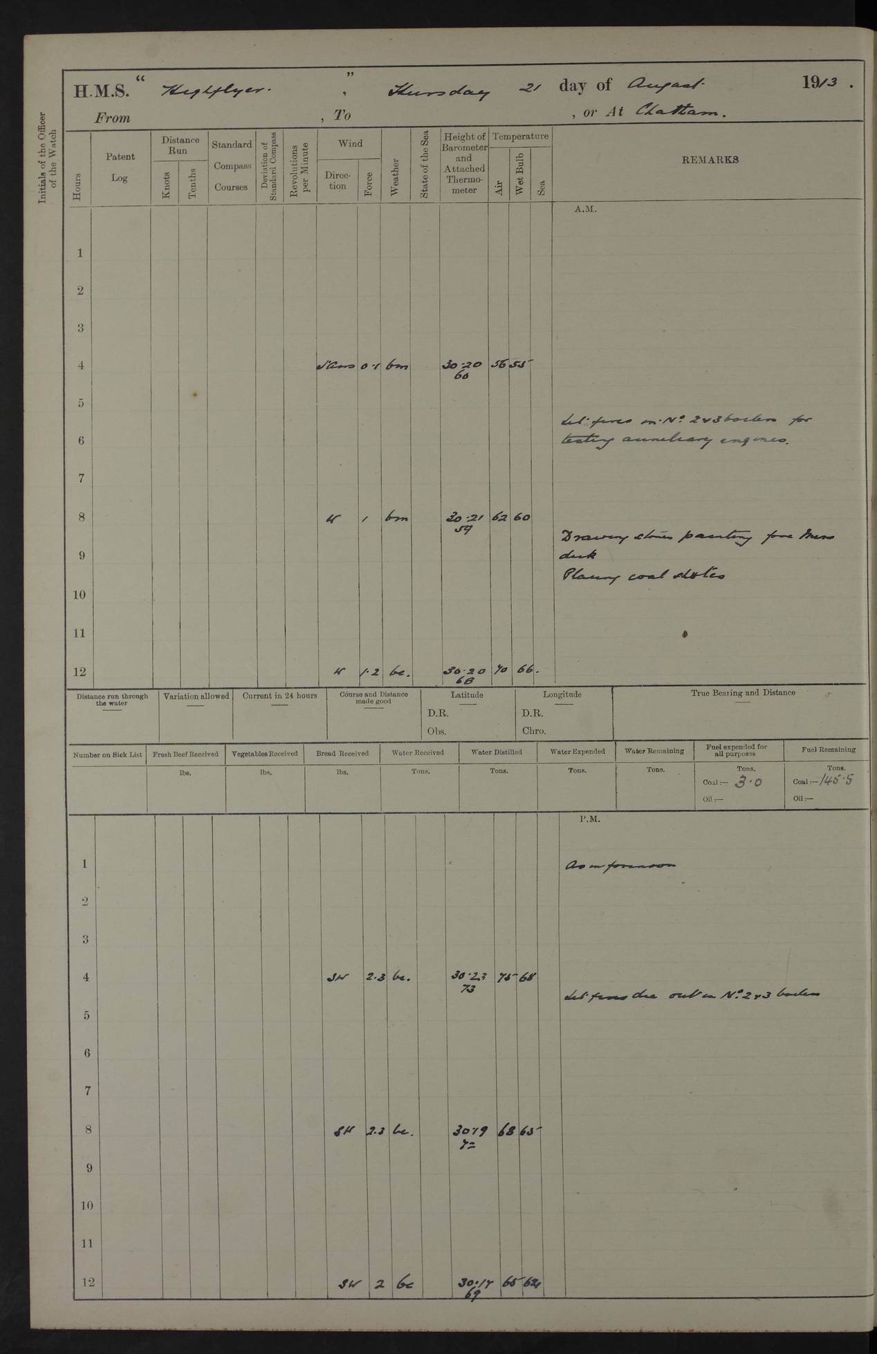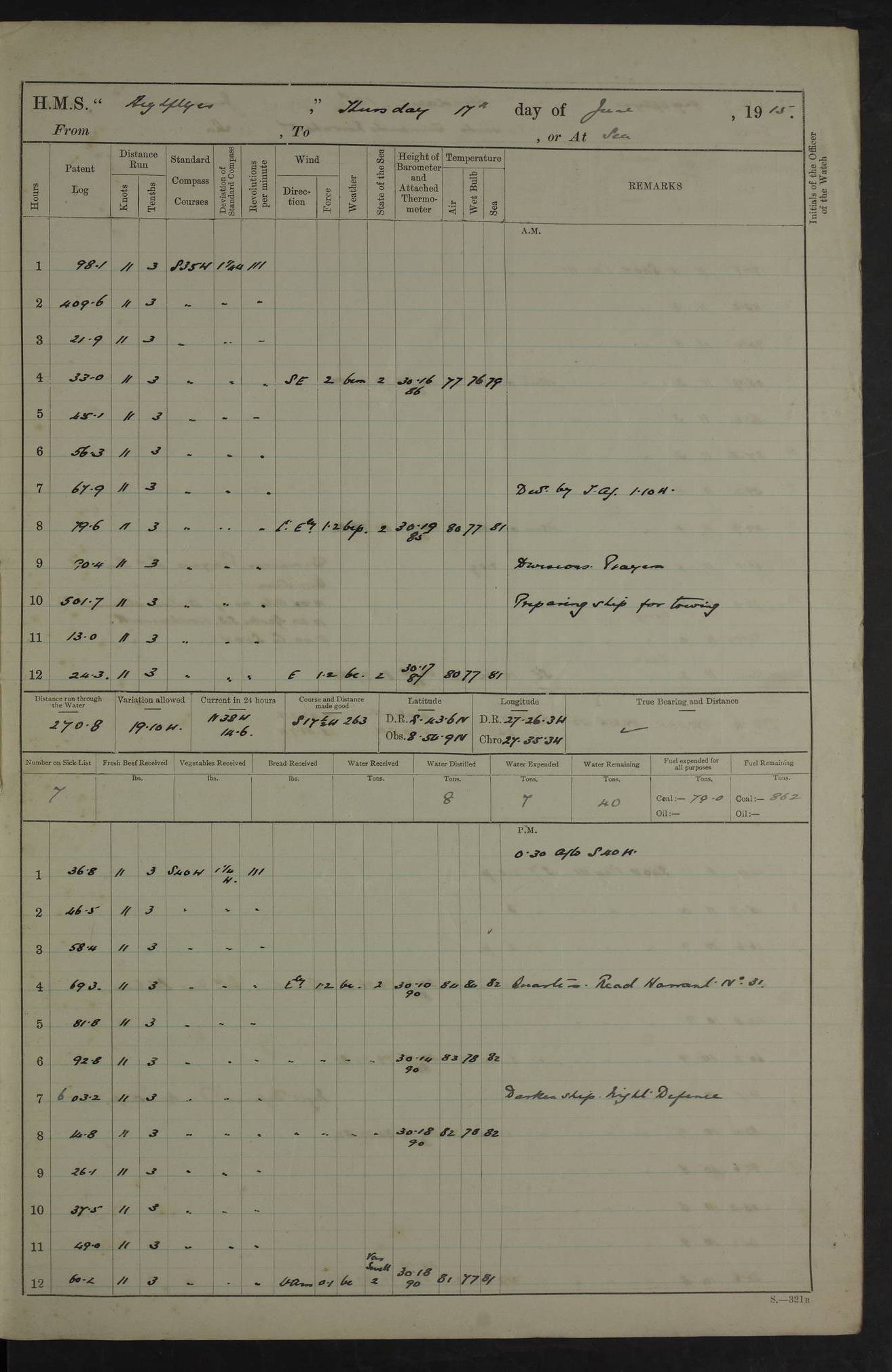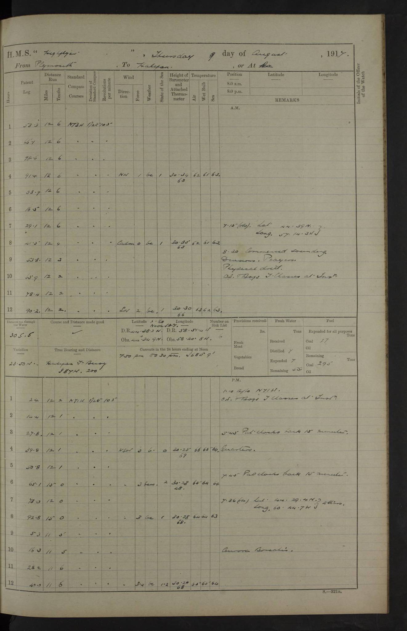 (Maps prepared using Journey Plotter, developed by Maikel. The Plots can only be approximate. They are made by joining-up positions on successive days, and sometimes positions are not given. There will therefore be occasions when the ship appears to have travelled overland) LOG BOOK – JUNE 14TH 1913 TO MAY 31ST 1914 4f960fe4a2fc8e2def00041b: (http://s3.amazonaws.com/oldweather/ADM53-44291/ADM 53-44291-001_0.jpg) 4f960fe5a2fc8e2def00041c: (http://s3.amazonaws.com/oldweather/ADM53-44291/ADM 53-44291-001_1.jpg) 4f960fe5a2fc8e2def00041d: (http://s3.amazonaws.com/oldweather/ADM53-44291/ADM 53-44291-002_0.jpg) 4f960fe5a2fc8e2def00041e: (http://s3.amazonaws.com/oldweather/ADM53-44291/ADM 53-44291-002_1.jpg) LOG of HMS Highflyer Commanded by Captain HT Buller MVO FOR THE PERIOD Commencing Saturday 14th June 1913 Ending Sunday 31st May 1914 Tonnage (displacement): 5600 Extreme length: 350 ft Extreme breadth: 54 ft ENGINES Manufacturer: Fairfield Shipbuilding & Engineering Co, Glasgow IHP: 10.000 Description: Vertical triple expansion 4 cylinders When fixed on board: 1898 BOILERS Manufacturer: Fairfield Shipbuilding & Engineering Co Description: Belleville with economisers 18 in No When made: 1898 When put in vessel: 1898 SCREW PROPELLER Manufacturer: Fairfield Shipbuilding & Engineering Co Description: Twin 3 bladed Admiralty design (bronze) General state of repair: Good 4f960fe6a2fc8e2def00041f: (http://s3.amazonaws.com/oldweather/ADM53-44291/ADM 53-44291-003_0.jpg) [Directions for using the log, figures to indicate the force of the wind and the state of the sea, and letters to denote the state of the weather.] 4f960fe6a2fc8e2def000420: (http://s3.amazonaws.com/oldweather/ADM53-44291/ADM 53-44291-003_1.jpg) Establishment of ship’s company Officers 32 Seamen 164 Boys 24 Marines 50 Engine-room establishment 134 Other non-executive ratings 466 BAROMETER Mercurial or aneroid: Mercurial Name of maker & number: Adie A 577 Height of cistern above sea: 9 feet Thermometers for air temperature Position in ship: Fore bridge Whether in screen: Yes Maker & number: Negretti & Zambra MO/A 9607 dry; from June 14, 1913 to June 1, 1914 MO/A 9603 wet; from June 14, 1913 to June 1, 1914 Thermometer for sea temperature Maker & number: J Hicks A 434; from June 14, 1913 to June 1, 1914 Position of standard compass Fore upper bridge DEVIATION OF STANDARD COMPASS Date obtained: August 29th 1913 Position: Sheerness, No 28 buoy ARMAMENT Fxle: one 6” QF PII S waist: four 6” QF PII P waist: four 6” QF PII OD: two 6” QF PII Battle deck: two 12-pounder 12-cwt SII S waist: three 12-pounder 12-cwt SII P waist: three 12-pounder 12-cwt SII AS deck: 3-pounder QF (Hotchkiss) P waist: 12-pounder 8-cwt field gun Torpedo armament 2 18” tubes BOATS 2 pinnaces, 36 ft sailing 2 cutters 1 gig, 30 ft 1 whaler 1 steam cutter, 32 ft MISCELLANEOUS INFORMATION Draught of water with bunkers full, and complete with provisions, stores and water: forward 22 ft 0 in, aft 23 ft 2 in Load draught, 600 tons coal: forward 19 ft 6 in, aft 21 ft 6 in Number of tons necessary to increase draught 1 inch: 31.5 Number of tons of coal carried (43 cubic feet per ton): a) At load draught, 600 b) With bunkers full, 1132 c) In places other than bunkers, nil Quantity of water carried: a) For boilers, 207 tons b) For drinking 60 tons THE VOYAGES OF HMS HIGHFLYER 1913-1914