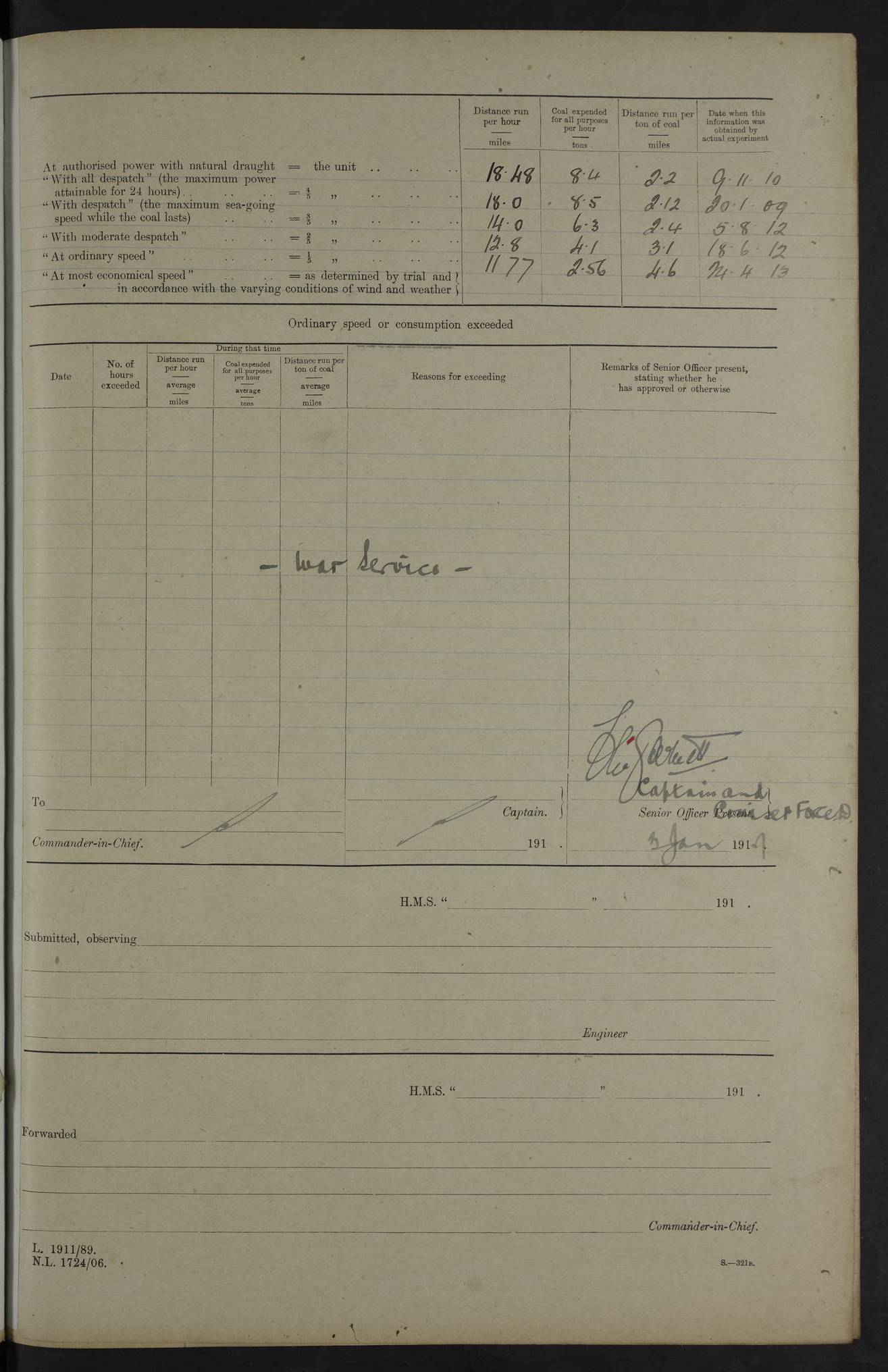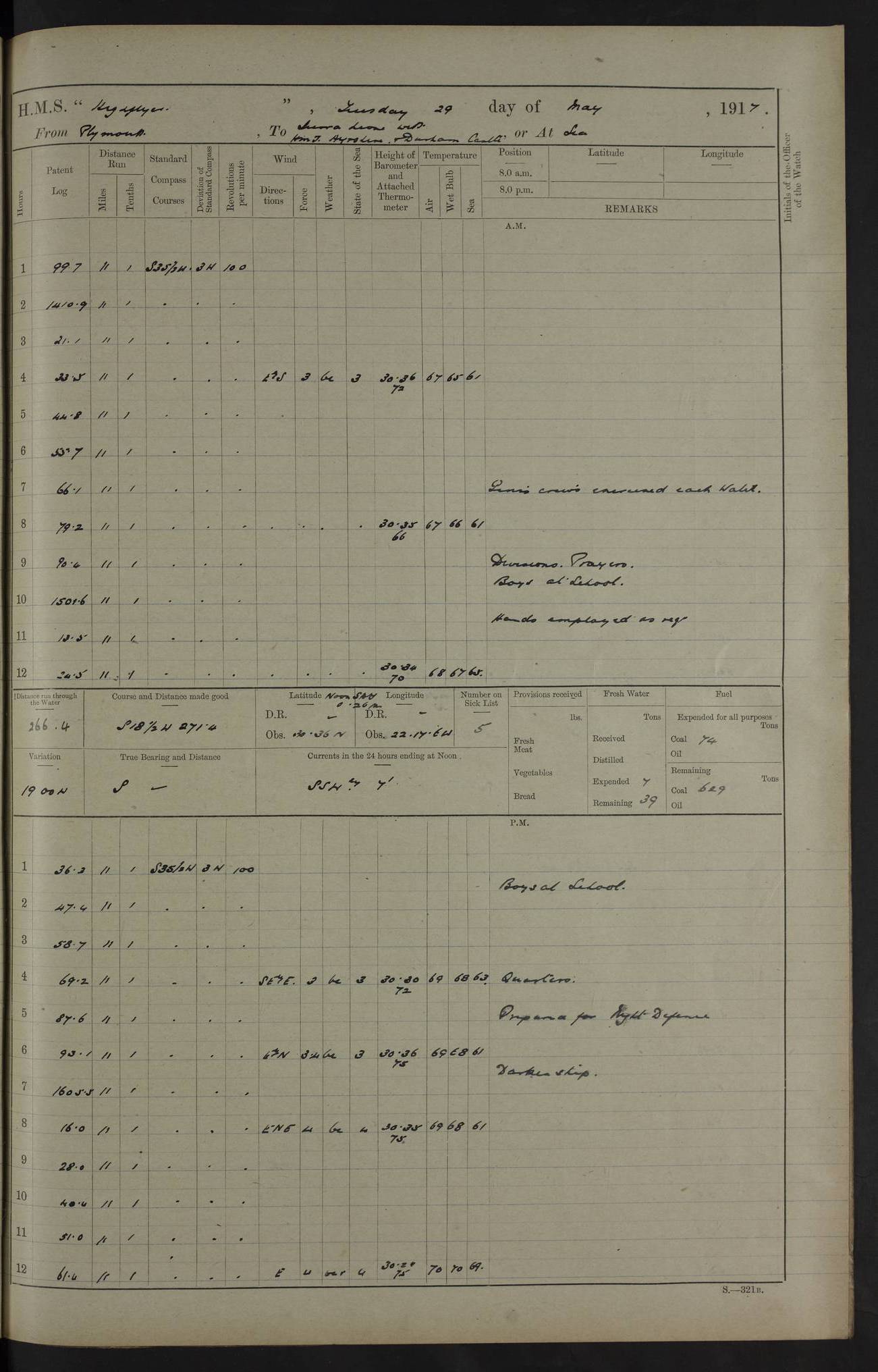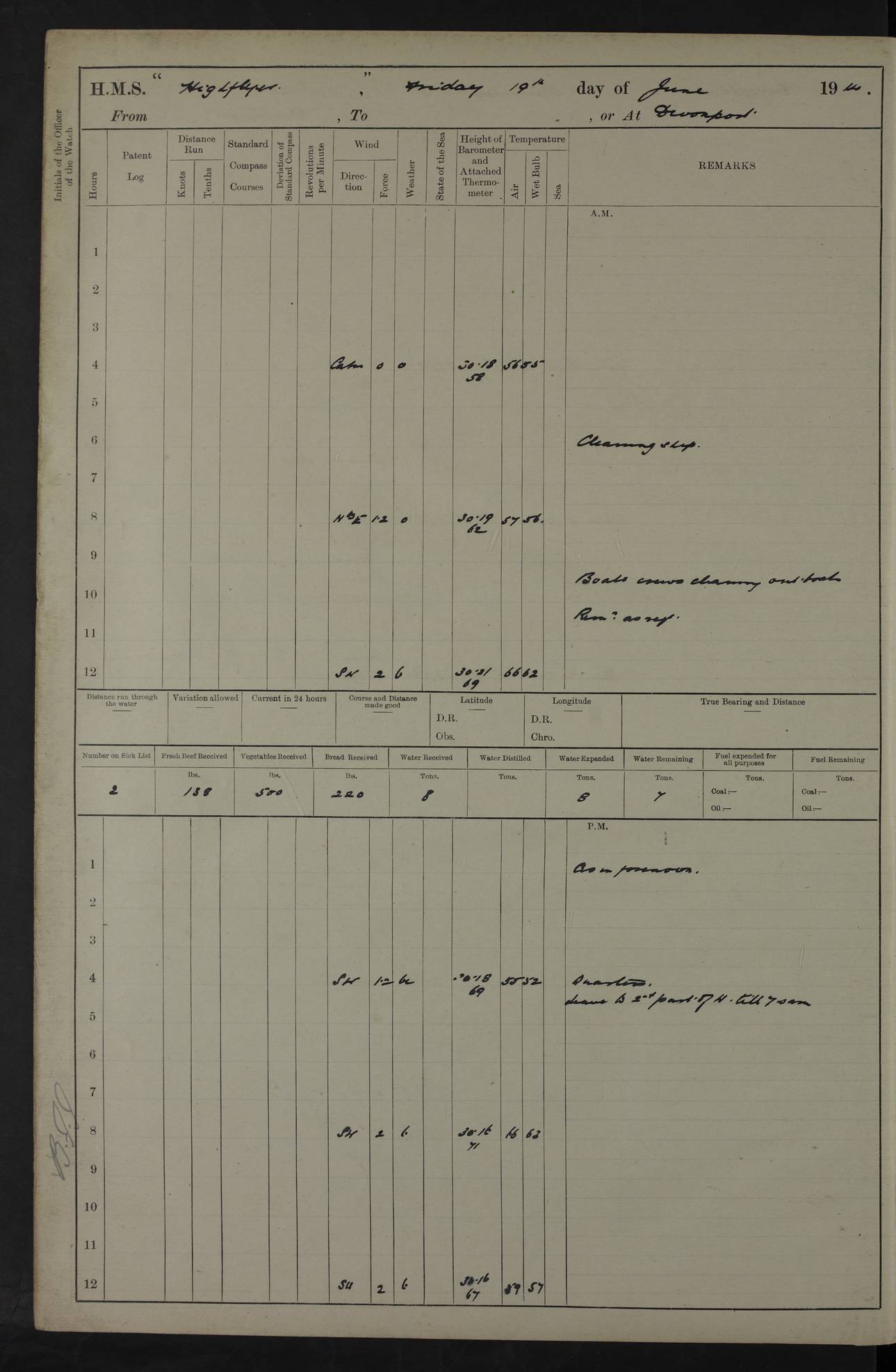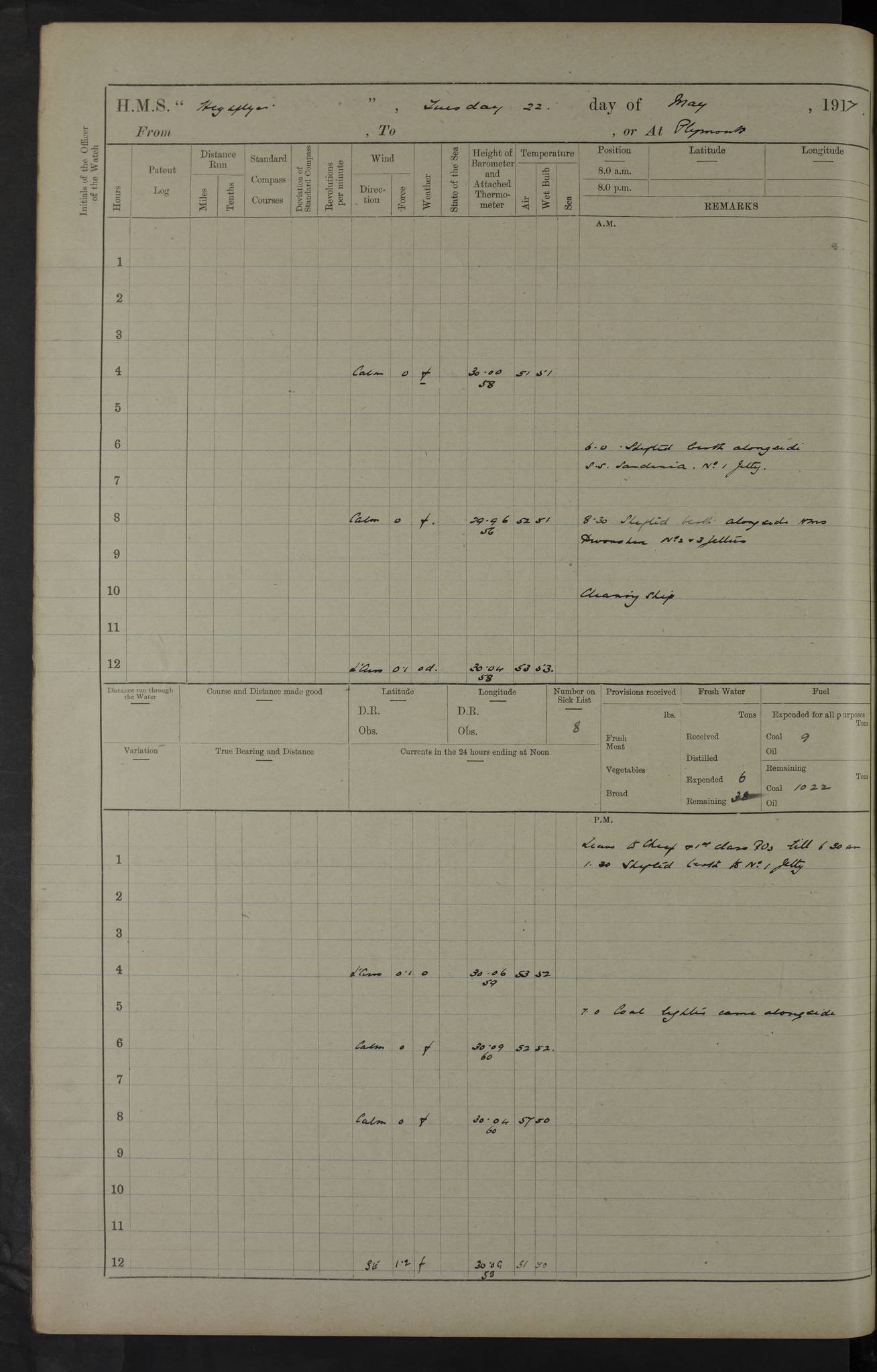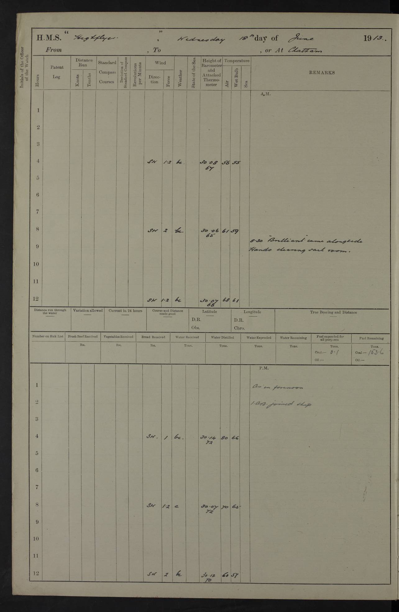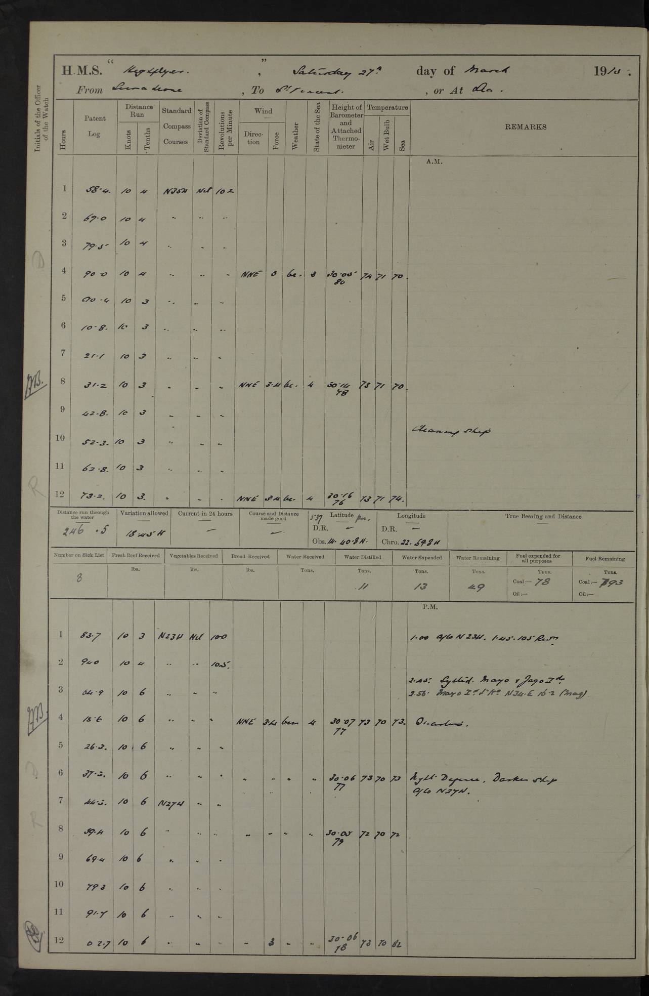 (Maps prepared using Journey Plotter, developed by Maikel. The Plots can only be approximate. They are made by joining-up positions on successive days, and sometimes positions are not given. There will therefore be occasions when the ship appears to have travelled overland) LOG BOOK – JUNE 14TH 1913 TO MAY 31ST 1914 4f960fe4a2fc8e2def00041b: (http://s3.amazonaws.com/oldweather/ADM53-44291/ADM 53-44291-001_0.jpg) 4f960fe5a2fc8e2def00041c: (http://s3.amazonaws.com/oldweather/ADM53-44291/ADM 53-44291-001_1.jpg) 4f960fe5a2fc8e2def00041d: (http://s3.amazonaws.com/oldweather/ADM53-44291/ADM 53-44291-002_0.jpg) 4f960fe5a2fc8e2def00041e: (http://s3.amazonaws.com/oldweather/ADM53-44291/ADM 53-44291-002_1.jpg) LOG of HMS Highflyer Commanded by Captain HT Buller MVO FOR THE PERIOD Commencing Saturday 14th June 1913 Ending Sunday 31st May 1914 Tonnage (displacement): 5600 Extreme length: 350 ft Extreme breadth: 54 ft ENGINES Manufacturer: Fairfield Shipbuilding & Engineering Co, Glasgow IHP: 10.000 Description: Vertical triple expansion 4 cylinders When fixed on board: 1898 BOILERS Manufacturer: Fairfield Shipbuilding & Engineering Co Description: Belleville with economisers 18 in No When made: 1898 When put in vessel: 1898 SCREW PROPELLER Manufacturer: Fairfield Shipbuilding & Engineering Co Description: Twin 3 bladed Admiralty design (bronze) General state of repair: Good 4f960fe6a2fc8e2def00041f: (http://s3.amazonaws.com/oldweather/ADM53-44291/ADM 53-44291-003_0.jpg) [Directions for using the log, figures to indicate the force of the wind and the state of the sea, and letters to denote the state of the weather.] 4f960fe6a2fc8e2def000420: (http://s3.amazonaws.com/oldweather/ADM53-44291/ADM 53-44291-003_1.jpg) Establishment of ship’s company Officers 32 Seamen 164 Boys 24 Marines 50 Engine-room establishment 134 Other non-executive ratings 466 BAROMETER Mercurial or aneroid: Mercurial Name of maker & number: Adie A 577 Height of cistern above sea: 9 feet Thermometers for air temperature Position in ship: Fore bridge Whether in screen: Yes Maker & number: Negretti & Zambra MO/A 9607 dry; from June 14, 1913 to June 1, 1914 MO/A 9603 wet; from June 14, 1913 to June 1, 1914 Thermometer for sea temperature Maker & number: J Hicks A 434; from June 14, 1913 to June 1, 1914 Position of standard compass Fore upper bridge DEVIATION OF STANDARD COMPASS Date obtained: August 29th 1913 Position: Sheerness, No 28 buoy ARMAMENT Fxle: one 6” QF PII S waist: four 6” QF PII P waist: four 6” QF PII OD: two 6” QF PII Battle deck: two 12-pounder 12-cwt SII S waist: three 12-pounder 12-cwt SII P waist: three 12-pounder 12-cwt SII AS deck: 3-pounder QF (Hotchkiss) P waist: 12-pounder 8-cwt field gun Torpedo armament 2 18” tubes BOATS 2 pinnaces, 36 ft sailing 2 cutters 1 gig, 30 ft 1 whaler 1 steam cutter, 32 ft MISCELLANEOUS INFORMATION Draught of water with bunkers full, and complete with provisions, stores and water: forward 22 ft 0 in, aft 23 ft 2 in Load draught, 600 tons coal: forward 19 ft 6 in, aft 21 ft 6 in Number of tons necessary to increase draught 1 inch: 31.5 Number of tons of coal carried (43 cubic feet per ton): a) At load draught, 600 b) With bunkers full, 1132 c) In places other than bunkers, nil Quantity of water carried: a) For boilers, 207 tons b) For drinking 60 tons THE VOYAGES OF HMS HIGHFLYER 1913-1914