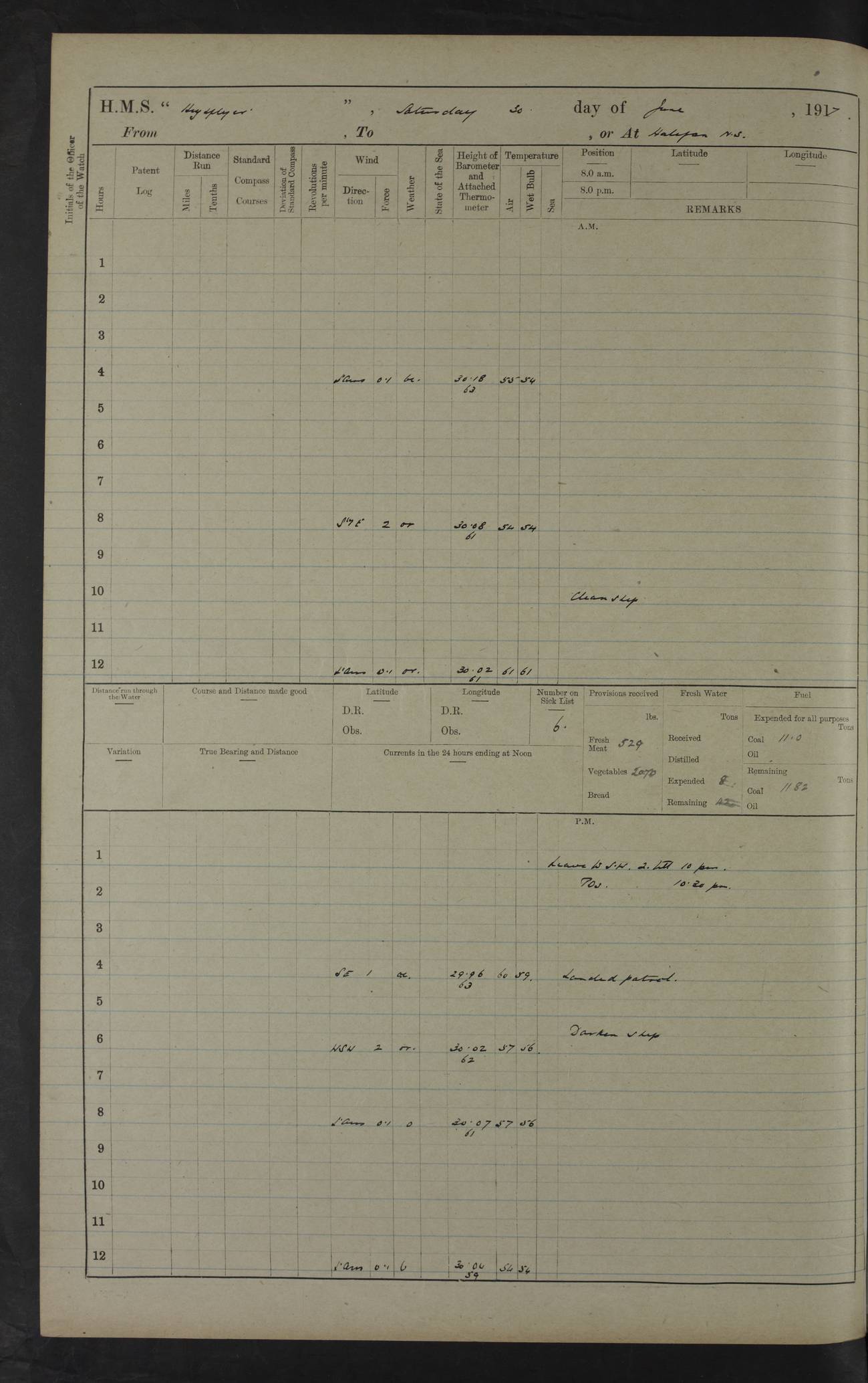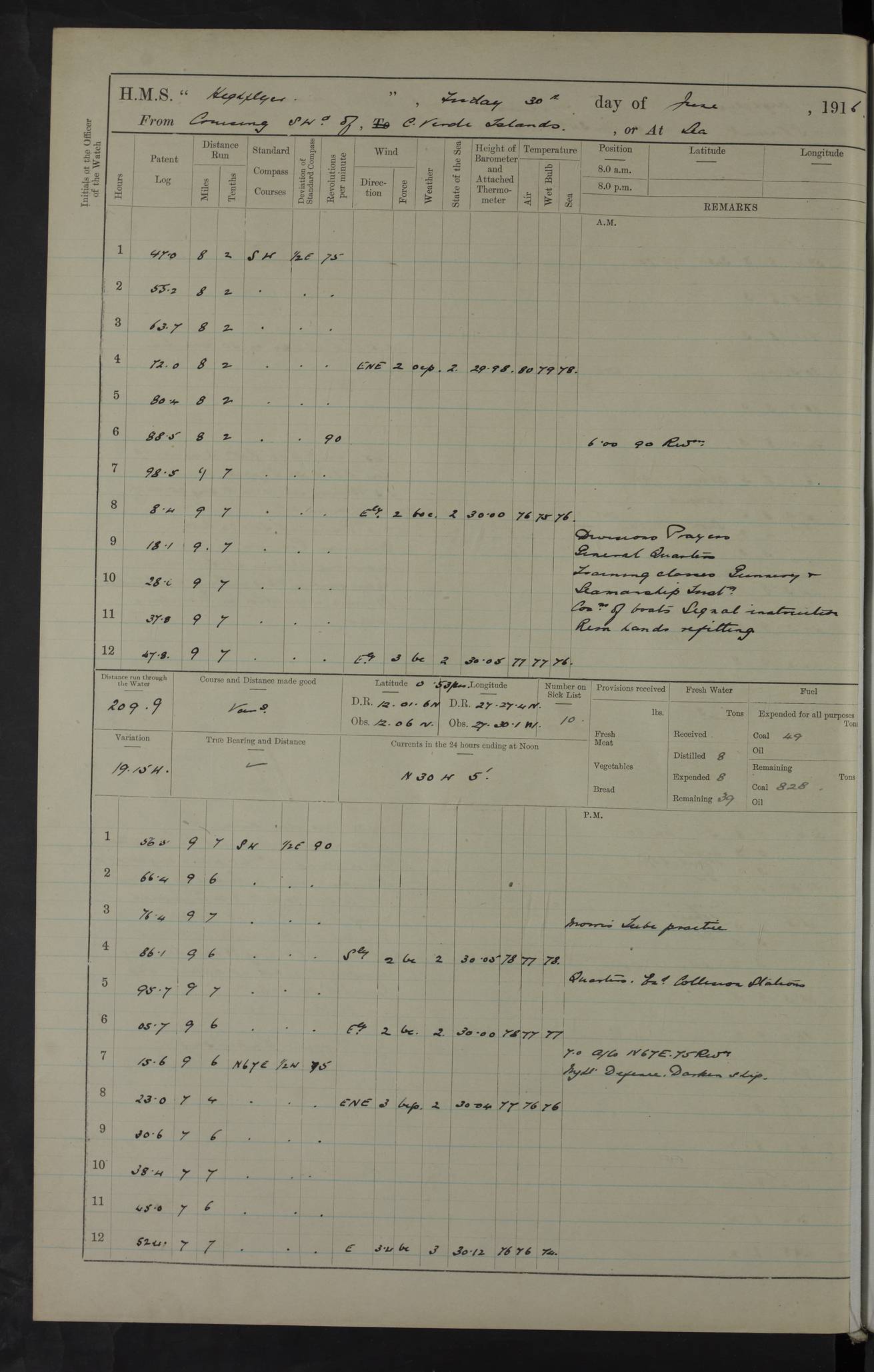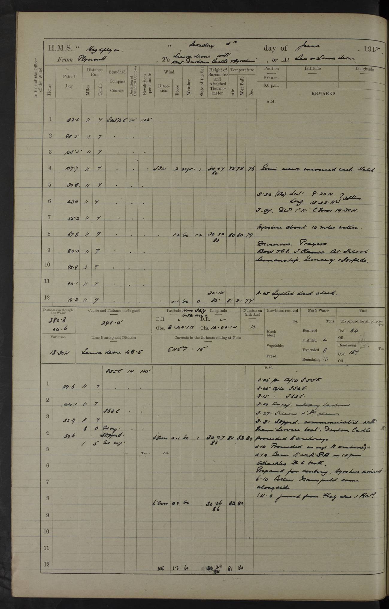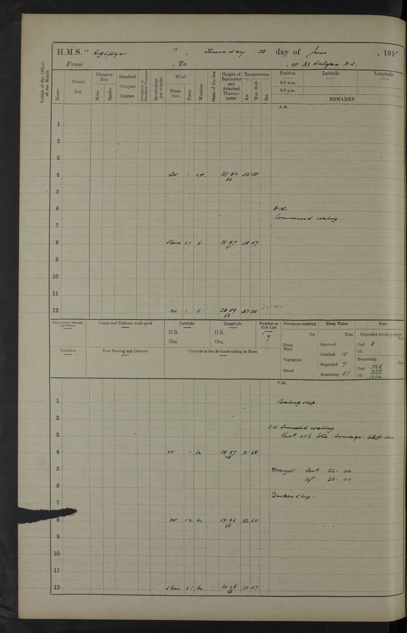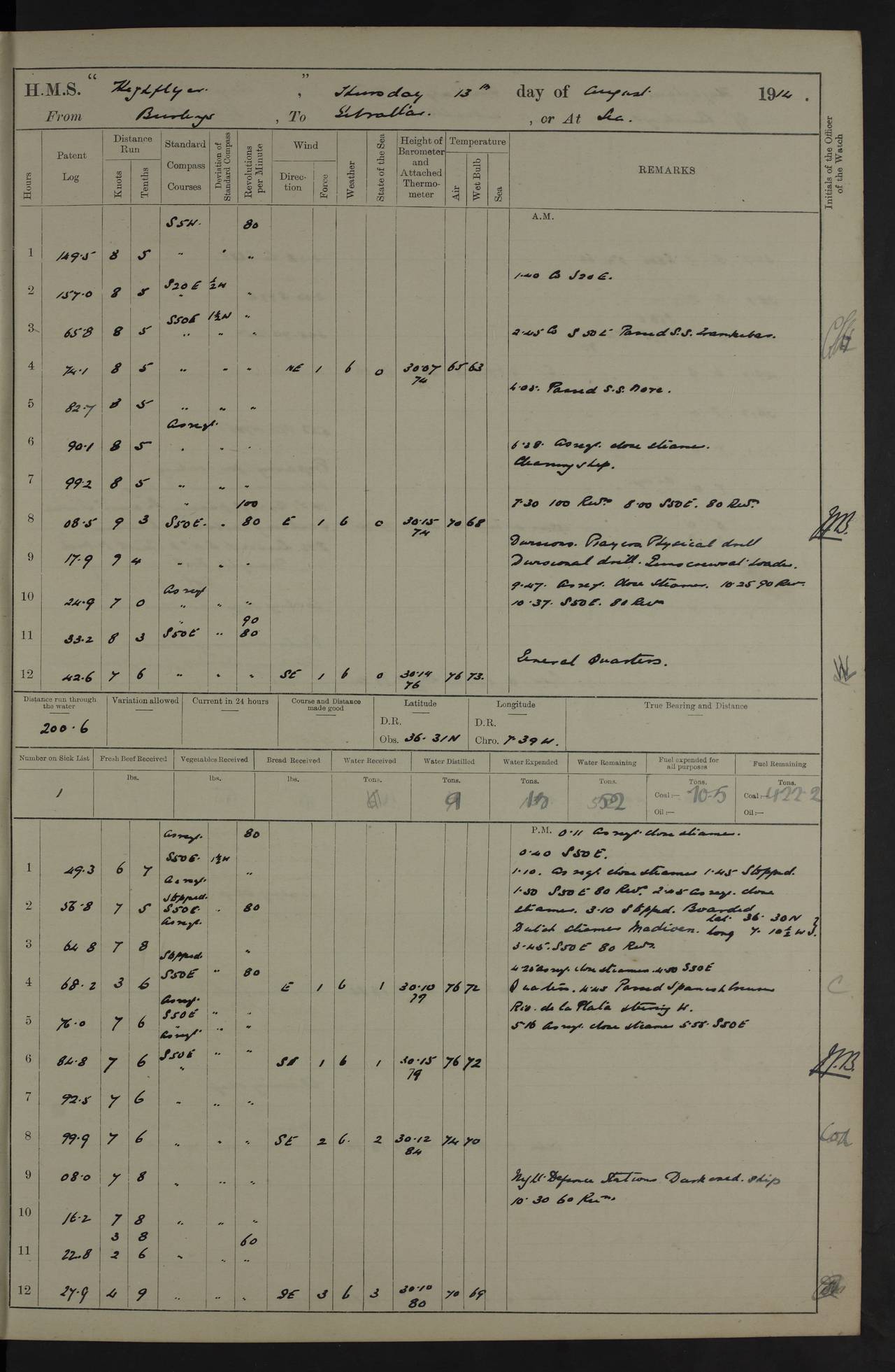 (Maps prepared using Journey Plotter, developed by Maikel. The Plots can only be approximate. They are made by joining-up positions on successive days, and sometimes positions are not given. There will therefore be occasions when the ship appears to have travelled overland) LOG BOOK – JUNE 14TH 1913 TO MAY 31ST 1914 4f960fe4a2fc8e2def00041b: (http://s3.amazonaws.com/oldweather/ADM53-44291/ADM 53-44291-001_0.jpg) 4f960fe5a2fc8e2def00041c: (http://s3.amazonaws.com/oldweather/ADM53-44291/ADM 53-44291-001_1.jpg) 4f960fe5a2fc8e2def00041d: (http://s3.amazonaws.com/oldweather/ADM53-44291/ADM 53-44291-002_0.jpg) 4f960fe5a2fc8e2def00041e: (http://s3.amazonaws.com/oldweather/ADM53-44291/ADM 53-44291-002_1.jpg) LOG of HMS Highflyer Commanded by Captain HT Buller MVO FOR THE PERIOD Commencing Saturday 14th June 1913 Ending Sunday 31st May 1914 Tonnage (displacement): 5600 Extreme length: 350 ft Extreme breadth: 54 ft ENGINES Manufacturer: Fairfield Shipbuilding & Engineering Co, Glasgow IHP: 10.000 Description: Vertical triple expansion 4 cylinders When fixed on board: 1898 BOILERS Manufacturer: Fairfield Shipbuilding & Engineering Co Description: Belleville with economisers 18 in No When made: 1898 When put in vessel: 1898 SCREW PROPELLER Manufacturer: Fairfield Shipbuilding & Engineering Co Description: Twin 3 bladed Admiralty design (bronze) General state of repair: Good 4f960fe6a2fc8e2def00041f: (http://s3.amazonaws.com/oldweather/ADM53-44291/ADM 53-44291-003_0.jpg) [Directions for using the log, figures to indicate the force of the wind and the state of the sea, and letters to denote the state of the weather.] 4f960fe6a2fc8e2def000420: (http://s3.amazonaws.com/oldweather/ADM53-44291/ADM 53-44291-003_1.jpg) Establishment of ship’s company Officers 32 Seamen 164 Boys 24 Marines 50 Engine-room establishment 134 Other non-executive ratings 466 BAROMETER Mercurial or aneroid: Mercurial Name of maker & number: Adie A 577 Height of cistern above sea: 9 feet Thermometers for air temperature Position in ship: Fore bridge Whether in screen: Yes Maker & number: Negretti & Zambra MO/A 9607 dry; from June 14, 1913 to June 1, 1914 MO/A 9603 wet; from June 14, 1913 to June 1, 1914 Thermometer for sea temperature Maker & number: J Hicks A 434; from June 14, 1913 to June 1, 1914 Position of standard compass Fore upper bridge DEVIATION OF STANDARD COMPASS Date obtained: August 29th 1913 Position: Sheerness, No 28 buoy ARMAMENT Fxle: one 6” QF PII S waist: four 6” QF PII P waist: four 6” QF PII OD: two 6” QF PII Battle deck: two 12-pounder 12-cwt SII S waist: three 12-pounder 12-cwt SII P waist: three 12-pounder 12-cwt SII AS deck: 3-pounder QF (Hotchkiss) P waist: 12-pounder 8-cwt field gun Torpedo armament 2 18” tubes BOATS 2 pinnaces, 36 ft sailing 2 cutters 1 gig, 30 ft 1 whaler 1 steam cutter, 32 ft MISCELLANEOUS INFORMATION Draught of water with bunkers full, and complete with provisions, stores and water: forward 22 ft 0 in, aft 23 ft 2 in Load draught, 600 tons coal: forward 19 ft 6 in, aft 21 ft 6 in Number of tons necessary to increase draught 1 inch: 31.5 Number of tons of coal carried (43 cubic feet per ton): a) At load draught, 600 b) With bunkers full, 1132 c) In places other than bunkers, nil Quantity of water carried: a) For boilers, 207 tons b) For drinking 60 tons THE VOYAGES OF HMS HIGHFLYER 1913-1914