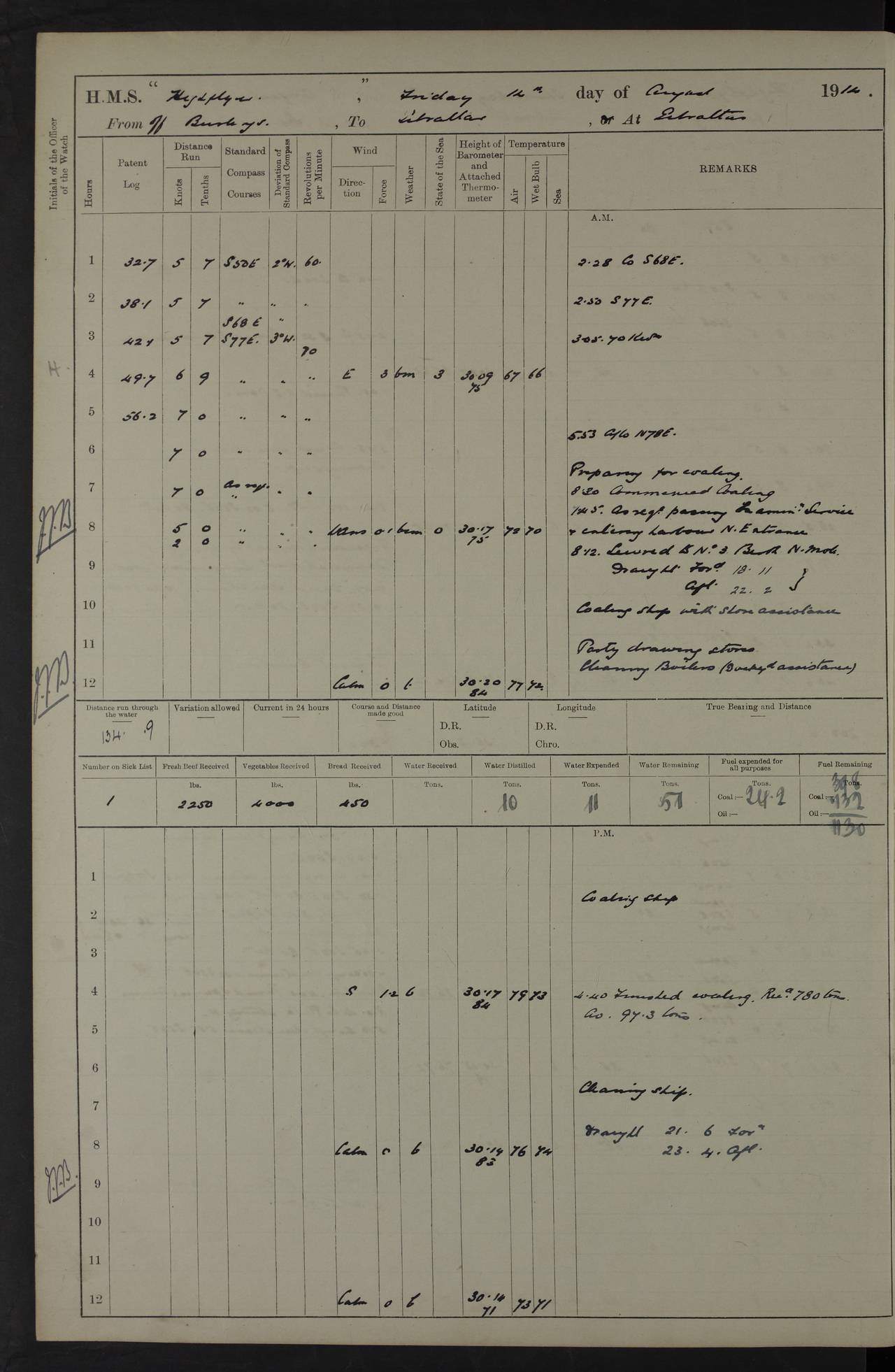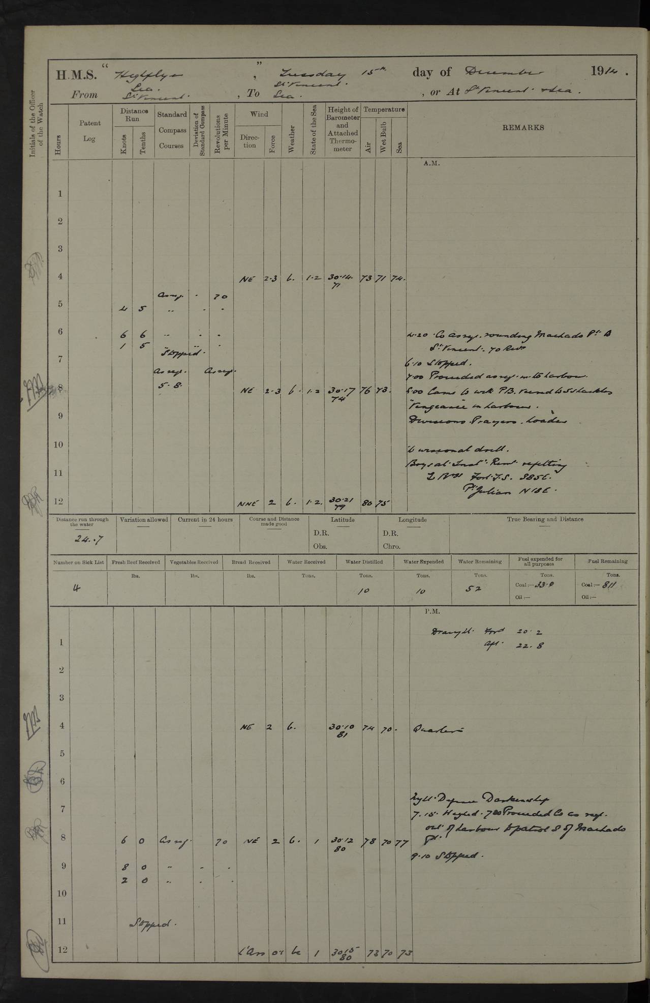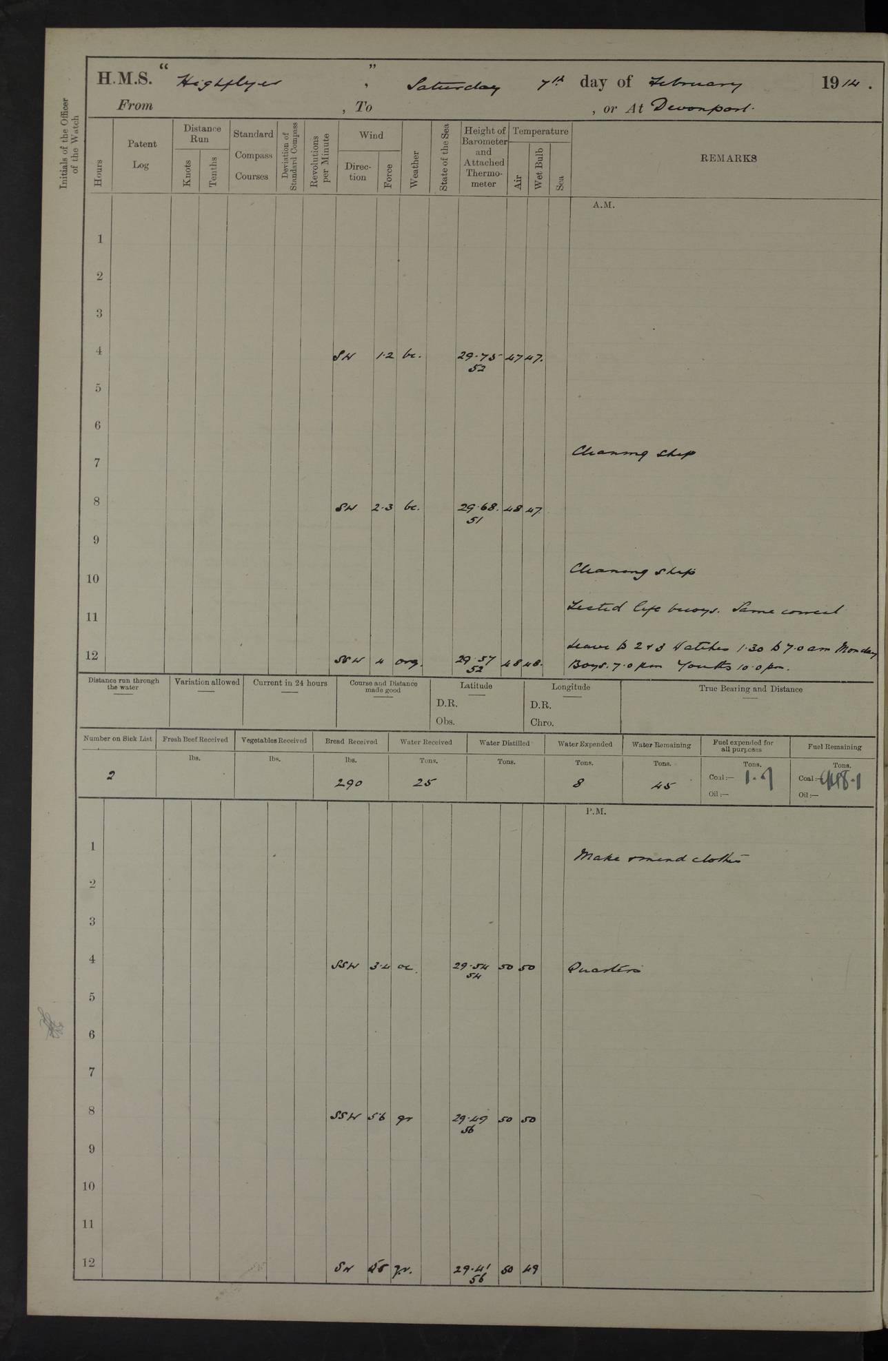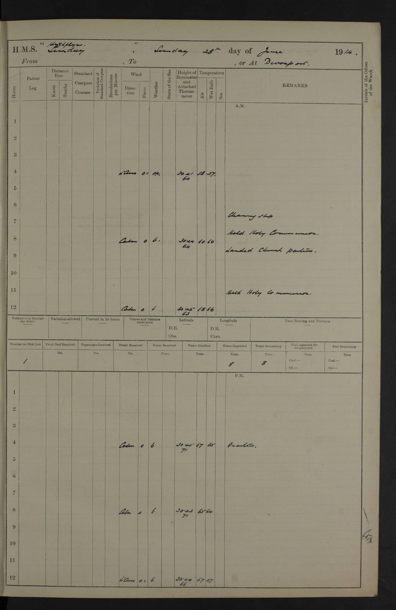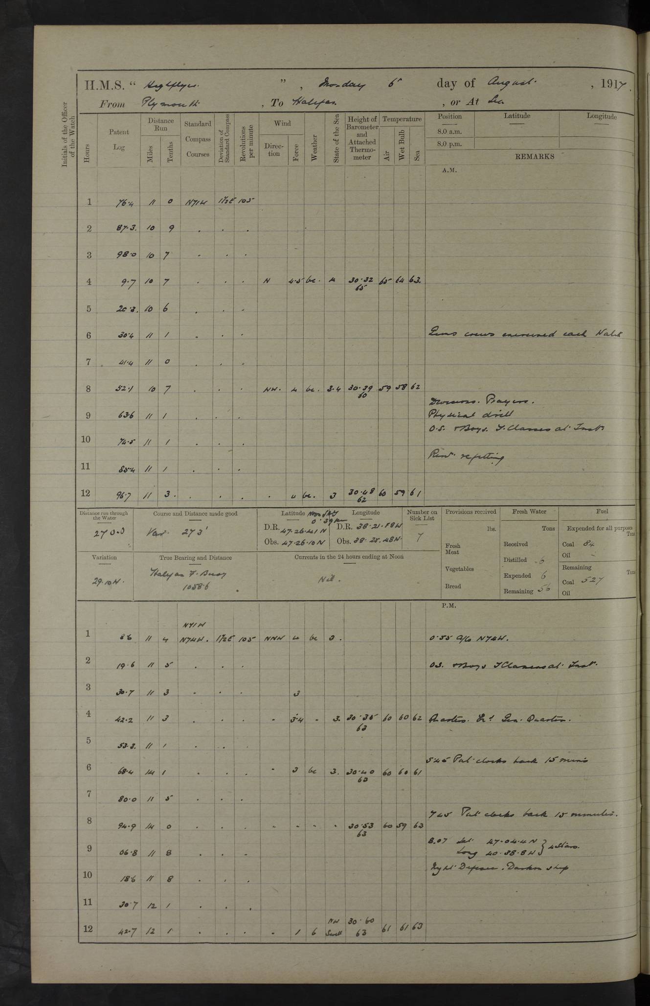 (Maps prepared using Journey Plotter, developed by Maikel. The Plots can only be approximate. They are made by joining-up positions on successive days, and sometimes positions are not given. There will therefore be occasions when the ship appears to have travelled overland) LOG BOOK – JUNE 14TH 1913 TO MAY 31ST 1914 4f960fe4a2fc8e2def00041b: (http://s3.amazonaws.com/oldweather/ADM53-44291/ADM 53-44291-001_0.jpg) 4f960fe5a2fc8e2def00041c: (http://s3.amazonaws.com/oldweather/ADM53-44291/ADM 53-44291-001_1.jpg) 4f960fe5a2fc8e2def00041d: (http://s3.amazonaws.com/oldweather/ADM53-44291/ADM 53-44291-002_0.jpg) 4f960fe5a2fc8e2def00041e: (http://s3.amazonaws.com/oldweather/ADM53-44291/ADM 53-44291-002_1.jpg) LOG of HMS Highflyer Commanded by Captain HT Buller MVO FOR THE PERIOD Commencing Saturday 14th June 1913 Ending Sunday 31st May 1914 Tonnage (displacement): 5600 Extreme length: 350 ft Extreme breadth: 54 ft ENGINES Manufacturer: Fairfield Shipbuilding & Engineering Co, Glasgow IHP: 10.000 Description: Vertical triple expansion 4 cylinders When fixed on board: 1898 BOILERS Manufacturer: Fairfield Shipbuilding & Engineering Co Description: Belleville with economisers 18 in No When made: 1898 When put in vessel: 1898 SCREW PROPELLER Manufacturer: Fairfield Shipbuilding & Engineering Co Description: Twin 3 bladed Admiralty design (bronze) General state of repair: Good 4f960fe6a2fc8e2def00041f: (http://s3.amazonaws.com/oldweather/ADM53-44291/ADM 53-44291-003_0.jpg) [Directions for using the log, figures to indicate the force of the wind and the state of the sea, and letters to denote the state of the weather.] 4f960fe6a2fc8e2def000420: (http://s3.amazonaws.com/oldweather/ADM53-44291/ADM 53-44291-003_1.jpg) Establishment of ship’s company Officers 32 Seamen 164 Boys 24 Marines 50 Engine-room establishment 134 Other non-executive ratings 466 BAROMETER Mercurial or aneroid: Mercurial Name of maker & number: Adie A 577 Height of cistern above sea: 9 feet Thermometers for air temperature Position in ship: Fore bridge Whether in screen: Yes Maker & number: Negretti & Zambra MO/A 9607 dry; from June 14, 1913 to June 1, 1914 MO/A 9603 wet; from June 14, 1913 to June 1, 1914 Thermometer for sea temperature Maker & number: J Hicks A 434; from June 14, 1913 to June 1, 1914 Position of standard compass Fore upper bridge DEVIATION OF STANDARD COMPASS Date obtained: August 29th 1913 Position: Sheerness, No 28 buoy ARMAMENT Fxle: one 6” QF PII S waist: four 6” QF PII P waist: four 6” QF PII OD: two 6” QF PII Battle deck: two 12-pounder 12-cwt SII S waist: three 12-pounder 12-cwt SII P waist: three 12-pounder 12-cwt SII AS deck: 3-pounder QF (Hotchkiss) P waist: 12-pounder 8-cwt field gun Torpedo armament 2 18” tubes BOATS 2 pinnaces, 36 ft sailing 2 cutters 1 gig, 30 ft 1 whaler 1 steam cutter, 32 ft MISCELLANEOUS INFORMATION Draught of water with bunkers full, and complete with provisions, stores and water: forward 22 ft 0 in, aft 23 ft 2 in Load draught, 600 tons coal: forward 19 ft 6 in, aft 21 ft 6 in Number of tons necessary to increase draught 1 inch: 31.5 Number of tons of coal carried (43 cubic feet per ton): a) At load draught, 600 b) With bunkers full, 1132 c) In places other than bunkers, nil Quantity of water carried: a) For boilers, 207 tons b) For drinking 60 tons THE VOYAGES OF HMS HIGHFLYER 1913-1914
