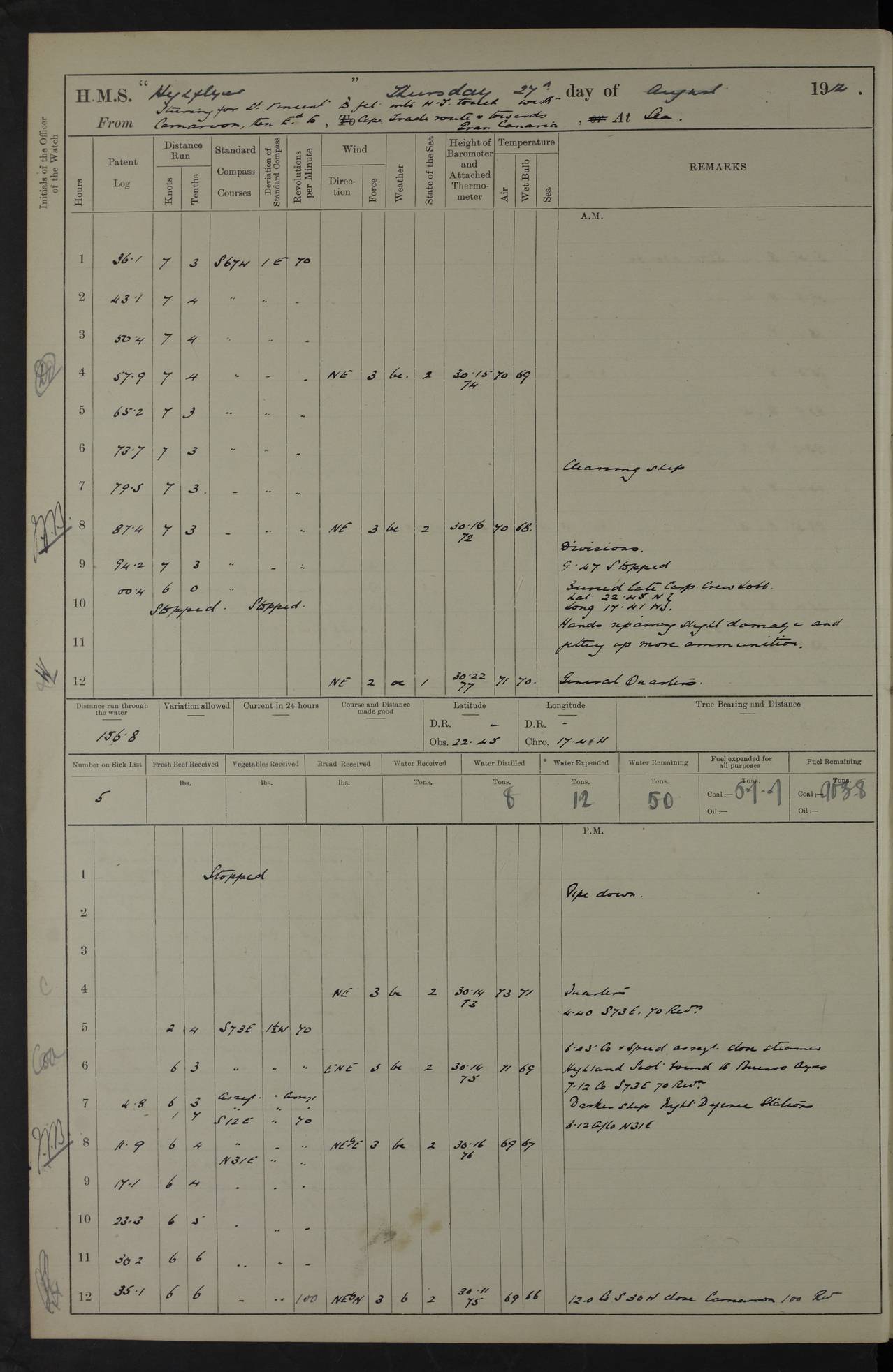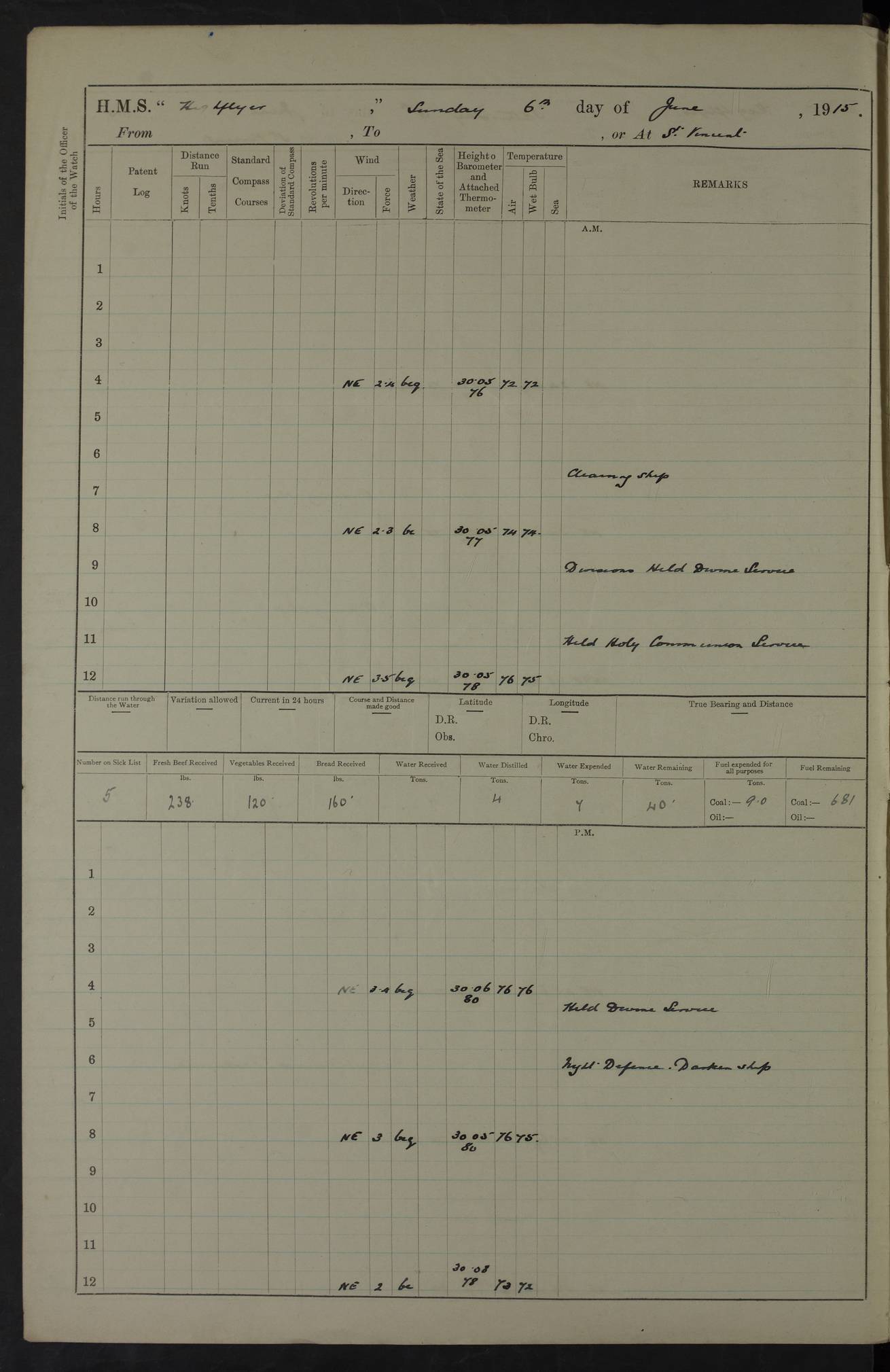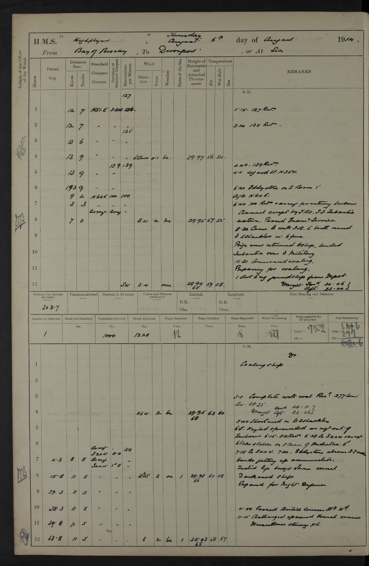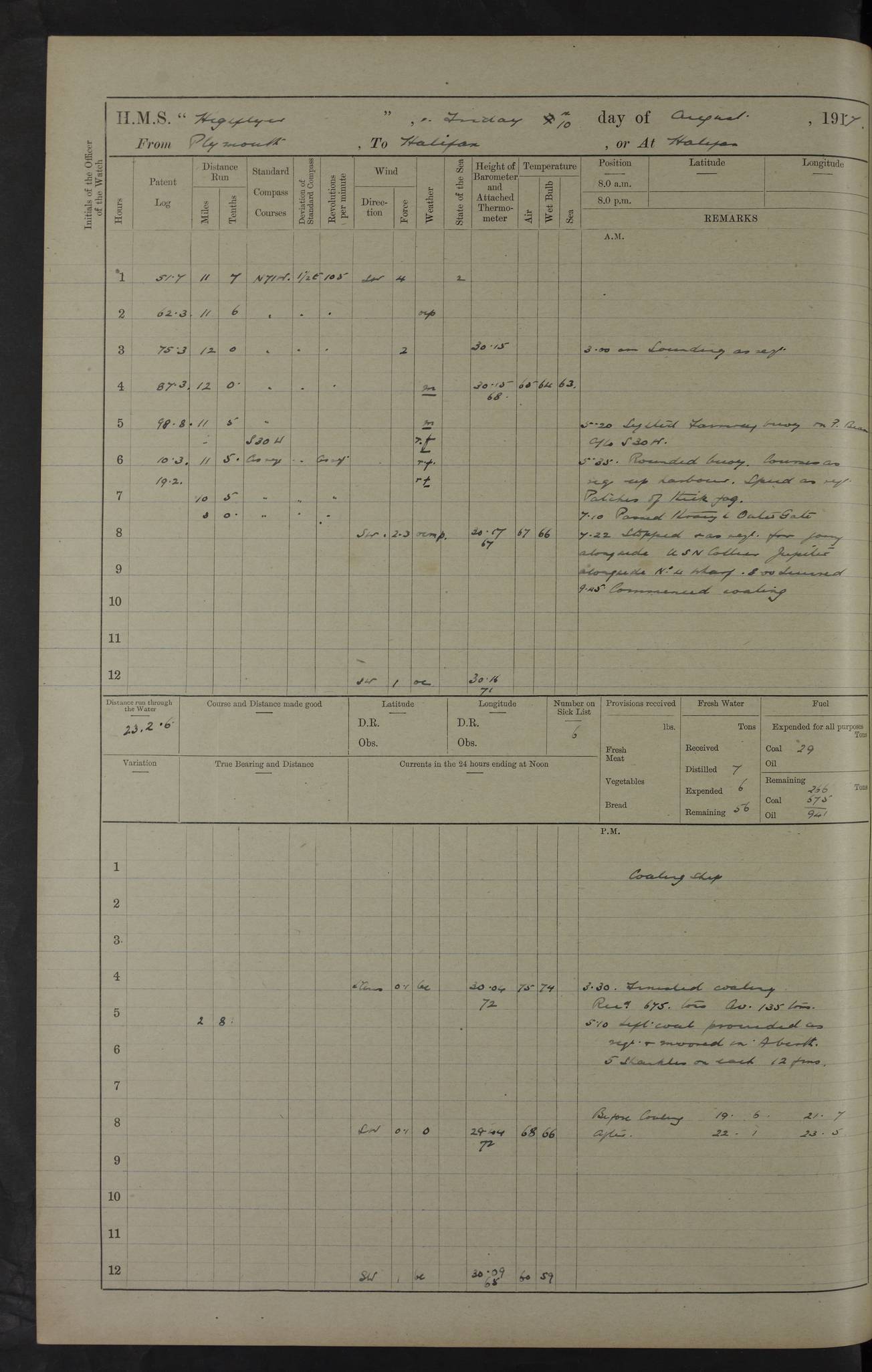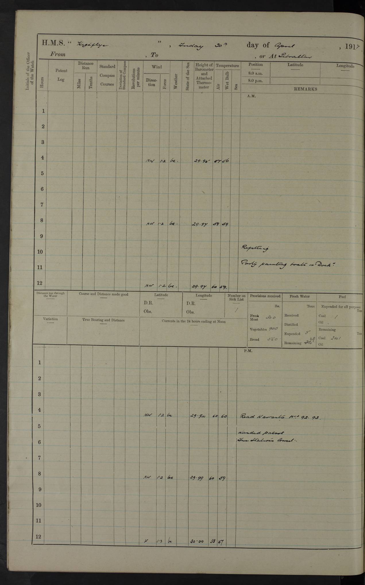(Maps prepared using Journey Plotter, developed by Maikel. The Plots can only be approximate. They are made by joining-up positions on successive days, and sometimes positions are not given. There will therefore be occasions when the ship appears to have travelled overland) LOG BOOK – JUNE 14TH 1913 TO MAY 31ST 1914 4f960fe4a2fc8e2def00041b: (http://s3.amazonaws.com/oldweather/ADM53-44291/ADM 53-44291-001_0.jpg) 4f960fe5a2fc8e2def00041c: (http://s3.amazonaws.com/oldweather/ADM53-44291/ADM 53-44291-001_1.jpg) 4f960fe5a2fc8e2def00041d: (http://s3.amazonaws.com/oldweather/ADM53-44291/ADM 53-44291-002_0.jpg) 4f960fe5a2fc8e2def00041e: (http://s3.amazonaws.com/oldweather/ADM53-44291/ADM 53-44291-002_1.jpg) LOG of HMS Highflyer Commanded by Captain HT Buller MVO FOR THE PERIOD Commencing Saturday 14th June 1913 Ending Sunday 31st May 1914 Tonnage (displacement): 5600 Extreme length: 350 ft Extreme breadth: 54 ft ENGINES Manufacturer: Fairfield Shipbuilding & Engineering Co, Glasgow IHP: 10.000 Description: Vertical triple expansion 4 cylinders When fixed on board: 1898 BOILERS Manufacturer: Fairfield Shipbuilding & Engineering Co Description: Belleville with economisers 18 in No When made: 1898 When put in vessel: 1898 SCREW PROPELLER Manufacturer: Fairfield Shipbuilding & Engineering Co Description: Twin 3 bladed Admiralty design (bronze) General state of repair: Good 4f960fe6a2fc8e2def00041f: (http://s3.amazonaws.com/oldweather/ADM53-44291/ADM 53-44291-003_0.jpg) [Directions for using the log, figures to indicate the force of the wind and the state of the sea, and letters to denote the state of the weather.] 4f960fe6a2fc8e2def000420: (http://s3.amazonaws.com/oldweather/ADM53-44291/ADM 53-44291-003_1.jpg) Establishment of ship’s company Officers 32 Seamen 164 Boys 24 Marines 50 Engine-room establishment 134 Other non-executive ratings 466 BAROMETER Mercurial or aneroid: Mercurial Name of maker & number: Adie A 577 Height of cistern above sea: 9 feet Thermometers for air temperature Position in ship: Fore bridge Whether in screen: Yes Maker & number: Negretti & Zambra MO/A 9607 dry; from June 14, 1913 to June 1, 1914 MO/A 9603 wet; from June 14, 1913 to June 1, 1914 Thermometer for sea temperature Maker & number: J Hicks A 434; from June 14, 1913 to June 1, 1914 Position of standard compass Fore upper bridge DEVIATION OF STANDARD COMPASS Date obtained: August 29th 1913 Position: Sheerness, No 28 buoy ARMAMENT Fxle: one 6” QF PII S waist: four 6” QF PII P waist: four 6” QF PII OD: two 6” QF PII Battle deck: two 12-pounder 12-cwt SII S waist: three 12-pounder 12-cwt SII P waist: three 12-pounder 12-cwt SII AS deck: 3-pounder QF (Hotchkiss) P waist: 12-pounder 8-cwt field gun Torpedo armament 2 18” tubes BOATS 2 pinnaces, 36 ft sailing 2 cutters 1 gig, 30 ft 1 whaler 1 steam cutter, 32 ft MISCELLANEOUS INFORMATION Draught of water with bunkers full, and complete with provisions, stores and water: forward 22 ft 0 in, aft 23 ft 2 in Load draught, 600 tons coal: forward 19 ft 6 in, aft 21 ft 6 in Number of tons necessary to increase draught 1 inch: 31.5 Number of tons of coal carried (43 cubic feet per ton): a) At load draught, 600 b) With bunkers full, 1132 c) In places other than bunkers, nil Quantity of water carried: a) For boilers, 207 tons b) For drinking 60 tons THE VOYAGES OF HMS HIGHFLYER 1913-1914