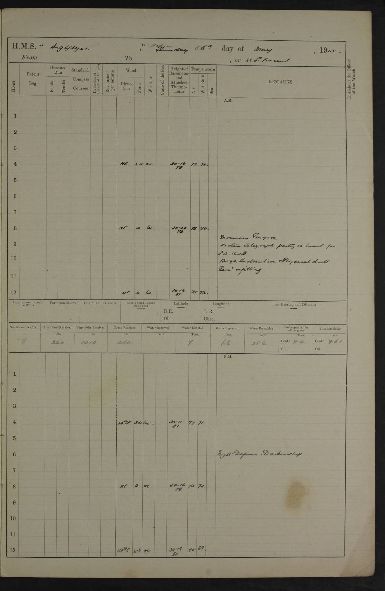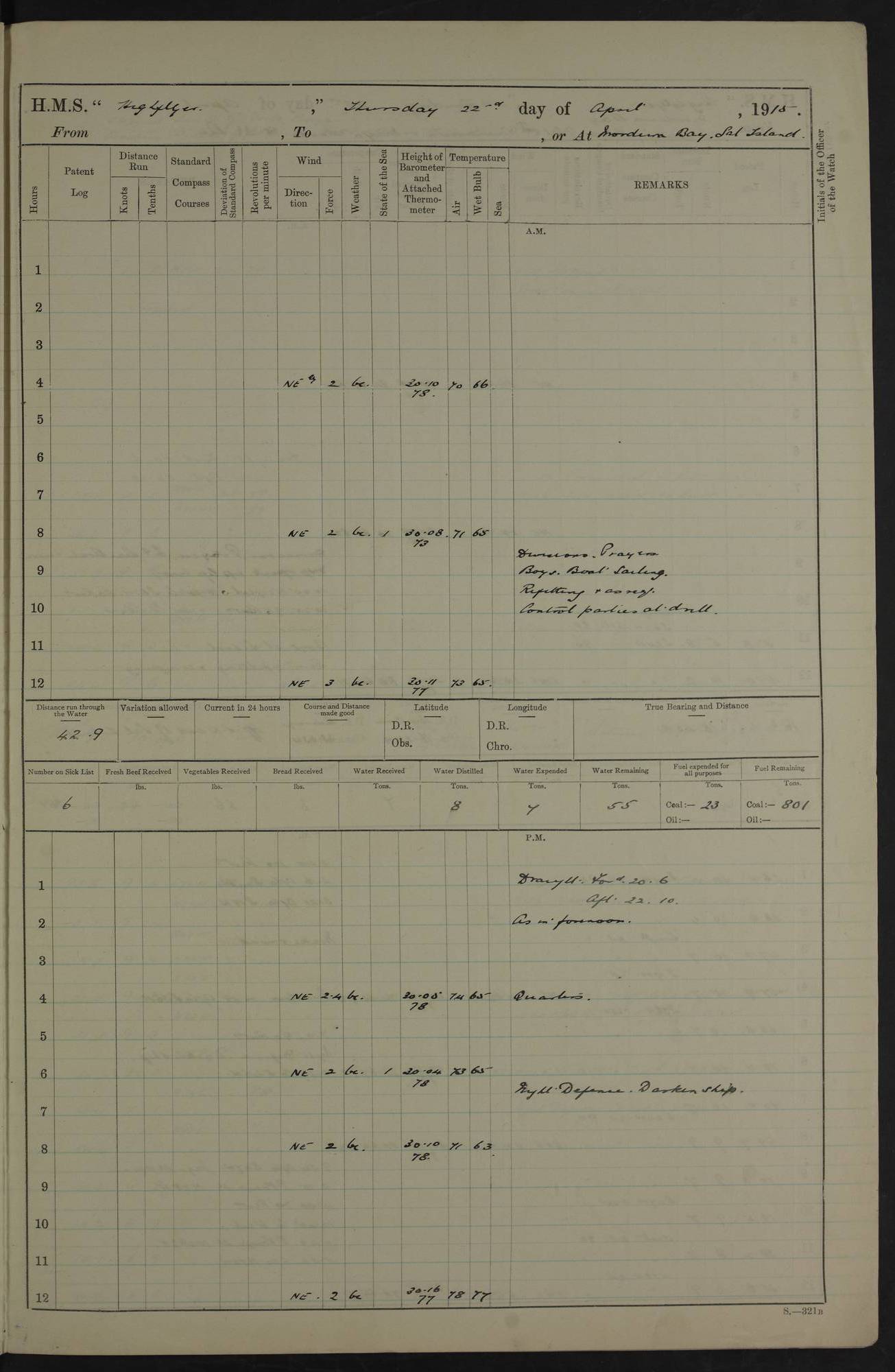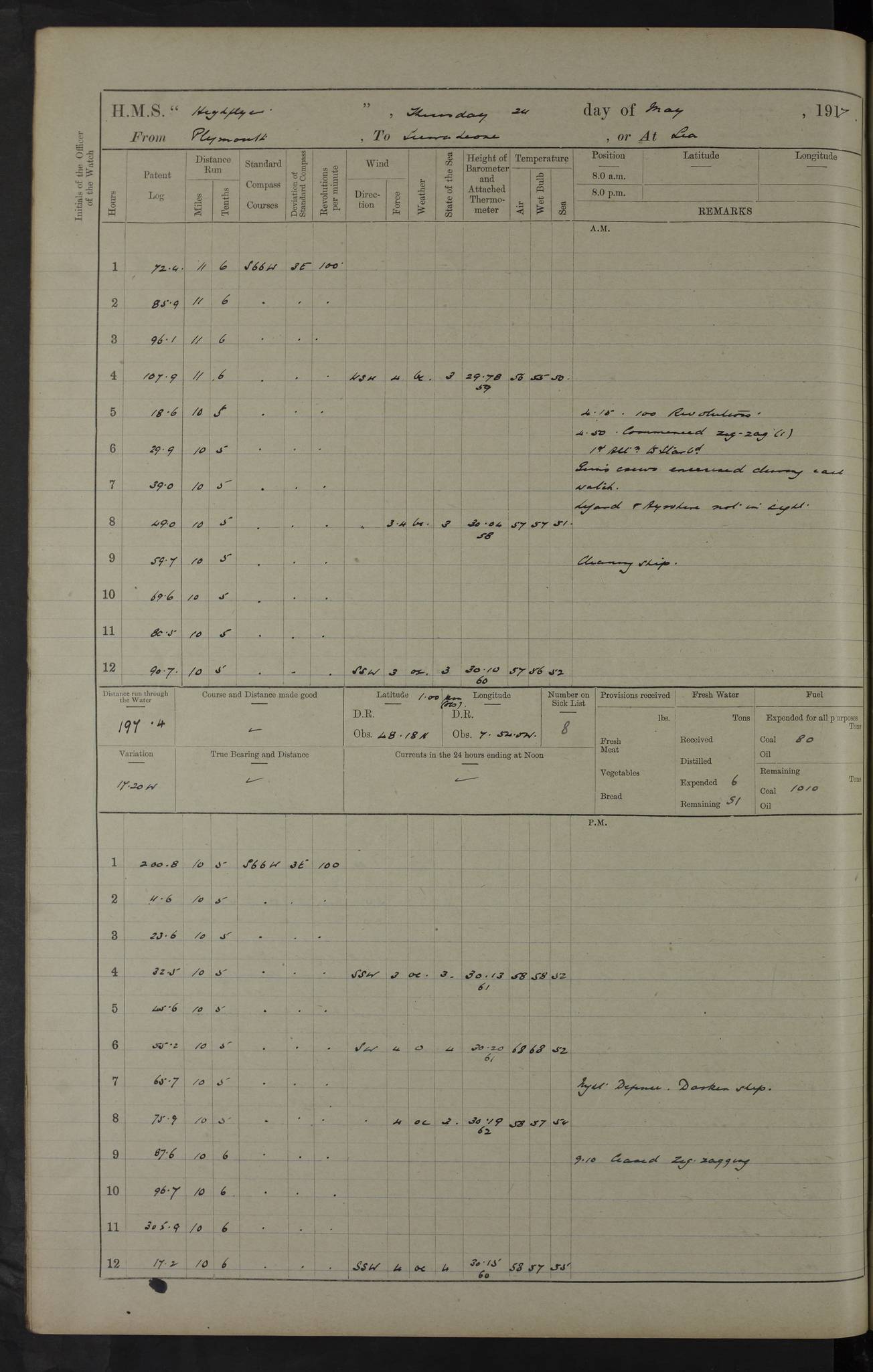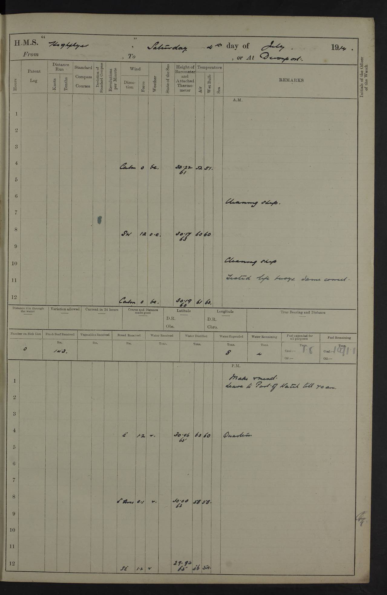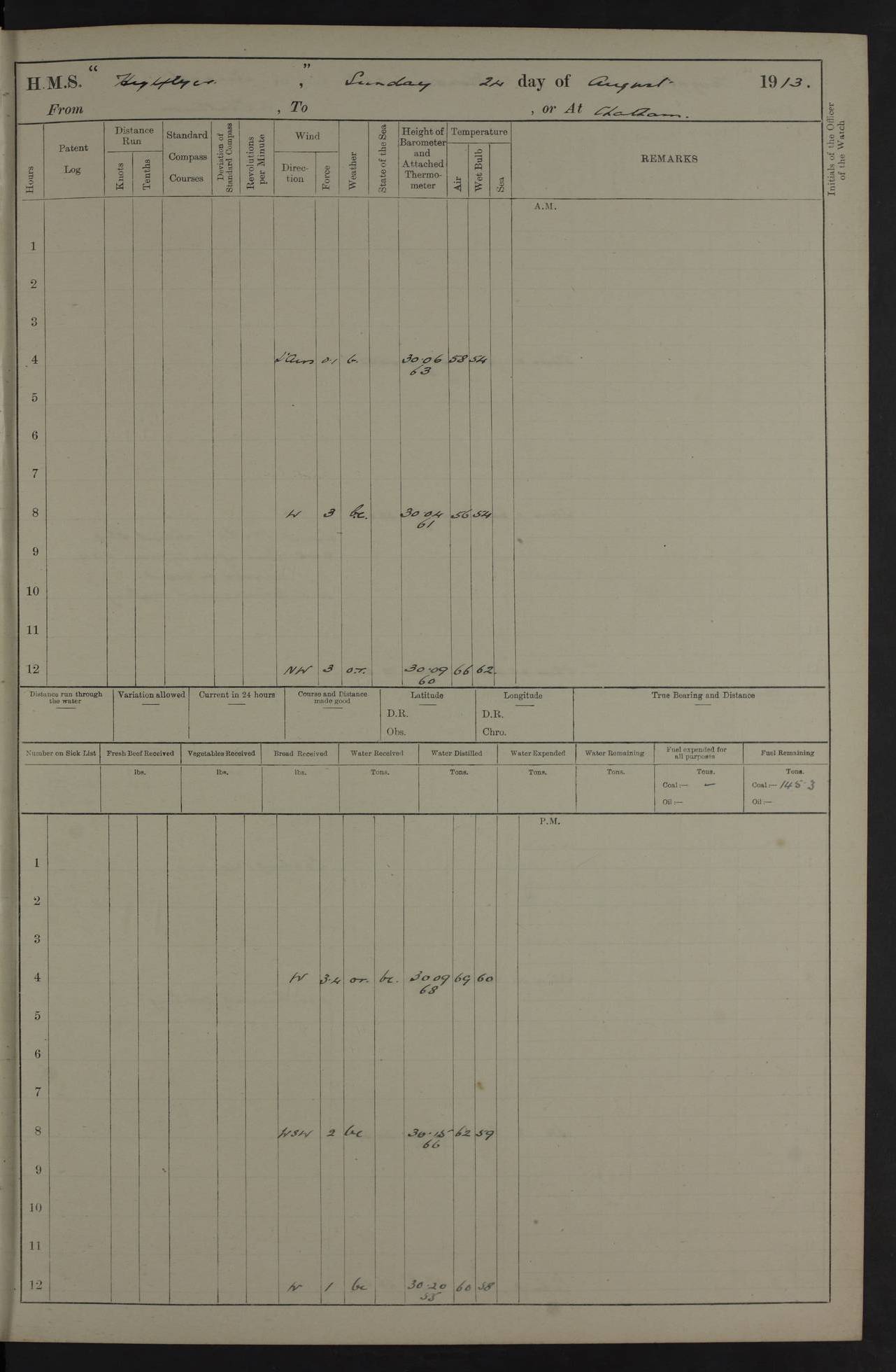 (Maps prepared using Journey Plotter, developed by Maikel. The Plots can only be approximate. They are made by joining-up positions on successive days, and sometimes positions are not given. There will therefore be occasions when the ship appears to have travelled overland) LOG BOOK – JUNE 14TH 1913 TO MAY 31ST 1914 4f960fe4a2fc8e2def00041b: (http://s3.amazonaws.com/oldweather/ADM53-44291/ADM 53-44291-001_0.jpg) 4f960fe5a2fc8e2def00041c: (http://s3.amazonaws.com/oldweather/ADM53-44291/ADM 53-44291-001_1.jpg) 4f960fe5a2fc8e2def00041d: (http://s3.amazonaws.com/oldweather/ADM53-44291/ADM 53-44291-002_0.jpg) 4f960fe5a2fc8e2def00041e: (http://s3.amazonaws.com/oldweather/ADM53-44291/ADM 53-44291-002_1.jpg) LOG of HMS Highflyer Commanded by Captain HT Buller MVO FOR THE PERIOD Commencing Saturday 14th June 1913 Ending Sunday 31st May 1914 Tonnage (displacement): 5600 Extreme length: 350 ft Extreme breadth: 54 ft ENGINES Manufacturer: Fairfield Shipbuilding & Engineering Co, Glasgow IHP: 10.000 Description: Vertical triple expansion 4 cylinders When fixed on board: 1898 BOILERS Manufacturer: Fairfield Shipbuilding & Engineering Co Description: Belleville with economisers 18 in No When made: 1898 When put in vessel: 1898 SCREW PROPELLER Manufacturer: Fairfield Shipbuilding & Engineering Co Description: Twin 3 bladed Admiralty design (bronze) General state of repair: Good 4f960fe6a2fc8e2def00041f: (http://s3.amazonaws.com/oldweather/ADM53-44291/ADM 53-44291-003_0.jpg) [Directions for using the log, figures to indicate the force of the wind and the state of the sea, and letters to denote the state of the weather.] 4f960fe6a2fc8e2def000420: (http://s3.amazonaws.com/oldweather/ADM53-44291/ADM 53-44291-003_1.jpg) Establishment of ship’s company Officers 32 Seamen 164 Boys 24 Marines 50 Engine-room establishment 134 Other non-executive ratings 466 BAROMETER Mercurial or aneroid: Mercurial Name of maker & number: Adie A 577 Height of cistern above sea: 9 feet Thermometers for air temperature Position in ship: Fore bridge Whether in screen: Yes Maker & number: Negretti & Zambra MO/A 9607 dry; from June 14, 1913 to June 1, 1914 MO/A 9603 wet; from June 14, 1913 to June 1, 1914 Thermometer for sea temperature Maker & number: J Hicks A 434; from June 14, 1913 to June 1, 1914 Position of standard compass Fore upper bridge DEVIATION OF STANDARD COMPASS Date obtained: August 29th 1913 Position: Sheerness, No 28 buoy ARMAMENT Fxle: one 6” QF PII S waist: four 6” QF PII P waist: four 6” QF PII OD: two 6” QF PII Battle deck: two 12-pounder 12-cwt SII S waist: three 12-pounder 12-cwt SII P waist: three 12-pounder 12-cwt SII AS deck: 3-pounder QF (Hotchkiss) P waist: 12-pounder 8-cwt field gun Torpedo armament 2 18” tubes BOATS 2 pinnaces, 36 ft sailing 2 cutters 1 gig, 30 ft 1 whaler 1 steam cutter, 32 ft MISCELLANEOUS INFORMATION Draught of water with bunkers full, and complete with provisions, stores and water: forward 22 ft 0 in, aft 23 ft 2 in Load draught, 600 tons coal: forward 19 ft 6 in, aft 21 ft 6 in Number of tons necessary to increase draught 1 inch: 31.5 Number of tons of coal carried (43 cubic feet per ton): a) At load draught, 600 b) With bunkers full, 1132 c) In places other than bunkers, nil Quantity of water carried: a) For boilers, 207 tons b) For drinking 60 tons THE VOYAGES OF HMS HIGHFLYER 1913-1914