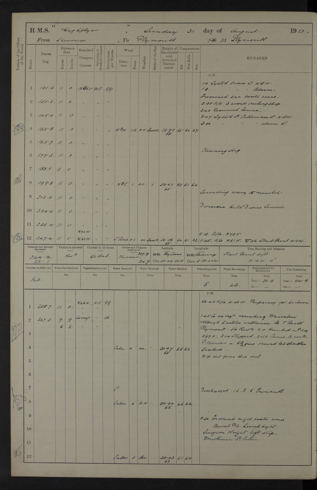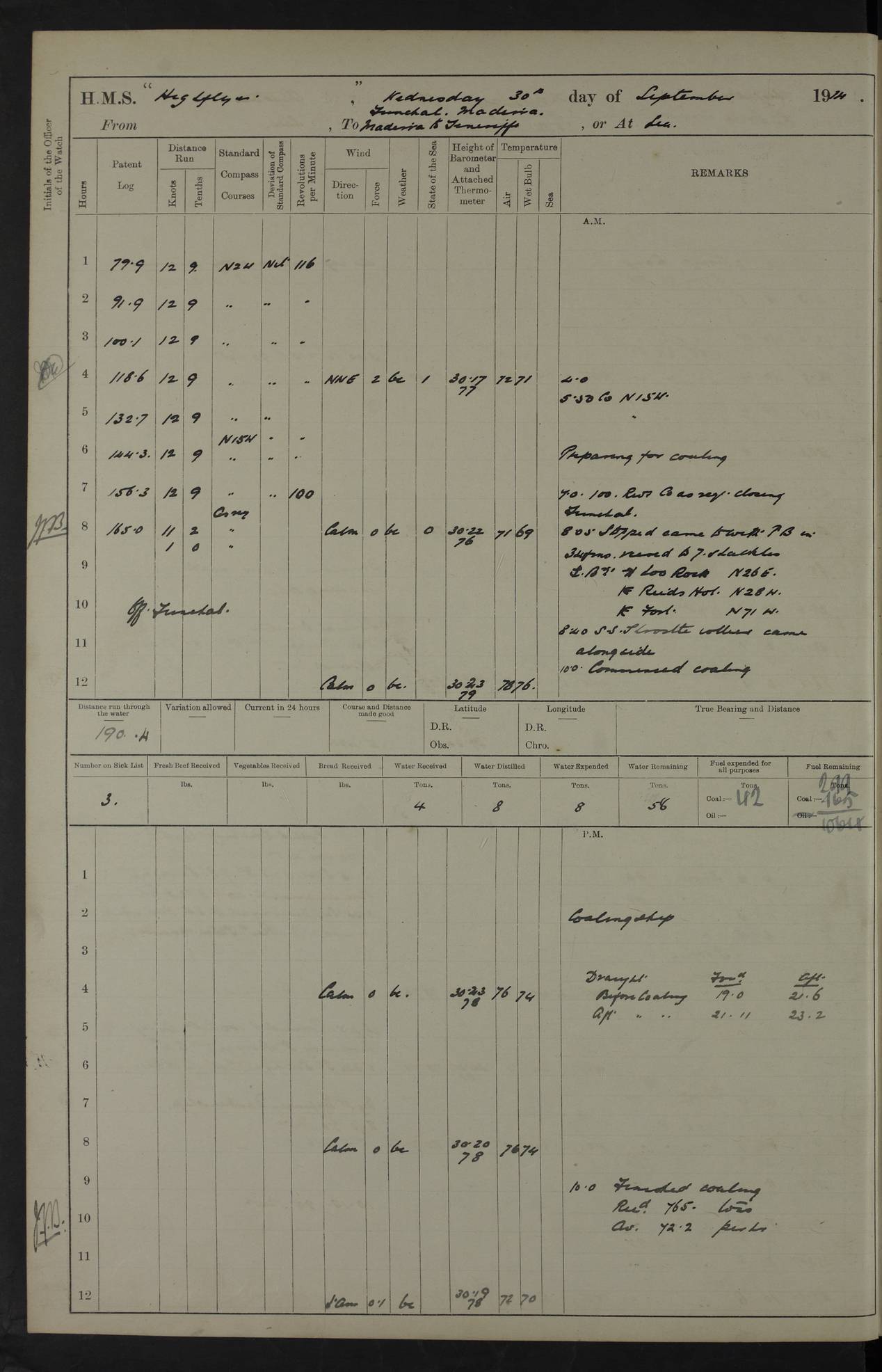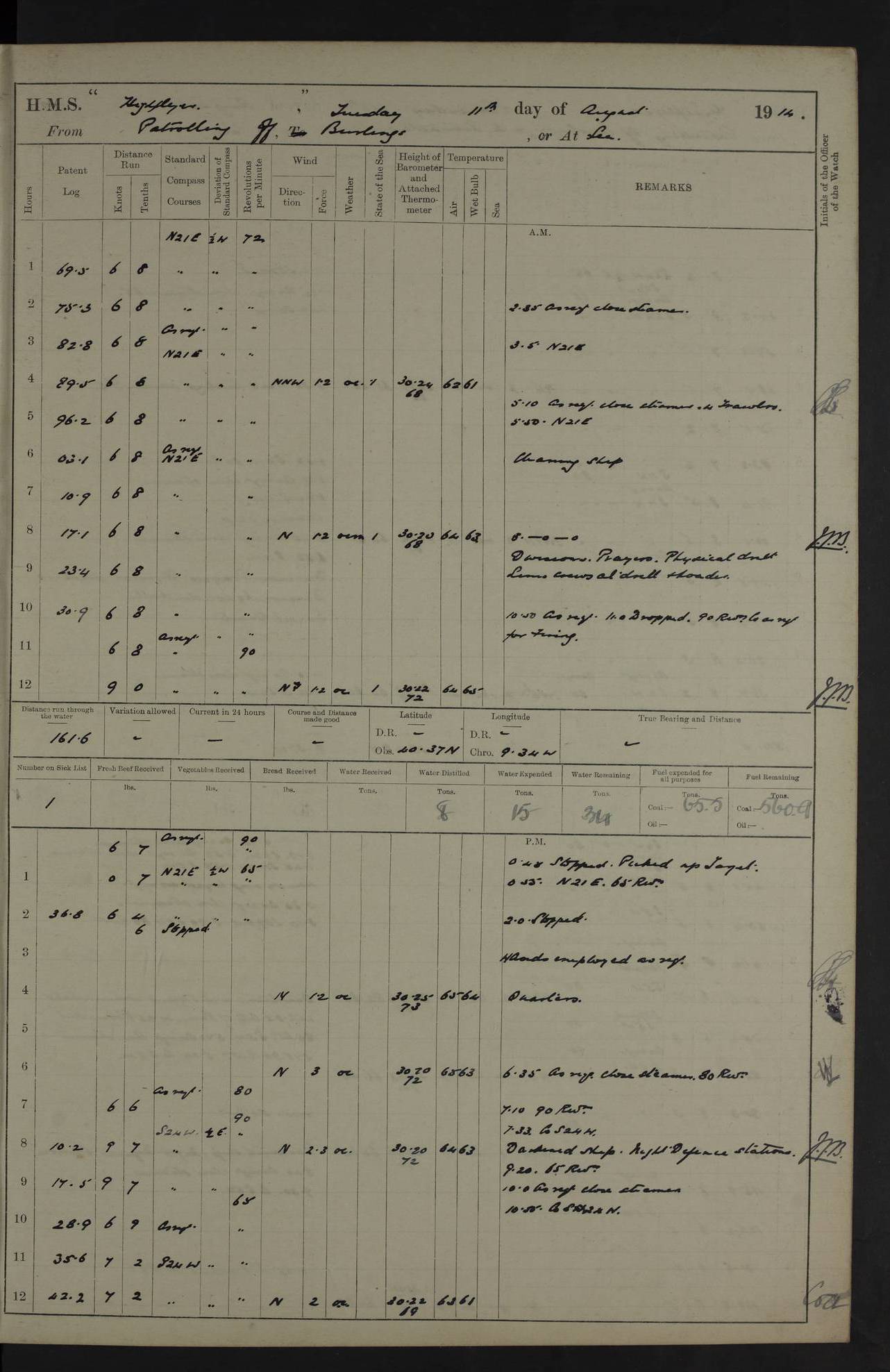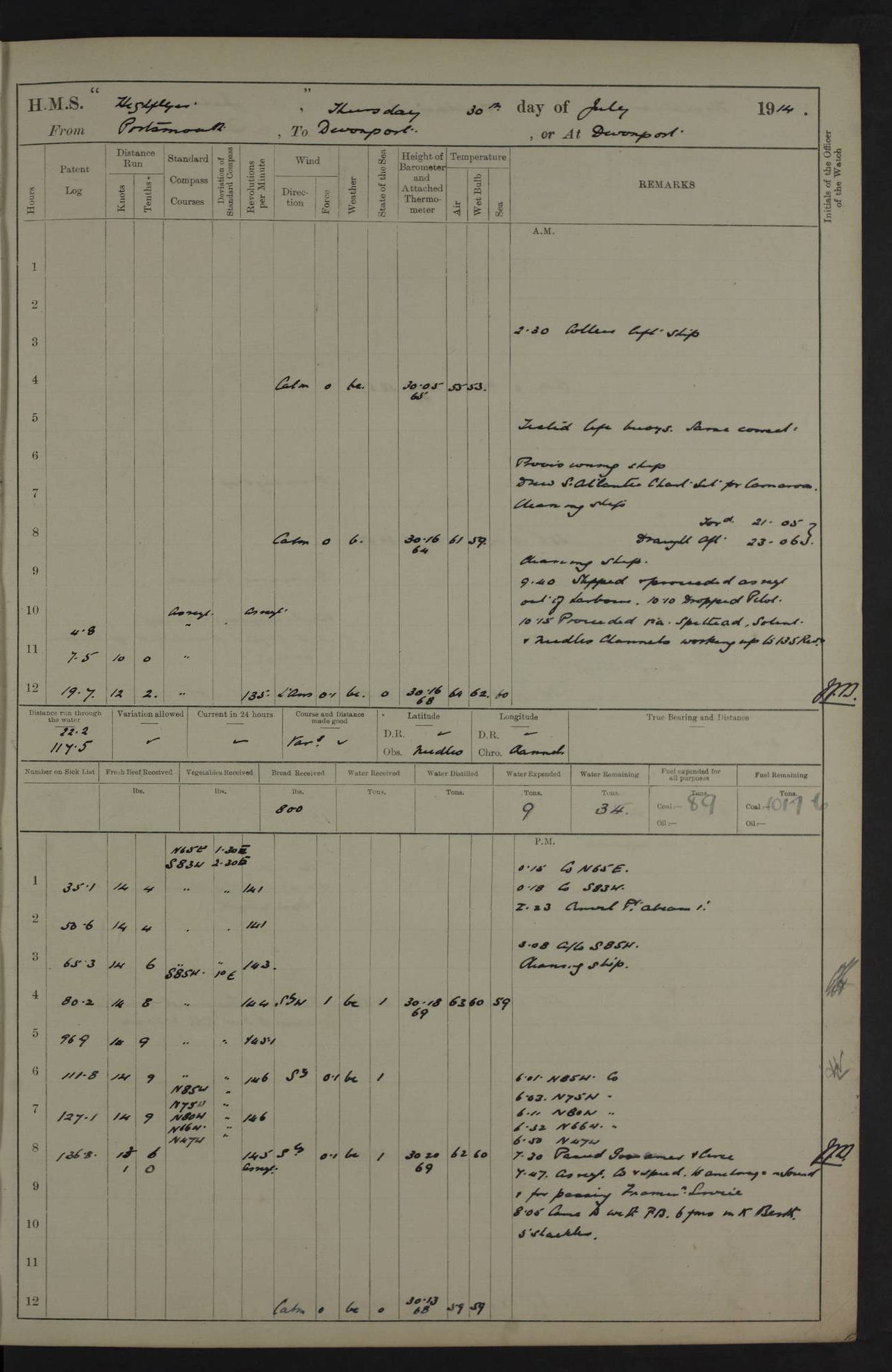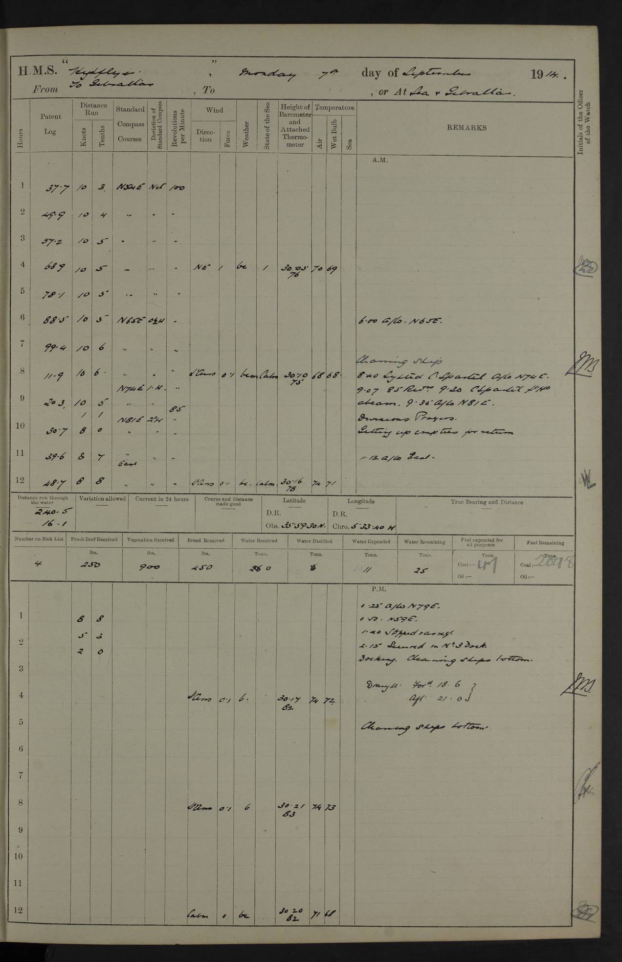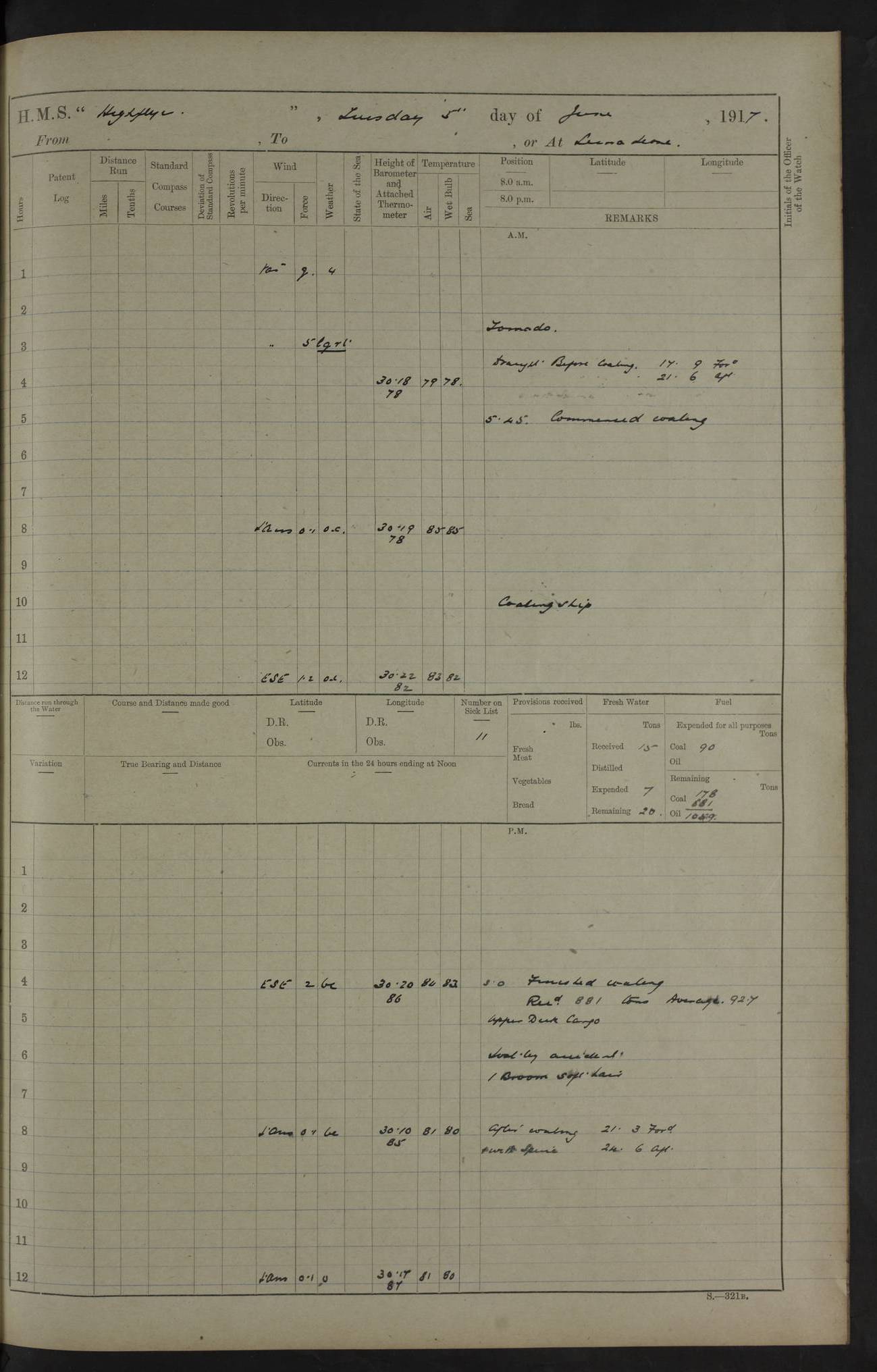 (Maps prepared using Journey Plotter, developed by Maikel. The Plots can only be approximate. They are made by joining-up positions on successive days, and sometimes positions are not given. There will therefore be occasions when the ship appears to have travelled overland) LOG BOOK – JUNE 14TH 1913 TO MAY 31ST 1914 4f960fe4a2fc8e2def00041b: (http://s3.amazonaws.com/oldweather/ADM53-44291/ADM 53-44291-001_0.jpg) 4f960fe5a2fc8e2def00041c: (http://s3.amazonaws.com/oldweather/ADM53-44291/ADM 53-44291-001_1.jpg) 4f960fe5a2fc8e2def00041d: (http://s3.amazonaws.com/oldweather/ADM53-44291/ADM 53-44291-002_0.jpg) 4f960fe5a2fc8e2def00041e: (http://s3.amazonaws.com/oldweather/ADM53-44291/ADM 53-44291-002_1.jpg) LOG of HMS Highflyer Commanded by Captain HT Buller MVO FOR THE PERIOD Commencing Saturday 14th June 1913 Ending Sunday 31st May 1914 Tonnage (displacement): 5600 Extreme length: 350 ft Extreme breadth: 54 ft ENGINES Manufacturer: Fairfield Shipbuilding & Engineering Co, Glasgow IHP: 10.000 Description: Vertical triple expansion 4 cylinders When fixed on board: 1898 BOILERS Manufacturer: Fairfield Shipbuilding & Engineering Co Description: Belleville with economisers 18 in No When made: 1898 When put in vessel: 1898 SCREW PROPELLER Manufacturer: Fairfield Shipbuilding & Engineering Co Description: Twin 3 bladed Admiralty design (bronze) General state of repair: Good 4f960fe6a2fc8e2def00041f: (http://s3.amazonaws.com/oldweather/ADM53-44291/ADM 53-44291-003_0.jpg) [Directions for using the log, figures to indicate the force of the wind and the state of the sea, and letters to denote the state of the weather.] 4f960fe6a2fc8e2def000420: (http://s3.amazonaws.com/oldweather/ADM53-44291/ADM 53-44291-003_1.jpg) Establishment of ship’s company Officers 32 Seamen 164 Boys 24 Marines 50 Engine-room establishment 134 Other non-executive ratings 466 BAROMETER Mercurial or aneroid: Mercurial Name of maker & number: Adie A 577 Height of cistern above sea: 9 feet Thermometers for air temperature Position in ship: Fore bridge Whether in screen: Yes Maker & number: Negretti & Zambra MO/A 9607 dry; from June 14, 1913 to June 1, 1914 MO/A 9603 wet; from June 14, 1913 to June 1, 1914 Thermometer for sea temperature Maker & number: J Hicks A 434; from June 14, 1913 to June 1, 1914 Position of standard compass Fore upper bridge DEVIATION OF STANDARD COMPASS Date obtained: August 29th 1913 Position: Sheerness, No 28 buoy ARMAMENT Fxle: one 6” QF PII S waist: four 6” QF PII P waist: four 6” QF PII OD: two 6” QF PII Battle deck: two 12-pounder 12-cwt SII S waist: three 12-pounder 12-cwt SII P waist: three 12-pounder 12-cwt SII AS deck: 3-pounder QF (Hotchkiss) P waist: 12-pounder 8-cwt field gun Torpedo armament 2 18” tubes BOATS 2 pinnaces, 36 ft sailing 2 cutters 1 gig, 30 ft 1 whaler 1 steam cutter, 32 ft MISCELLANEOUS INFORMATION Draught of water with bunkers full, and complete with provisions, stores and water: forward 22 ft 0 in, aft 23 ft 2 in Load draught, 600 tons coal: forward 19 ft 6 in, aft 21 ft 6 in Number of tons necessary to increase draught 1 inch: 31.5 Number of tons of coal carried (43 cubic feet per ton): a) At load draught, 600 b) With bunkers full, 1132 c) In places other than bunkers, nil Quantity of water carried: a) For boilers, 207 tons b) For drinking 60 tons THE VOYAGES OF HMS HIGHFLYER 1913-1914