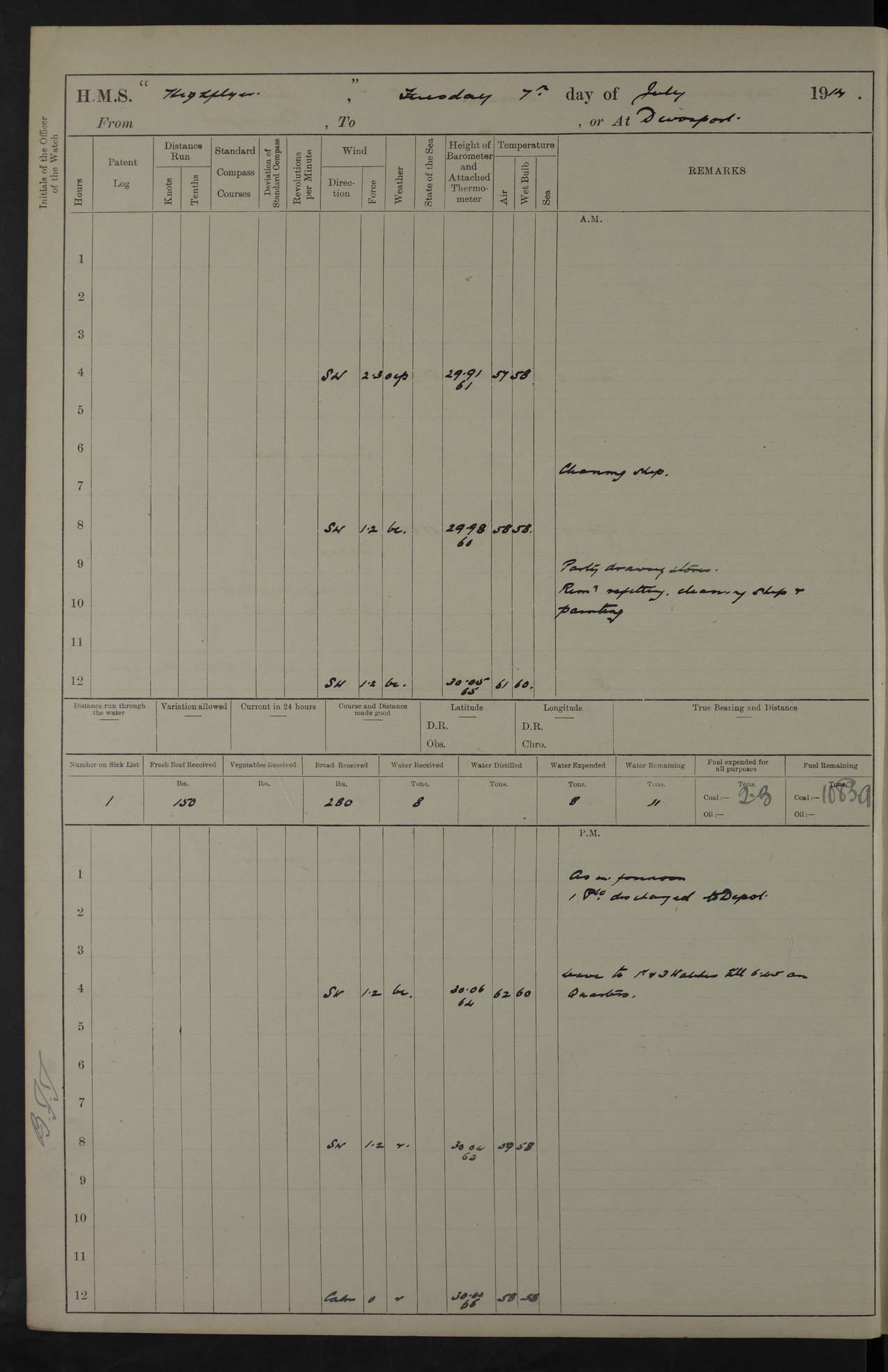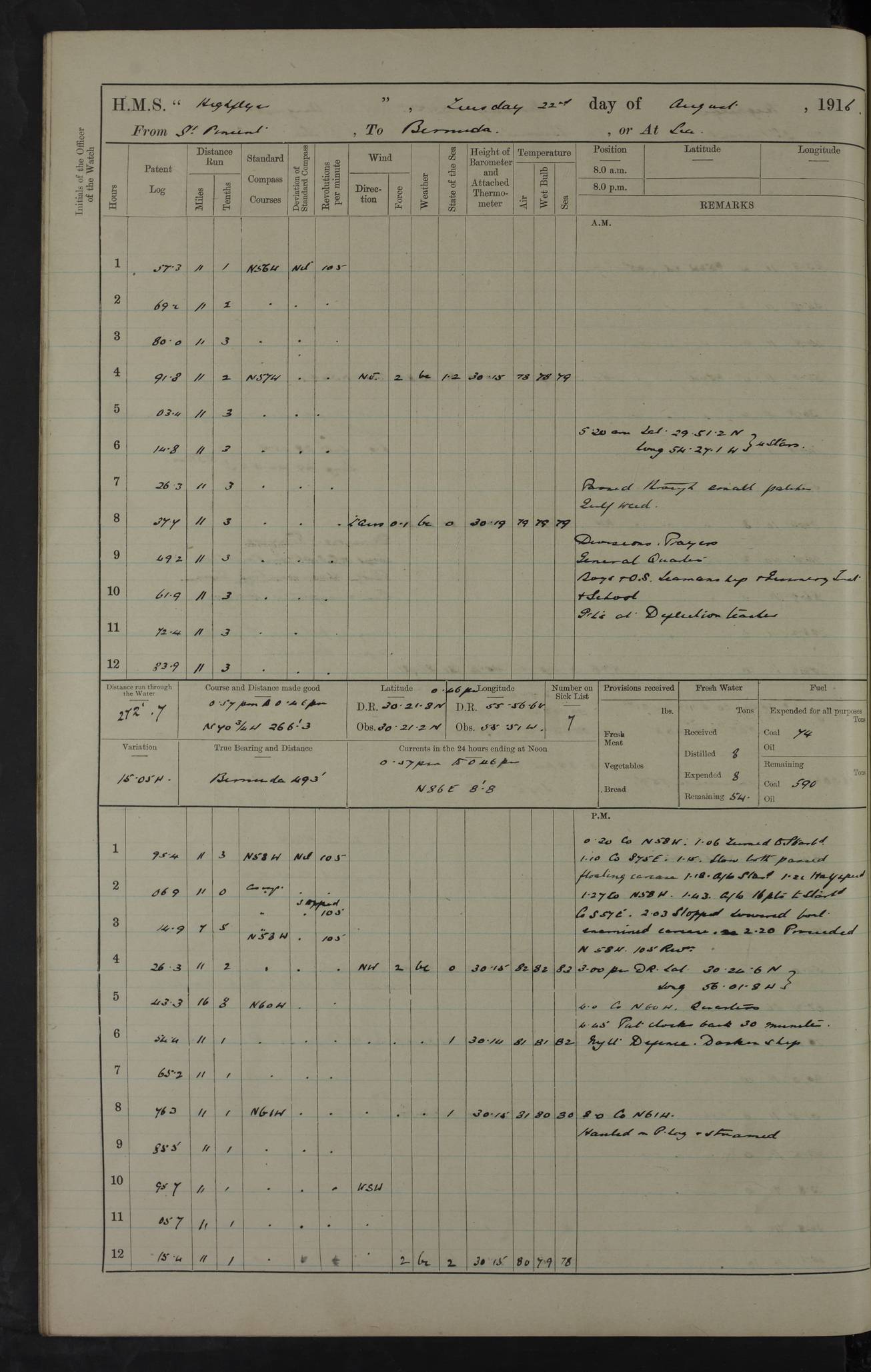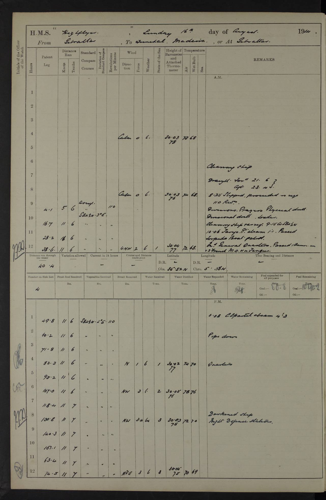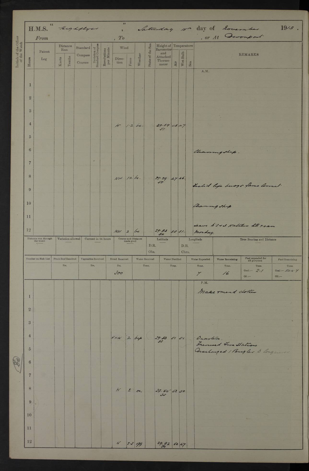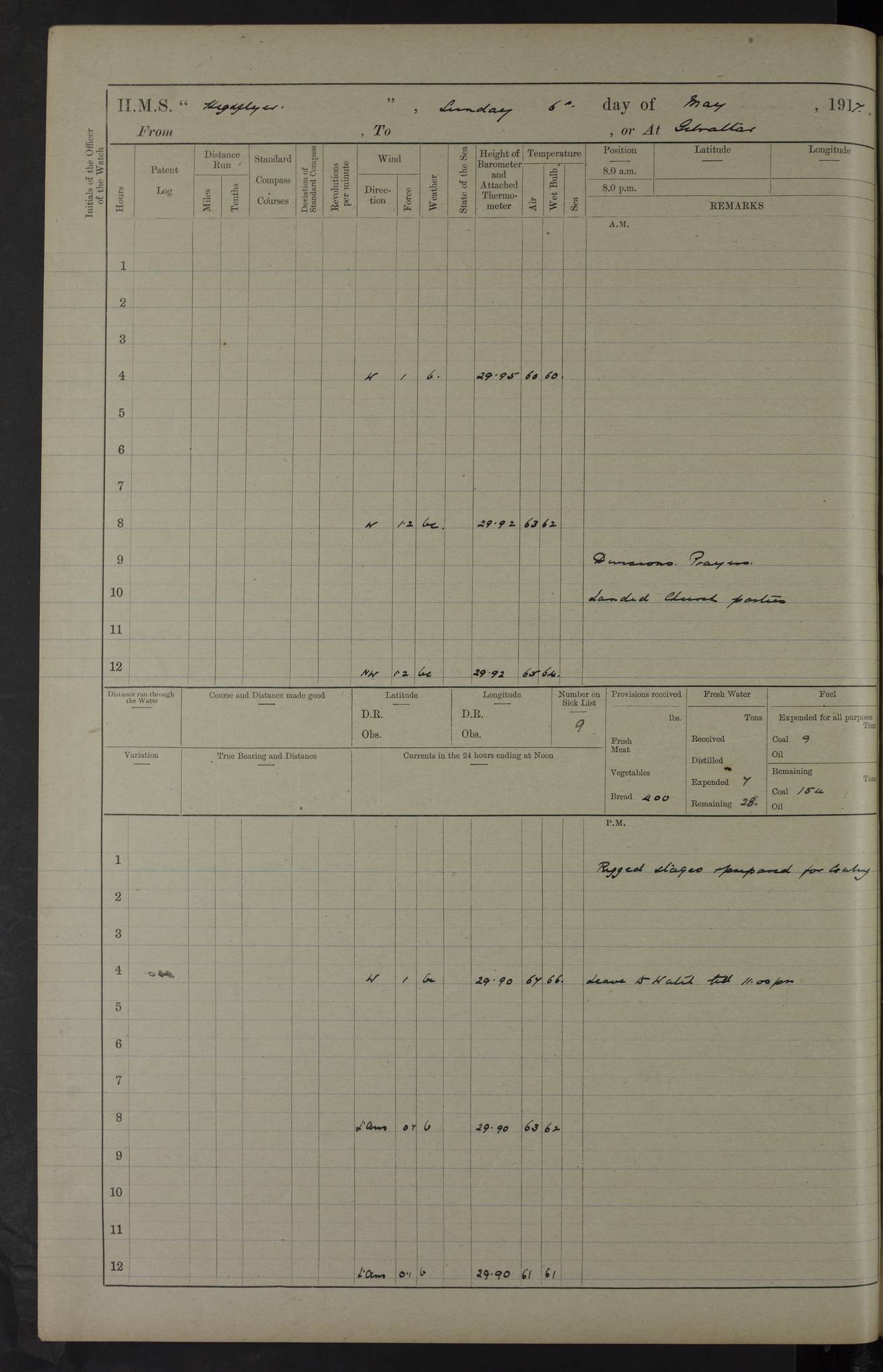 (Maps prepared using Journey Plotter, developed by Maikel. The Plots can only be approximate. They are made by joining-up positions on successive days, and sometimes positions are not given. There will therefore be occasions when the ship appears to have travelled overland) LOG BOOK – JUNE 14TH 1913 TO MAY 31ST 1914 4f960fe4a2fc8e2def00041b: (http://s3.amazonaws.com/oldweather/ADM53-44291/ADM 53-44291-001_0.jpg) 4f960fe5a2fc8e2def00041c: (http://s3.amazonaws.com/oldweather/ADM53-44291/ADM 53-44291-001_1.jpg) 4f960fe5a2fc8e2def00041d: (http://s3.amazonaws.com/oldweather/ADM53-44291/ADM 53-44291-002_0.jpg) 4f960fe5a2fc8e2def00041e: (http://s3.amazonaws.com/oldweather/ADM53-44291/ADM 53-44291-002_1.jpg) LOG of HMS Highflyer Commanded by Captain HT Buller MVO FOR THE PERIOD Commencing Saturday 14th June 1913 Ending Sunday 31st May 1914 Tonnage (displacement): 5600 Extreme length: 350 ft Extreme breadth: 54 ft ENGINES Manufacturer: Fairfield Shipbuilding & Engineering Co, Glasgow IHP: 10.000 Description: Vertical triple expansion 4 cylinders When fixed on board: 1898 BOILERS Manufacturer: Fairfield Shipbuilding & Engineering Co Description: Belleville with economisers 18 in No When made: 1898 When put in vessel: 1898 SCREW PROPELLER Manufacturer: Fairfield Shipbuilding & Engineering Co Description: Twin 3 bladed Admiralty design (bronze) General state of repair: Good 4f960fe6a2fc8e2def00041f: (http://s3.amazonaws.com/oldweather/ADM53-44291/ADM 53-44291-003_0.jpg) [Directions for using the log, figures to indicate the force of the wind and the state of the sea, and letters to denote the state of the weather.] 4f960fe6a2fc8e2def000420: (http://s3.amazonaws.com/oldweather/ADM53-44291/ADM 53-44291-003_1.jpg) Establishment of ship’s company Officers 32 Seamen 164 Boys 24 Marines 50 Engine-room establishment 134 Other non-executive ratings 466 BAROMETER Mercurial or aneroid: Mercurial Name of maker & number: Adie A 577 Height of cistern above sea: 9 feet Thermometers for air temperature Position in ship: Fore bridge Whether in screen: Yes Maker & number: Negretti & Zambra MO/A 9607 dry; from June 14, 1913 to June 1, 1914 MO/A 9603 wet; from June 14, 1913 to June 1, 1914 Thermometer for sea temperature Maker & number: J Hicks A 434; from June 14, 1913 to June 1, 1914 Position of standard compass Fore upper bridge DEVIATION OF STANDARD COMPASS Date obtained: August 29th 1913 Position: Sheerness, No 28 buoy ARMAMENT Fxle: one 6” QF PII S waist: four 6” QF PII P waist: four 6” QF PII OD: two 6” QF PII Battle deck: two 12-pounder 12-cwt SII S waist: three 12-pounder 12-cwt SII P waist: three 12-pounder 12-cwt SII AS deck: 3-pounder QF (Hotchkiss) P waist: 12-pounder 8-cwt field gun Torpedo armament 2 18” tubes BOATS 2 pinnaces, 36 ft sailing 2 cutters 1 gig, 30 ft 1 whaler 1 steam cutter, 32 ft MISCELLANEOUS INFORMATION Draught of water with bunkers full, and complete with provisions, stores and water: forward 22 ft 0 in, aft 23 ft 2 in Load draught, 600 tons coal: forward 19 ft 6 in, aft 21 ft 6 in Number of tons necessary to increase draught 1 inch: 31.5 Number of tons of coal carried (43 cubic feet per ton): a) At load draught, 600 b) With bunkers full, 1132 c) In places other than bunkers, nil Quantity of water carried: a) For boilers, 207 tons b) For drinking 60 tons THE VOYAGES OF HMS HIGHFLYER 1913-1914