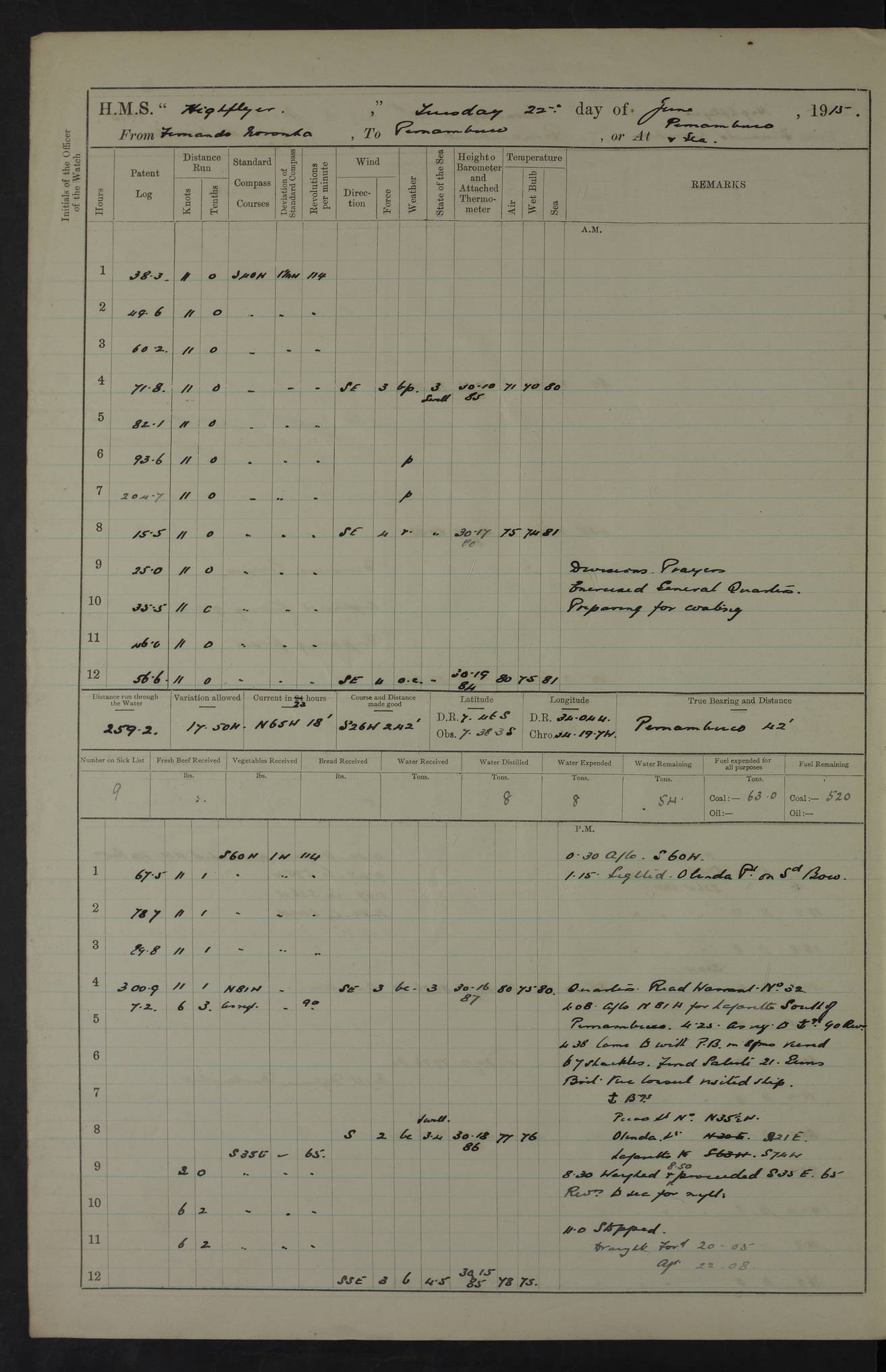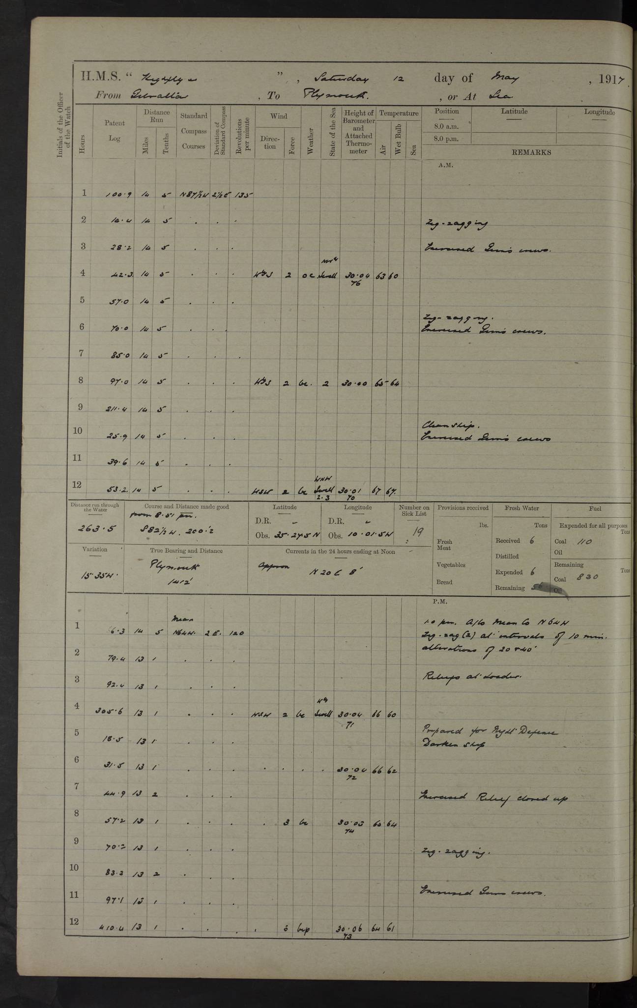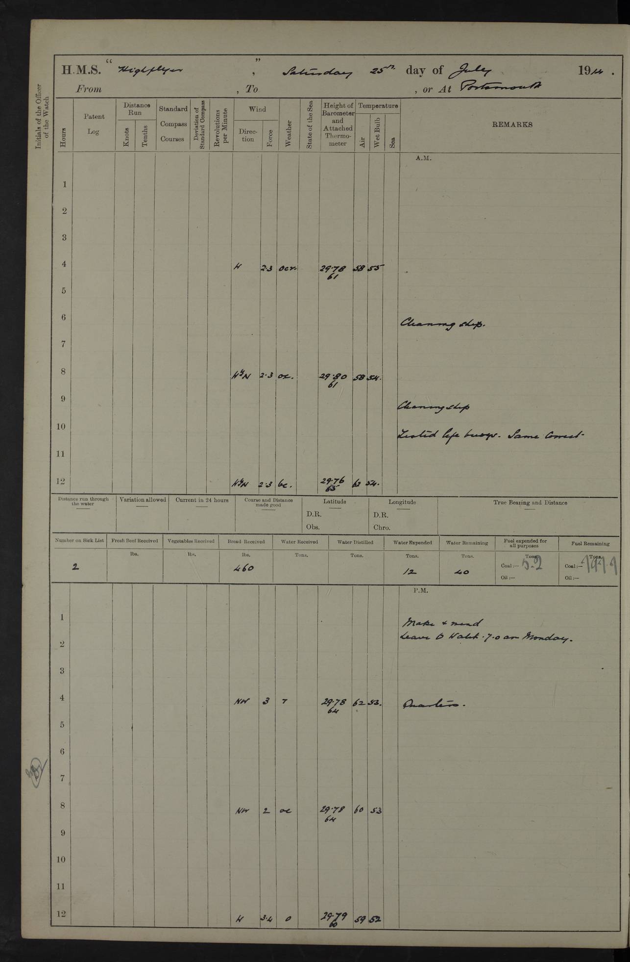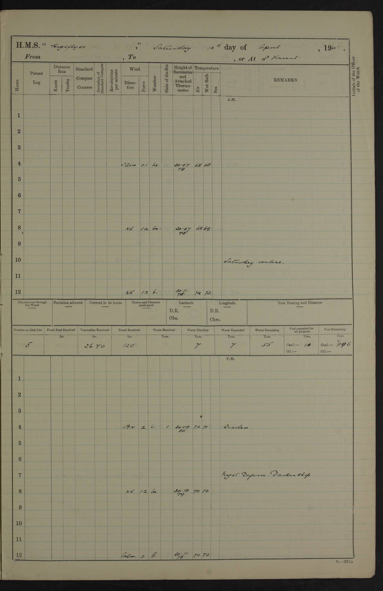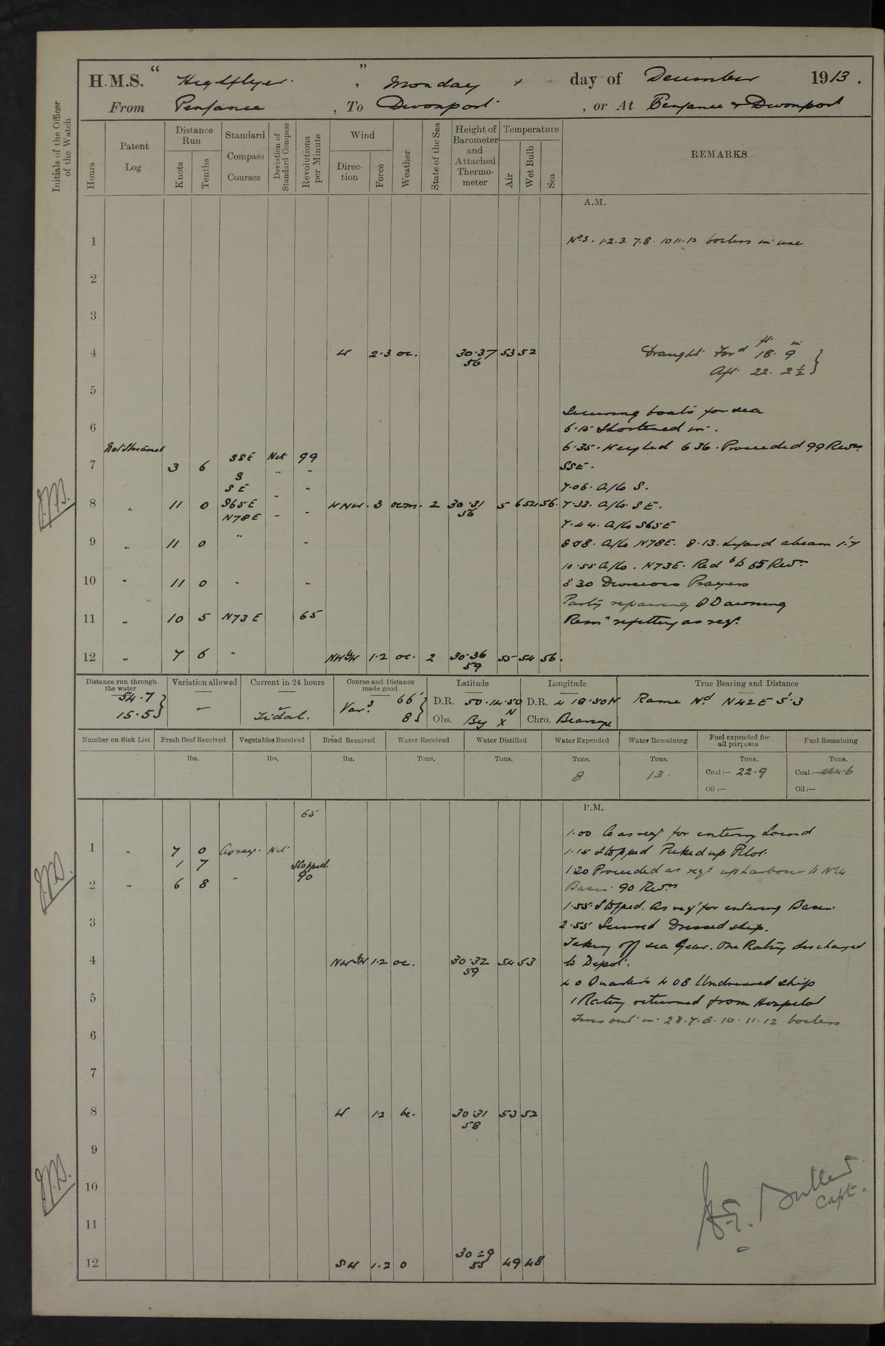 (Maps prepared using Journey Plotter, developed by Maikel. The Plots can only be approximate. They are made by joining-up positions on successive days, and sometimes positions are not given. There will therefore be occasions when the ship appears to have travelled overland) LOG BOOK – JUNE 14TH 1913 TO MAY 31ST 1914 4f960fe4a2fc8e2def00041b: (http://s3.amazonaws.com/oldweather/ADM53-44291/ADM 53-44291-001_0.jpg) 4f960fe5a2fc8e2def00041c: (http://s3.amazonaws.com/oldweather/ADM53-44291/ADM 53-44291-001_1.jpg) 4f960fe5a2fc8e2def00041d: (http://s3.amazonaws.com/oldweather/ADM53-44291/ADM 53-44291-002_0.jpg) 4f960fe5a2fc8e2def00041e: (http://s3.amazonaws.com/oldweather/ADM53-44291/ADM 53-44291-002_1.jpg) LOG of HMS Highflyer Commanded by Captain HT Buller MVO FOR THE PERIOD Commencing Saturday 14th June 1913 Ending Sunday 31st May 1914 Tonnage (displacement): 5600 Extreme length: 350 ft Extreme breadth: 54 ft ENGINES Manufacturer: Fairfield Shipbuilding & Engineering Co, Glasgow IHP: 10.000 Description: Vertical triple expansion 4 cylinders When fixed on board: 1898 BOILERS Manufacturer: Fairfield Shipbuilding & Engineering Co Description: Belleville with economisers 18 in No When made: 1898 When put in vessel: 1898 SCREW PROPELLER Manufacturer: Fairfield Shipbuilding & Engineering Co Description: Twin 3 bladed Admiralty design (bronze) General state of repair: Good 4f960fe6a2fc8e2def00041f: (http://s3.amazonaws.com/oldweather/ADM53-44291/ADM 53-44291-003_0.jpg) [Directions for using the log, figures to indicate the force of the wind and the state of the sea, and letters to denote the state of the weather.] 4f960fe6a2fc8e2def000420: (http://s3.amazonaws.com/oldweather/ADM53-44291/ADM 53-44291-003_1.jpg) Establishment of ship’s company Officers 32 Seamen 164 Boys 24 Marines 50 Engine-room establishment 134 Other non-executive ratings 466 BAROMETER Mercurial or aneroid: Mercurial Name of maker & number: Adie A 577 Height of cistern above sea: 9 feet Thermometers for air temperature Position in ship: Fore bridge Whether in screen: Yes Maker & number: Negretti & Zambra MO/A 9607 dry; from June 14, 1913 to June 1, 1914 MO/A 9603 wet; from June 14, 1913 to June 1, 1914 Thermometer for sea temperature Maker & number: J Hicks A 434; from June 14, 1913 to June 1, 1914 Position of standard compass Fore upper bridge DEVIATION OF STANDARD COMPASS Date obtained: August 29th 1913 Position: Sheerness, No 28 buoy ARMAMENT Fxle: one 6” QF PII S waist: four 6” QF PII P waist: four 6” QF PII OD: two 6” QF PII Battle deck: two 12-pounder 12-cwt SII S waist: three 12-pounder 12-cwt SII P waist: three 12-pounder 12-cwt SII AS deck: 3-pounder QF (Hotchkiss) P waist: 12-pounder 8-cwt field gun Torpedo armament 2 18” tubes BOATS 2 pinnaces, 36 ft sailing 2 cutters 1 gig, 30 ft 1 whaler 1 steam cutter, 32 ft MISCELLANEOUS INFORMATION Draught of water with bunkers full, and complete with provisions, stores and water: forward 22 ft 0 in, aft 23 ft 2 in Load draught, 600 tons coal: forward 19 ft 6 in, aft 21 ft 6 in Number of tons necessary to increase draught 1 inch: 31.5 Number of tons of coal carried (43 cubic feet per ton): a) At load draught, 600 b) With bunkers full, 1132 c) In places other than bunkers, nil Quantity of water carried: a) For boilers, 207 tons b) For drinking 60 tons THE VOYAGES OF HMS HIGHFLYER 1913-1914
