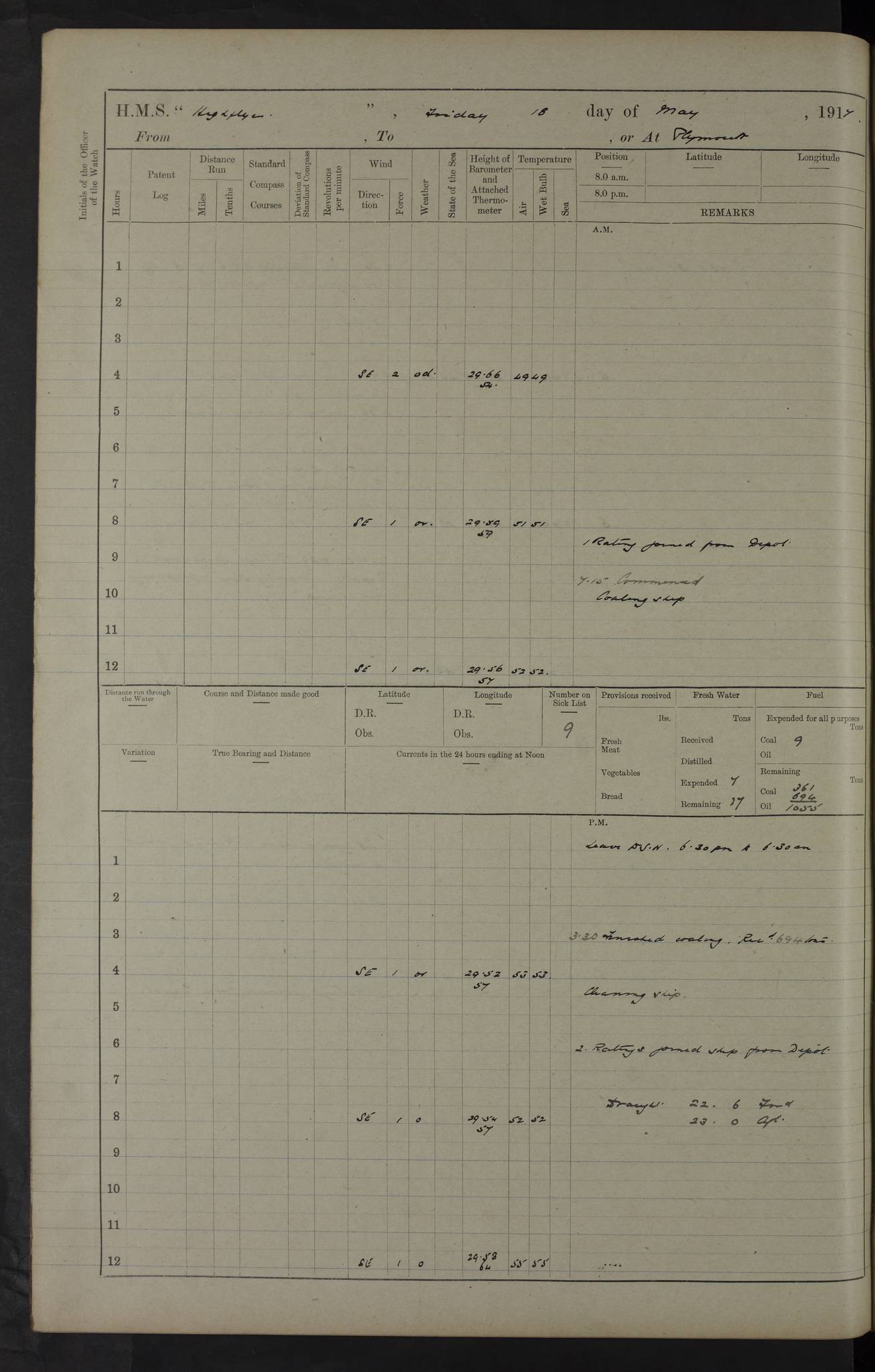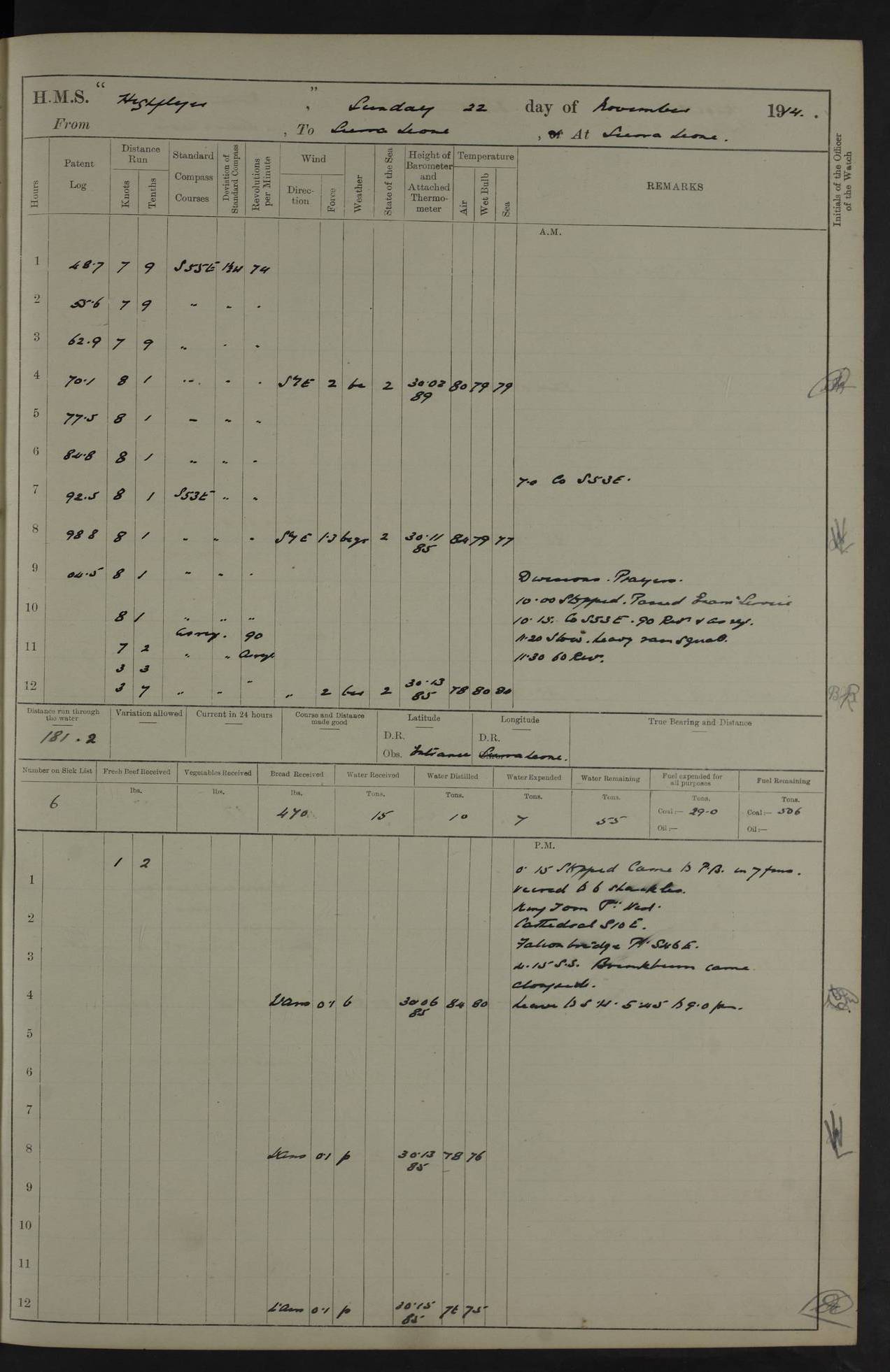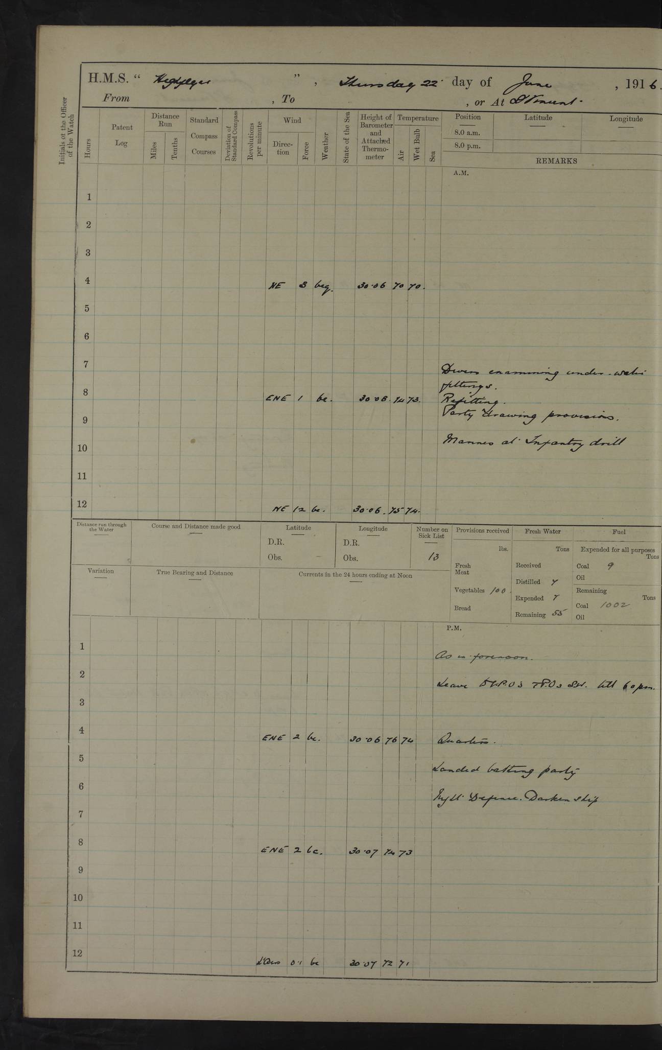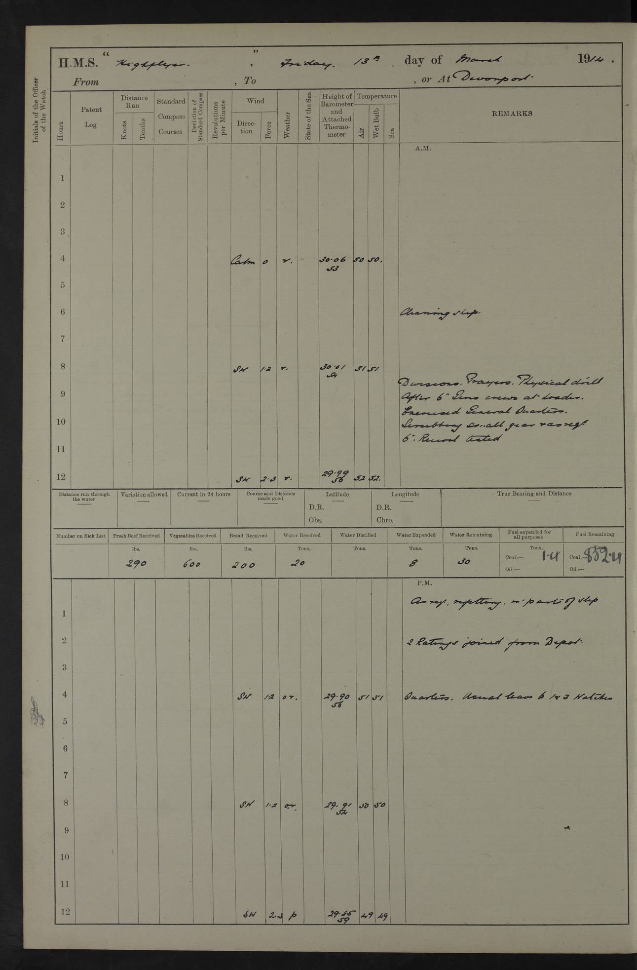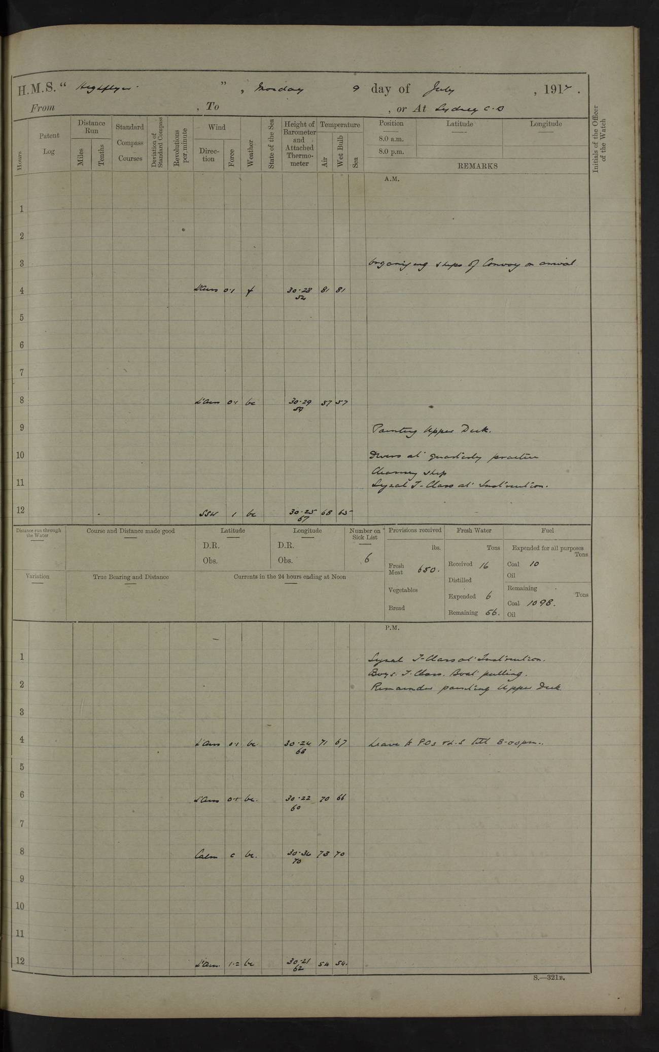 (Maps prepared using Journey Plotter, developed by Maikel. The Plots can only be approximate. They are made by joining-up positions on successive days, and sometimes positions are not given. There will therefore be occasions when the ship appears to have travelled overland) LOG BOOK – JUNE 14TH 1913 TO MAY 31ST 1914 4f960fe4a2fc8e2def00041b: (http://s3.amazonaws.com/oldweather/ADM53-44291/ADM 53-44291-001_0.jpg) 4f960fe5a2fc8e2def00041c: (http://s3.amazonaws.com/oldweather/ADM53-44291/ADM 53-44291-001_1.jpg) 4f960fe5a2fc8e2def00041d: (http://s3.amazonaws.com/oldweather/ADM53-44291/ADM 53-44291-002_0.jpg) 4f960fe5a2fc8e2def00041e: (http://s3.amazonaws.com/oldweather/ADM53-44291/ADM 53-44291-002_1.jpg) LOG of HMS Highflyer Commanded by Captain HT Buller MVO FOR THE PERIOD Commencing Saturday 14th June 1913 Ending Sunday 31st May 1914 Tonnage (displacement): 5600 Extreme length: 350 ft Extreme breadth: 54 ft ENGINES Manufacturer: Fairfield Shipbuilding & Engineering Co, Glasgow IHP: 10.000 Description: Vertical triple expansion 4 cylinders When fixed on board: 1898 BOILERS Manufacturer: Fairfield Shipbuilding & Engineering Co Description: Belleville with economisers 18 in No When made: 1898 When put in vessel: 1898 SCREW PROPELLER Manufacturer: Fairfield Shipbuilding & Engineering Co Description: Twin 3 bladed Admiralty design (bronze) General state of repair: Good 4f960fe6a2fc8e2def00041f: (http://s3.amazonaws.com/oldweather/ADM53-44291/ADM 53-44291-003_0.jpg) [Directions for using the log, figures to indicate the force of the wind and the state of the sea, and letters to denote the state of the weather.] 4f960fe6a2fc8e2def000420: (http://s3.amazonaws.com/oldweather/ADM53-44291/ADM 53-44291-003_1.jpg) Establishment of ship’s company Officers 32 Seamen 164 Boys 24 Marines 50 Engine-room establishment 134 Other non-executive ratings 466 BAROMETER Mercurial or aneroid: Mercurial Name of maker & number: Adie A 577 Height of cistern above sea: 9 feet Thermometers for air temperature Position in ship: Fore bridge Whether in screen: Yes Maker & number: Negretti & Zambra MO/A 9607 dry; from June 14, 1913 to June 1, 1914 MO/A 9603 wet; from June 14, 1913 to June 1, 1914 Thermometer for sea temperature Maker & number: J Hicks A 434; from June 14, 1913 to June 1, 1914 Position of standard compass Fore upper bridge DEVIATION OF STANDARD COMPASS Date obtained: August 29th 1913 Position: Sheerness, No 28 buoy ARMAMENT Fxle: one 6” QF PII S waist: four 6” QF PII P waist: four 6” QF PII OD: two 6” QF PII Battle deck: two 12-pounder 12-cwt SII S waist: three 12-pounder 12-cwt SII P waist: three 12-pounder 12-cwt SII AS deck: 3-pounder QF (Hotchkiss) P waist: 12-pounder 8-cwt field gun Torpedo armament 2 18” tubes BOATS 2 pinnaces, 36 ft sailing 2 cutters 1 gig, 30 ft 1 whaler 1 steam cutter, 32 ft MISCELLANEOUS INFORMATION Draught of water with bunkers full, and complete with provisions, stores and water: forward 22 ft 0 in, aft 23 ft 2 in Load draught, 600 tons coal: forward 19 ft 6 in, aft 21 ft 6 in Number of tons necessary to increase draught 1 inch: 31.5 Number of tons of coal carried (43 cubic feet per ton): a) At load draught, 600 b) With bunkers full, 1132 c) In places other than bunkers, nil Quantity of water carried: a) For boilers, 207 tons b) For drinking 60 tons THE VOYAGES OF HMS HIGHFLYER 1913-1914